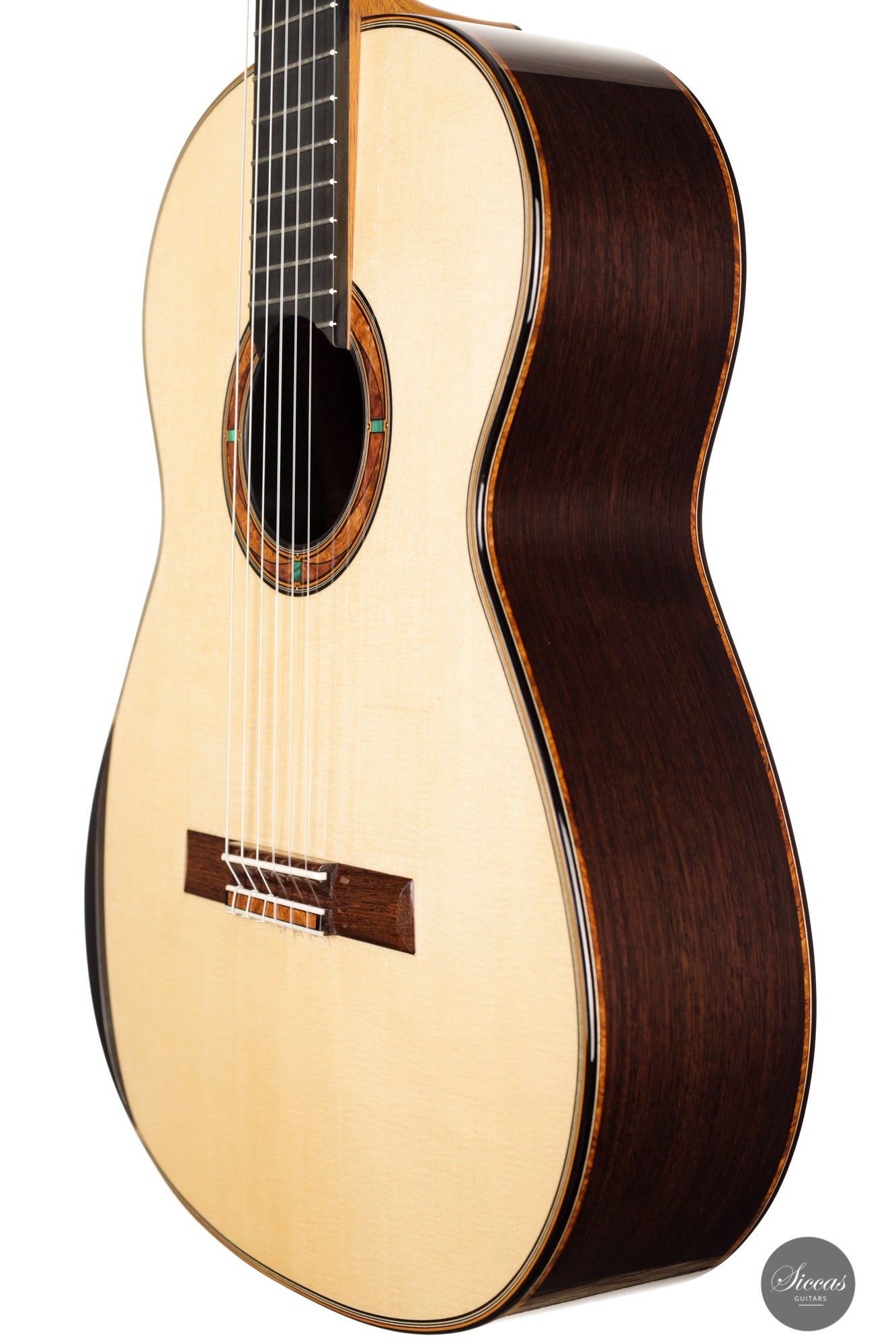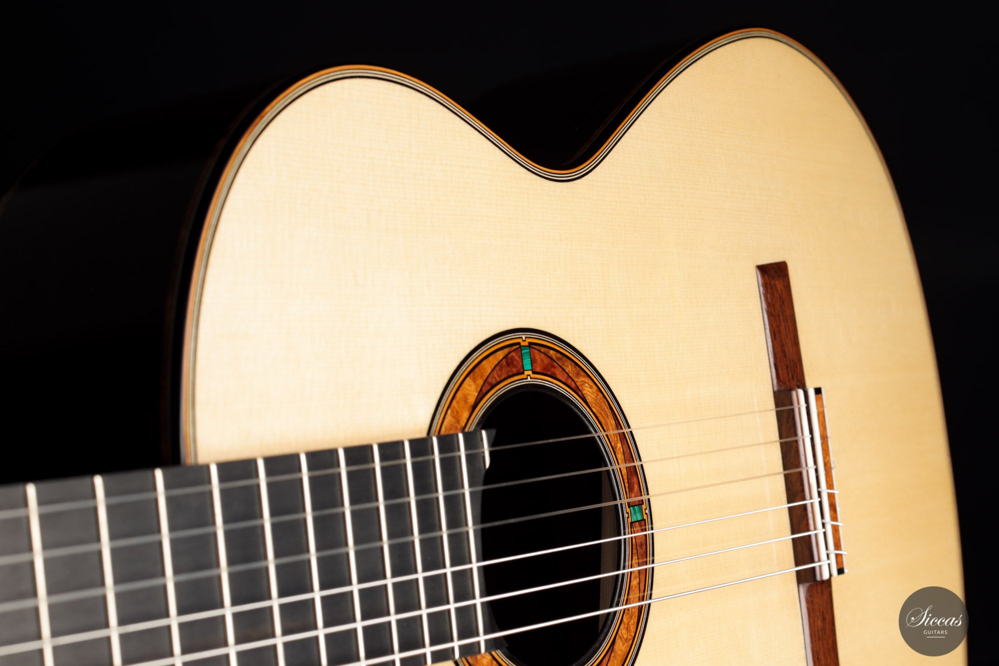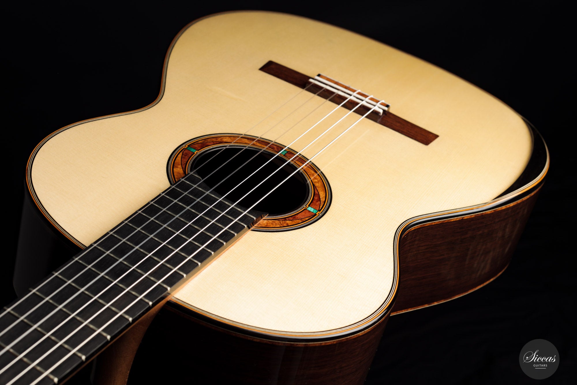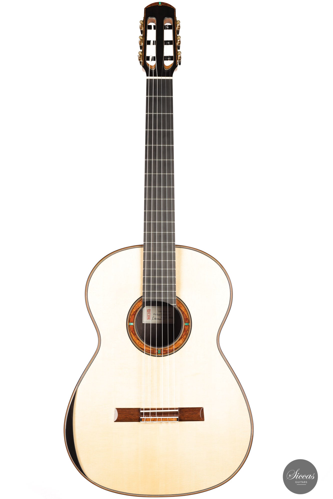 This wonderful guitar has a unique design that allures the guitarist to take an extra look before starting to play. Fine details surround the entire build with intricate inlay patterns and exquisite rosette details. The sound is big and bold, dense robust trebles paired with deep basses with plenty of sustain. Because it is a 64 cm scale guitar it is very comfortable to play on, that one centimeter makes long stretches a fair amount easier. Philipp is a talented luthier that incorporates different approaches to make a work of art that also is a true concert guitar.