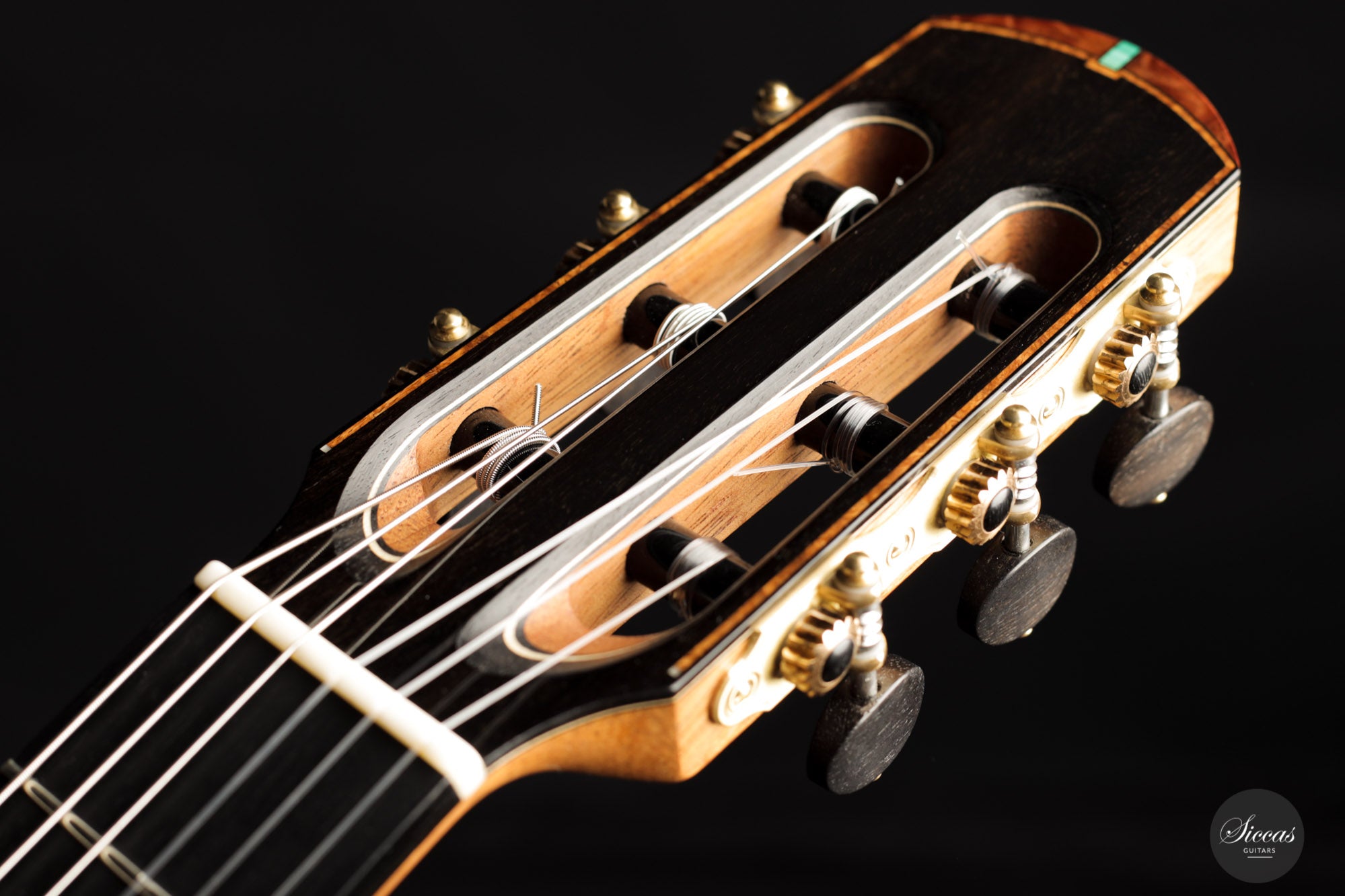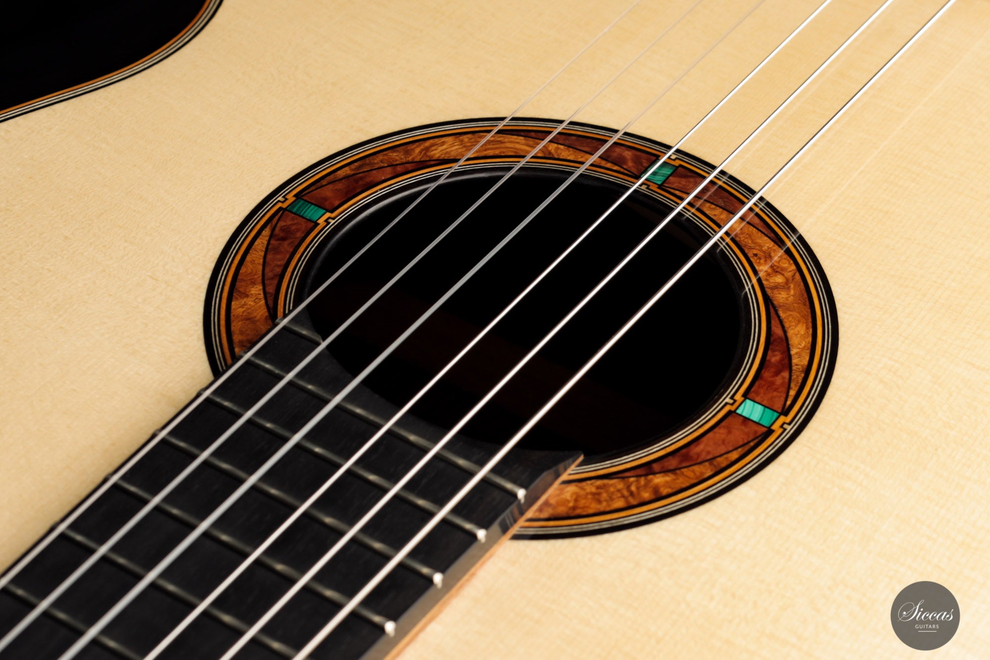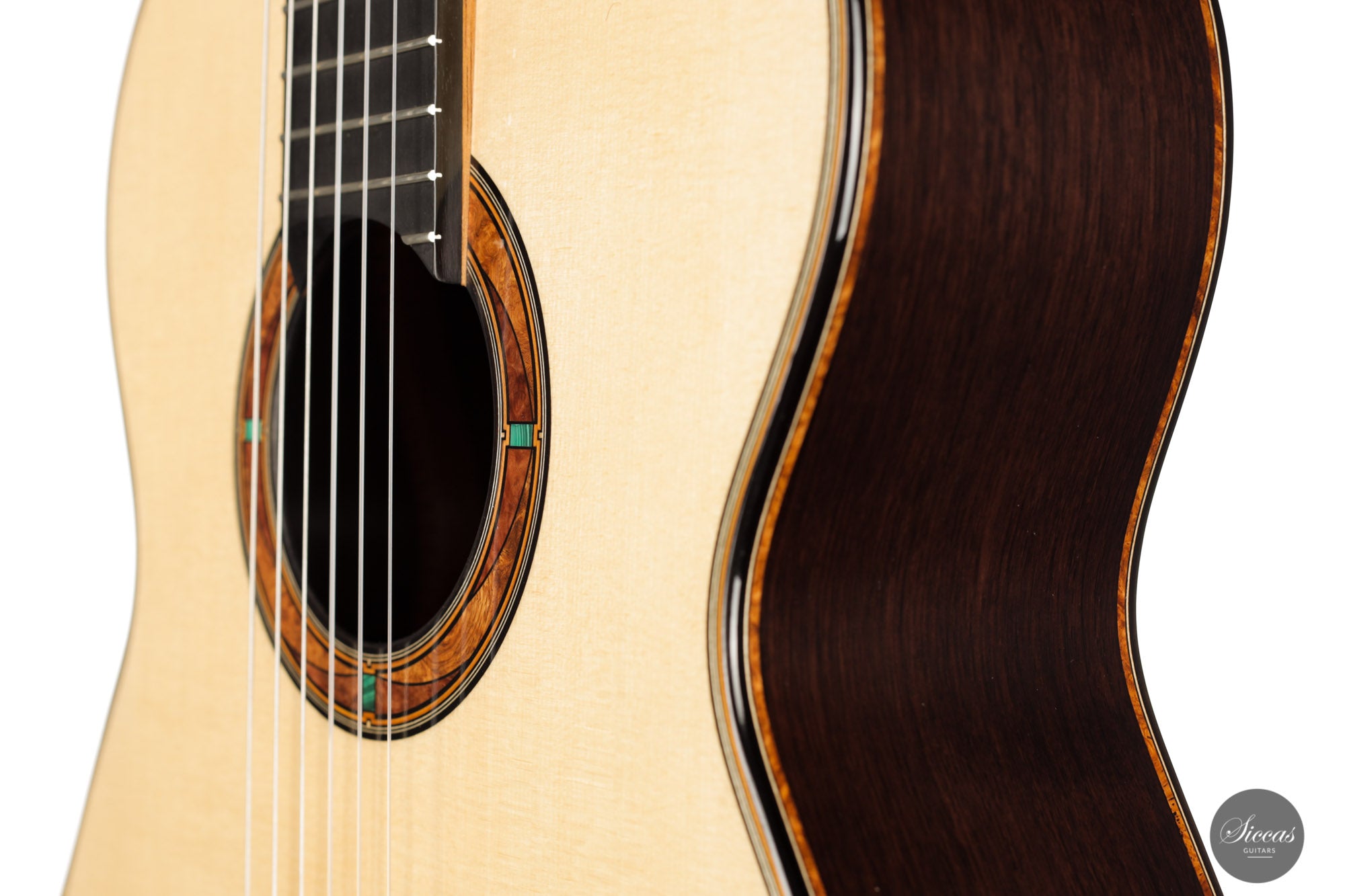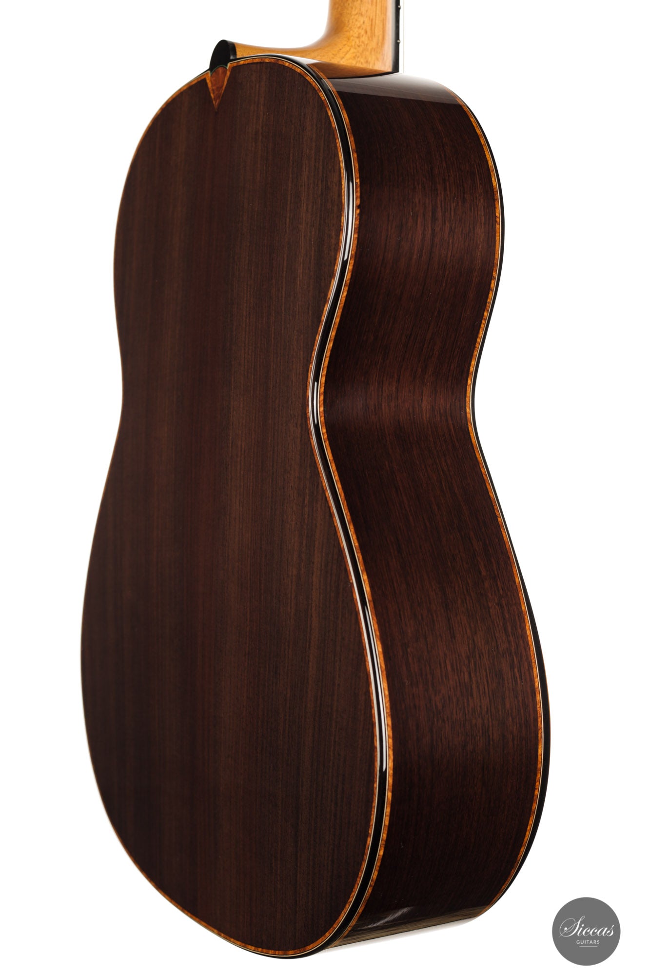 This wonderful guitar has a unique design that allures the guitarist to take an extra look before starting to play. Fine details surround the entire build with intricate inlay patterns and exquisite rosette details. The sound is big and bold, dense robust trebles paired with deep basses with plenty of sustain. Because it is a 64 cm scale guitar it is very comfortable to play on, that one centimeter makes long stretches a fair amount easier. Philipp is a talented luthier that incorporates different approaches to make a work of art that also is a true concert guitar.