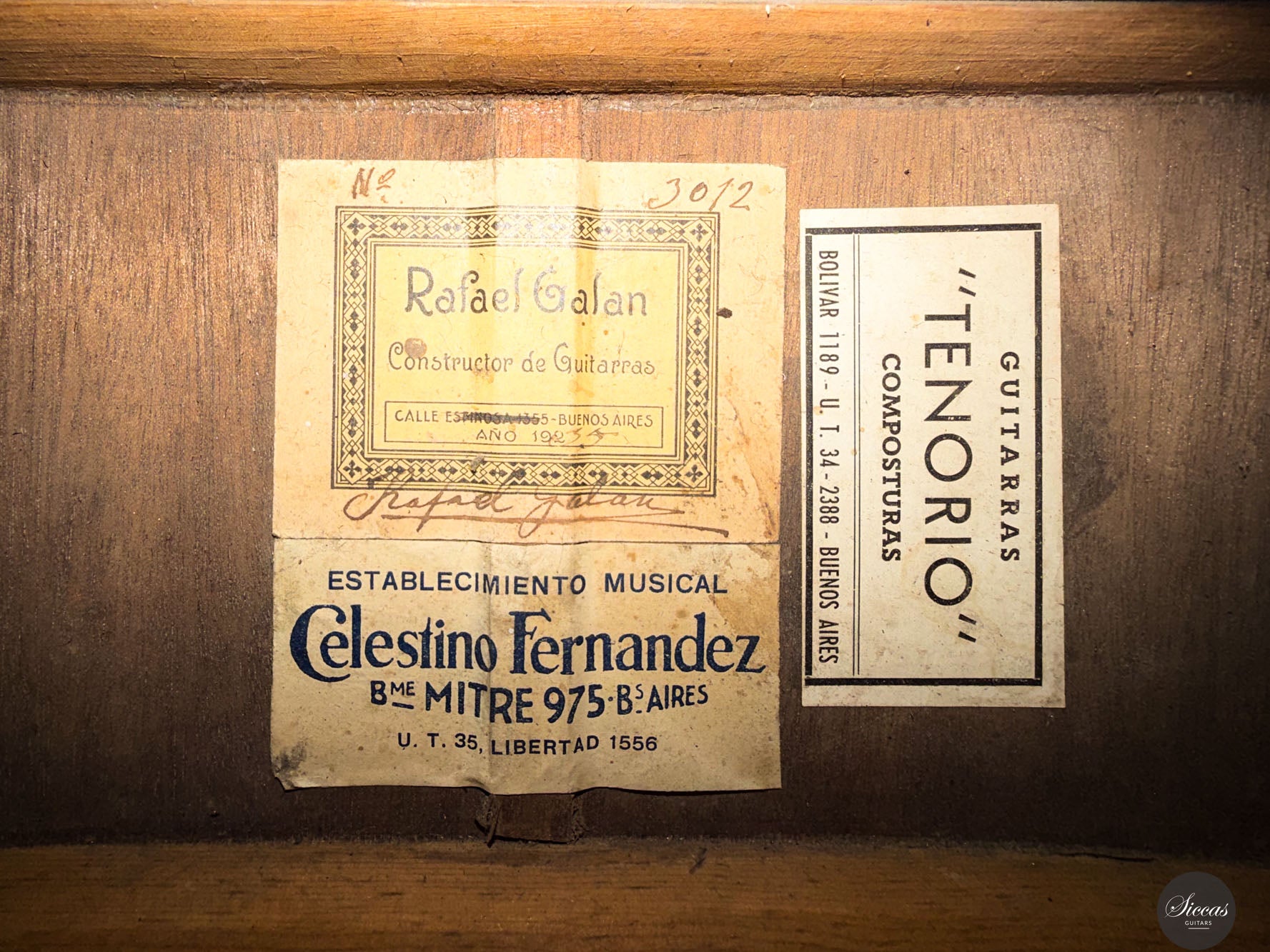 Rafael Galán was born in Málaga and later worked for many years in Buenos Aires where he established his own workshop. Although fewer instruments by him have survived compared to makers of larger schools, his work occupies a meaningful place within the early twentieth century tradition of Spanish inspired guitar building. His instruments often show a clear and confident understanding of the Torres lineage and they reveal a maker with a sensitive ear for resonance and a refined sense of proportion. Surviving examples demonstrate a lyrical and intimate voice that reflects the aesthetics of the period and the warm character associated with guitars built in Spain and in South America during those years.
