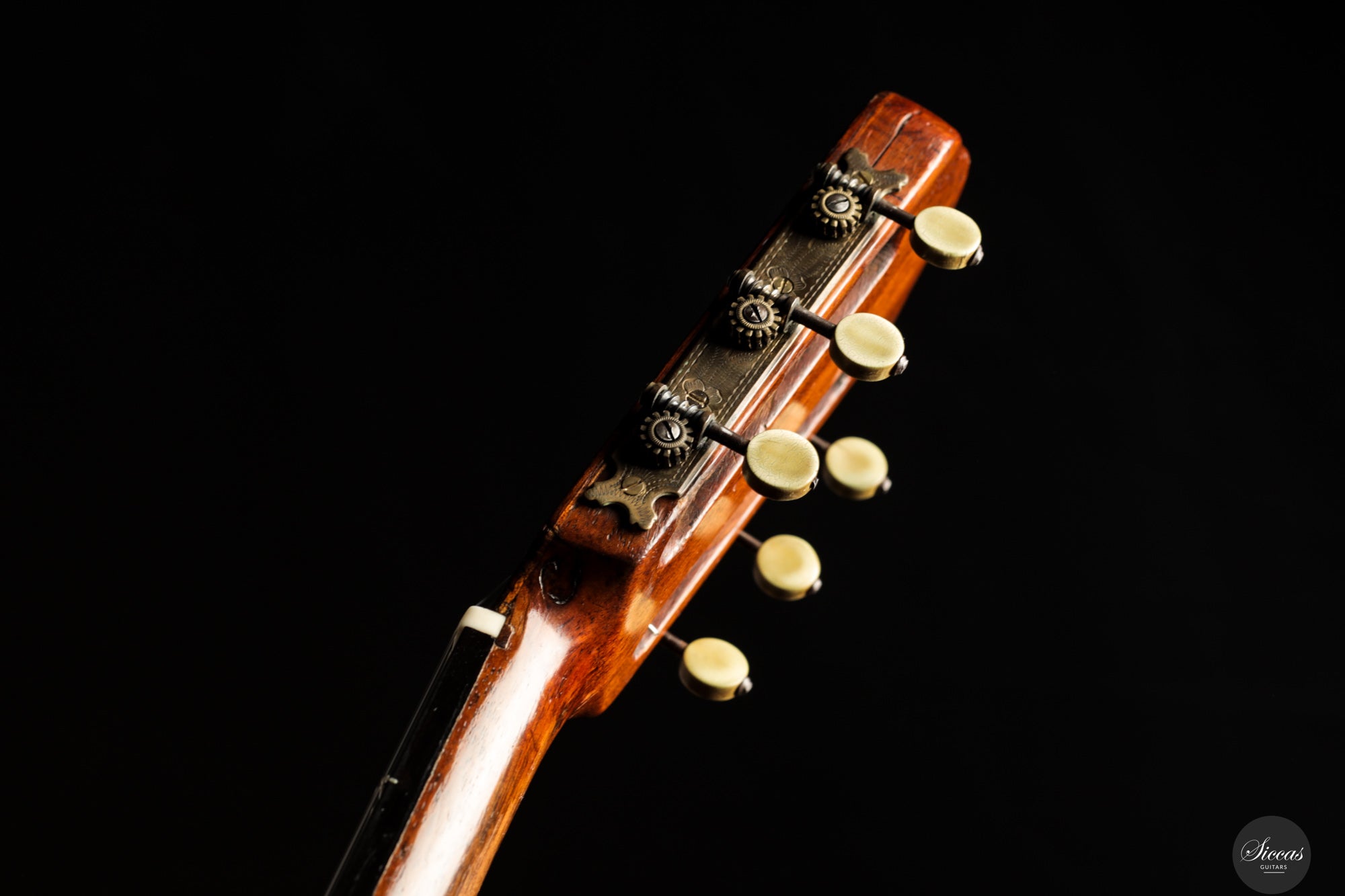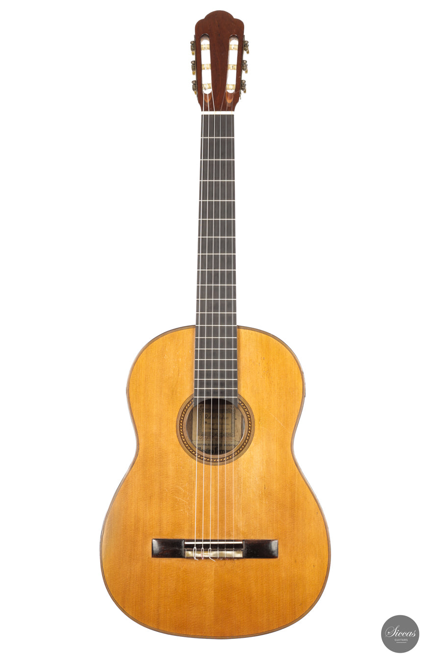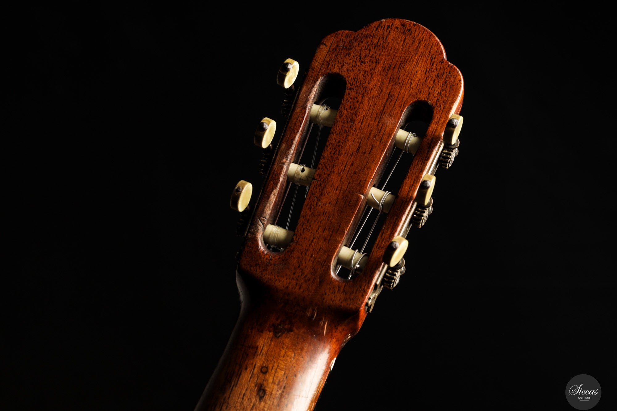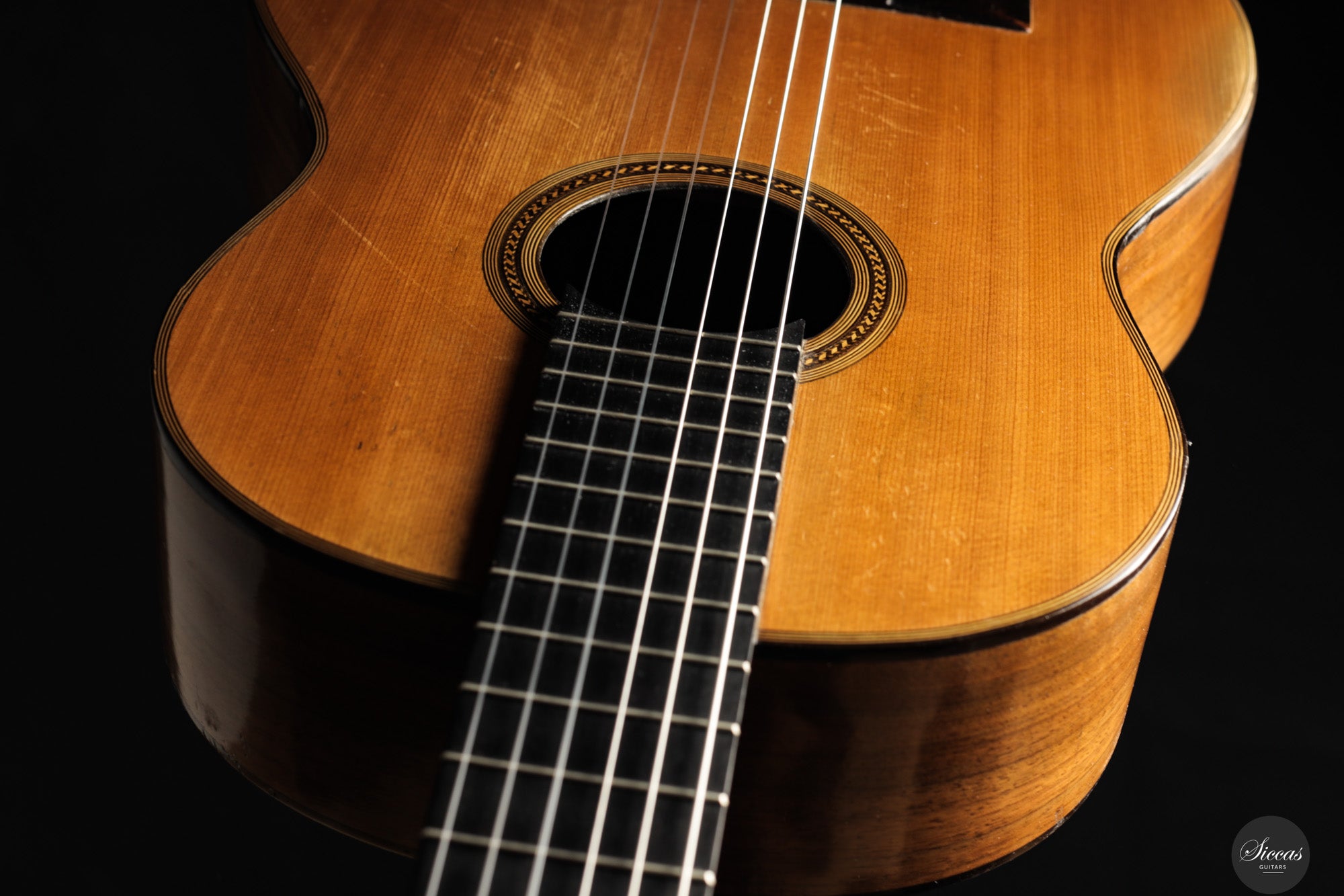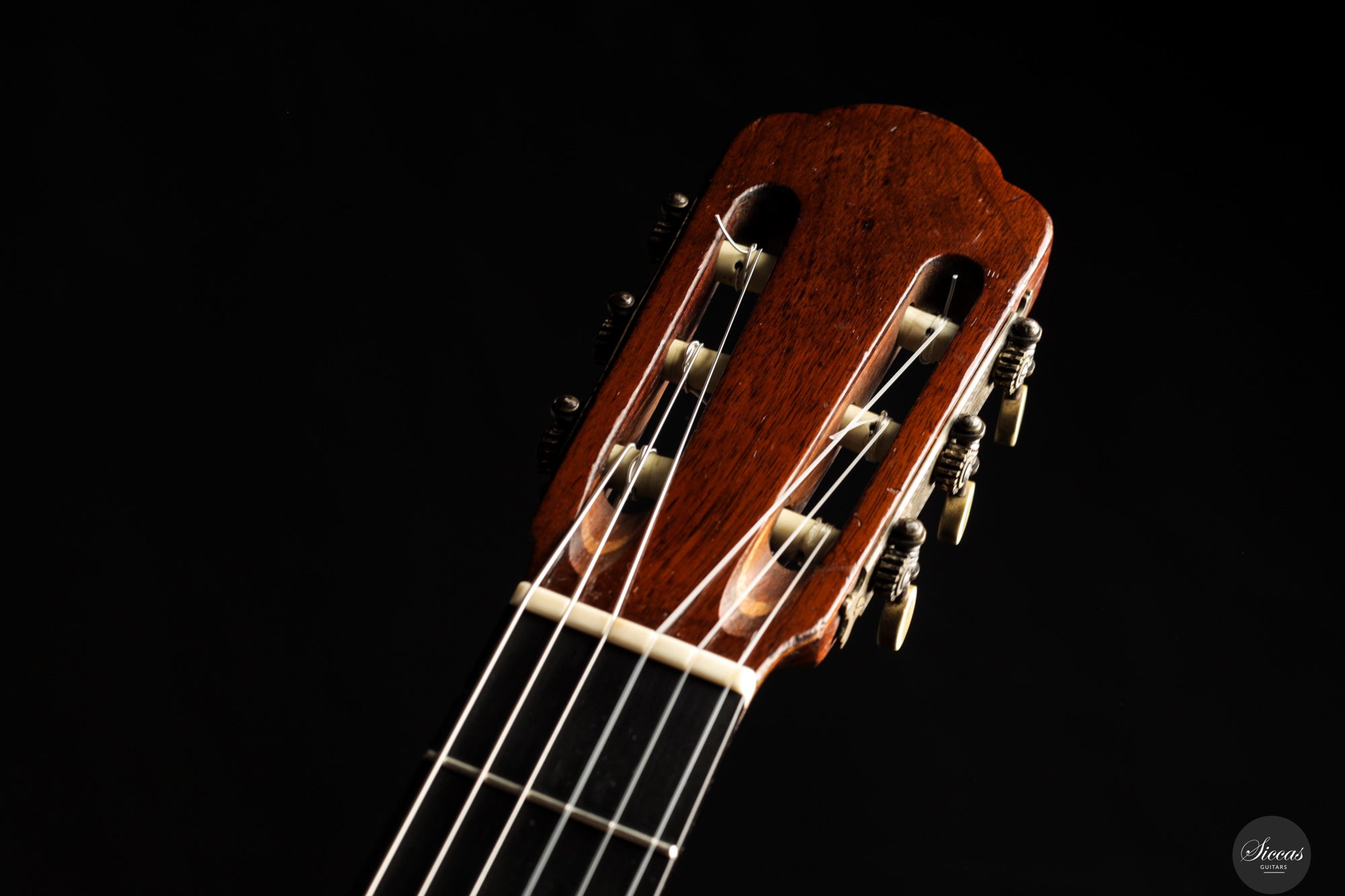 This guitar from 1923 is a remarkable witness of its time. It is built in the traditional manner with a spruce top and walnut back and sides, all finished with French polish. The instrument weighs only 1335 grams which gives it an immediate sense of lightness and openness. The antique tuning machines function well and contribute to the historic charm of the guitar. The overall workmanship reveals a builder with great attention to musicality and with a desire to create an instrument that breathes freely.