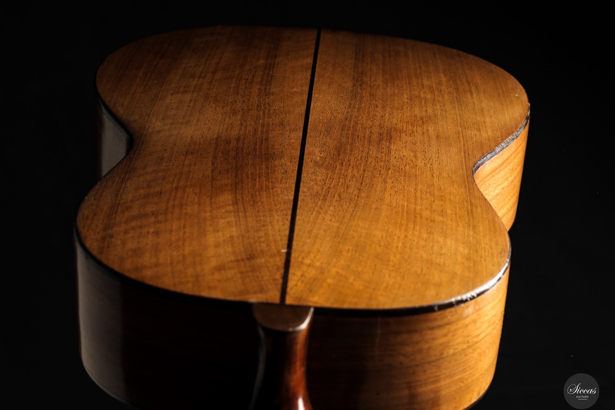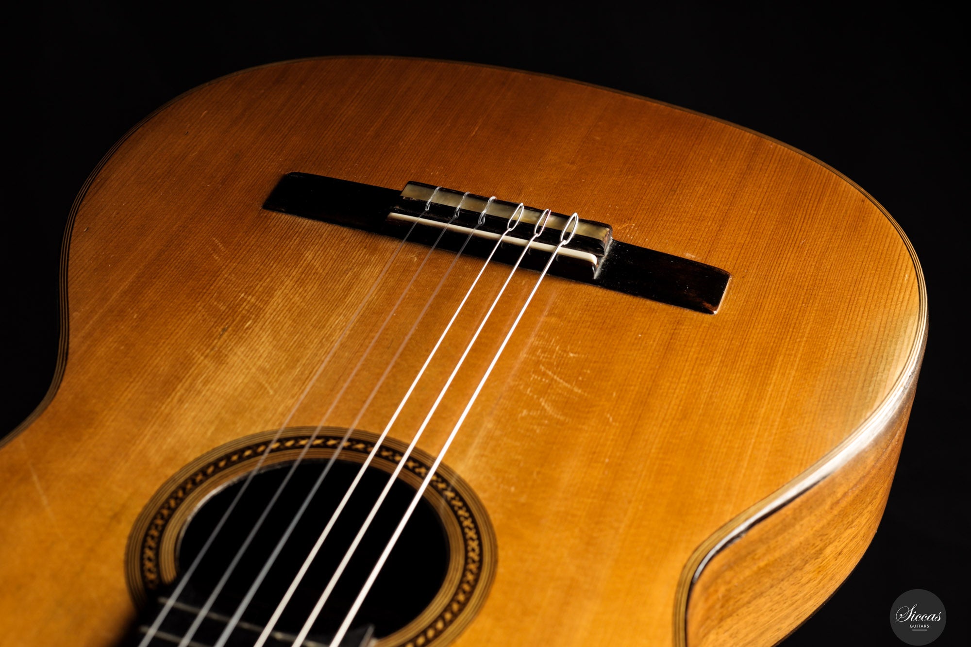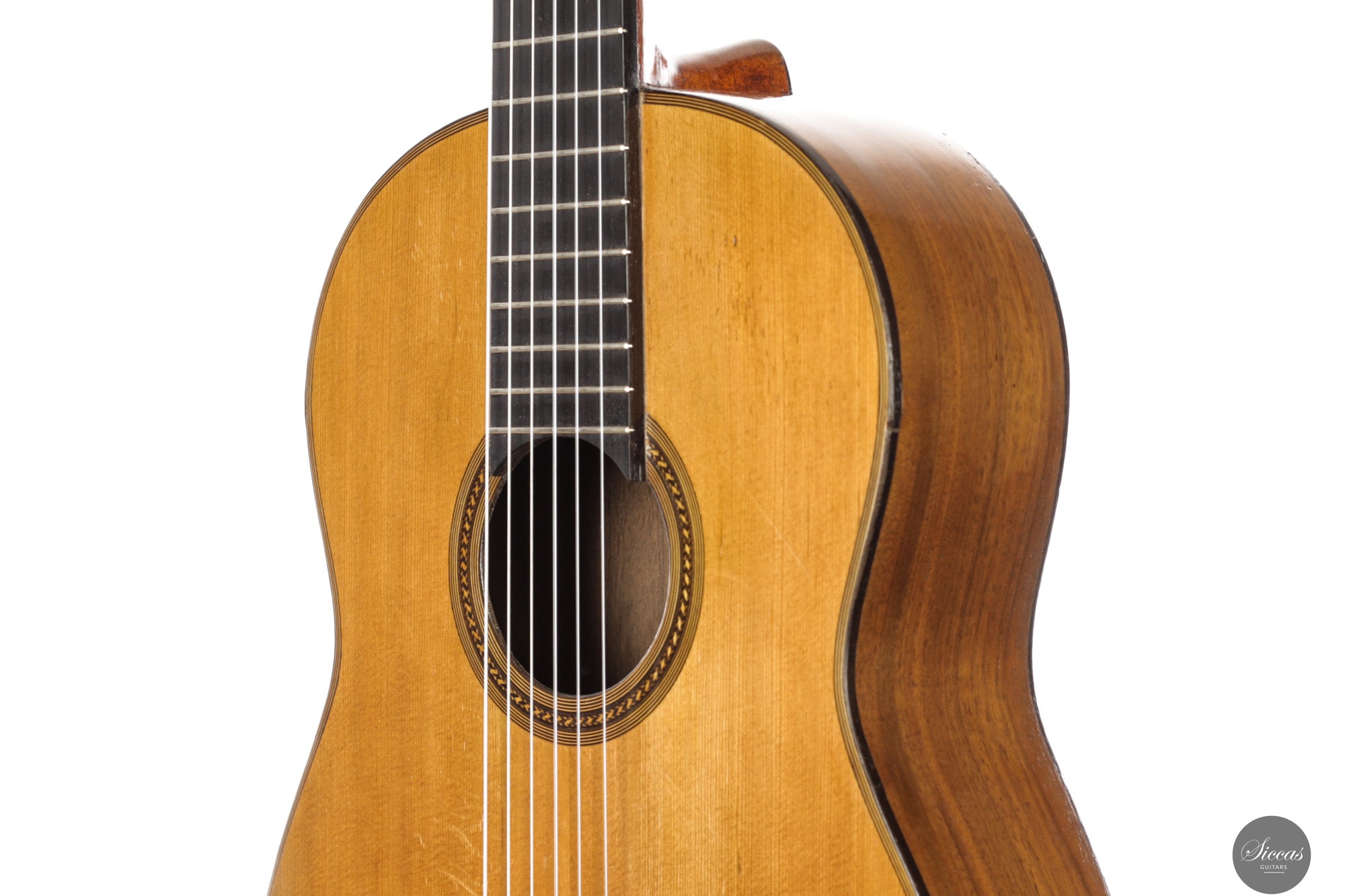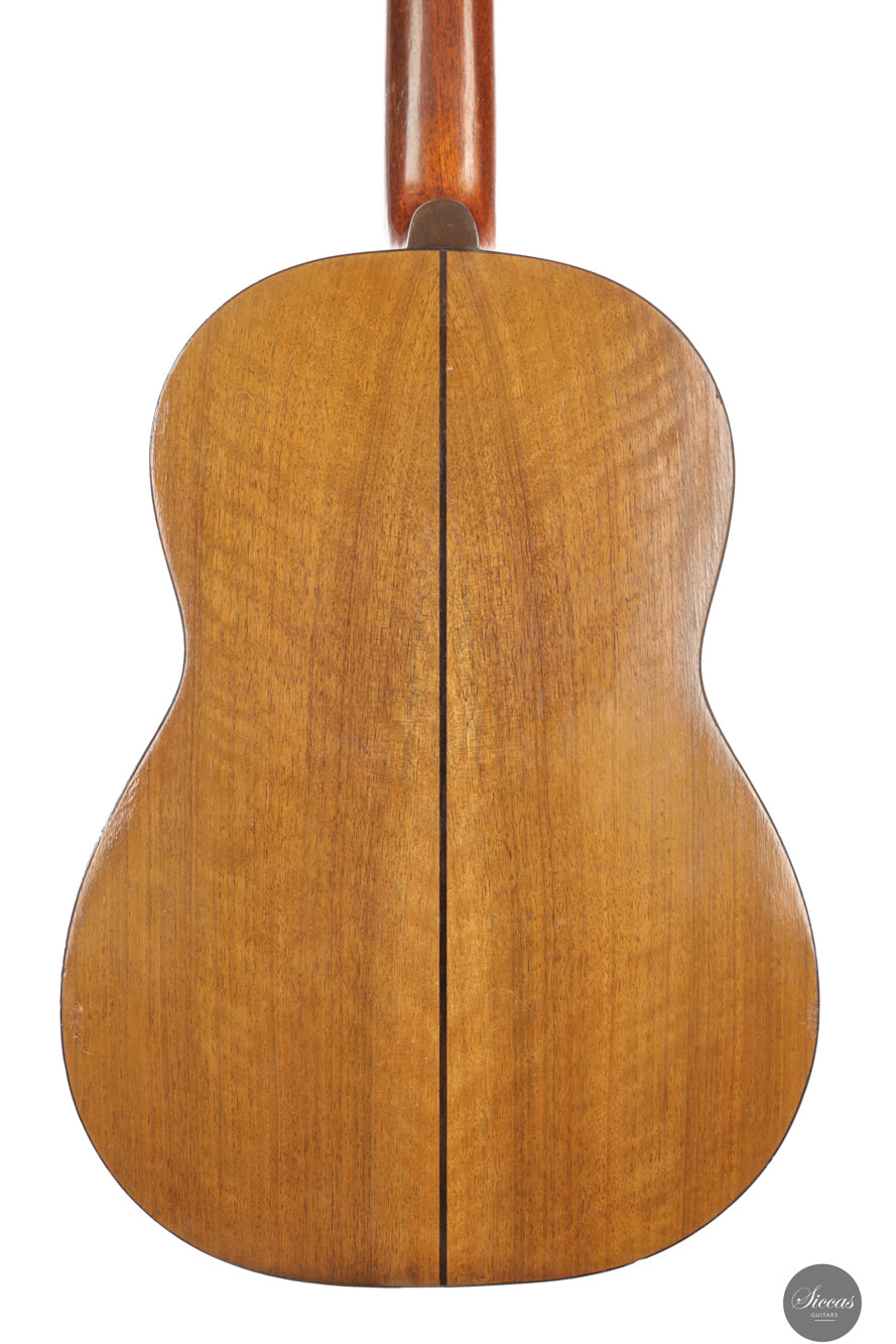 This guitar from 1923 is a remarkable witness of its time. It is built in the traditional manner with a spruce top and walnut back and sides, all finished with French polish. The instrument weighs only 1335 grams which gives it an immediate sense of lightness and openness. The antique tuning machines function well and contribute to the historic charm of the guitar. The overall workmanship reveals a builder with great attention to musicality and with a desire to create an instrument that breathes freely.