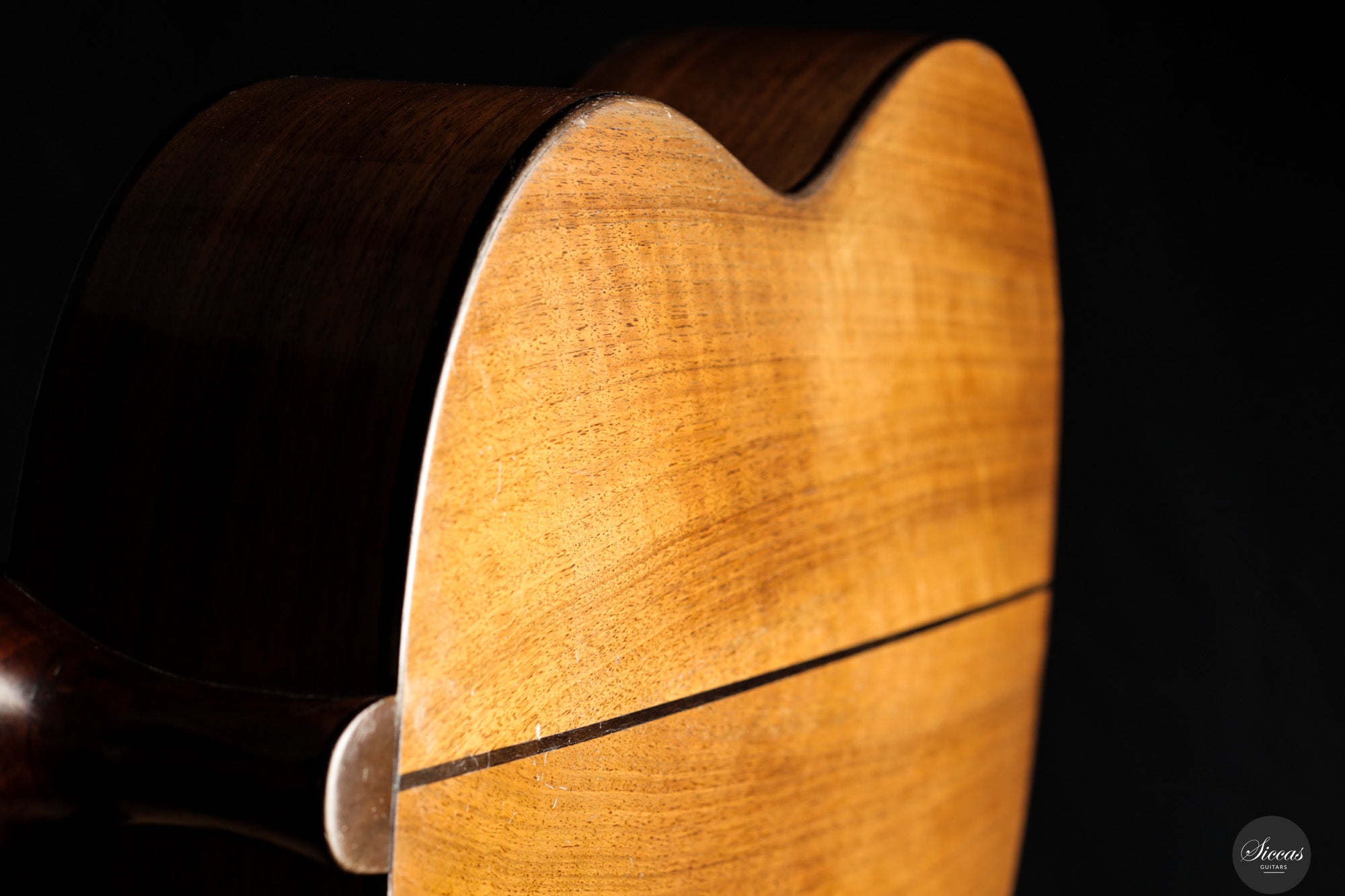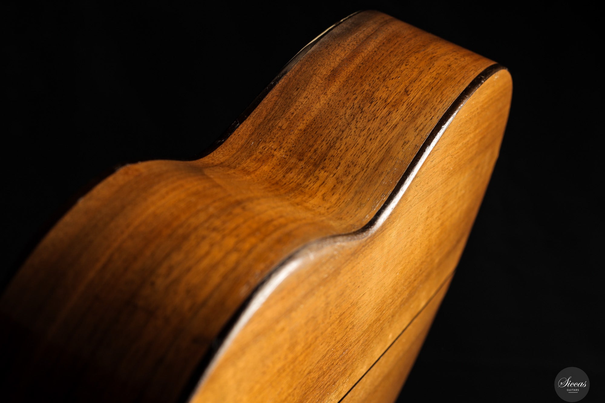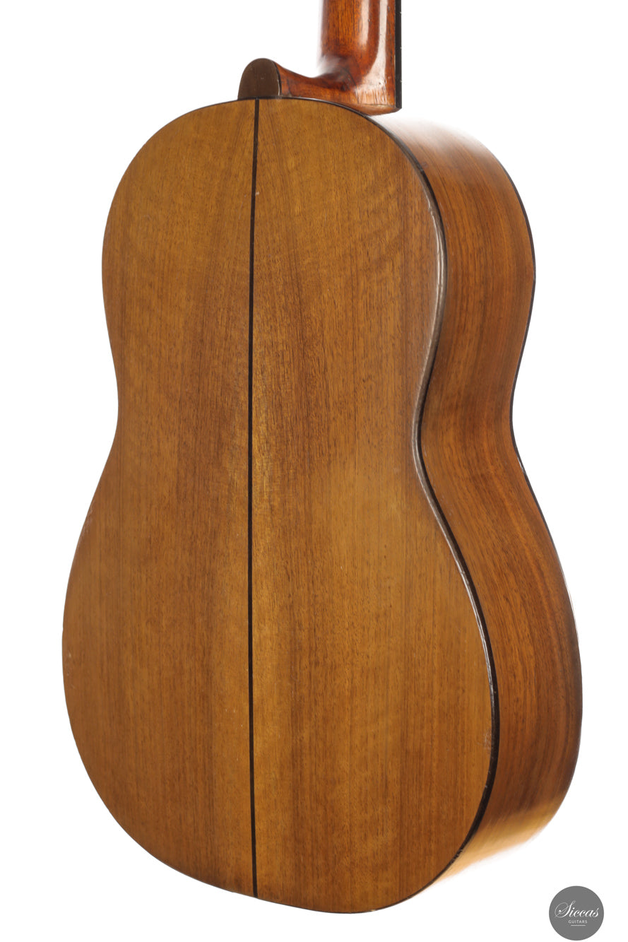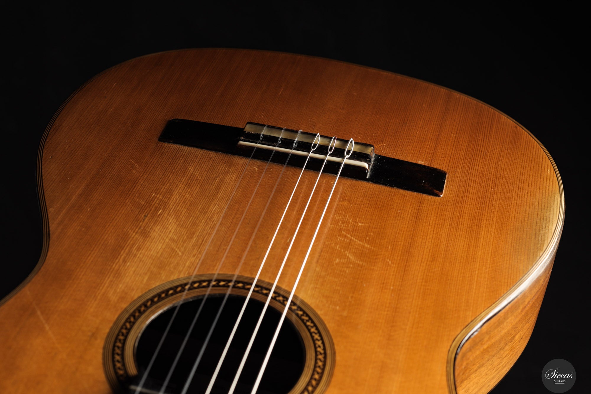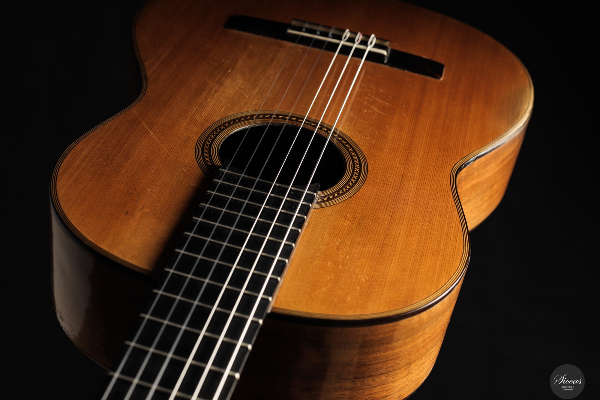 This guitar from 1923 is a remarkable witness of its time. It is built in the traditional manner with a spruce top and walnut back and sides, all finished with French polish. The instrument weighs only 1335 grams which gives it an immediate sense of lightness and openness. The antique tuning machines function well and contribute to the historic charm of the guitar. The overall workmanship reveals a builder with great attention to musicality and with a desire to create an instrument that breathes freely.