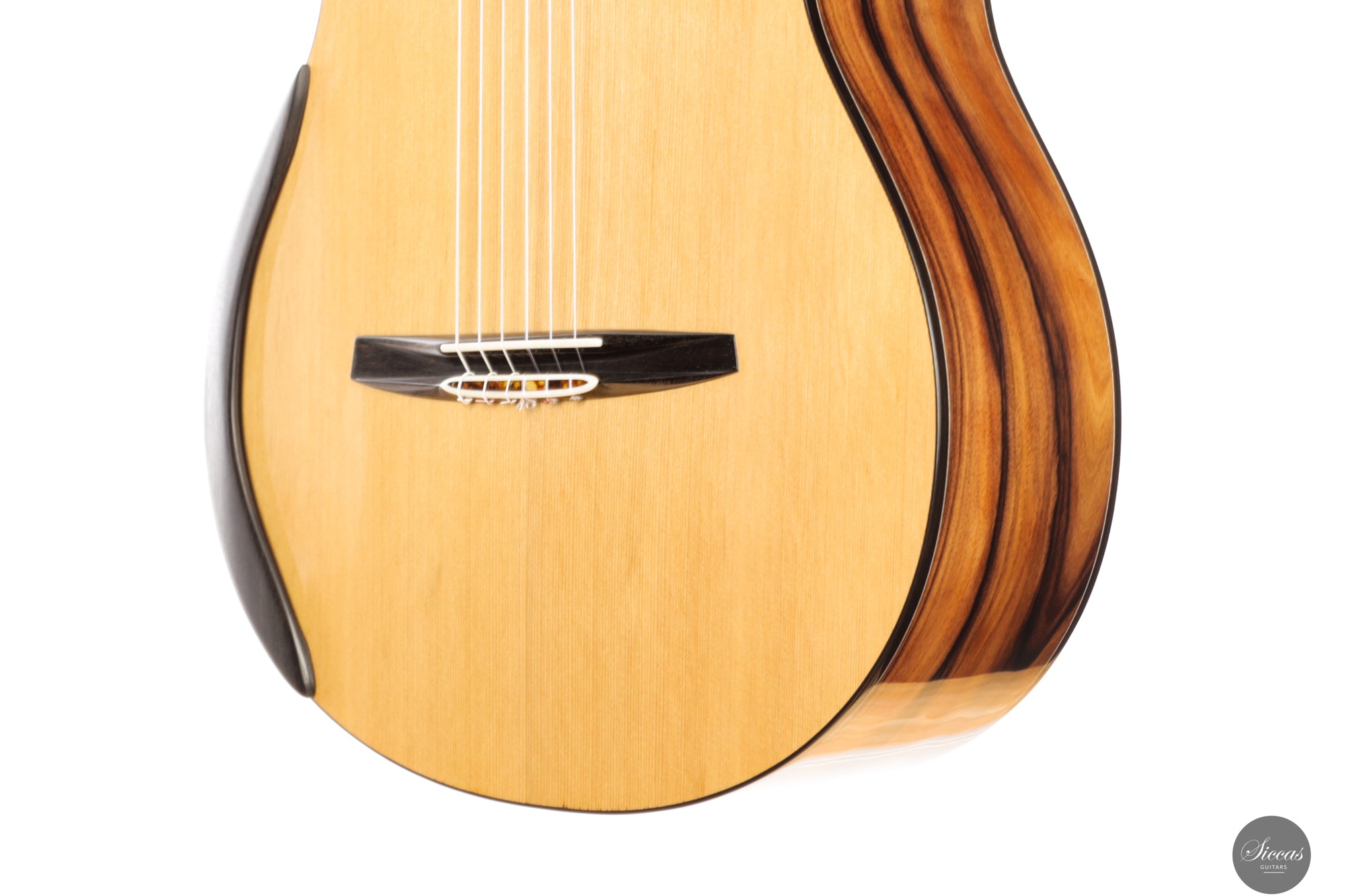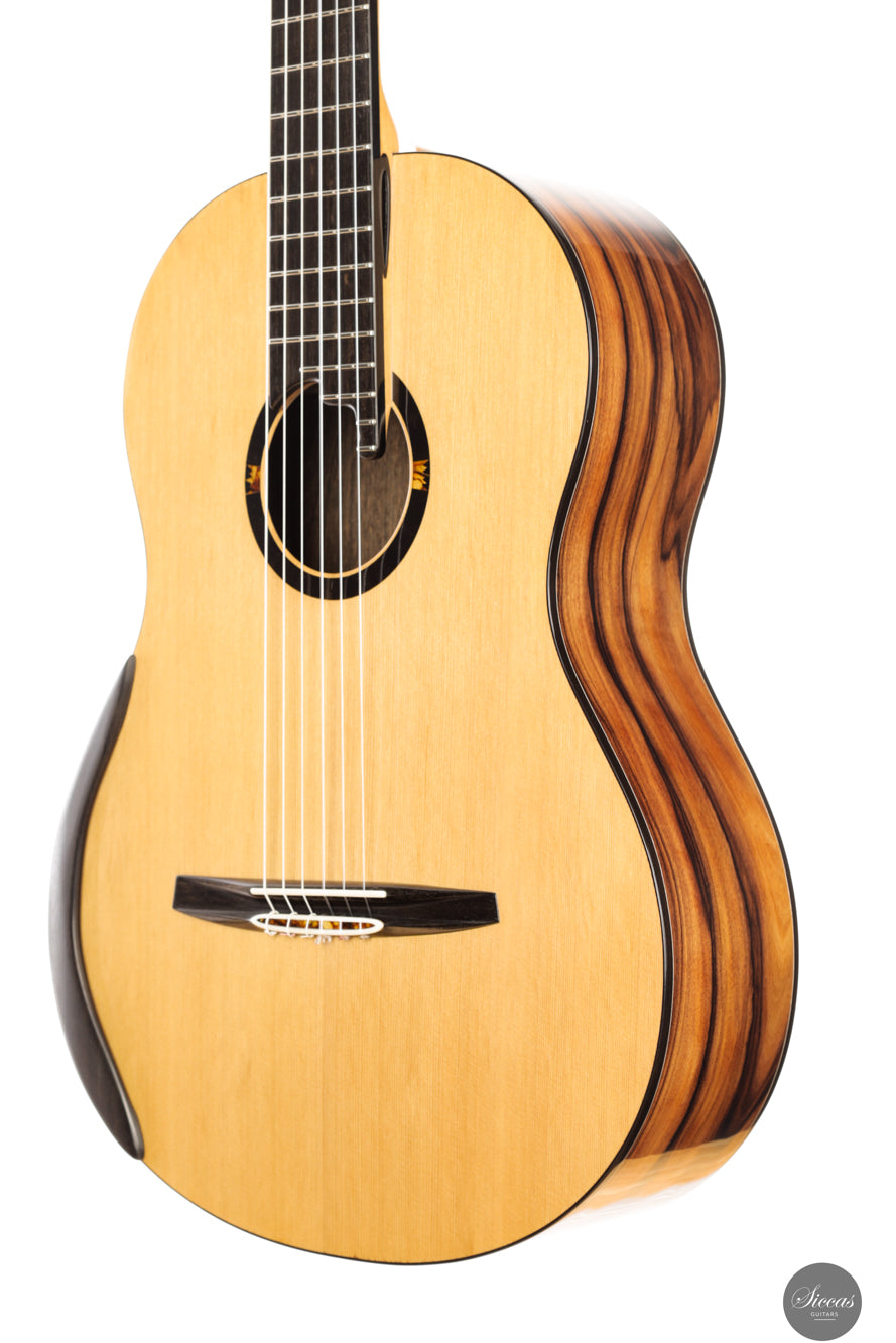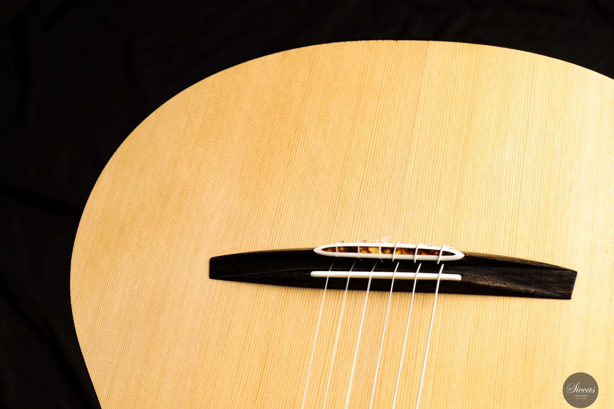 The Opus Prime No. 721 from 2025 represents a continuation of Turkowiak’s forward-looking vision. Following on from his renowned “Queen of Guitars” and earlier Opus Prime models, this instrument demonstrates his ongoing commitment to blending traditional craftsmanship with advanced acoustic engineering. The spruce soundboard works in combination with Bolivian rosewood back and sides to produce a voice that is both powerful and refined. A defining feature of this model is Turkowiak’s “Acoustic Tube” integrated into the neck, which enriches the resonance and supports a full, enveloping sound. The trebles are sweet and lyrical, while the bass registers benefit greatly from the exceptionally low air resonance of D sharp to E. This results in impressive depth and sustain across the lower range and a strong fundamental presence throughout the registers. With a weight of only 1520 grams, the guitar remains highly responsive and dynamic. Visually and ergonomically, the Opus Prime No. 721 embraces a modern aesthetic. Its sleek lacquer finish, carefully profiled neck, and comfortable dimensions reflect Turkowiak’s focus on player-oriented design. This guitar offers a remarkable blend of warmth and playability, making it a strong choice for demanding concert use.