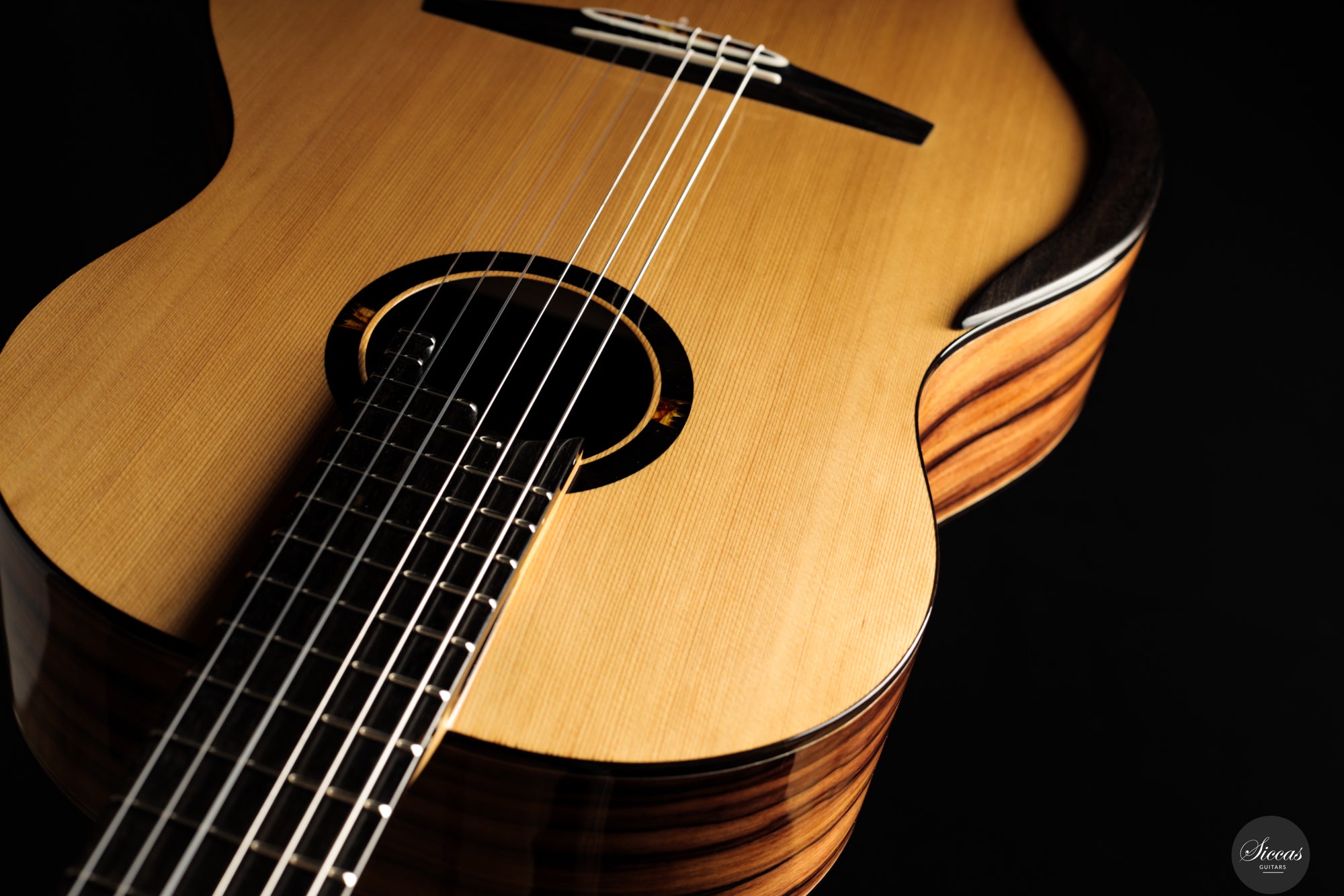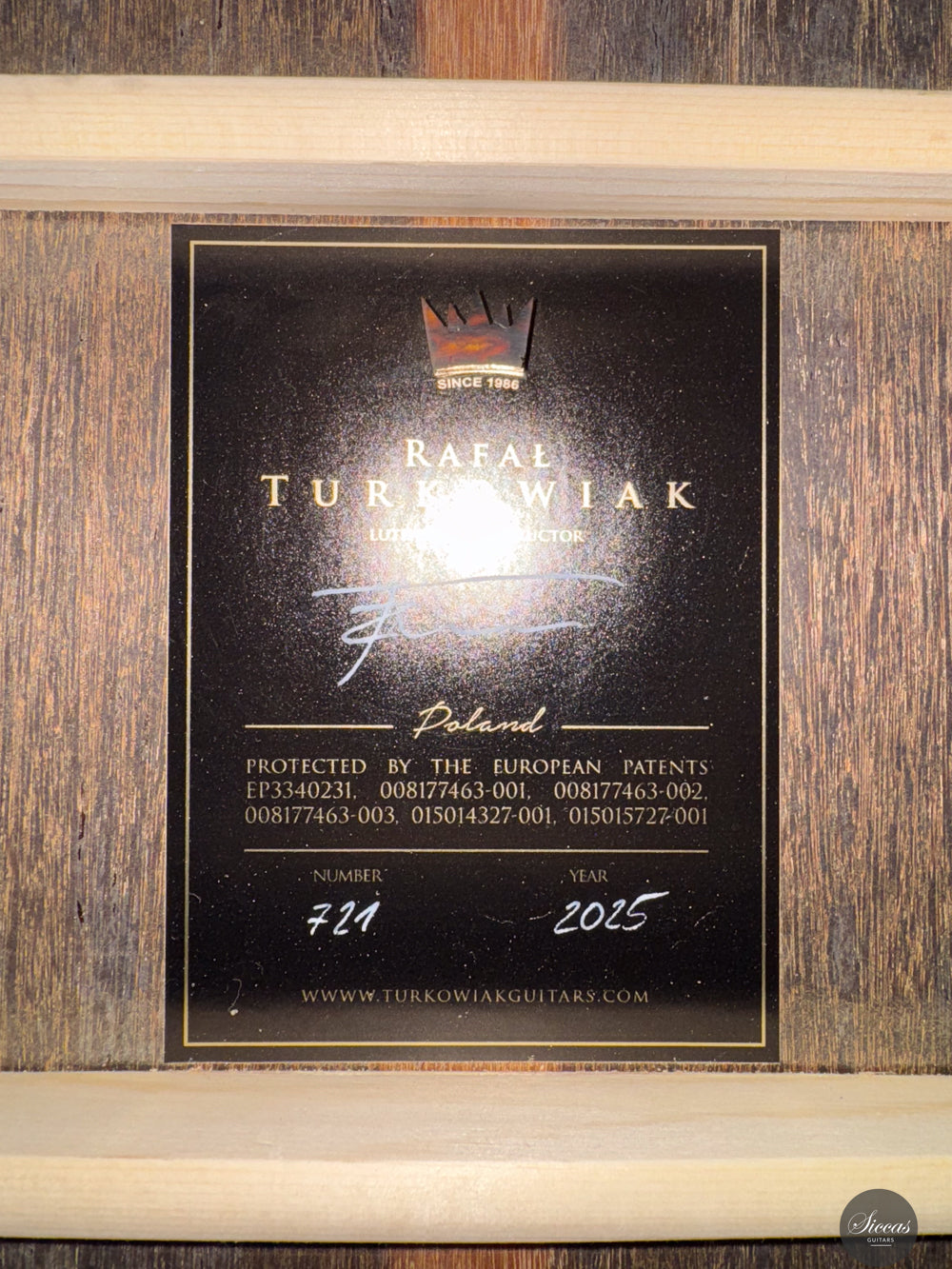 Rafal Turkowiak was born in 1966 in Golanice near Leszno, Poland. Coming from a family of craftsmen, with his father being a carpenter and his grandfather a wheelwright, he was introduced early to the world of woodwork and material knowledge. Over more than two decades of guitar making, he has developed a scientific and innovative approach to lutherie. This dedication to research and experimentation led him to create his distinctive “WAVE” structural concept, which enhances the guitar’s resonance and projection.About the guitar