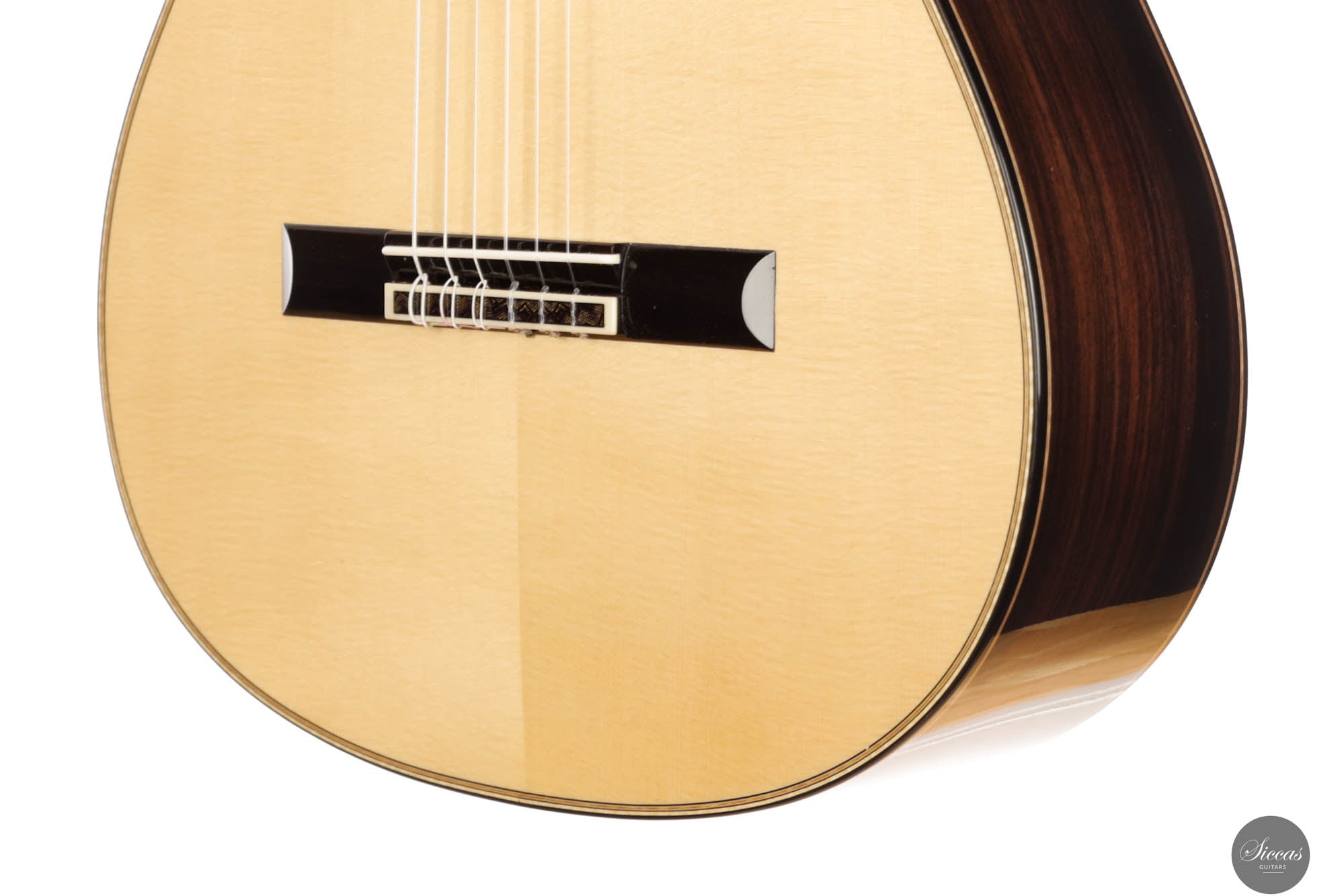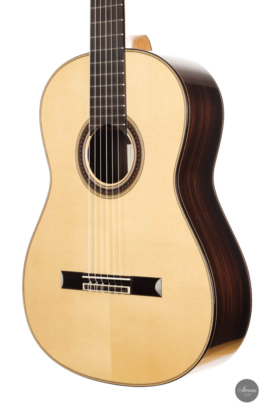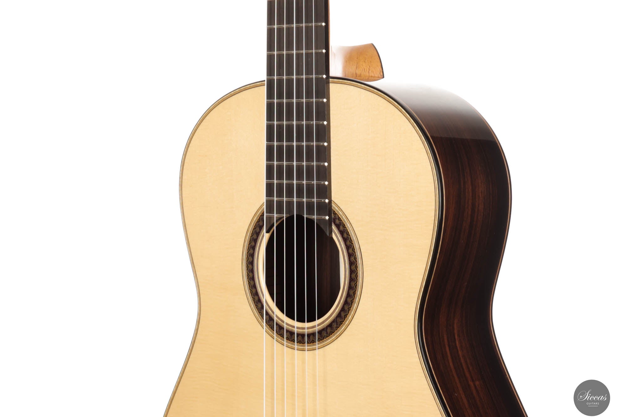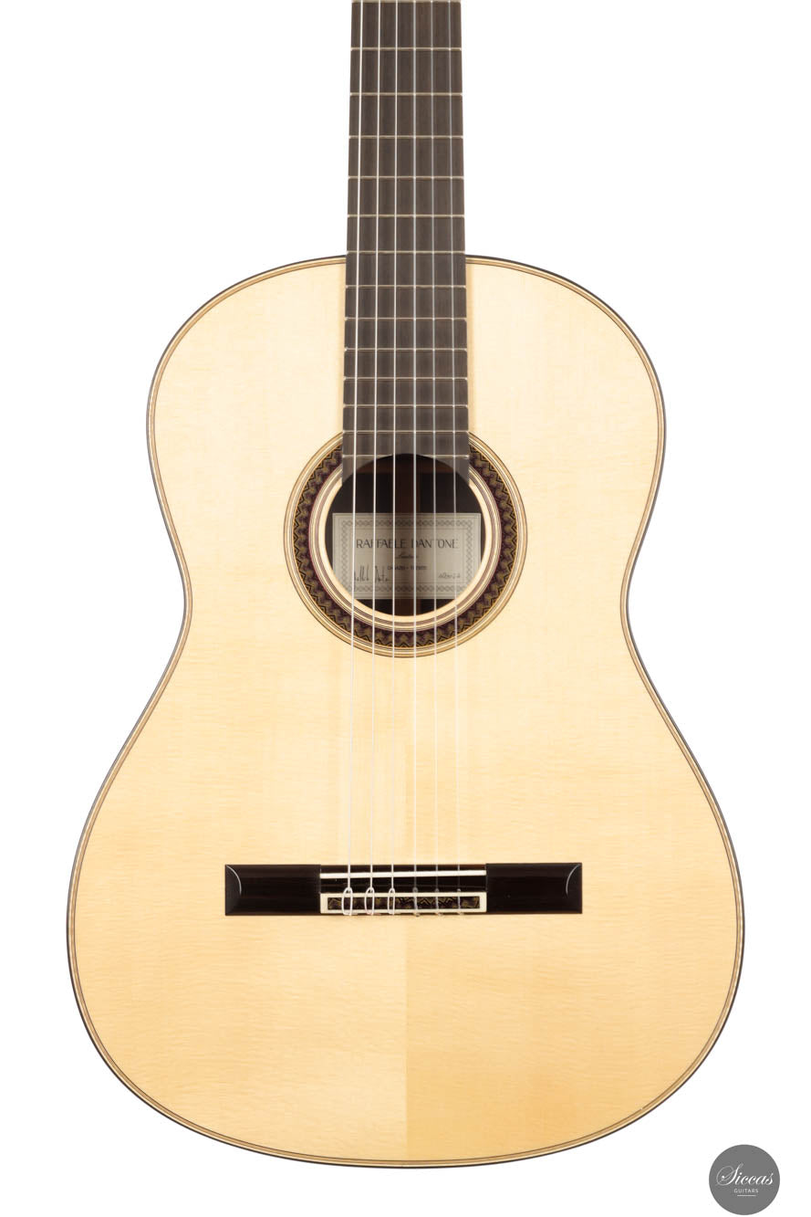 This 2024 classical guitar by Raffaele Dantone is built in the traditional style, with a spruce top and Indian rosewood back and sides. The choice of materials gives the instrument a clear tonal center, with warmth and depth in the bass register and a singing, focused quality in the trebles. Its voice is balanced and articulate, yet capable of a broad range of colour, which makes it rewarding both for controlled lyrical playing and for more expansive concert repertoire.