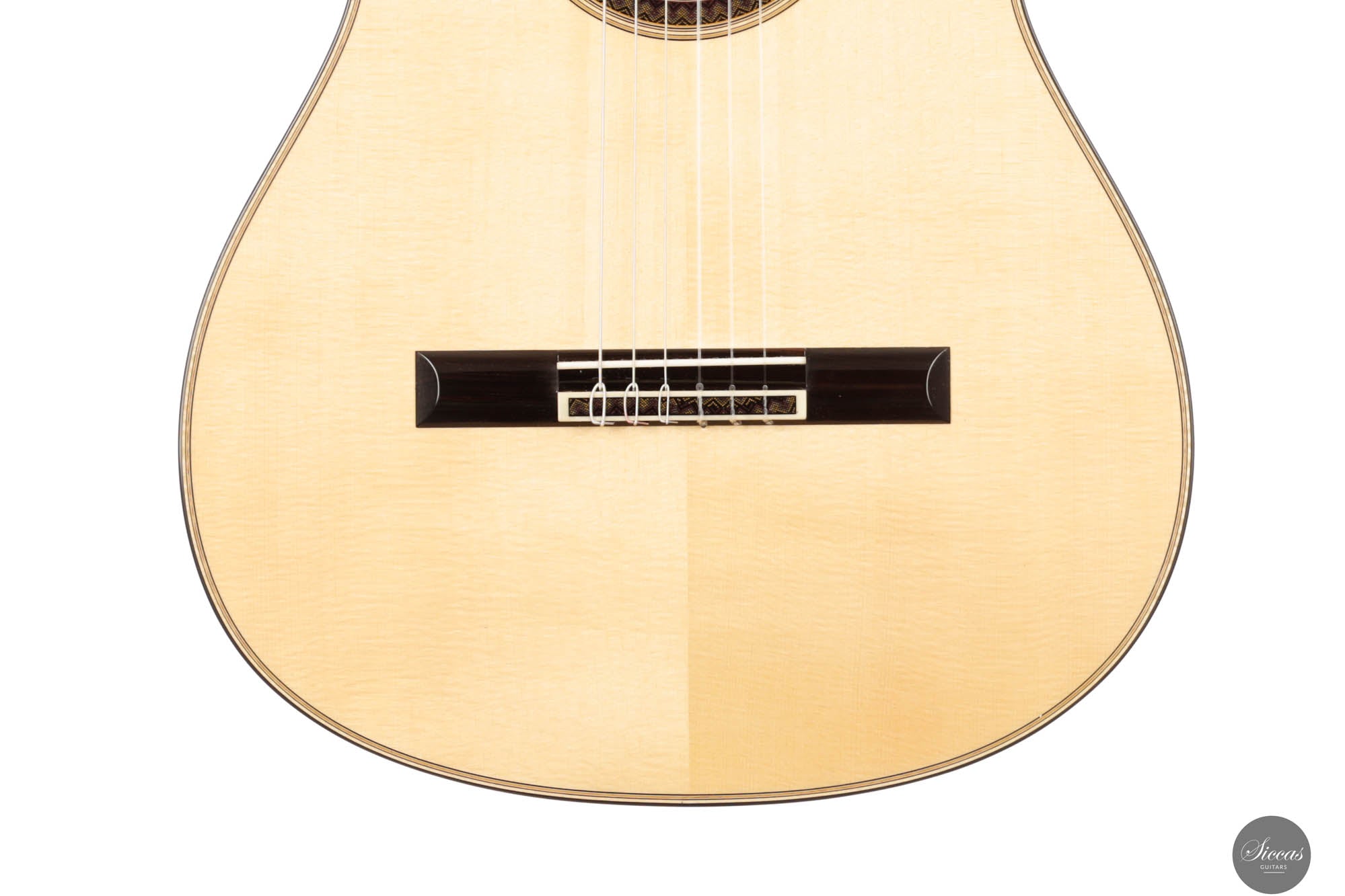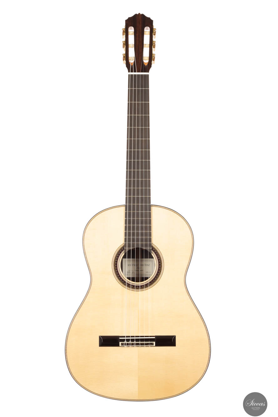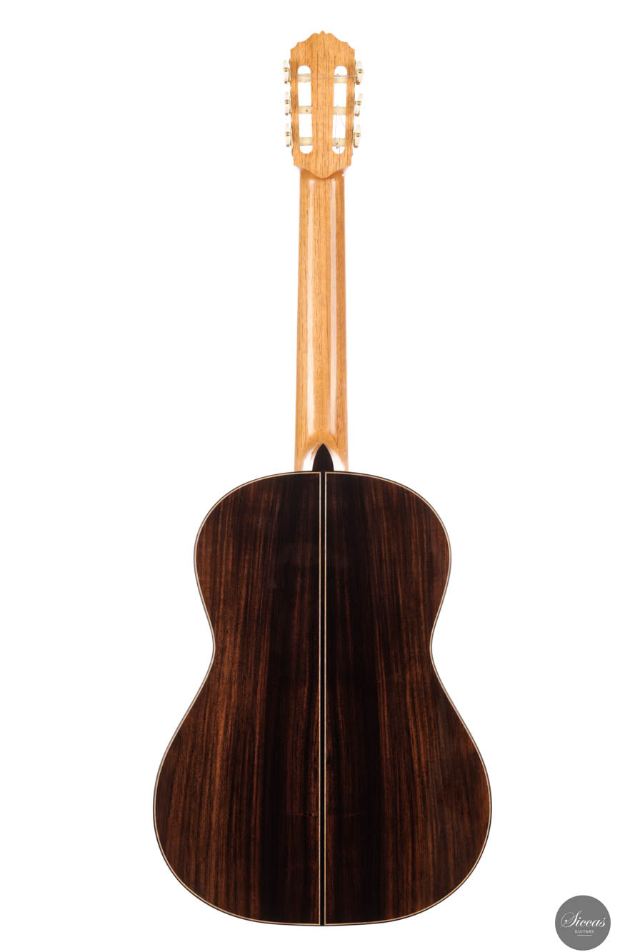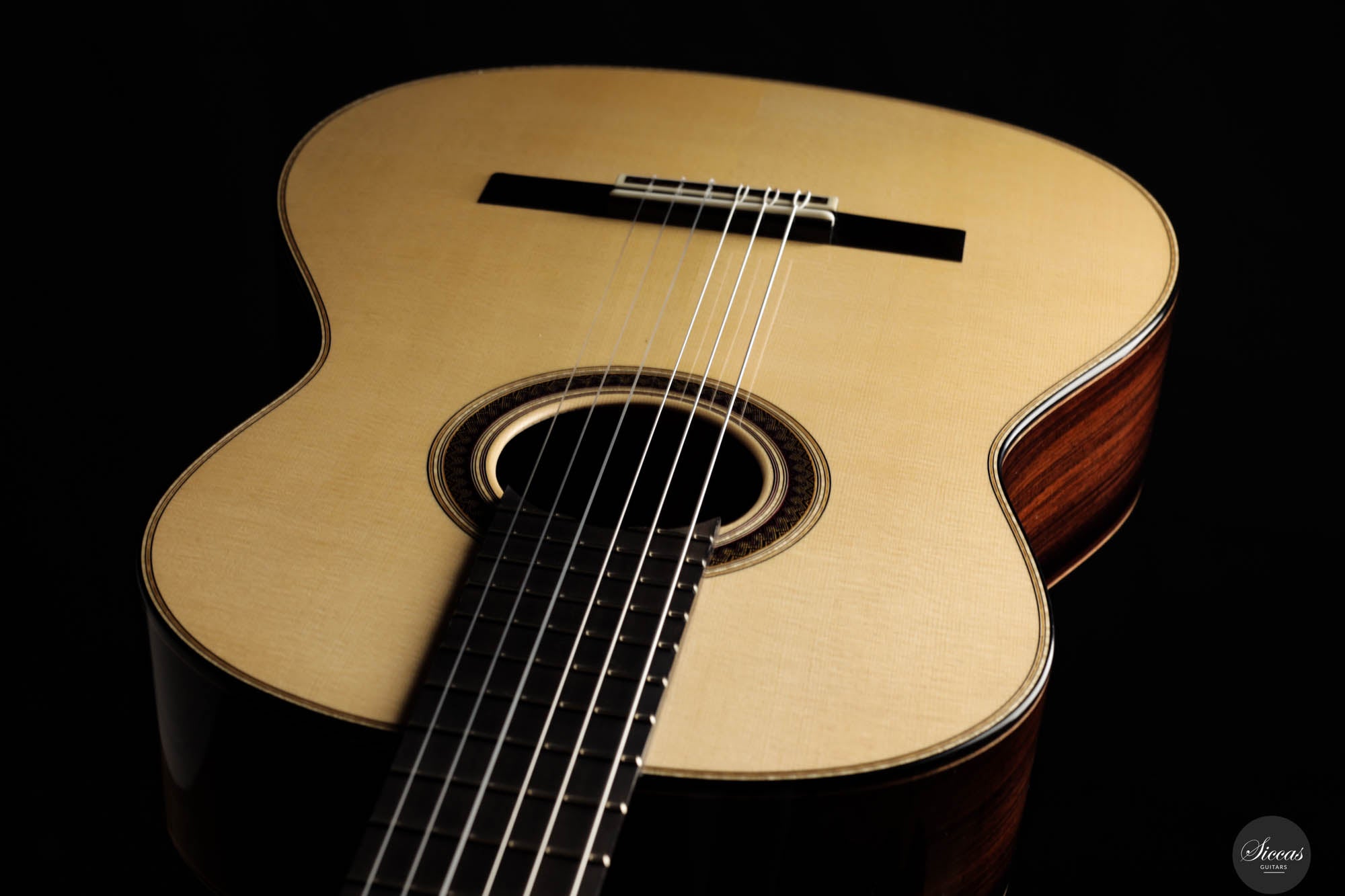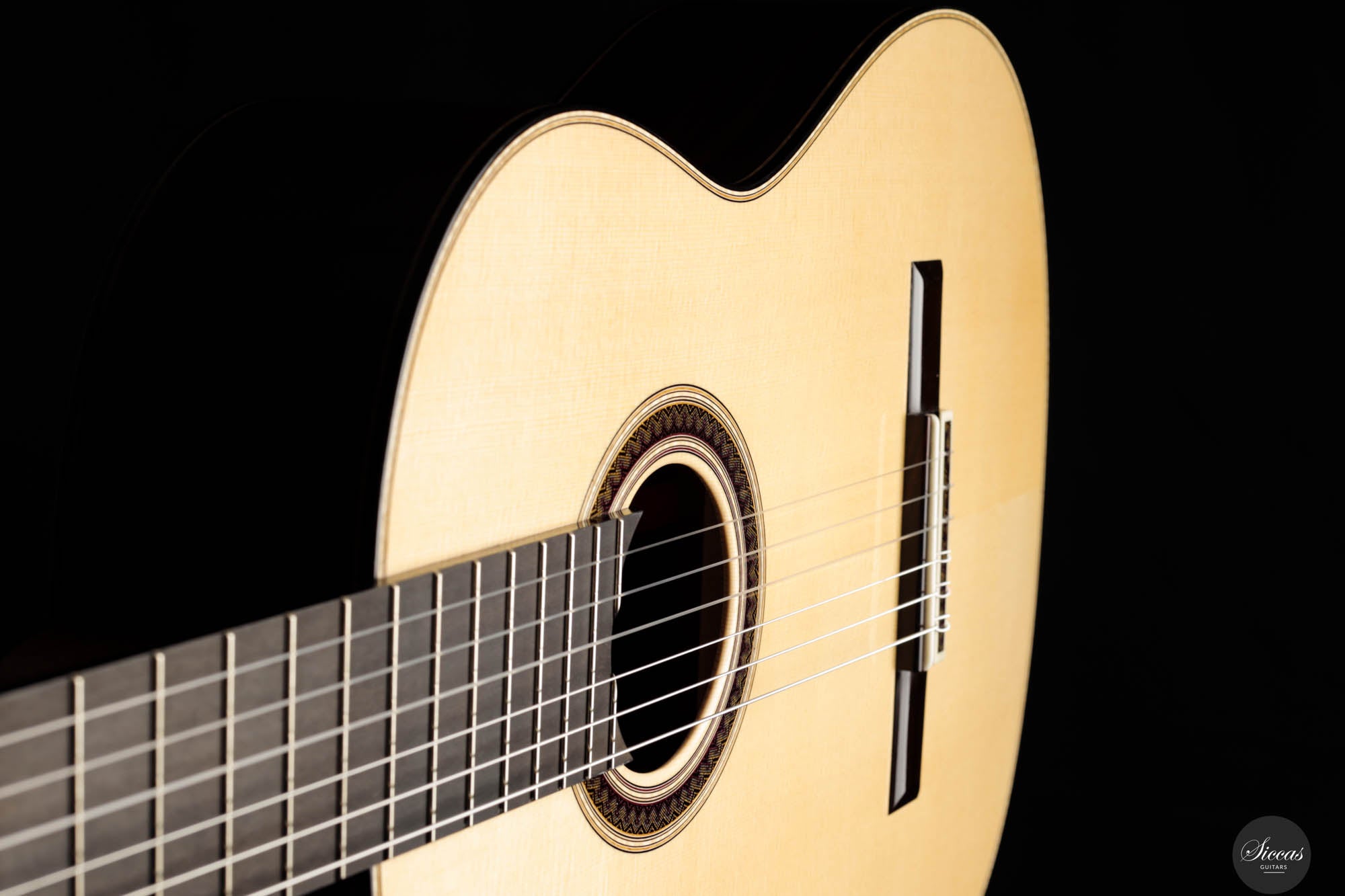 This 2024 classical guitar by Raffaele Dantone is built in the traditional style, with a spruce top and Indian rosewood back and sides. The choice of materials gives the instrument a clear tonal center, with warmth and depth in the bass register and a singing, focused quality in the trebles. Its voice is balanced and articulate, yet capable of a broad range of colour, which makes it rewarding both for controlled lyrical playing and for more expansive concert repertoire.