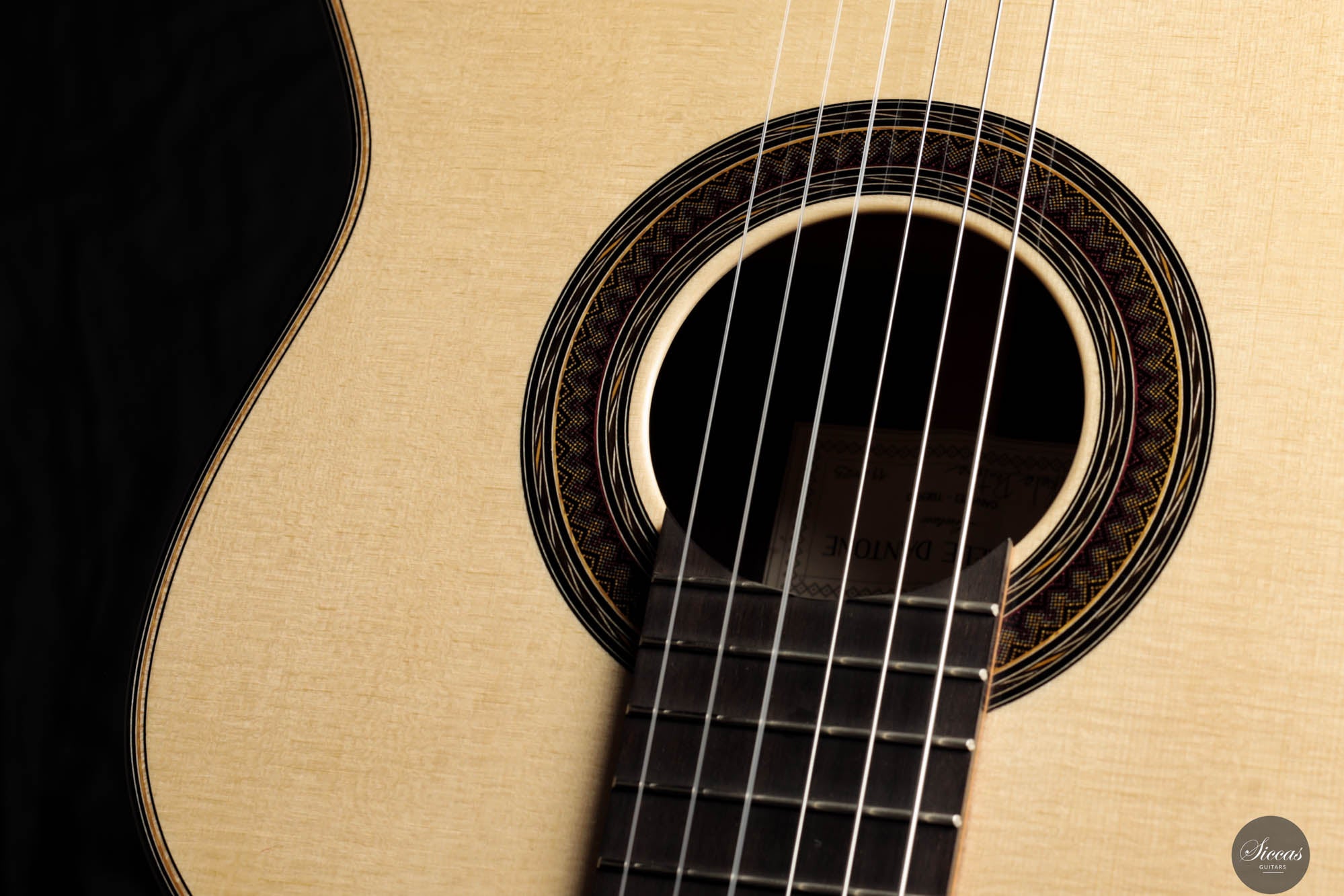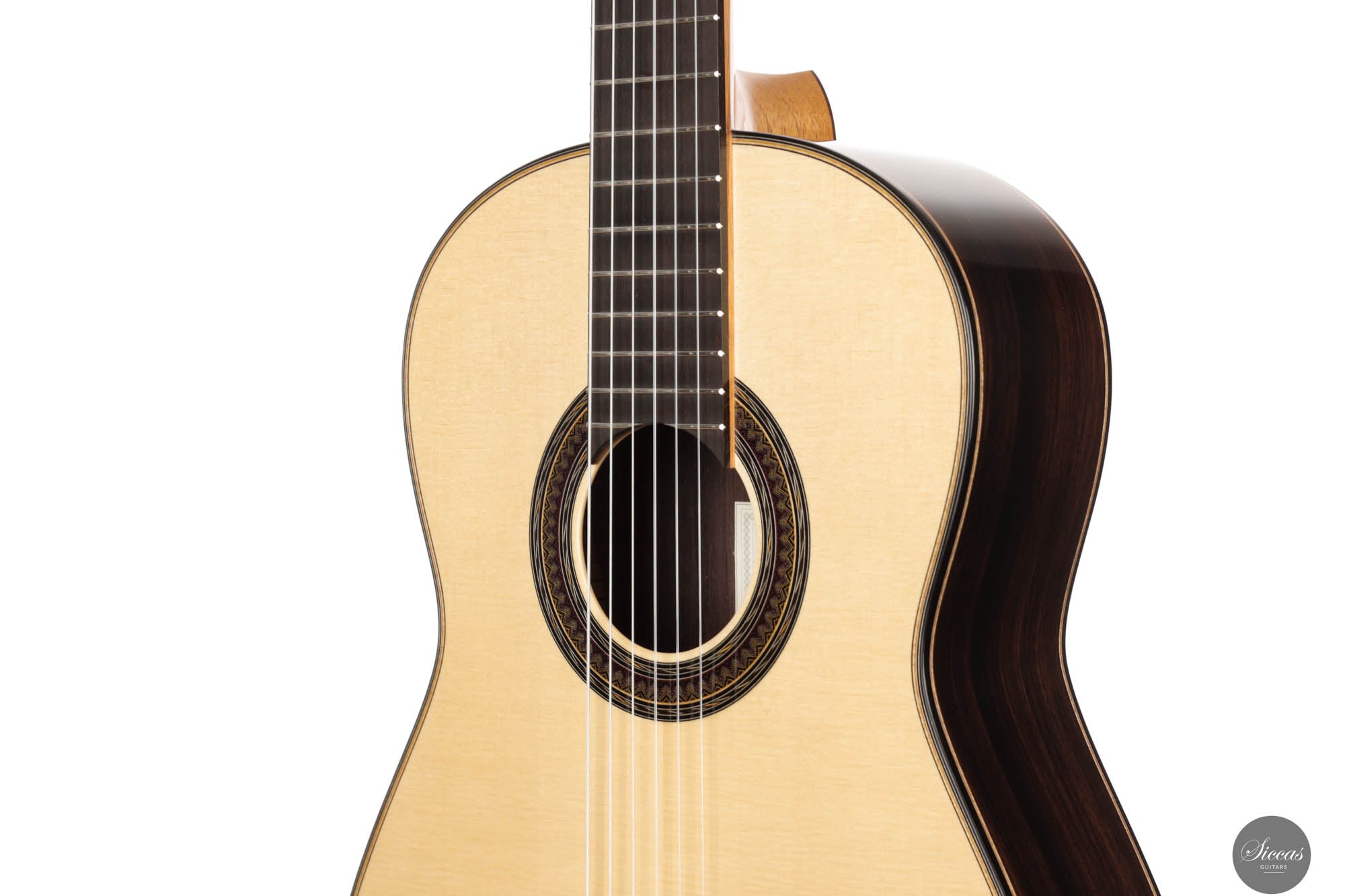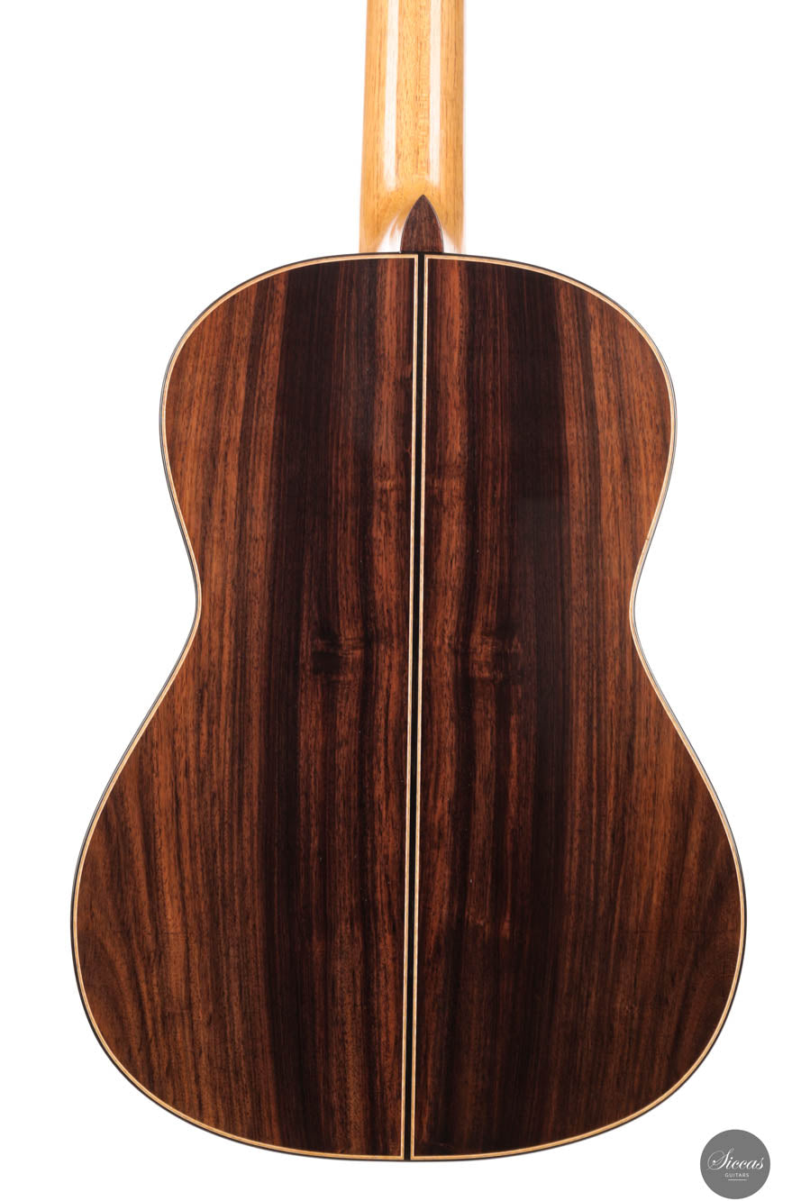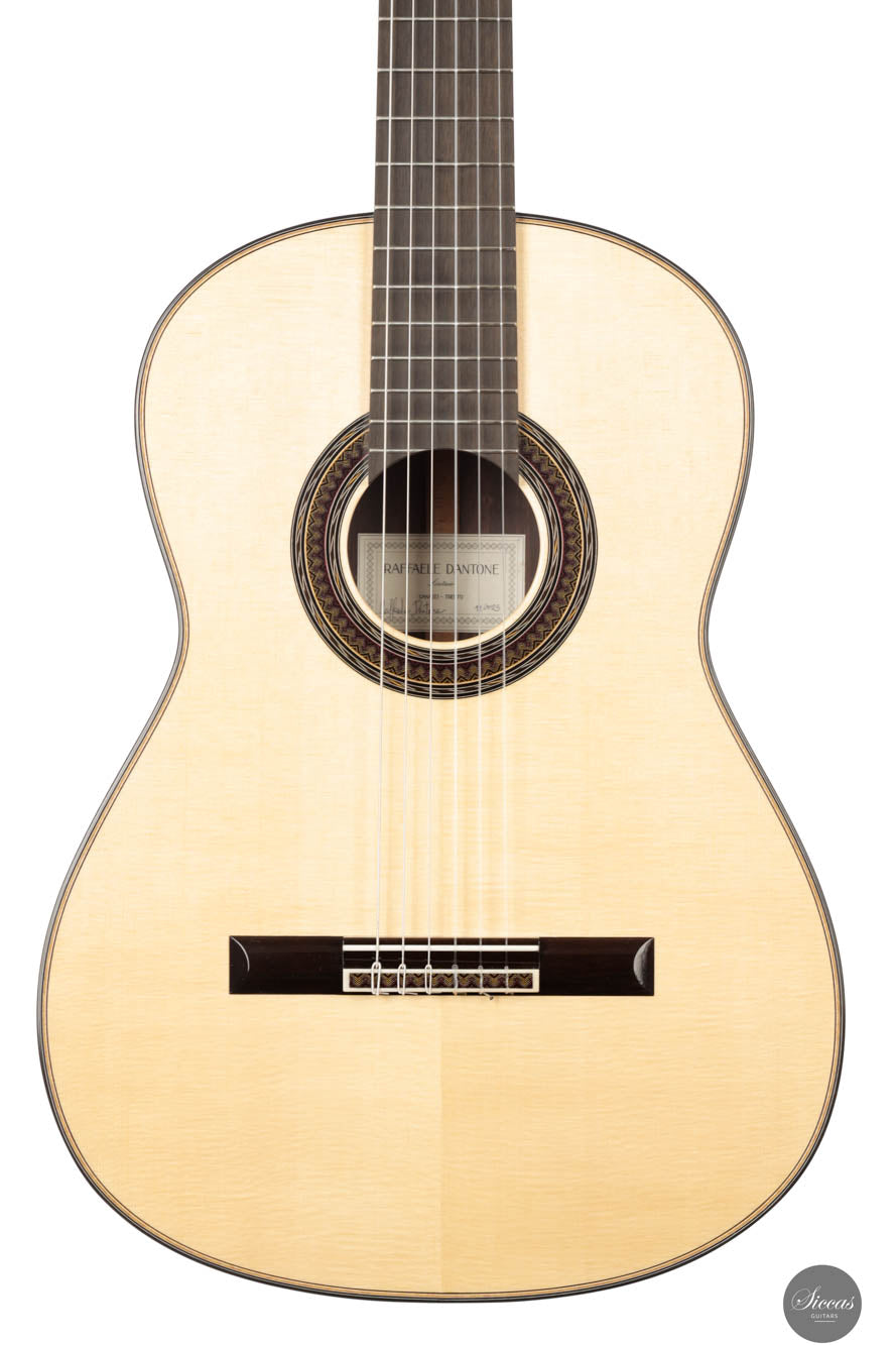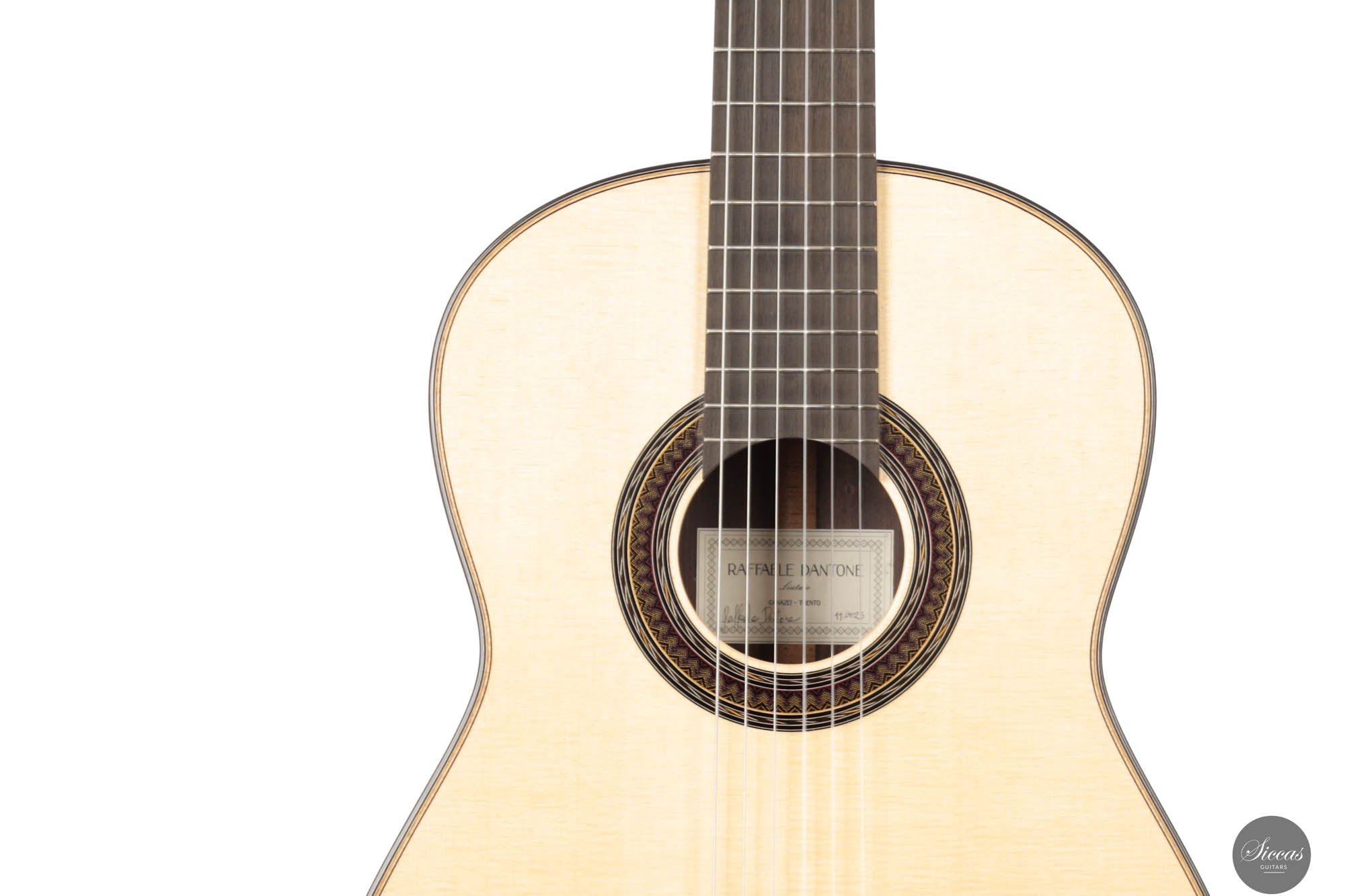 This 2025 No. 11 guitar is a wonderful example of Raffaele Dantone’s talent and dedication to his craft. Inspired by the traditional fan bracing of Antonio de Torres, he has taken the design further by incorporating thicker sides, enhancing structural stability and notably improving projection and tonal depth. The spruce top and Indian rosewood back and sides are beautifully crafted, showcasing Raffaele’s refined aesthetic sensibilities and precision. The result is an instrument with crystal-clear trebles that soar effortlessly, and deep, full-bodied basses with a main resonance around F#, providing excellent balance and richness across the registers.