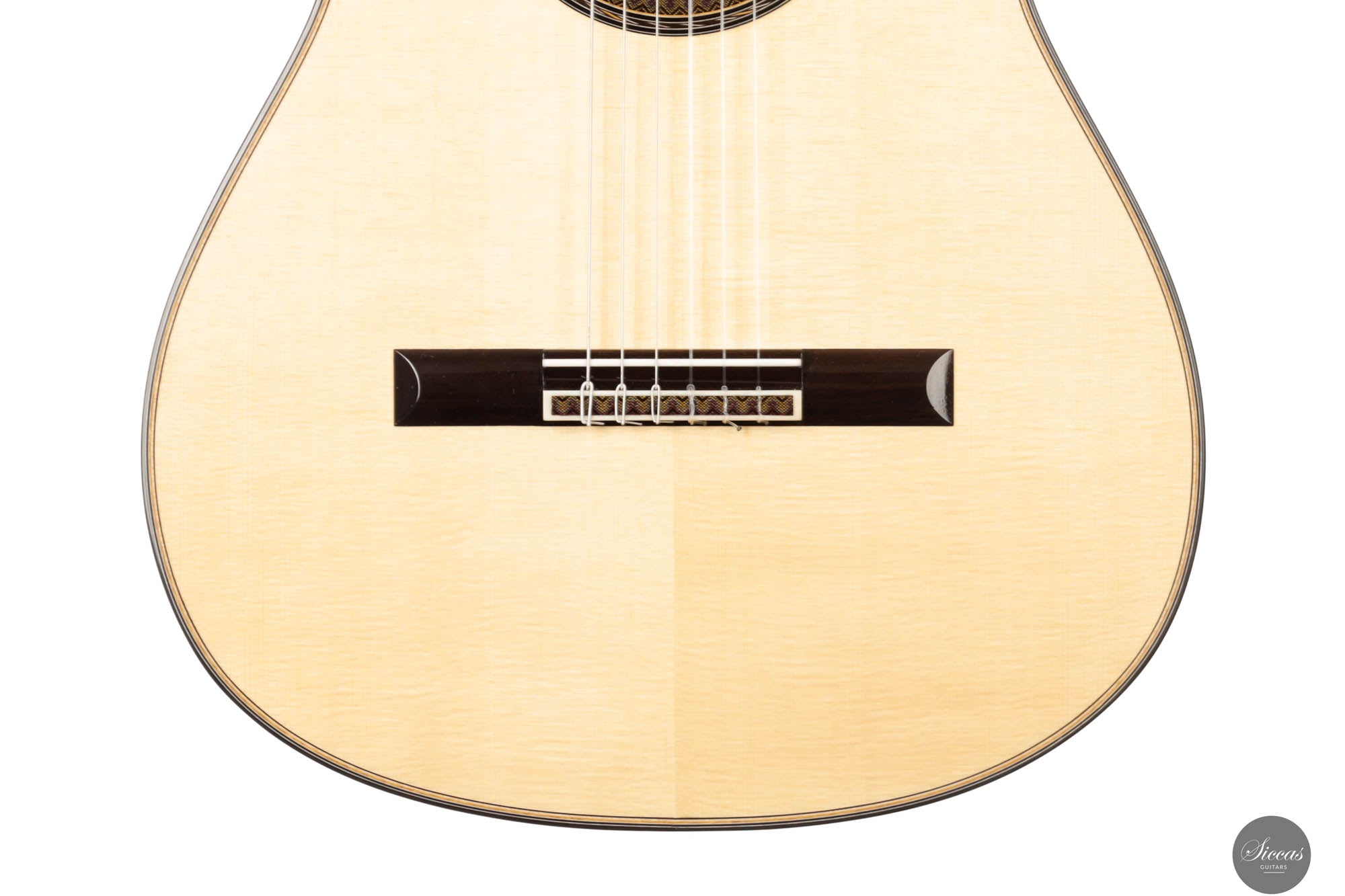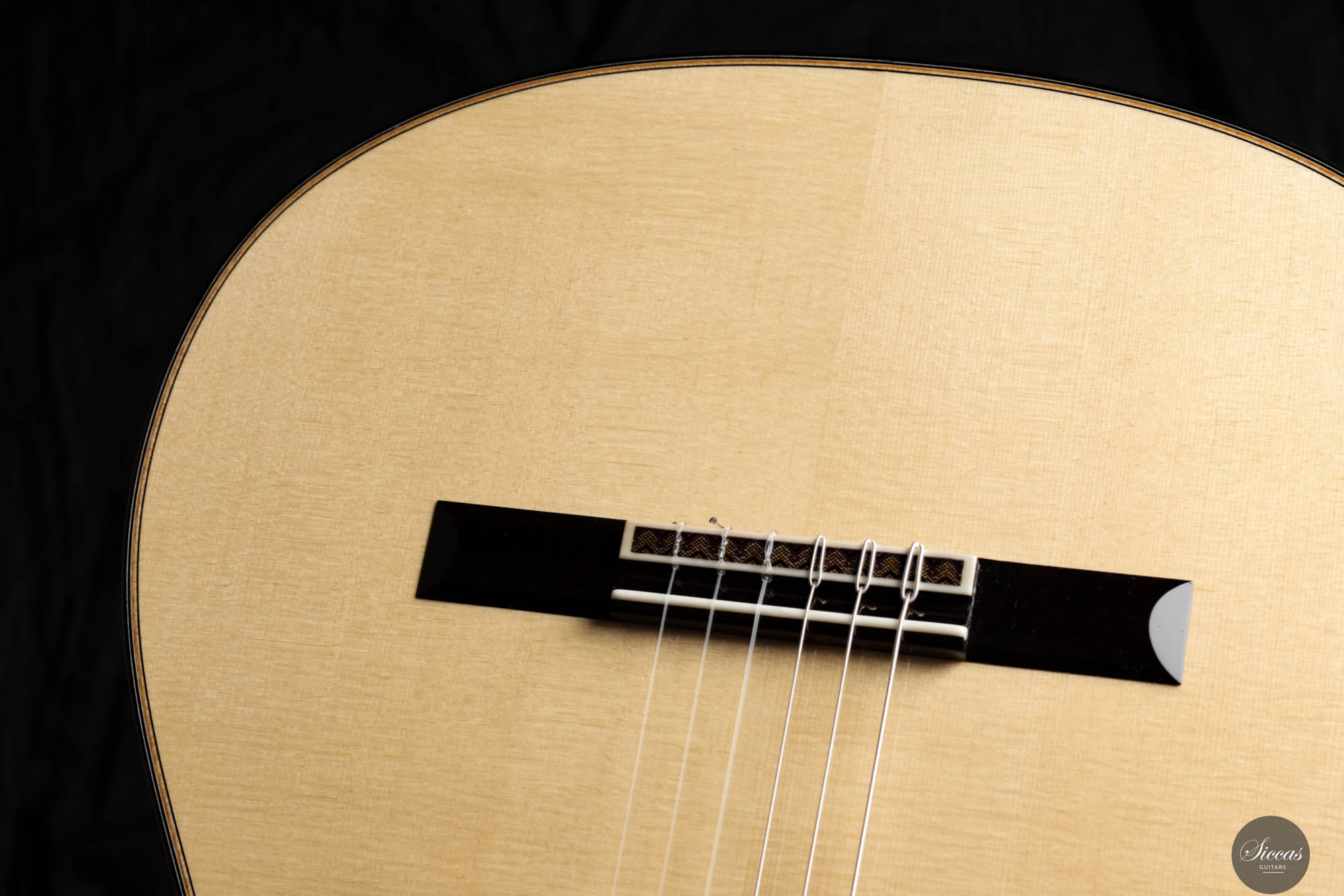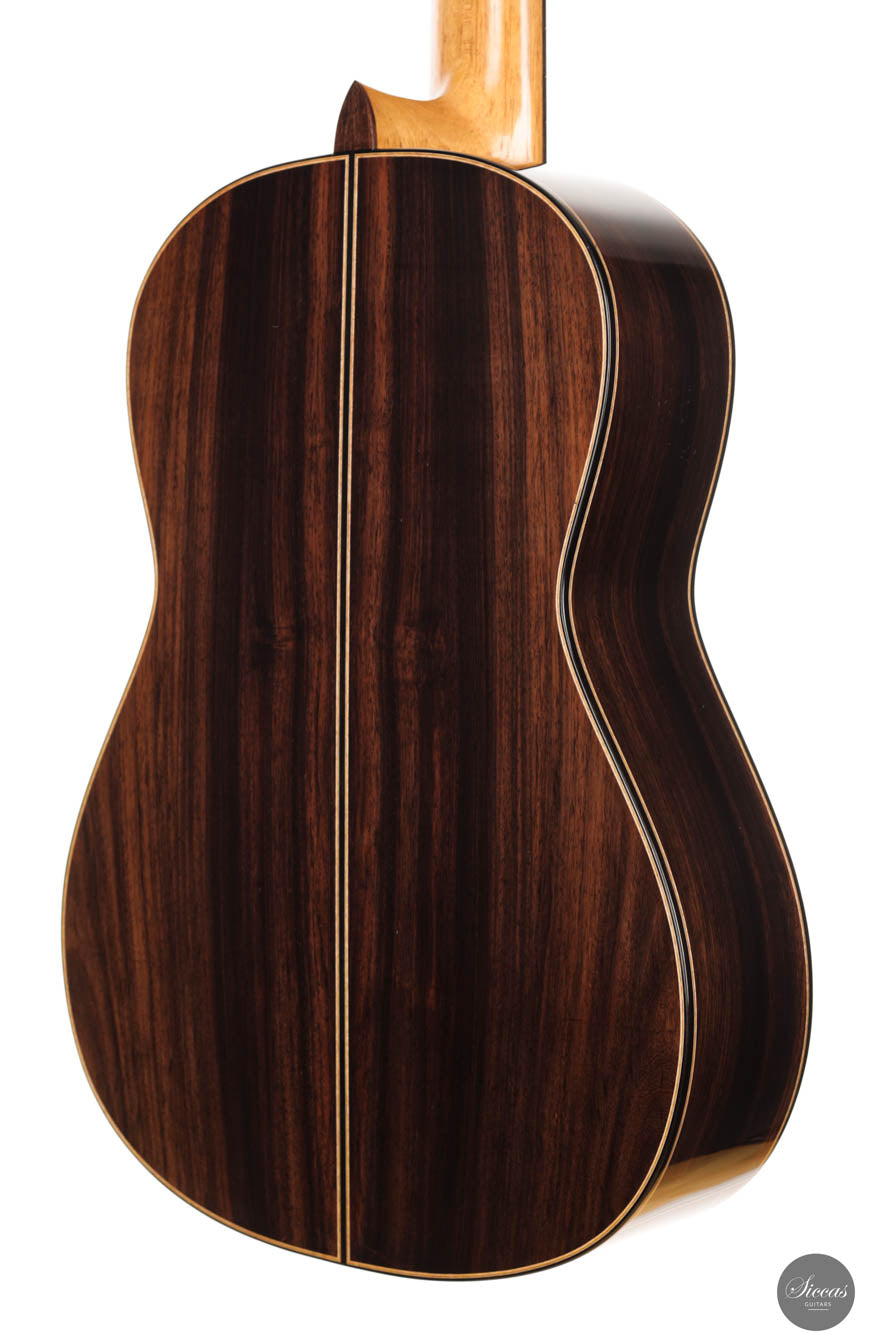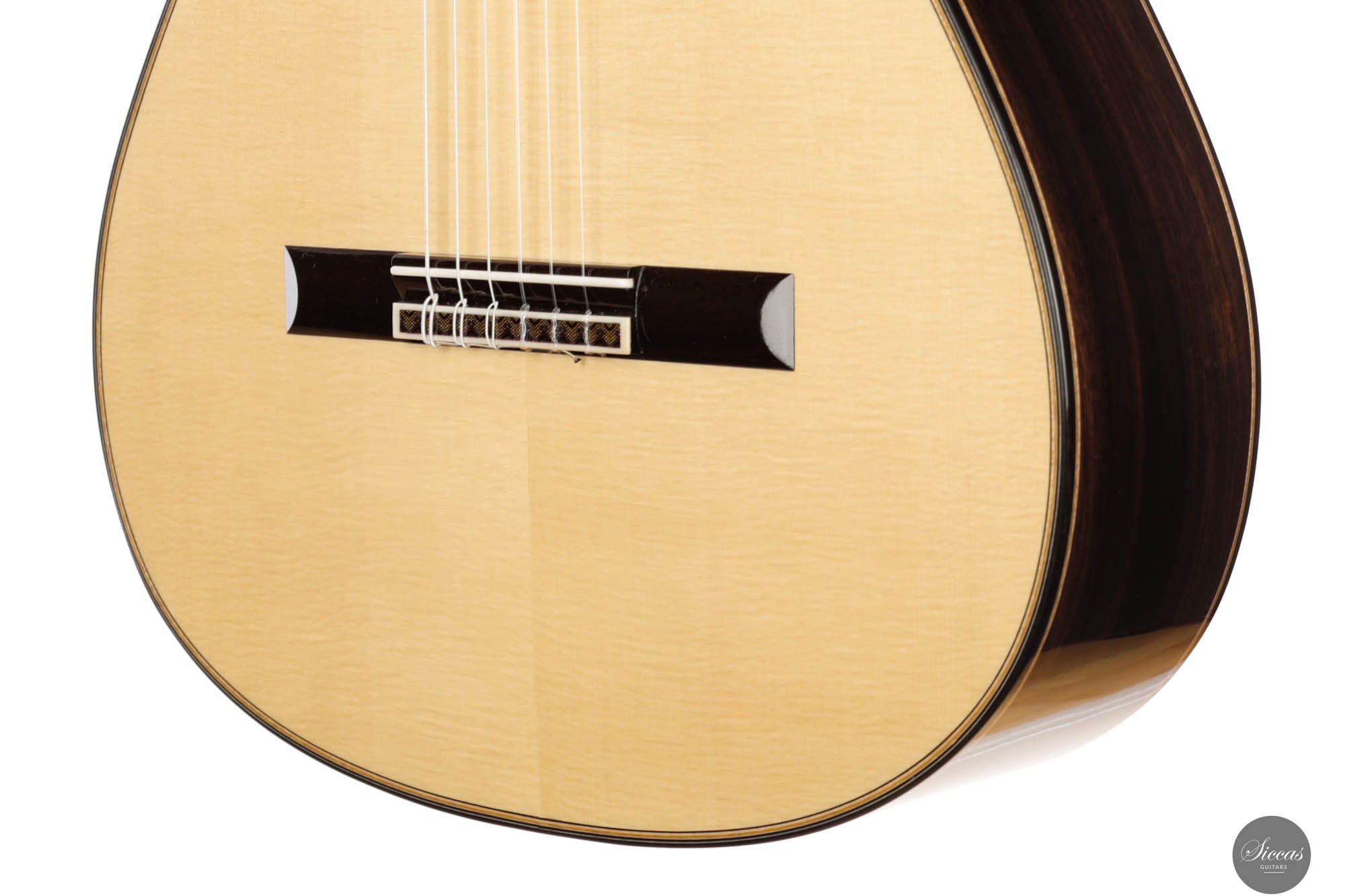 This 2025 No. 11 guitar is a wonderful example of Raffaele Dantone’s talent and dedication to his craft. Inspired by the traditional fan bracing of Antonio de Torres, he has taken the design further by incorporating thicker sides, enhancing structural stability and notably improving projection and tonal depth. The spruce top and Indian rosewood back and sides are beautifully crafted, showcasing Raffaele’s refined aesthetic sensibilities and precision. The result is an instrument with crystal-clear trebles that soar effortlessly, and deep, full-bodied basses with a main resonance around F#, providing excellent balance and richness across the registers.