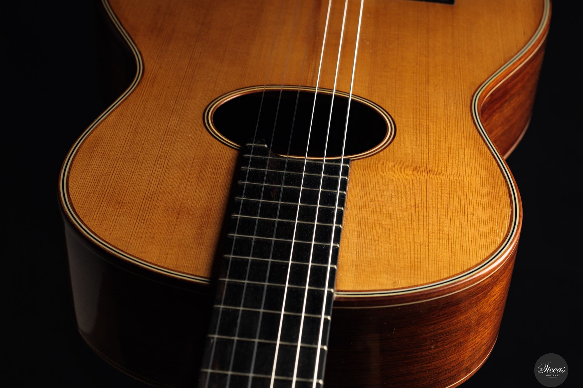 Tonally, the guitar offers a deep, rounded voice with warmth and richness in the basses, and clear, singing trebles that carry easily across a room. The enlarged resonating body and carefully tuned construction allow for both delicacy and presence. The instrument speaks with immediacy and subtlety, responding to the lightest touch while also supporting dynamic phrasing with ease. Its balance, especially across registers, is striking, and the tone remains full and vocal even in pianissimo passages.