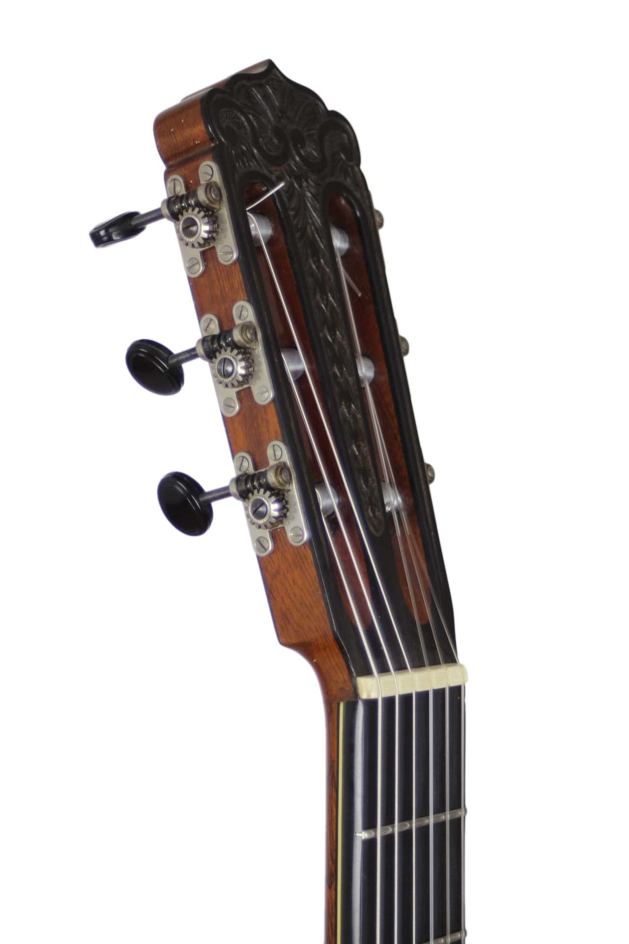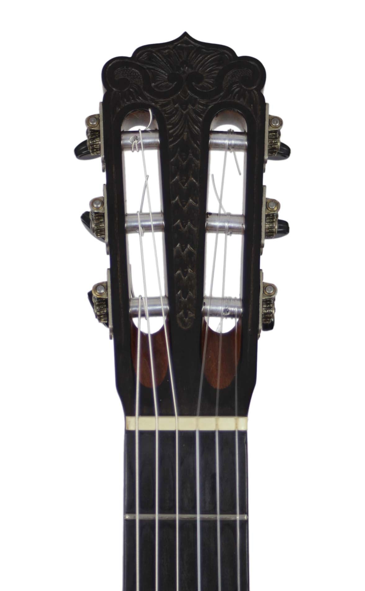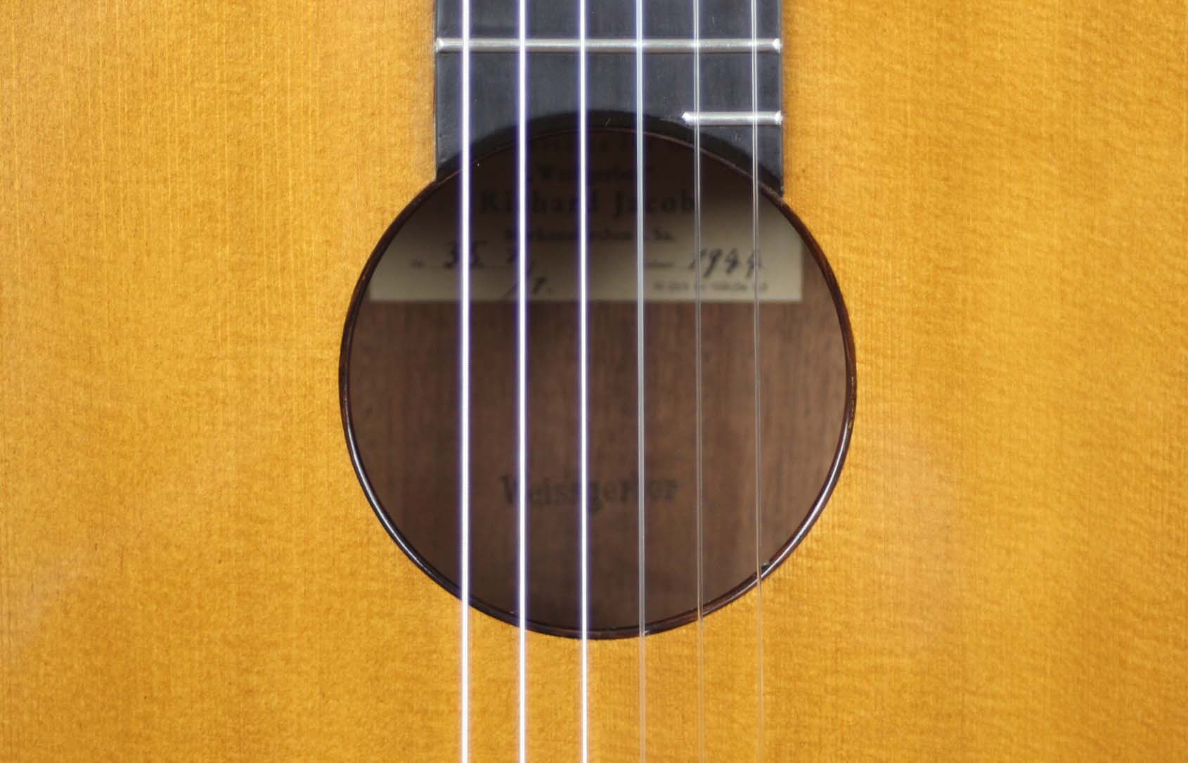 This is a 1944 Richard Jacob Weissgerber Simplicio with small body in almost perfect original condition. There are only some little signs on the top and the back. When Weissgerber got in contact with guitars made by Francisco Simplicio at the beginning of the 1930’s, he was very inspired by the craftsmanship and the high quality of Simplicio’s guitars. So he decided to develop a new guitar model that was inspired by the Spanish maker. This guitar has no cracks or repairs at all and the neck is absolutely straight. Back and sides are made of mahogany and the top is made of finest darkly stained spruce. The head plate is highly decorated on both sides and was carved by Paul Uhlemann (1906-1994). The back is channeled along the sides. Another feature is the holed fretboard at the 13th fret. The tuning machines are original.