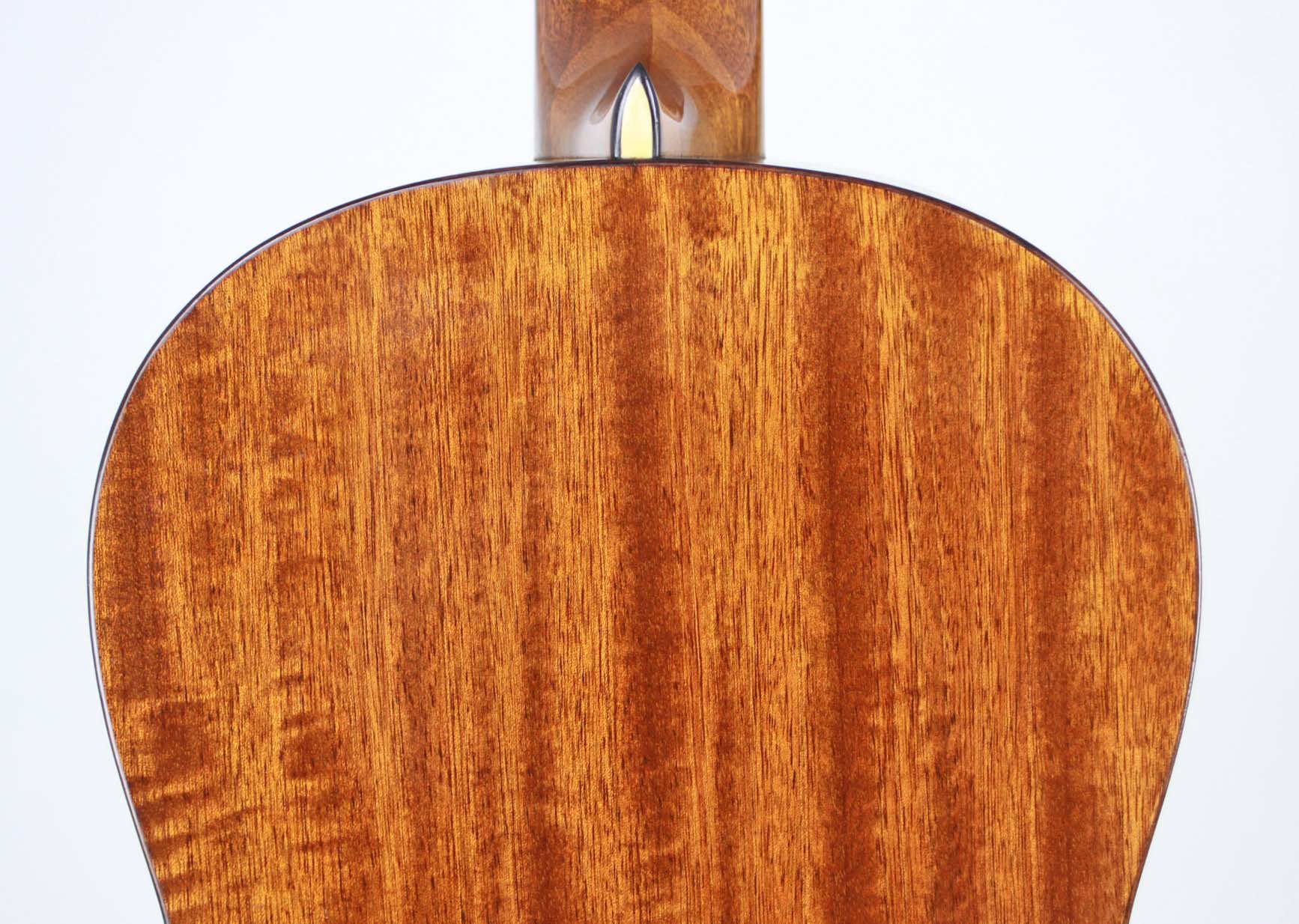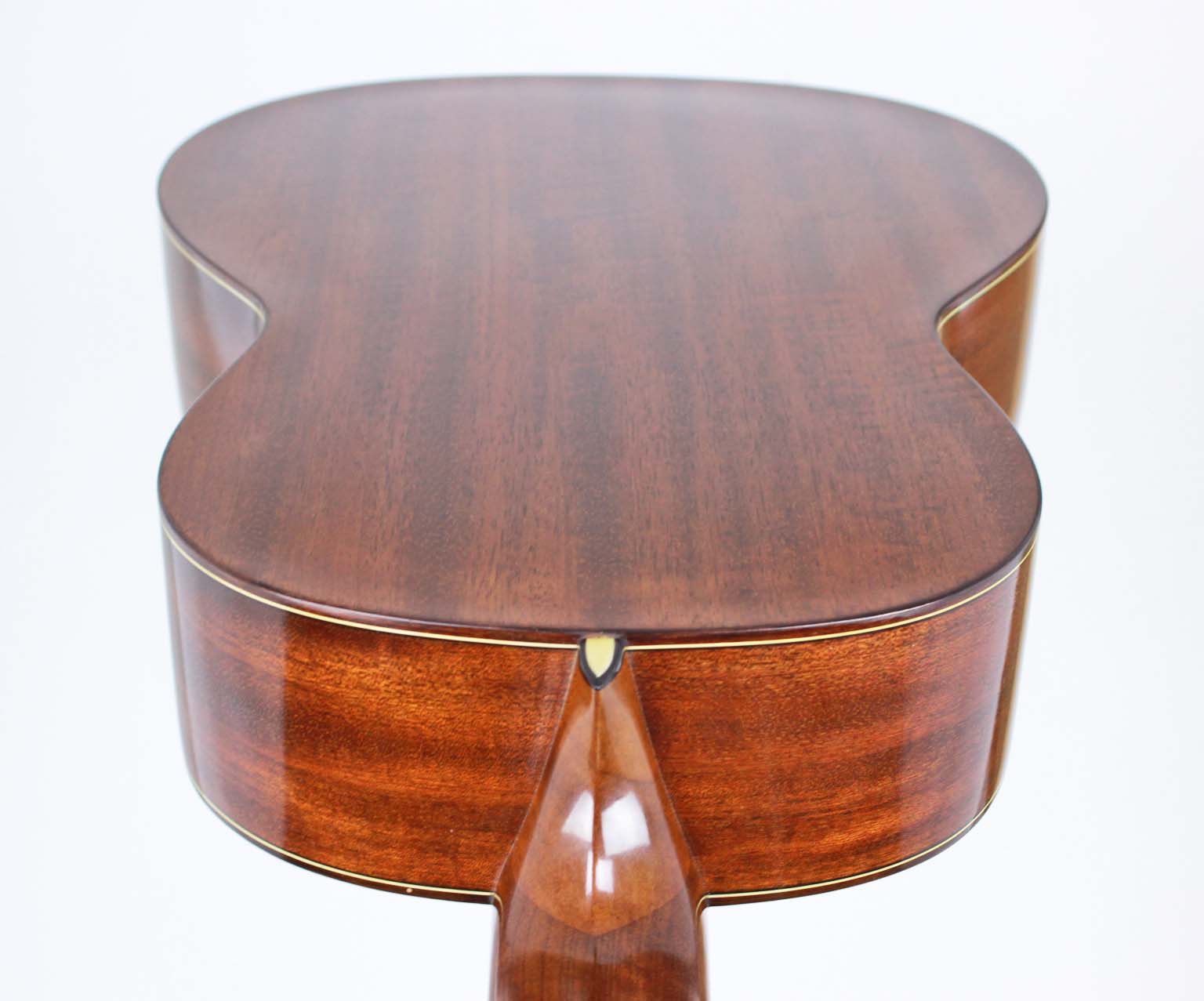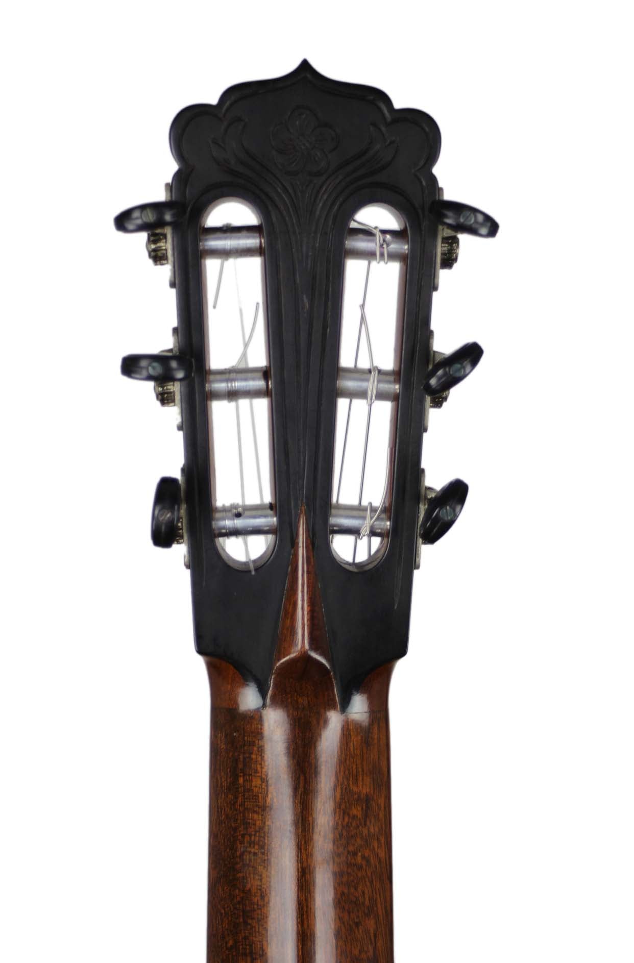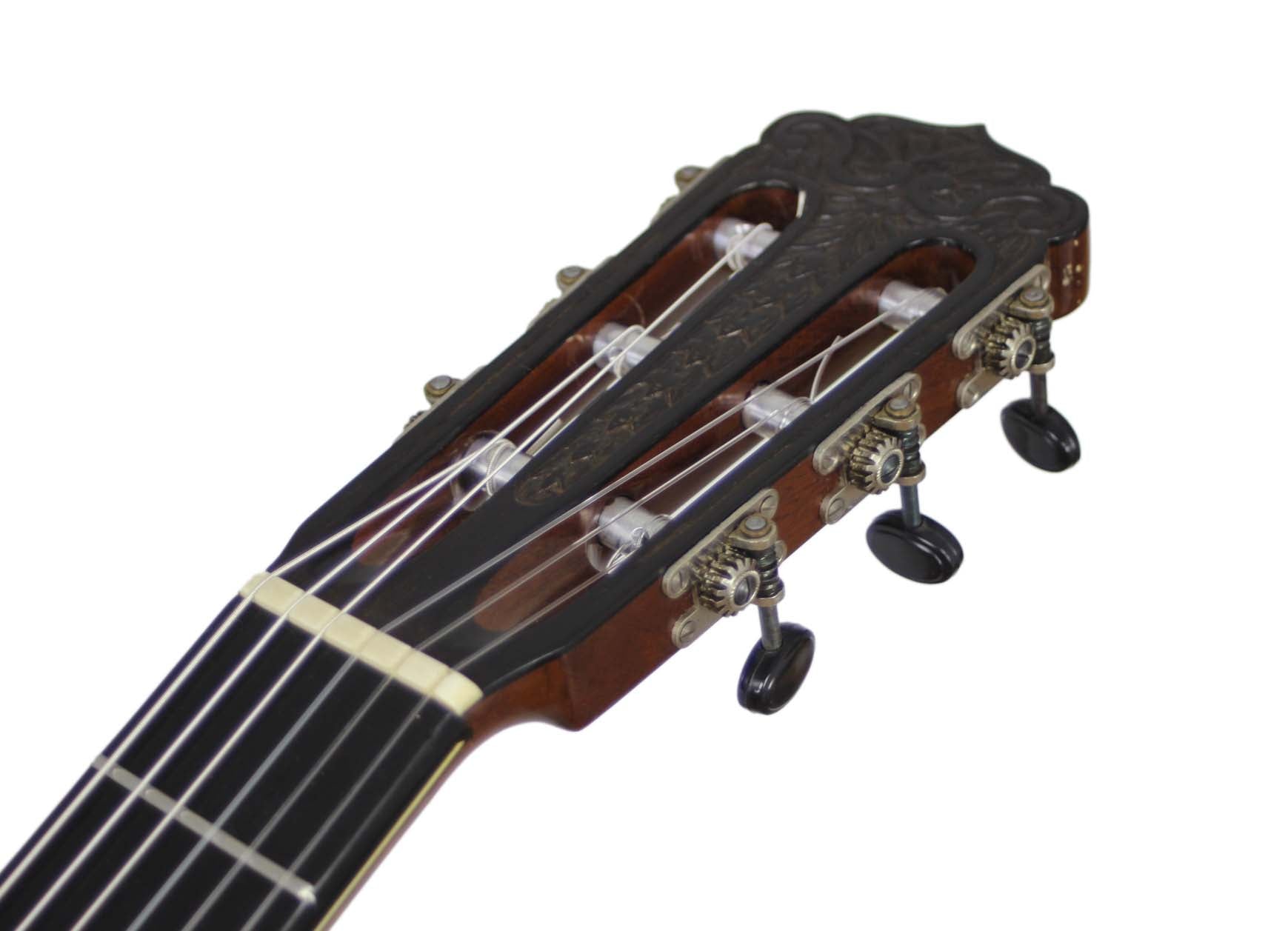 This is a 1944 Richard Jacob Weissgerber Simplicio with small body in almost perfect original condition. There are only some little signs on the top and the back. When Weissgerber got in contact with guitars made by Francisco Simplicio at the beginning of the 1930’s, he was very inspired by the craftsmanship and the high quality of Simplicio’s guitars. So he decided to develop a new guitar model that was inspired by the Spanish maker. This guitar has no cracks or repairs at all and the neck is absolutely straight. Back and sides are made of mahogany and the top is made of finest darkly stained spruce. The head plate is highly decorated on both sides and was carved by Paul Uhlemann (1906-1994). The back is channeled along the sides. Another feature is the holed fretboard at the 13th fret. The tuning machines are original.
