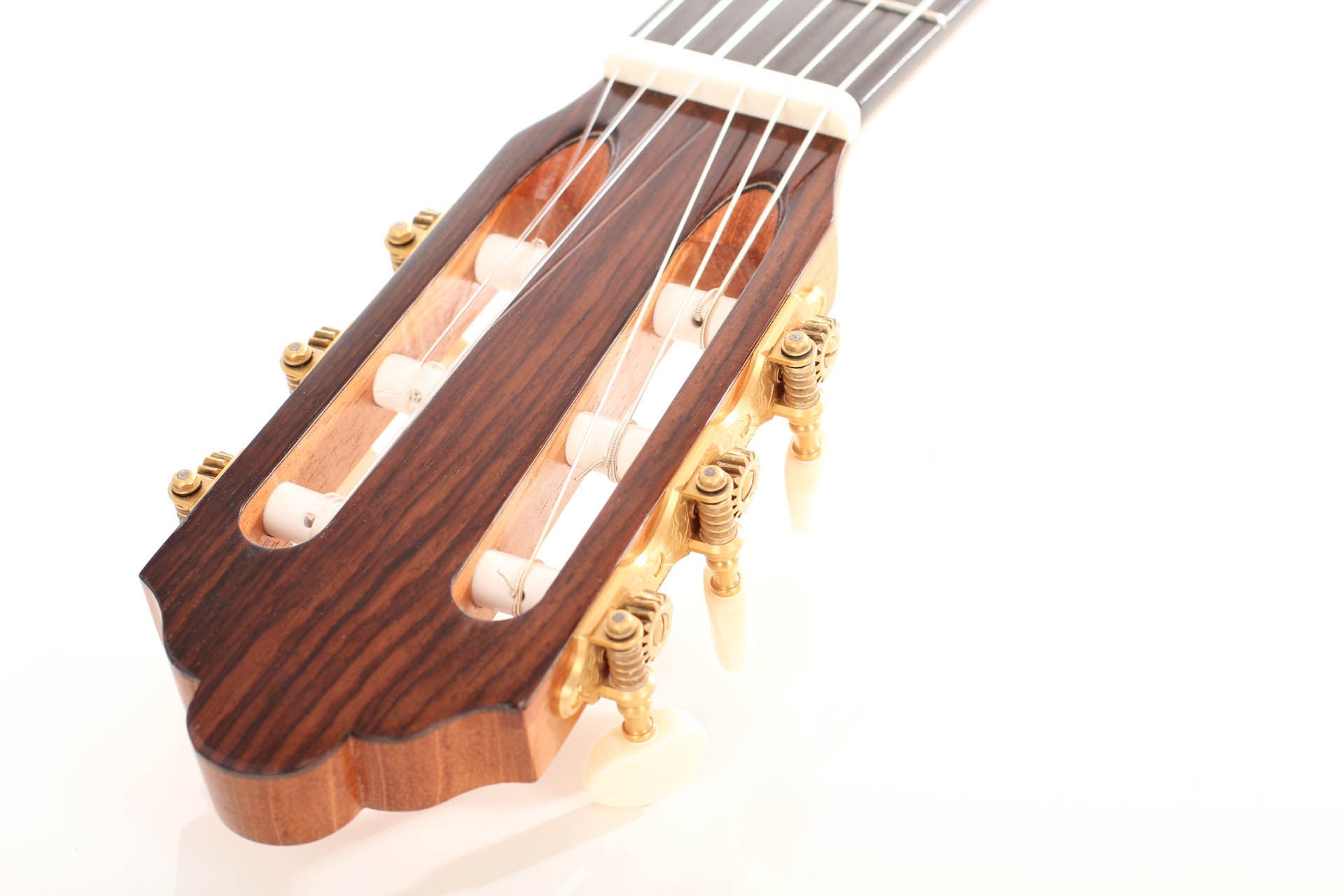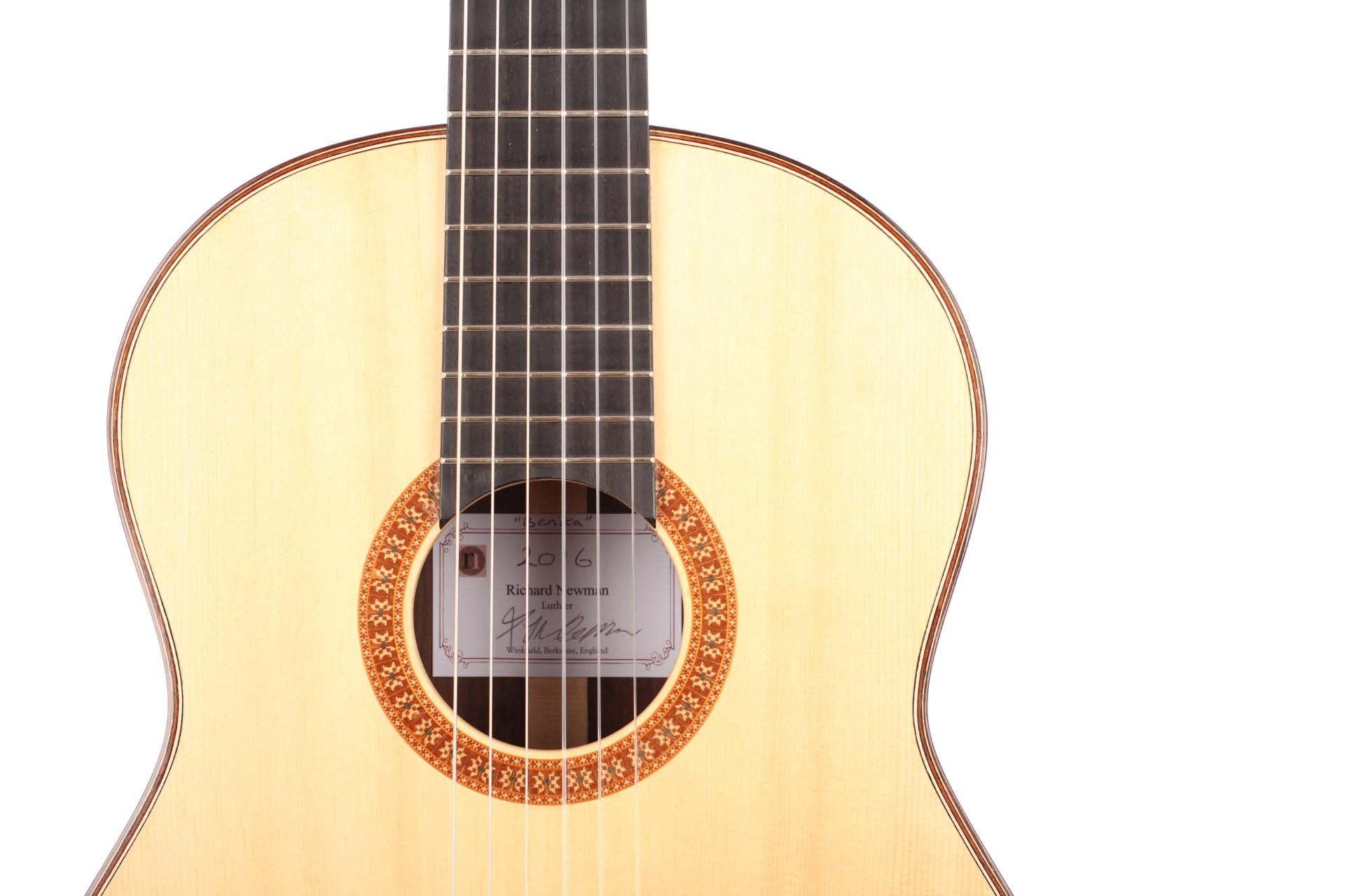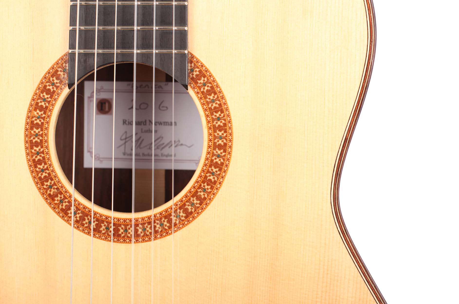 Richard Newman was born in 1964 and studied classical guitar in the mid 90’s under Richard Wright (now head of guitar at the Yehudi Menuhin school of music). During his studies he learned much about sound production and set out to find a good guitar with a traditional “old world sound”. Failing to find the desirable instrument, Richard enthusiastically decided, as he had worked with wood for many years as a tree surgeon, to try to build his own guitar. Richard built a handful of guitars, and with much encouragement from players, left his job and enrolled in a full-time guitar making course at the London Guildhall University in 2001. After completing the course, Richard set up a workshop in Ascot, Berkshire, where he builds around twelve guitars a year. Richard builds using very little machinery, concentrating on using traditional hand tools and glues, as he feels it is important to be in touch with the materials to maintain control over his work. Richard has also received a lot of guidance and advice from professional players and other makers over the years. He also studied many master guitars, which has helped him evolve as a maker and produce well balanced guitars with a low body resonance and fine projection. Richard continues creating guitars with the great passion and enthusiasm. This guitar is named “Benita” and has a European spruce top, back and sides are made of Indian rosewood. The tuning machines are made by Gotoh. Included is a Hiscox Pro II hard case