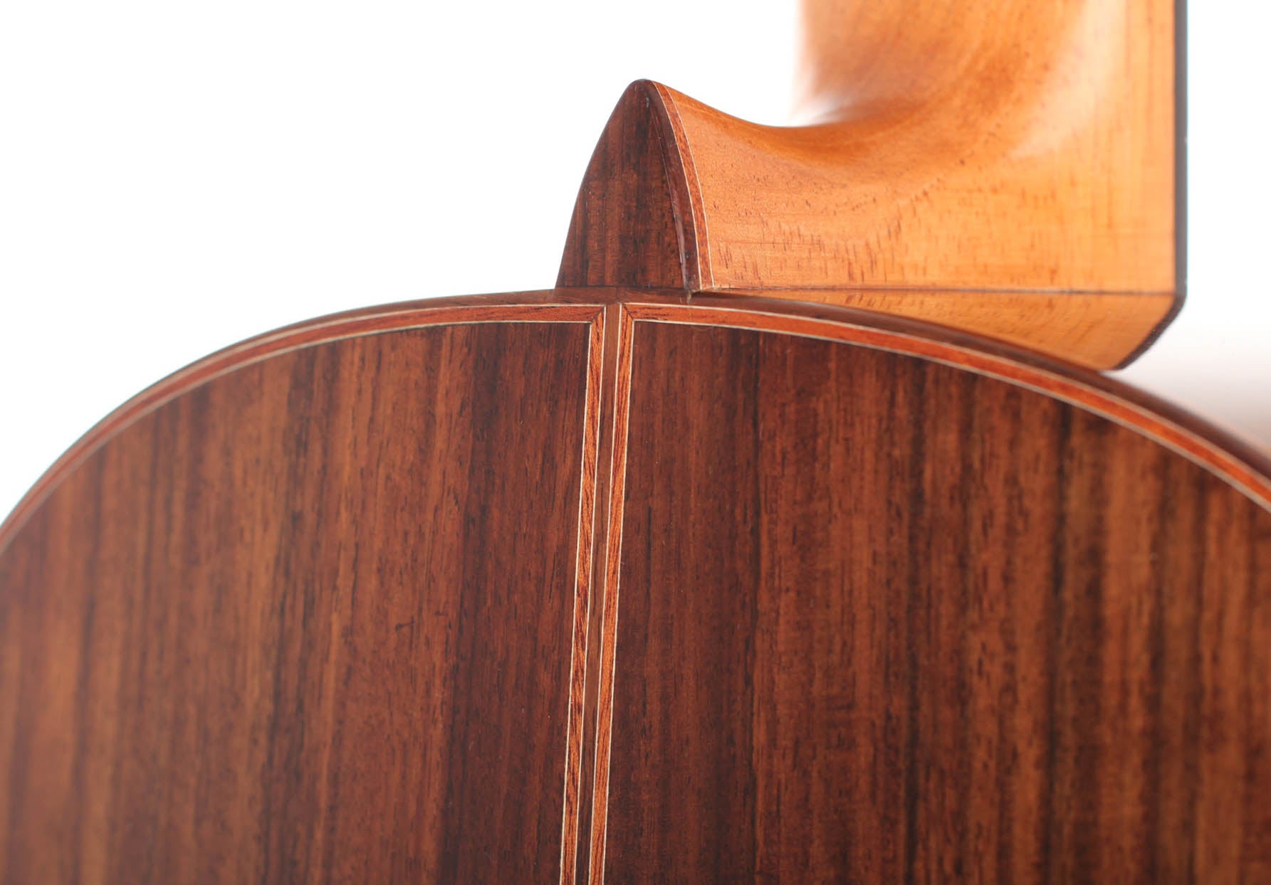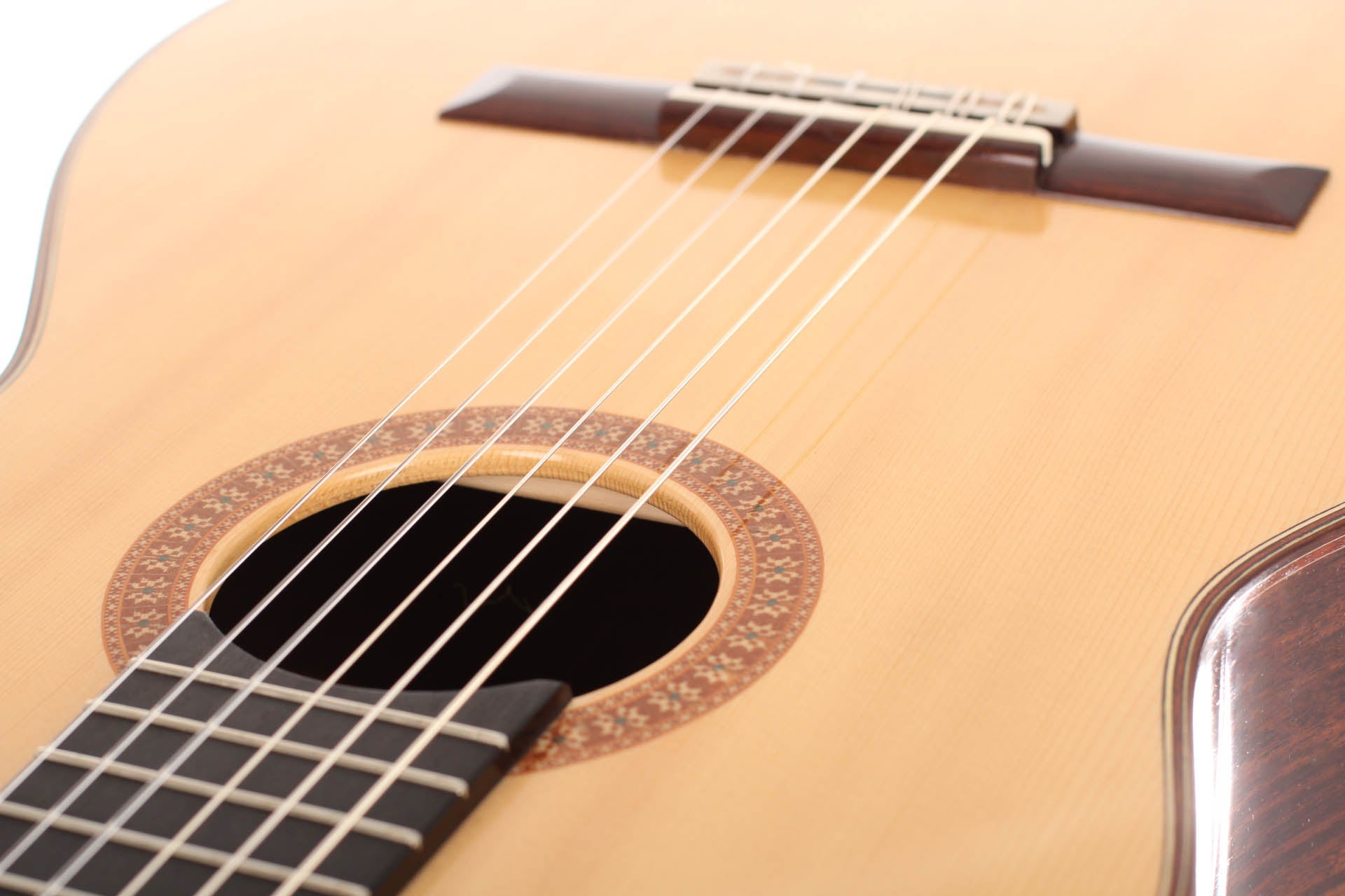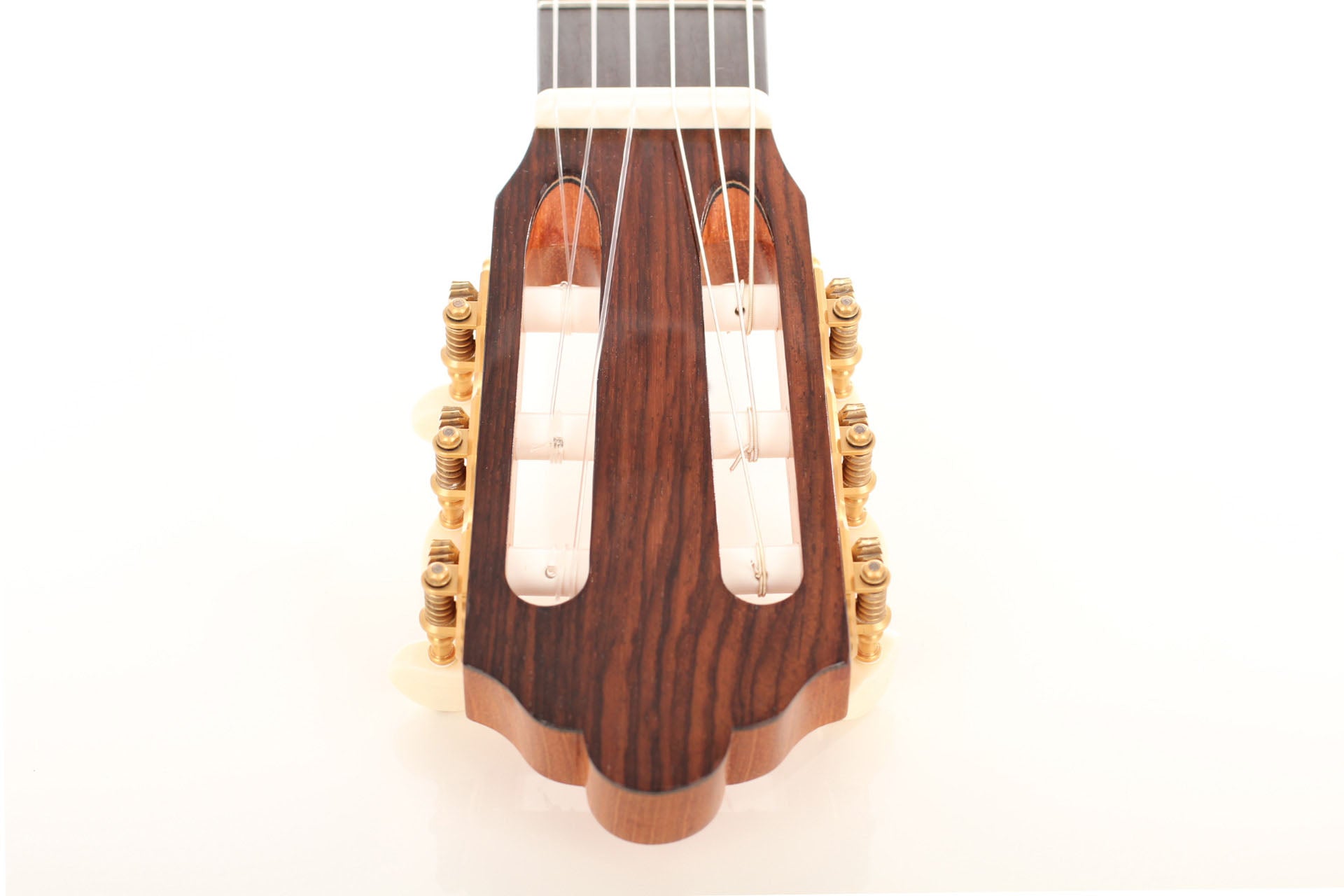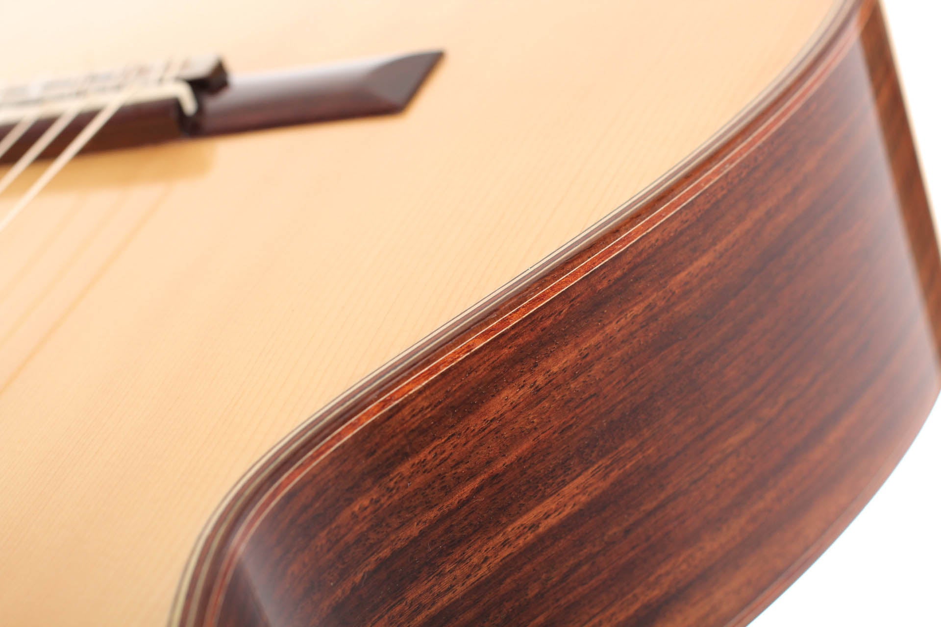 Richard Newman was born in 1964 and studied classical guitar in the mid 90’s under Richard Wright (now head of guitar at the Yehudi Menuhin school of music). During his studies he learned much about sound production and set out to find a good guitar with a traditional “old world sound”. Failing to find the desirable instrument, Richard enthusiastically decided, as he had worked with wood for many years as a tree surgeon, to try to build his own guitar. Richard built a handful of guitars, and with much encouragement from players, left his job and enrolled in a full-time guitar making course at the London Guildhall University in 2001. After completing the course, Richard set up a workshop in Ascot, Berkshire, where he builds around twelve guitars a year. Richard builds using very little machinery, concentrating on using traditional hand tools and glues, as he feels it is important to be in touch with the materials to maintain control over his work. Richard has also received a lot of guidance and advice from professional players and other makers over the years. He also studied many master guitars, which has helped him evolve as a maker and produce well balanced guitars with a low body resonance and fine projection. Richard continues creating guitars with the great passion and enthusiasm. This guitar is named “Benita” and has a European spruce top, back and sides are made of Indian rosewood. The tuning machines are made by Gotoh. Included is a Hiscox Pro II hard case