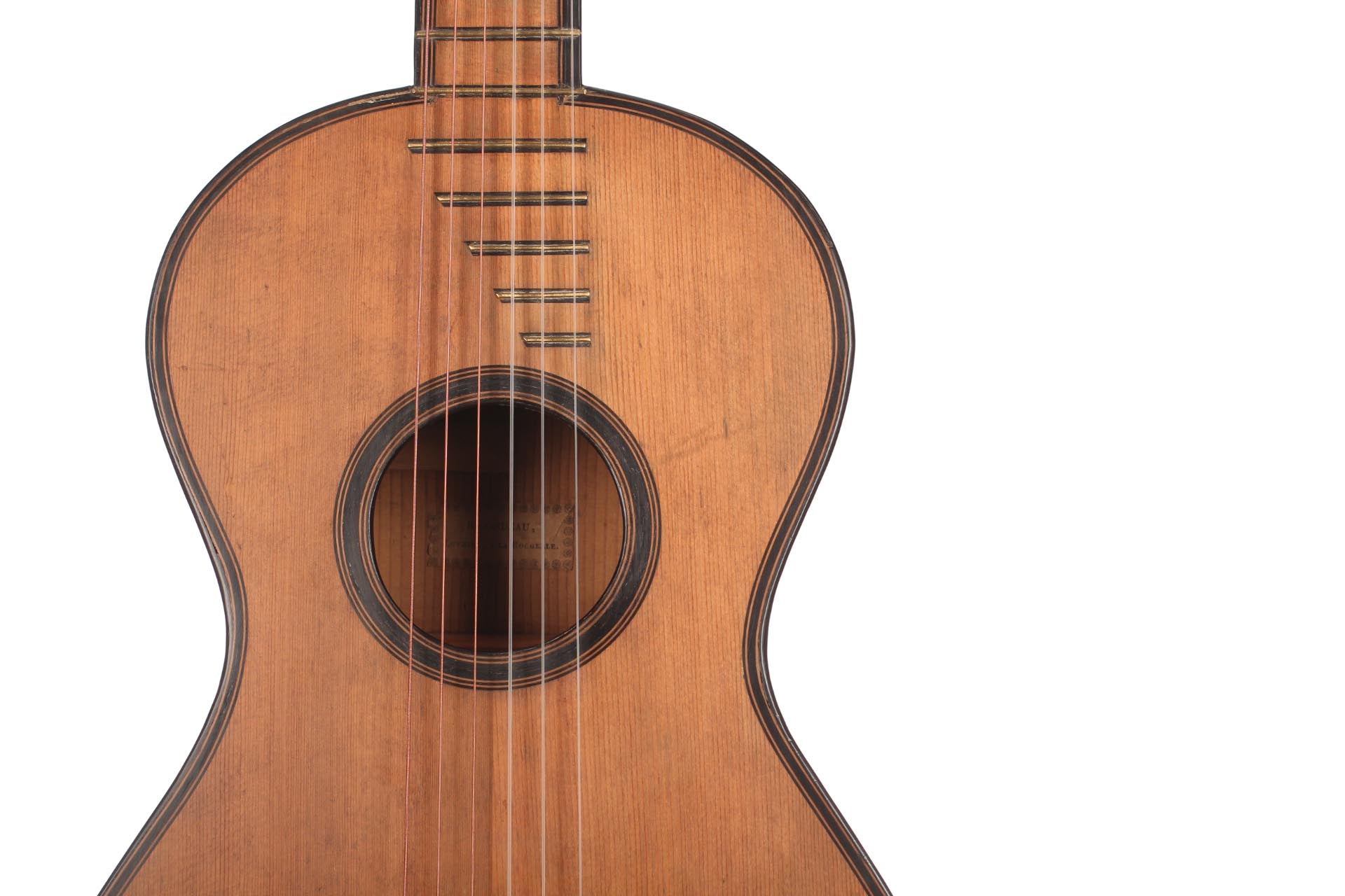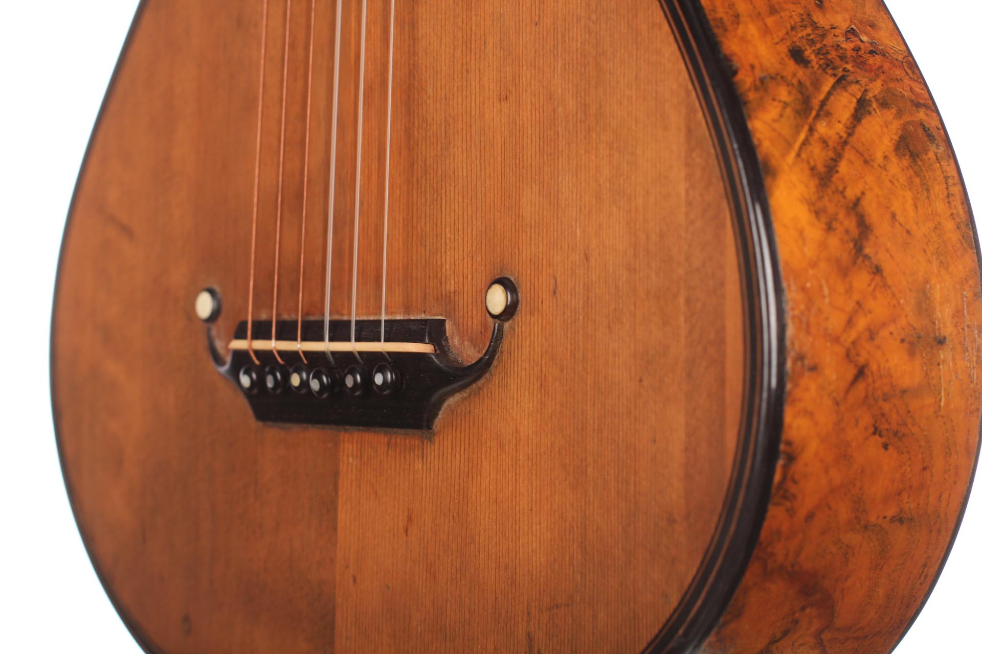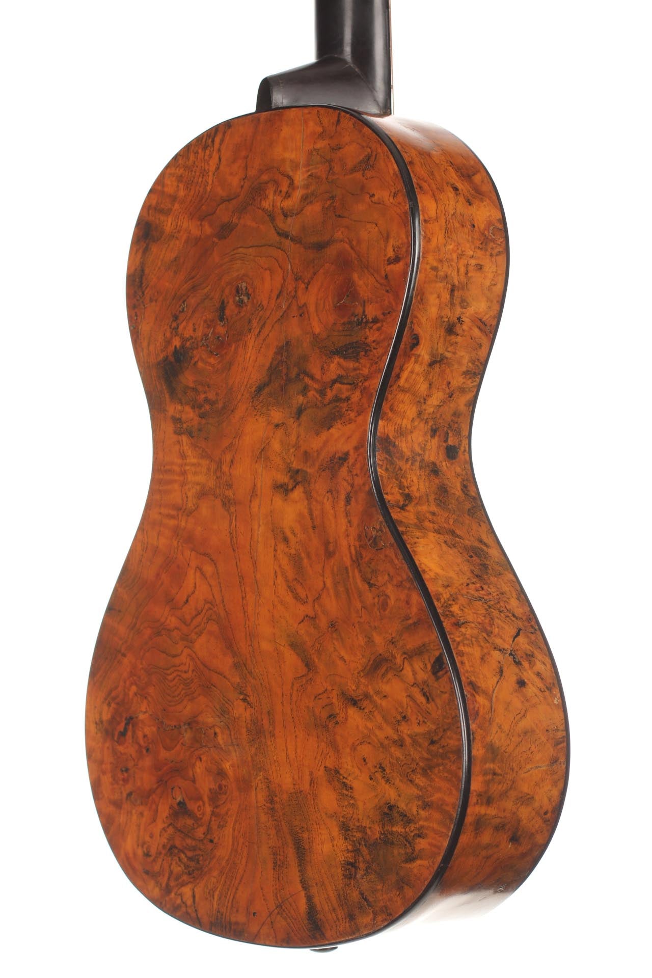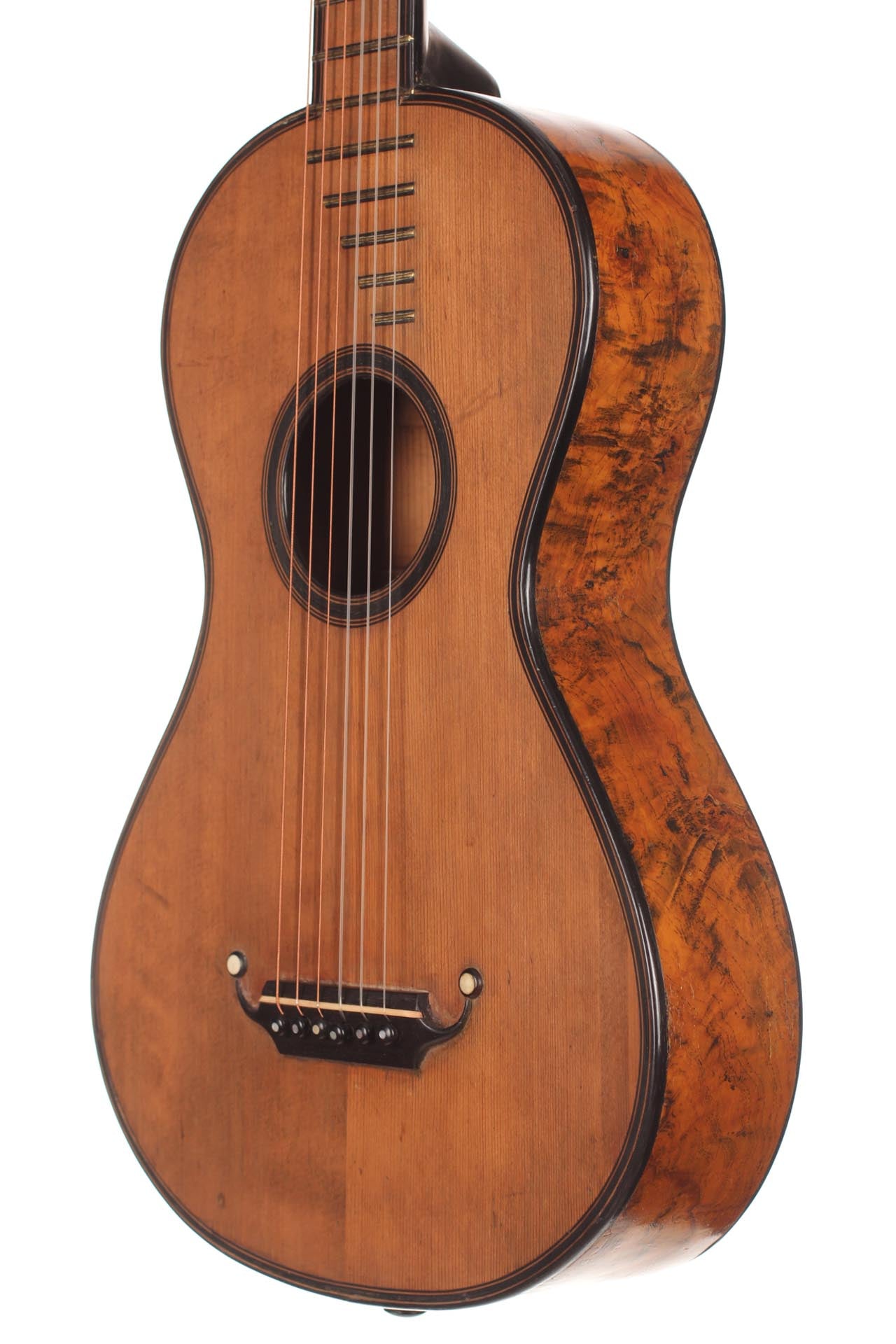 This tierce guitar built around 1825 is a particularly refined and decorated instrument. It has a very fine-grained spruce top and appealing ash burr back and sides. The very comfortable ebony veneered neck is V-joined to the head plate and is perfectly straight. It is a ready-to-be-played tierce guitar with and amazingly sweet and powerful sound, that will fit any romantic chamber-music concert player.