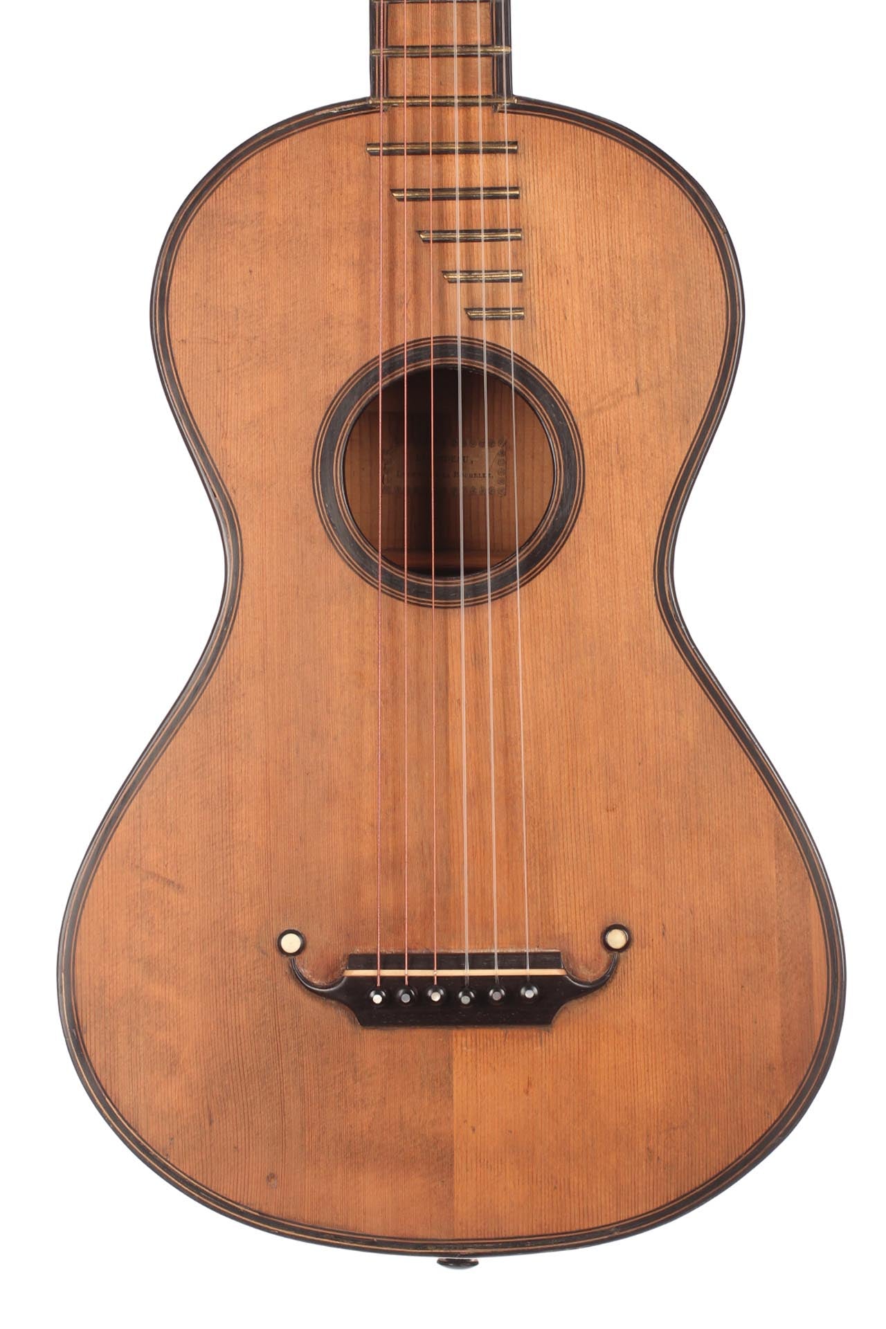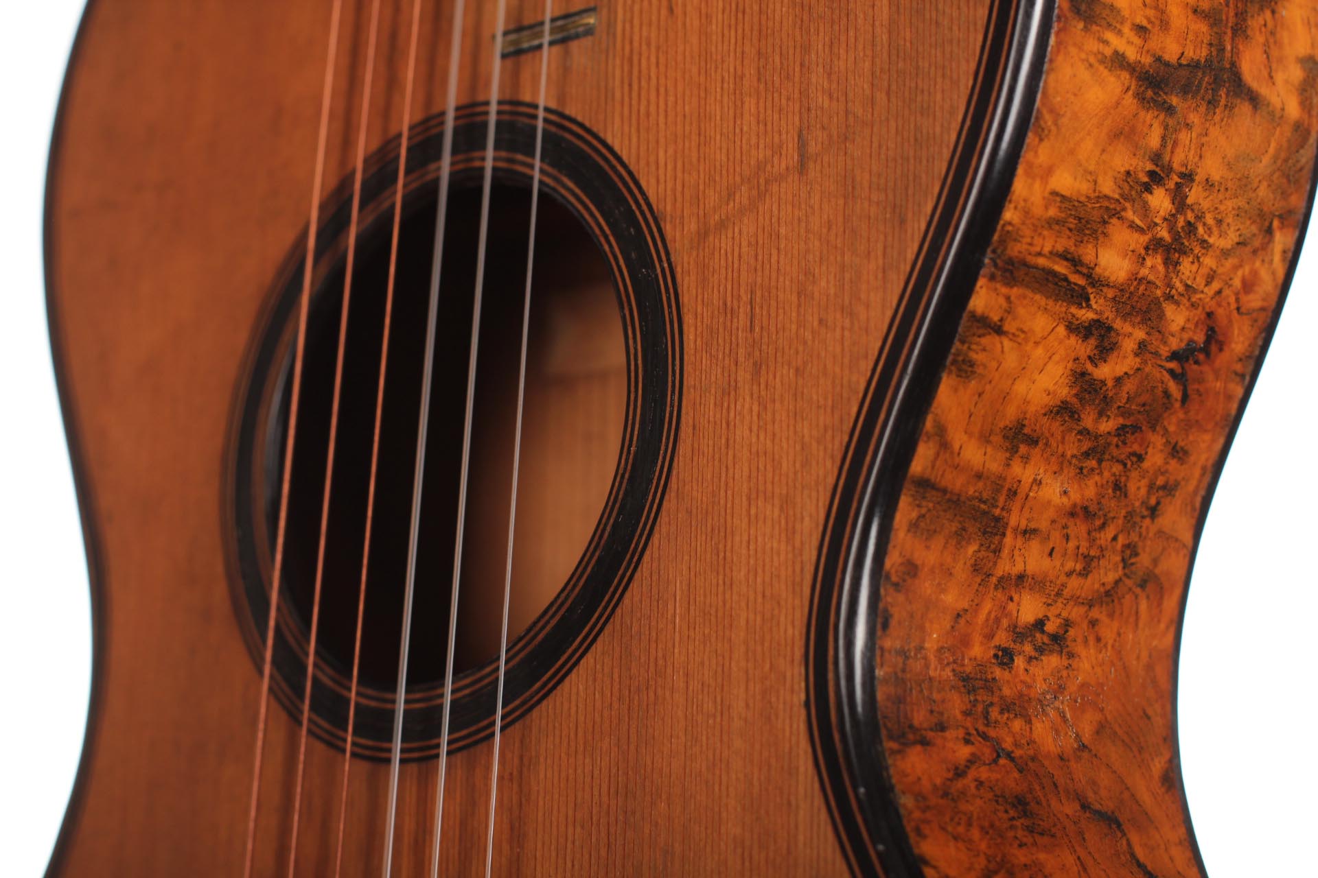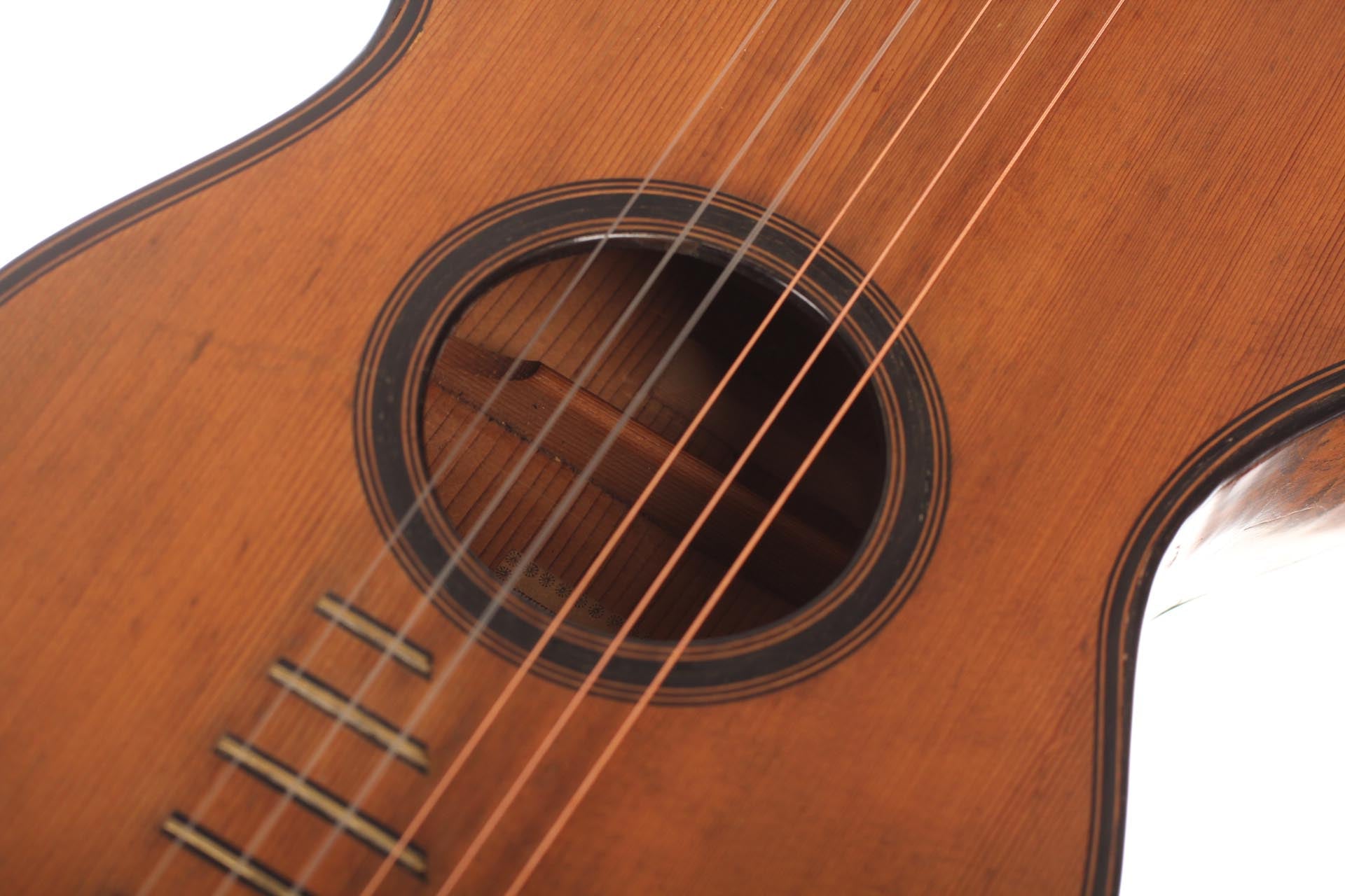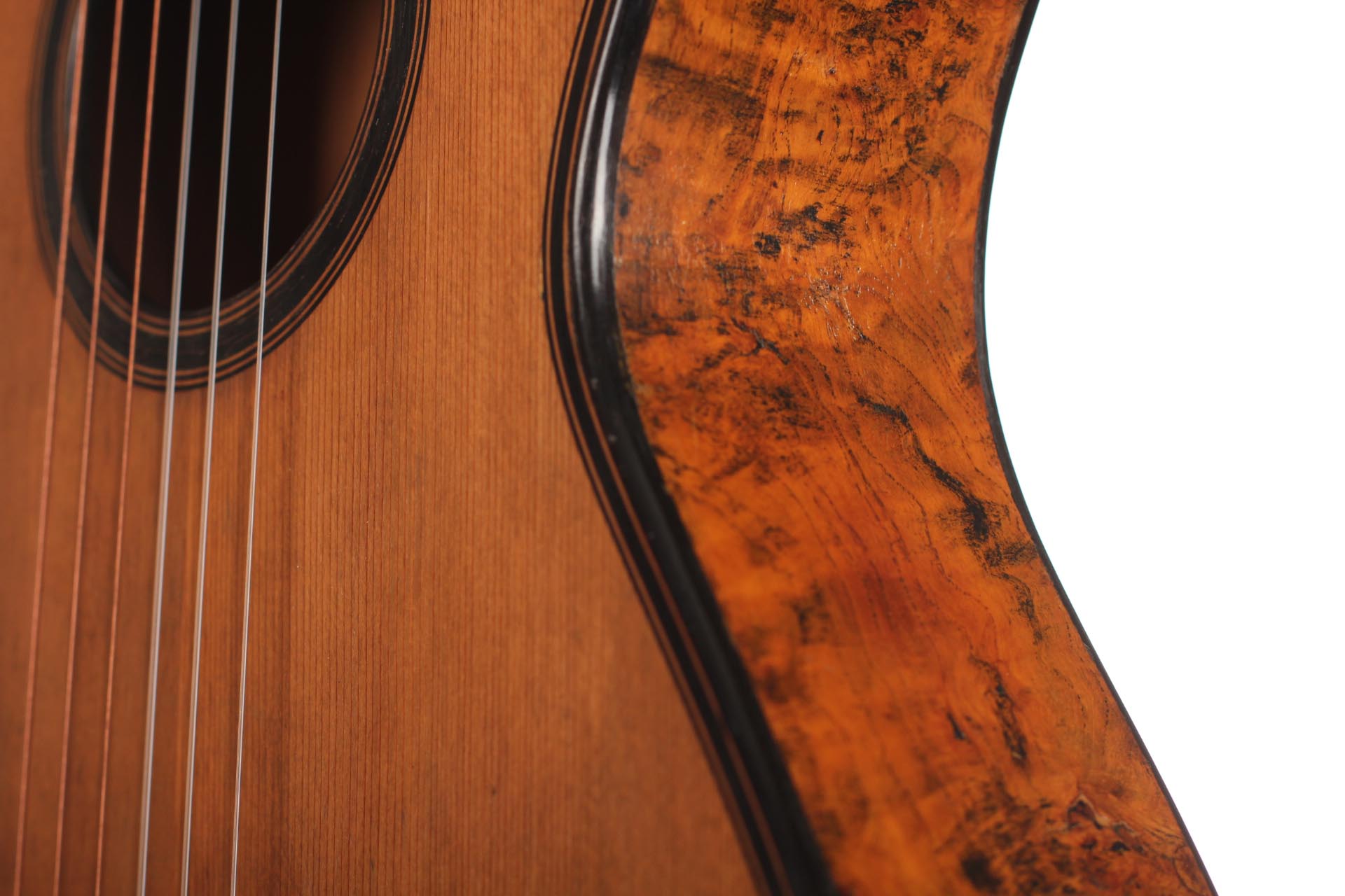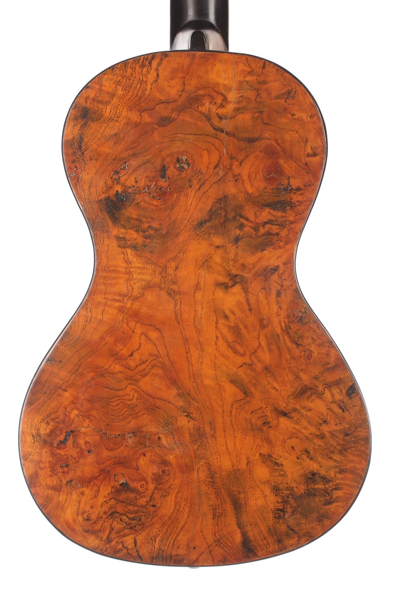 This tierce guitar built around 1825 is a particularly refined and decorated instrument. It has a very fine-grained spruce top and appealing ash burr back and sides. The very comfortable ebony veneered neck is V-joined to the head plate and is perfectly straight. It is a ready-to-be-played tierce guitar with and amazingly sweet and powerful sound, that will fit any romantic chamber-music concert player.