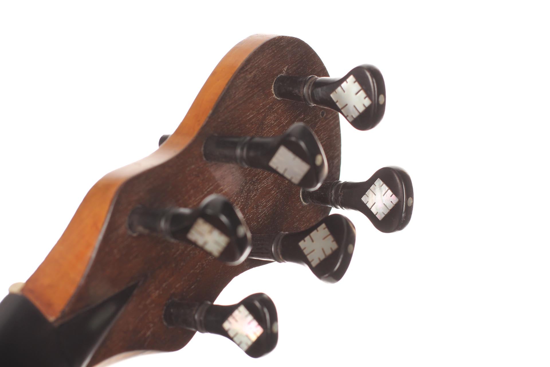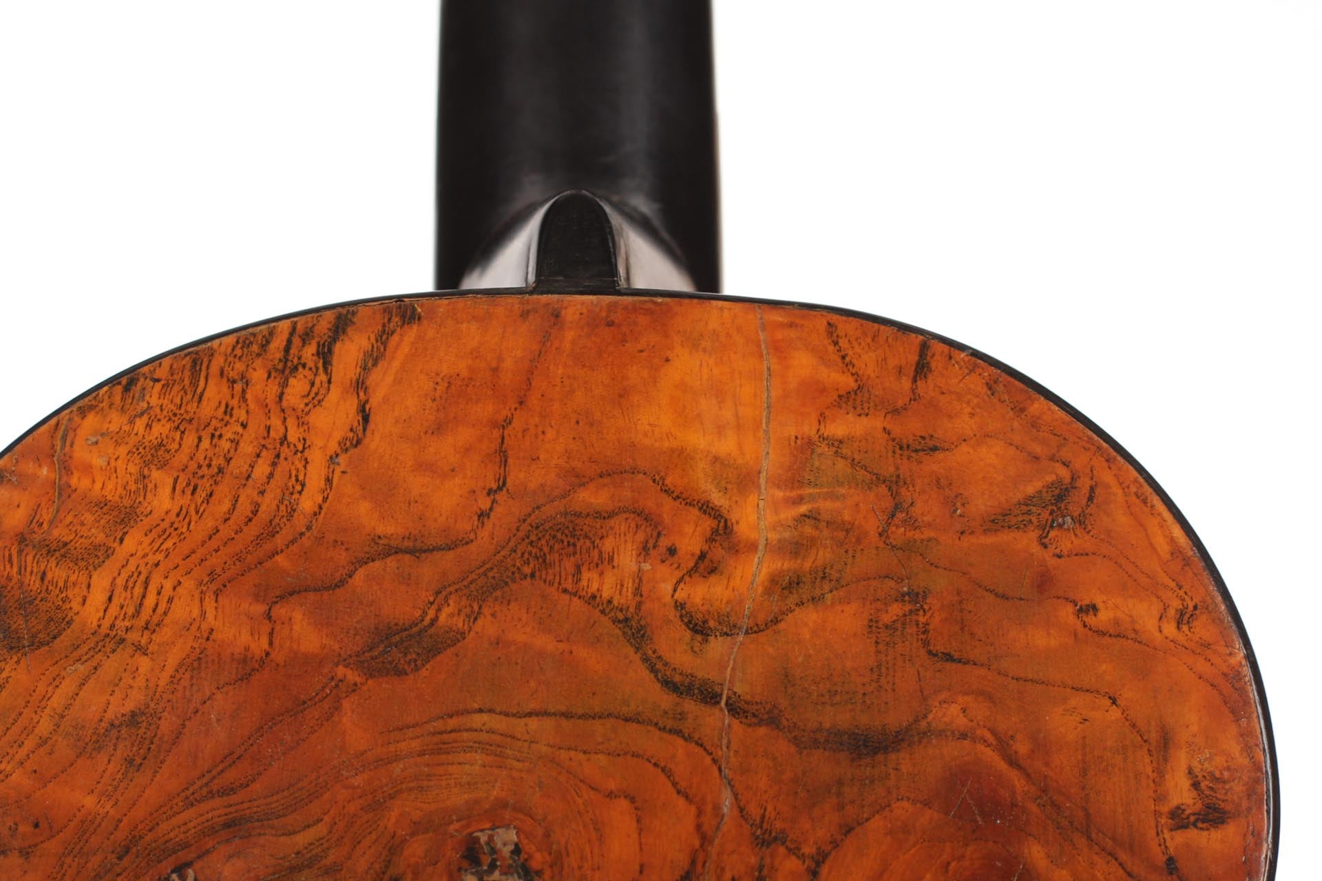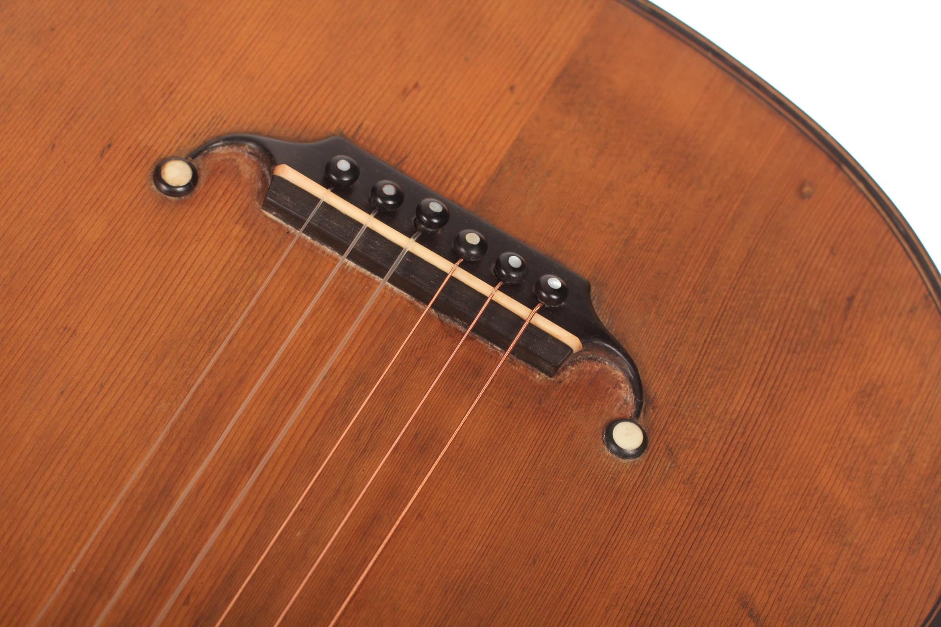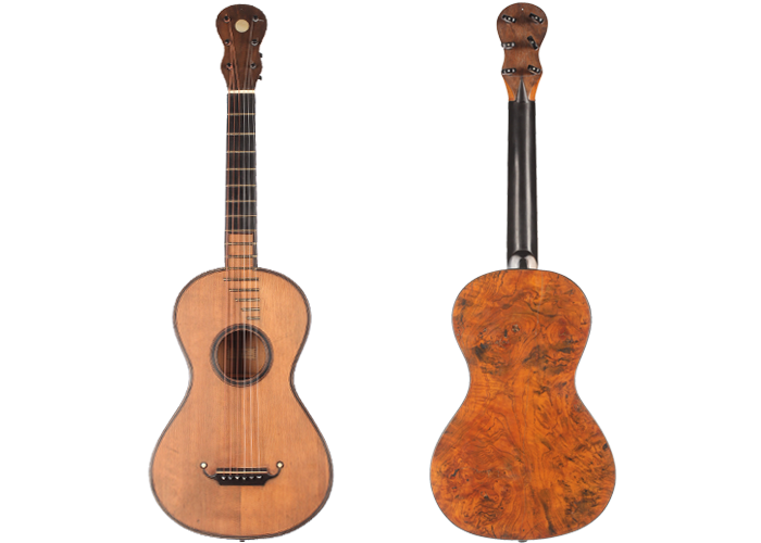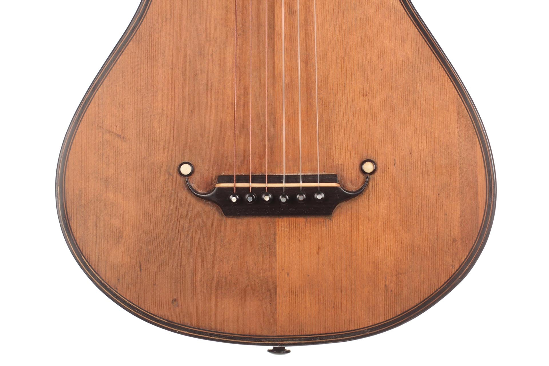 This tierce guitar built around 1825 is a particularly refined and decorated instrument. It has a very fine-grained spruce top and appealing ash burr back and sides. The very comfortable ebony veneered neck is V-joined to the head plate and is perfectly straight. It is a ready-to-be-played tierce guitar with and amazingly sweet and powerful sound, that will fit any romantic chamber-music concert player.