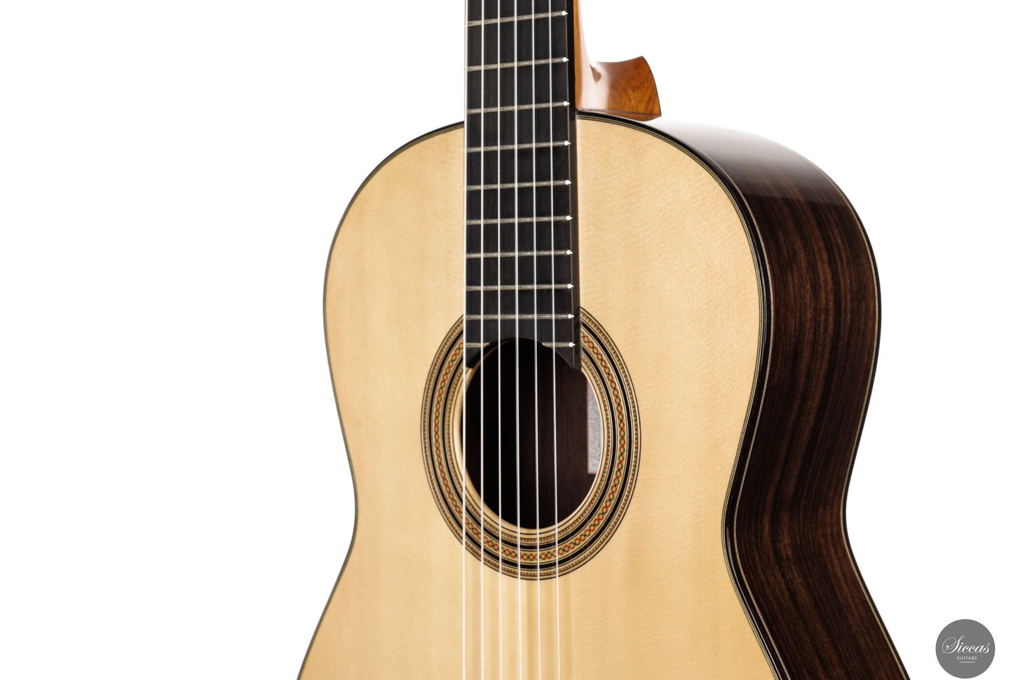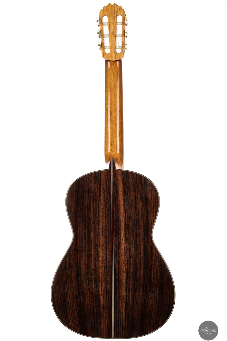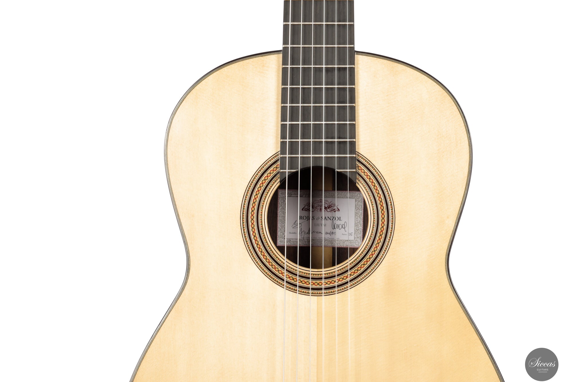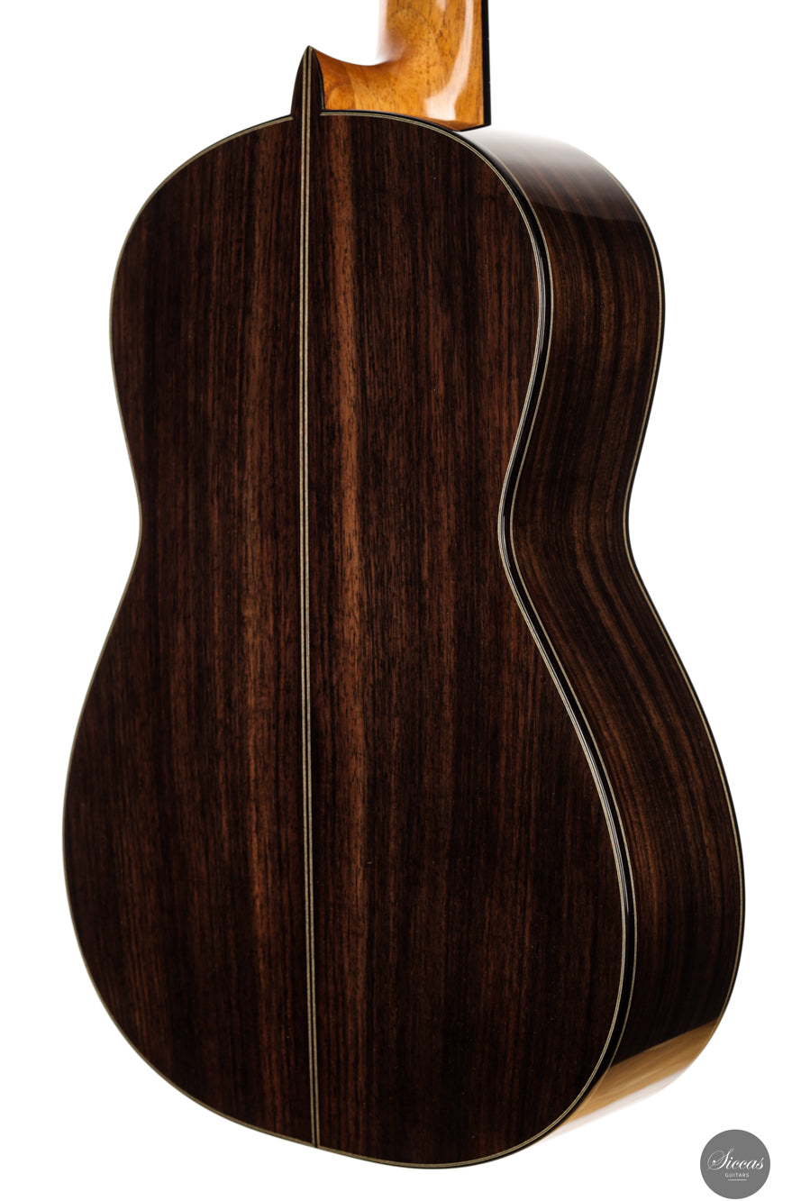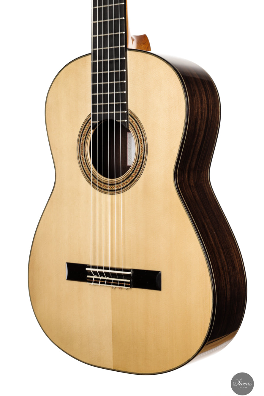 The 2025 Apollinea model is conceived as a pursuit of harmonious and rational aesthetics, a concept drawn from Greek art. The soundboard is Italian spruce from Val di Fiemme, chosen for its low resin content, lightness and transverse flexibility combined with longitudinal strength. The top is built with two transverse bars, one above and one below the soundhole, seven fan braces, and an additional transverse bar at bridge level. Heights, thicknesses and spacing are intentionally asymmetrical to allow the strings to express their full character. The rosette is inspired by the work of Santos Hernández. The back and sides are Indian rosewood and the cedar neck contains a concealed hardwood reinforcement. The ebony fingerboard and headplate give a sober solidity. The bridge is light and crafted from rosewood with coloured wood inlays and bone. Rubner El Sonido tuners complete the instrument. The finish is French polish.