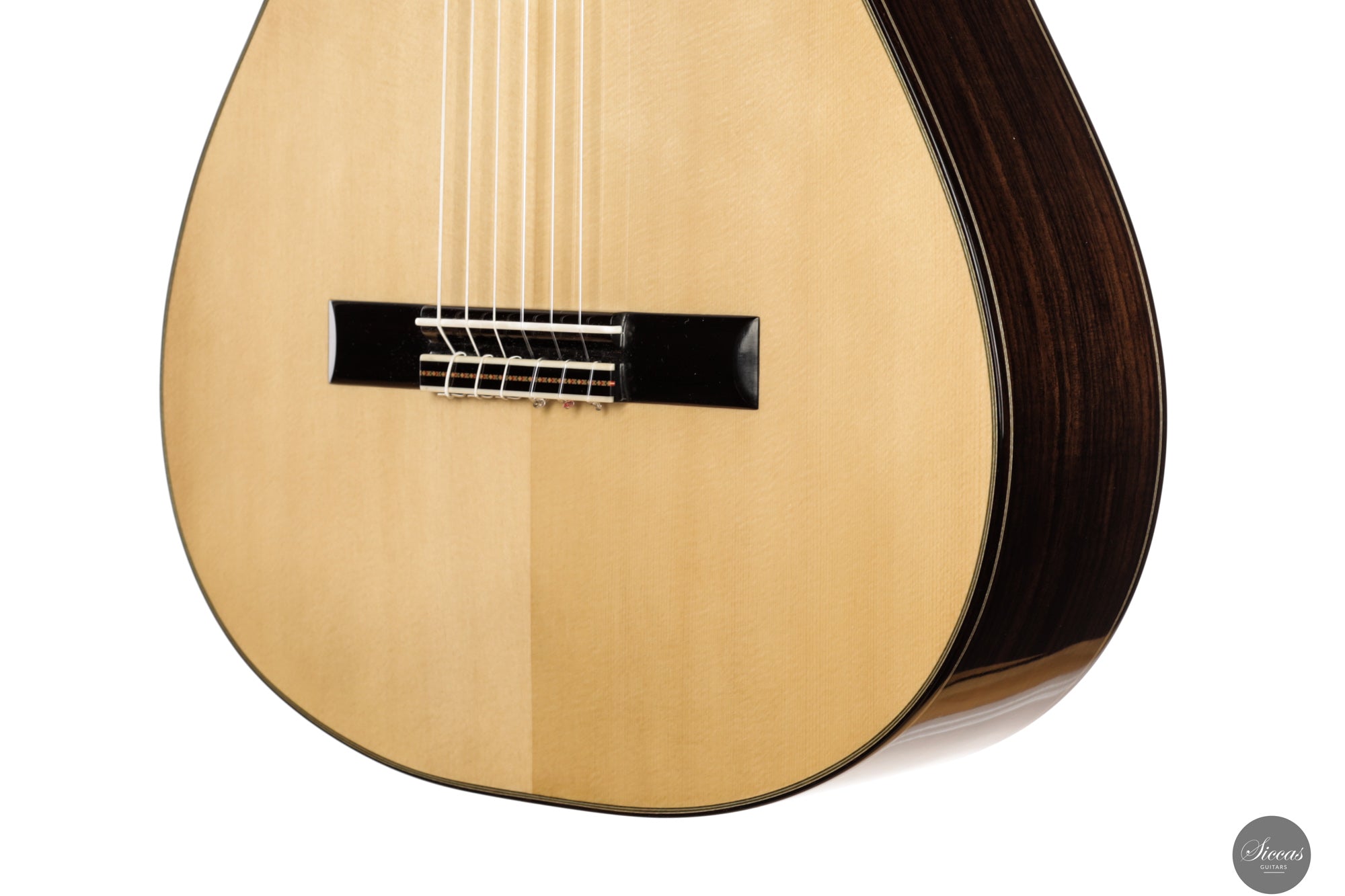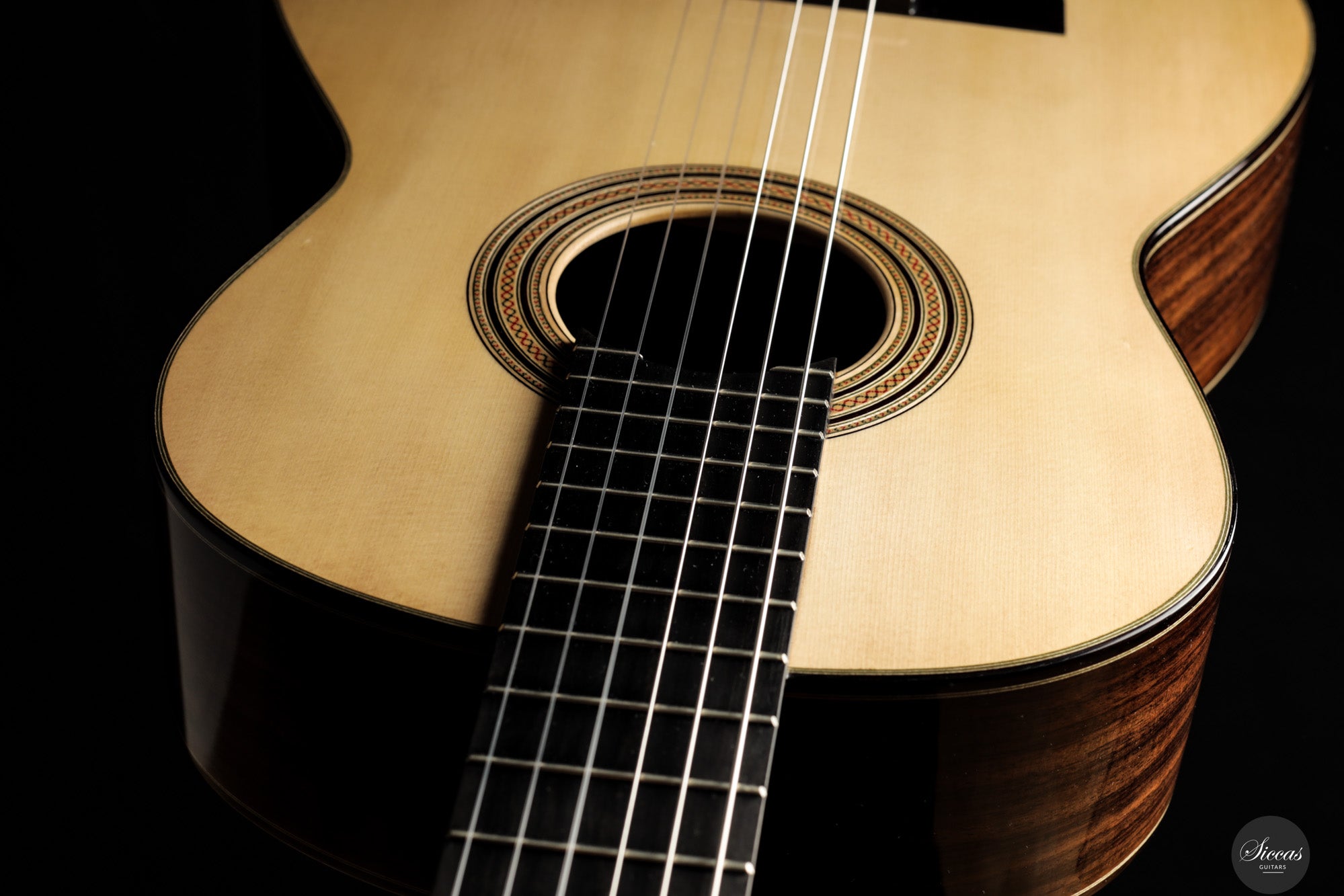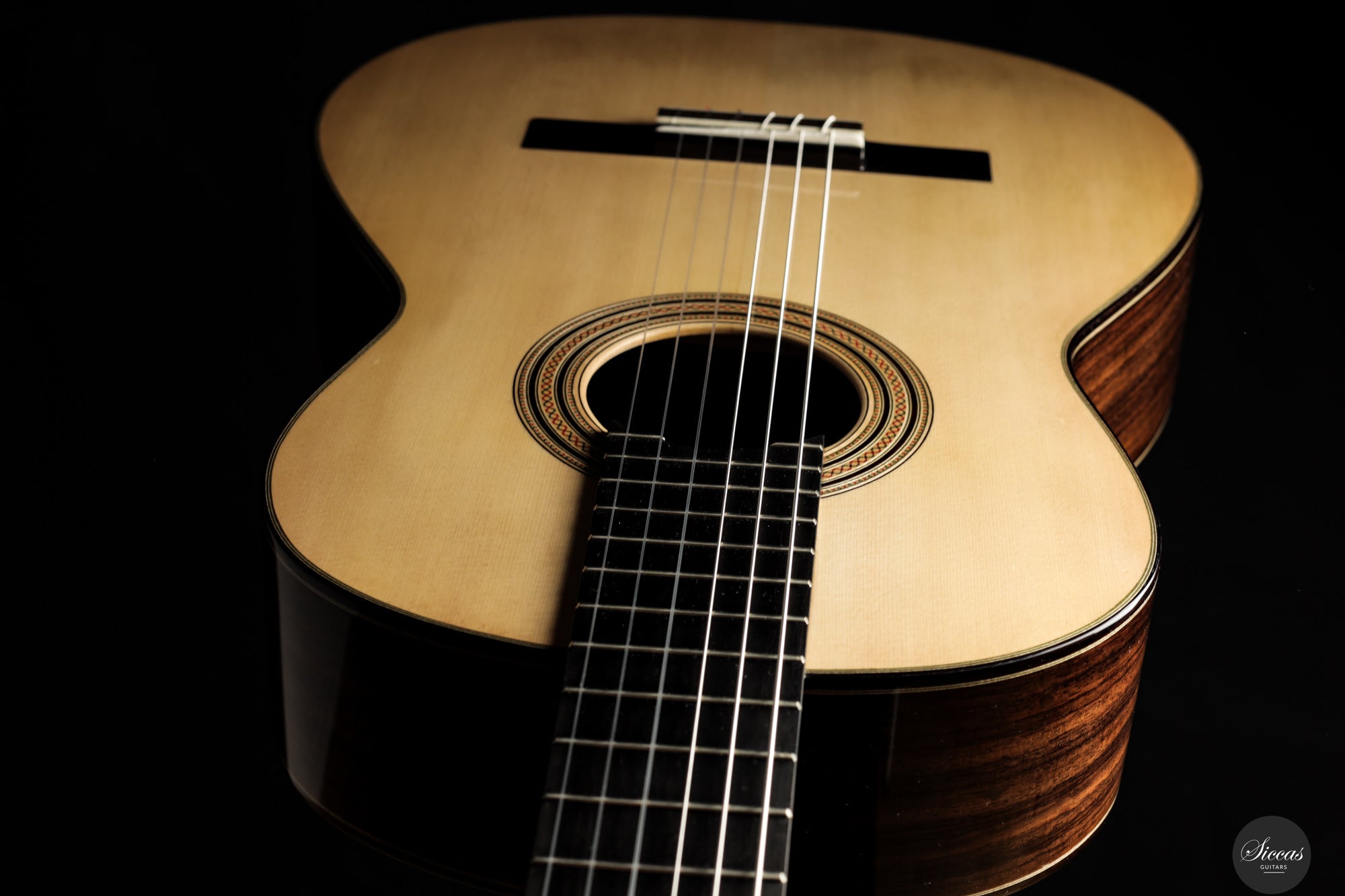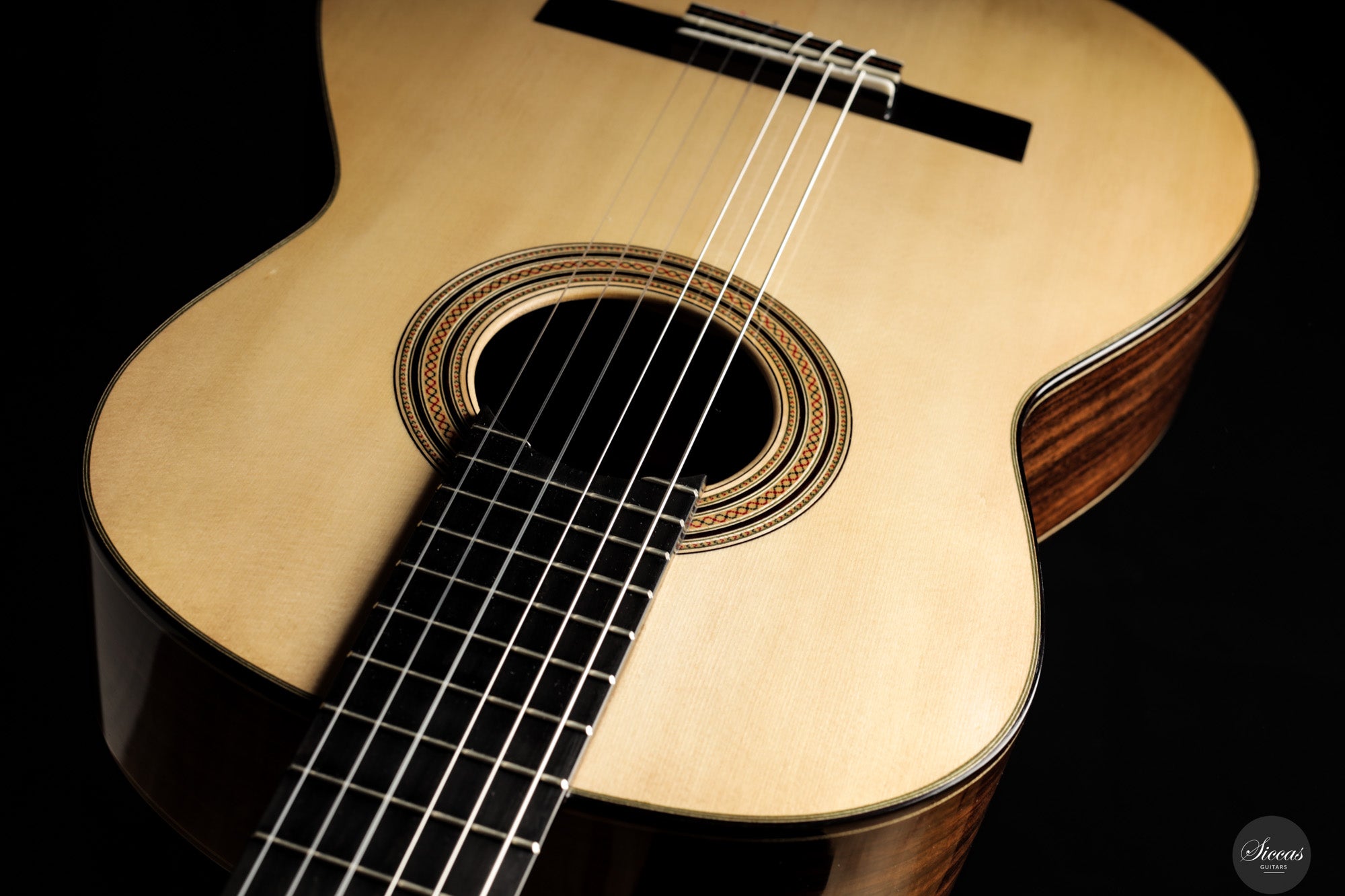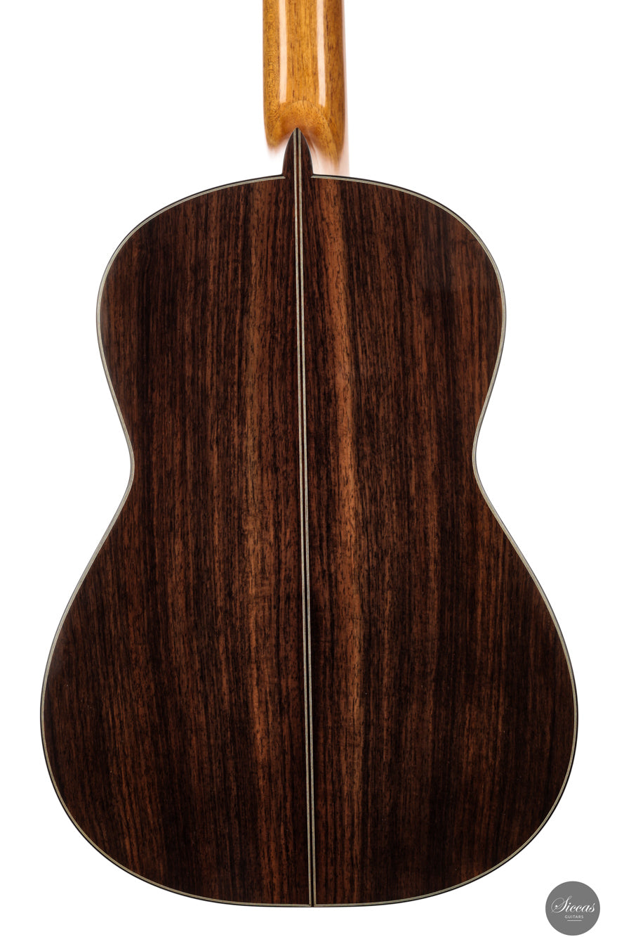 The 2025 Apollinea model is conceived as a pursuit of harmonious and rational aesthetics, a concept drawn from Greek art. The soundboard is Italian spruce from Val di Fiemme, chosen for its low resin content, lightness and transverse flexibility combined with longitudinal strength. The top is built with two transverse bars, one above and one below the soundhole, seven fan braces, and an additional transverse bar at bridge level. Heights, thicknesses and spacing are intentionally asymmetrical to allow the strings to express their full character. The rosette is inspired by the work of Santos Hernández. The back and sides are Indian rosewood and the cedar neck contains a concealed hardwood reinforcement. The ebony fingerboard and headplate give a sober solidity. The bridge is light and crafted from rosewood with coloured wood inlays and bone. Rubner El Sonido tuners complete the instrument. The finish is French polish.