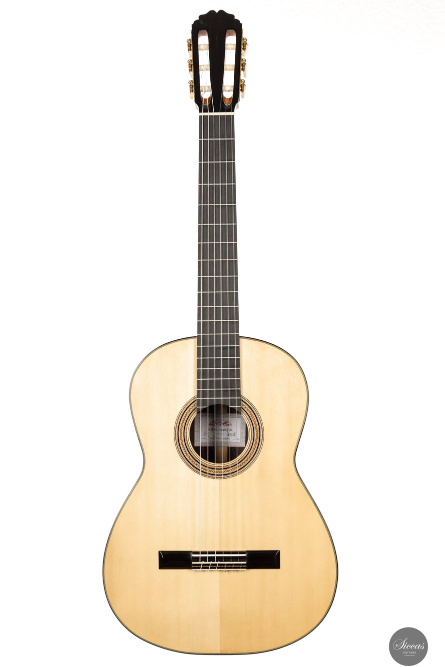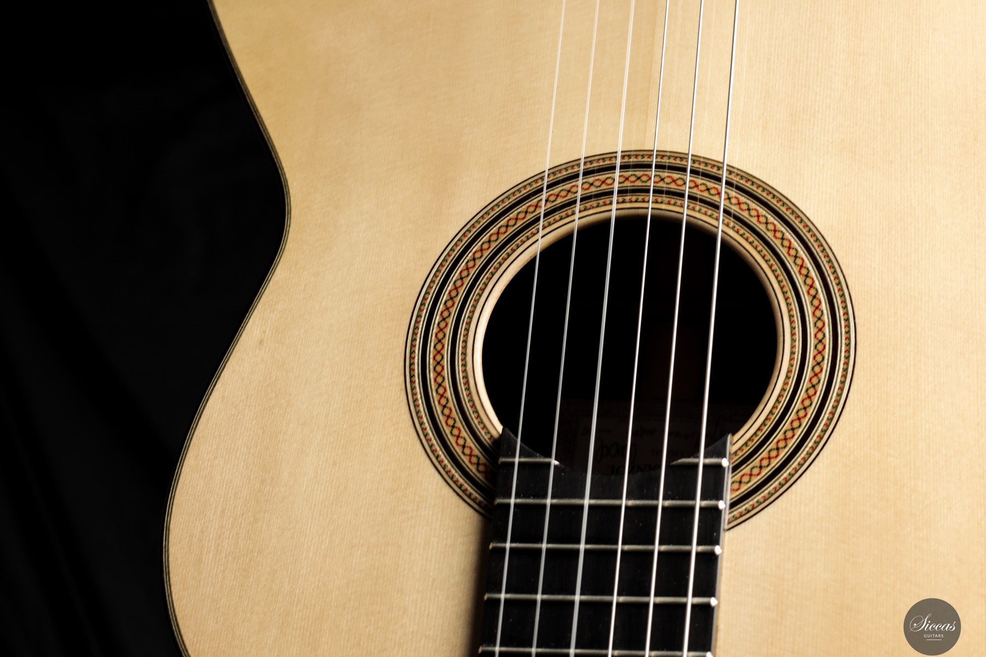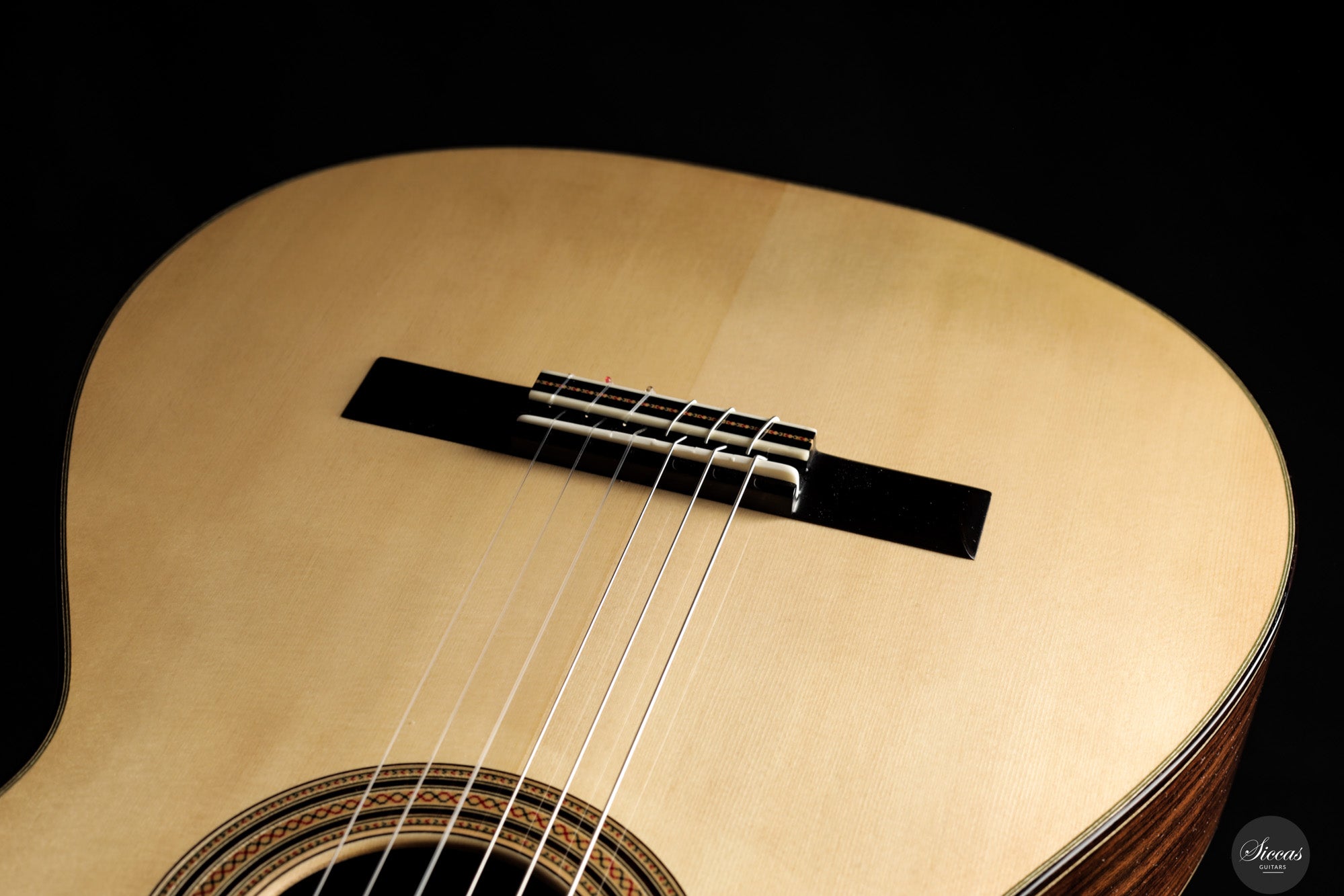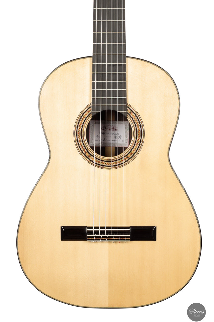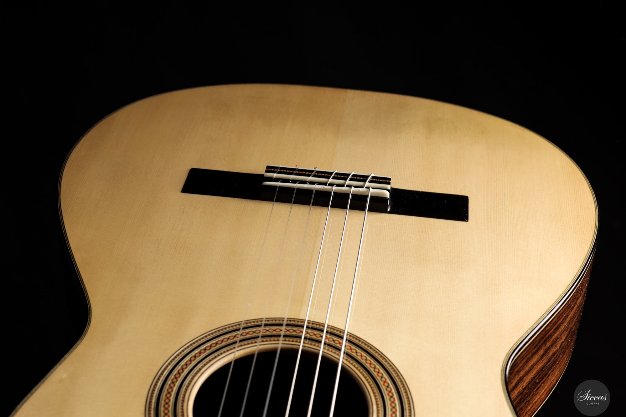 The 2025 Apollinea model is conceived as a pursuit of harmonious and rational aesthetics, a concept drawn from Greek art. The soundboard is Italian spruce from Val di Fiemme, chosen for its low resin content, lightness and transverse flexibility combined with longitudinal strength. The top is built with two transverse bars, one above and one below the soundhole, seven fan braces, and an additional transverse bar at bridge level. Heights, thicknesses and spacing are intentionally asymmetrical to allow the strings to express their full character. The rosette is inspired by the work of Santos Hernández. The back and sides are Indian rosewood and the cedar neck contains a concealed hardwood reinforcement. The ebony fingerboard and headplate give a sober solidity. The bridge is light and crafted from rosewood with coloured wood inlays and bone. Rubner El Sonido tuners complete the instrument. The finish is French polish.