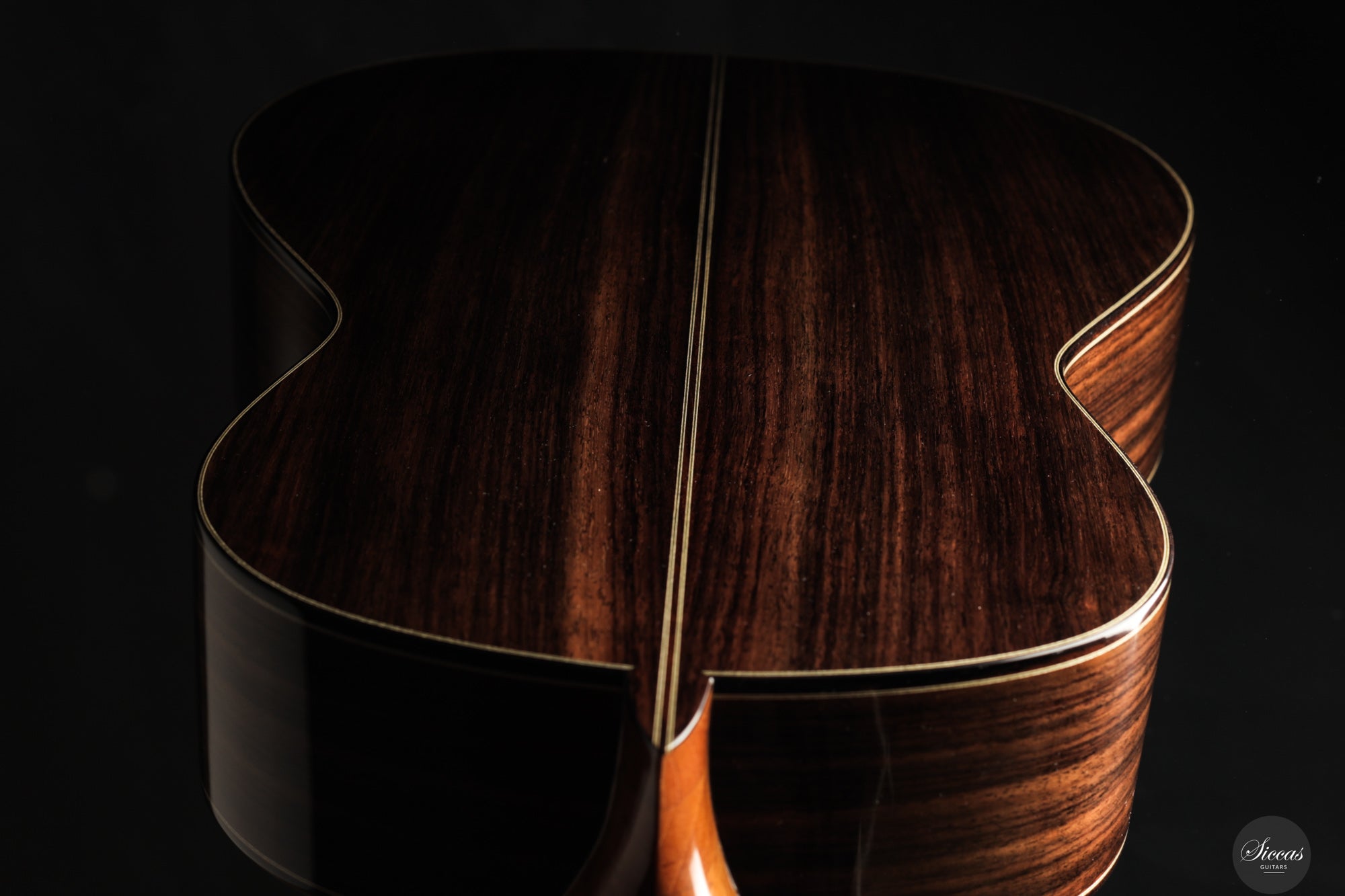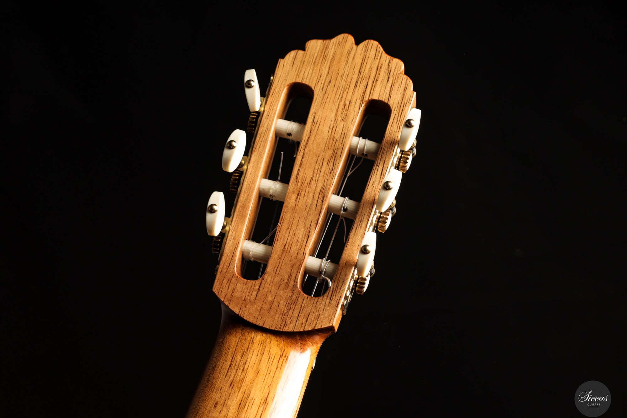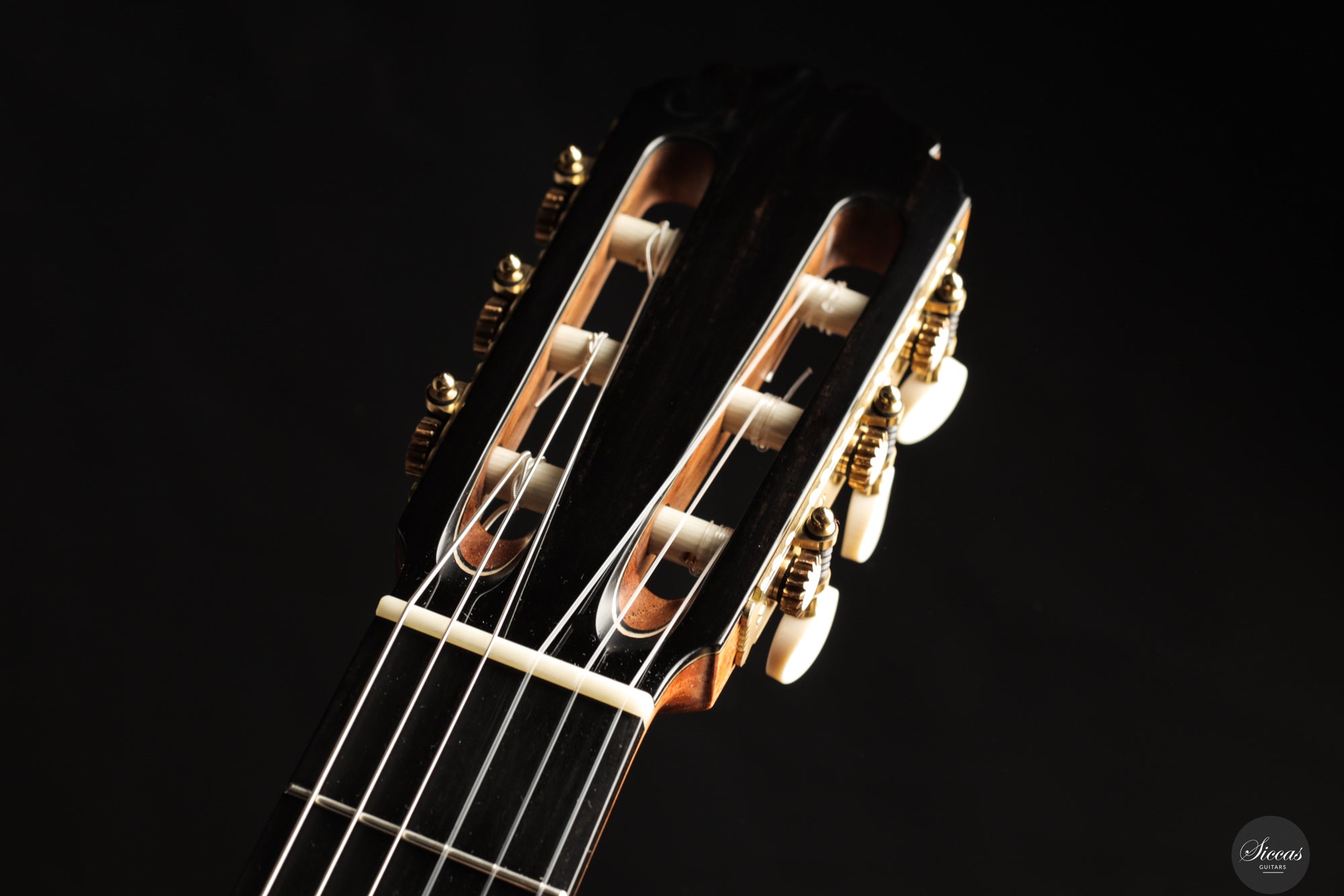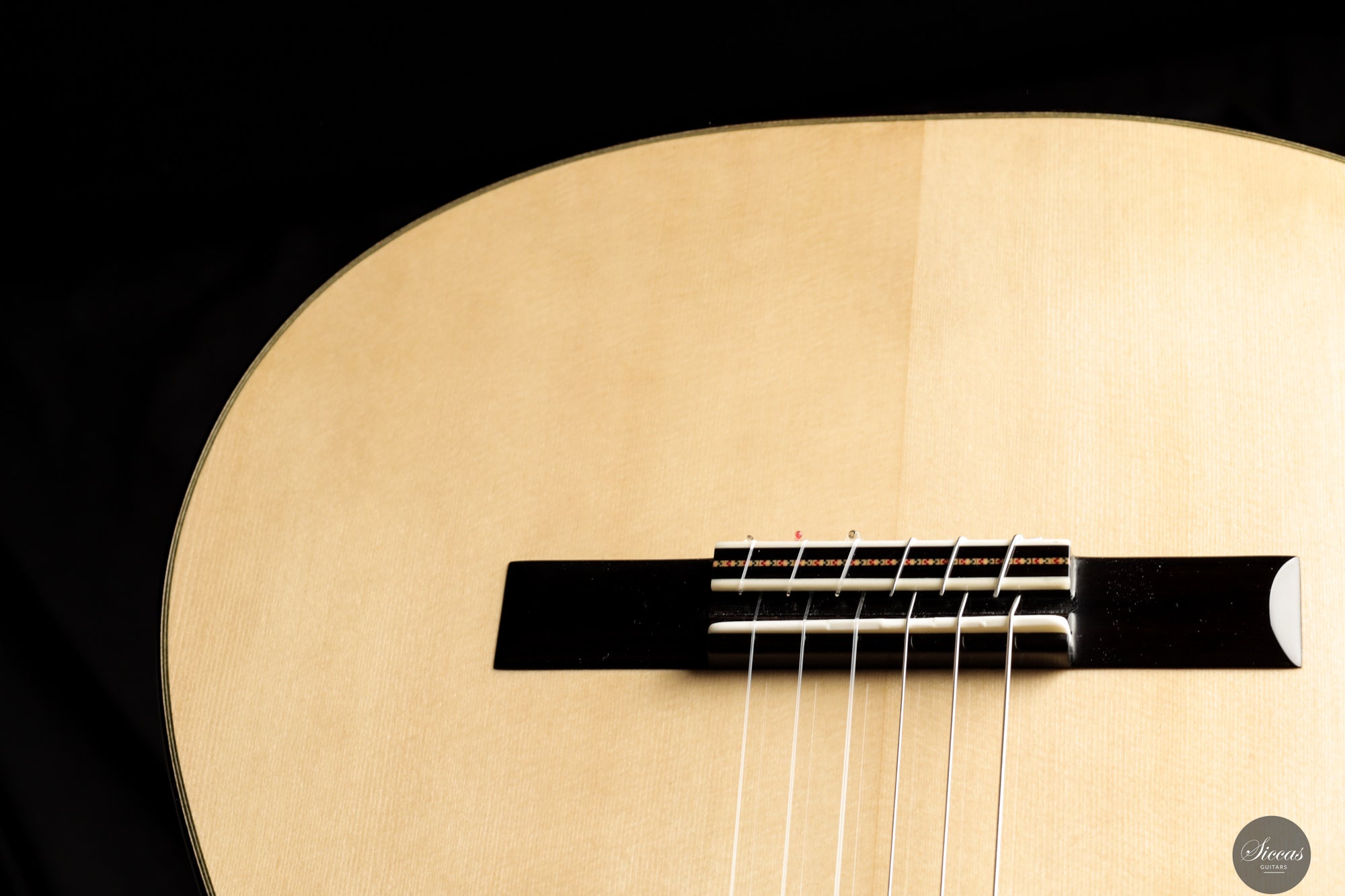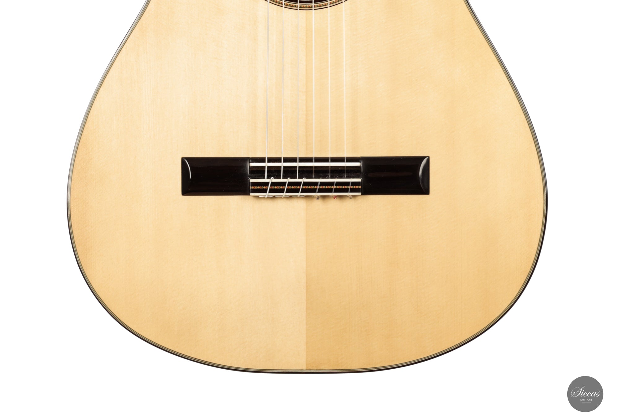 The 2025 Apollinea model is conceived as a pursuit of harmonious and rational aesthetics, a concept drawn from Greek art. The soundboard is Italian spruce from Val di Fiemme, chosen for its low resin content, lightness and transverse flexibility combined with longitudinal strength. The top is built with two transverse bars, one above and one below the soundhole, seven fan braces, and an additional transverse bar at bridge level. Heights, thicknesses and spacing are intentionally asymmetrical to allow the strings to express their full character. The rosette is inspired by the work of Santos Hernández. The back and sides are Indian rosewood and the cedar neck contains a concealed hardwood reinforcement. The ebony fingerboard and headplate give a sober solidity. The bridge is light and crafted from rosewood with coloured wood inlays and bone. Rubner El Sonido tuners complete the instrument. The finish is French polish.