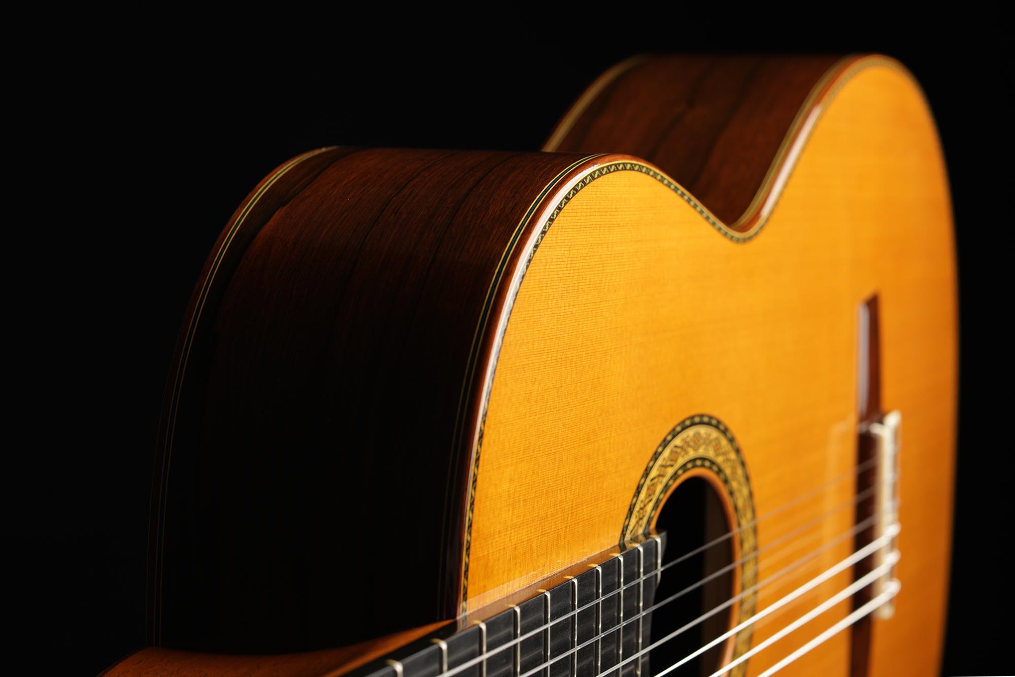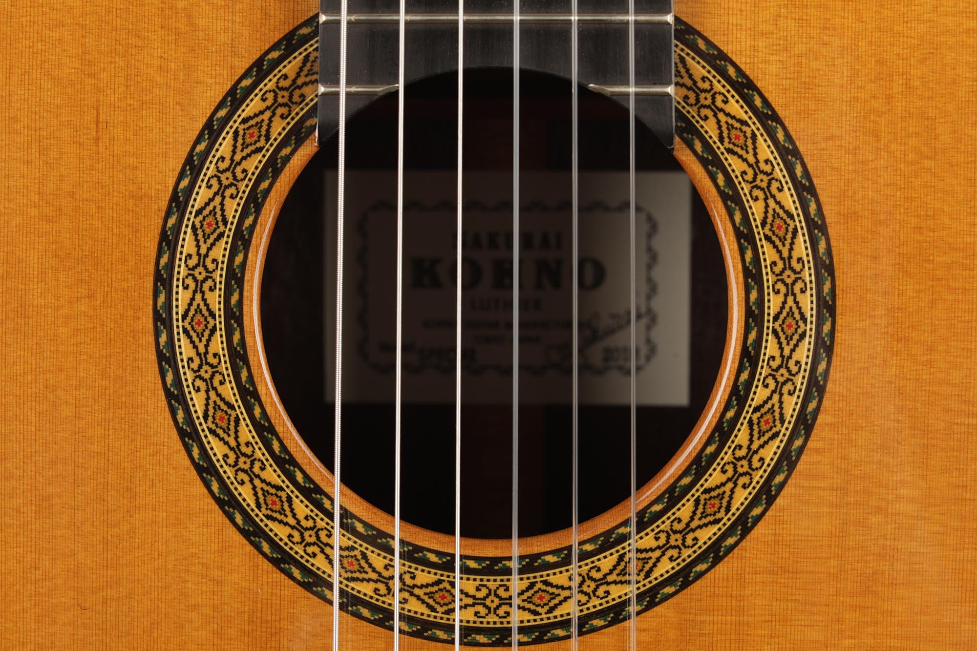 This lovely Sakurai Kohno Special model has a very fine cedar soundboard, contrasting nicely with the tasteful marquetry of the instrument. The well-selected cedar has an impressive, very close grain and a very homogeneous color. Homogeneous is also an adjective that perfectly describes the pure and very balanced sound of this guitar. The harmony of timbres across all strings and positions on the fingerboard is remarkable. In addition, it has a very pure clarity in the chords, which together with the smooth and warm sound of the cedar creates a rich, powerful, and truly versatile guitar.
