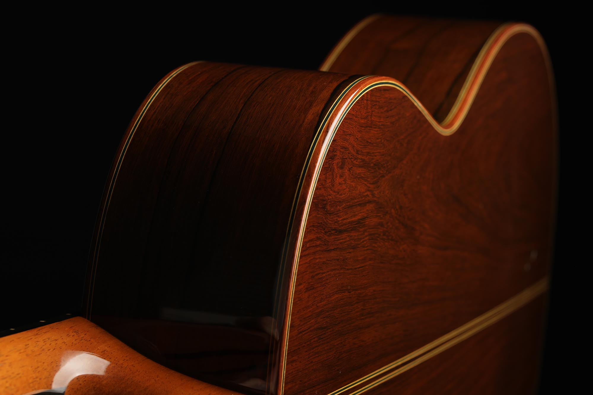 This superb “special” model is recognizable by its asymmetrical bridge as well as its sculpted head. Masaki Sakurai built this guitar in the continuity of his uncle Masaru Kohno’s guitars. It showcases the aesthetics, marquetry, and carving details as well as the sound of Kohno guitars. This instrument built with the extreme precision associated with Japanese craftsmanship is of the highest quality. It features a beautiful selection of precious woods and great attention to detail.