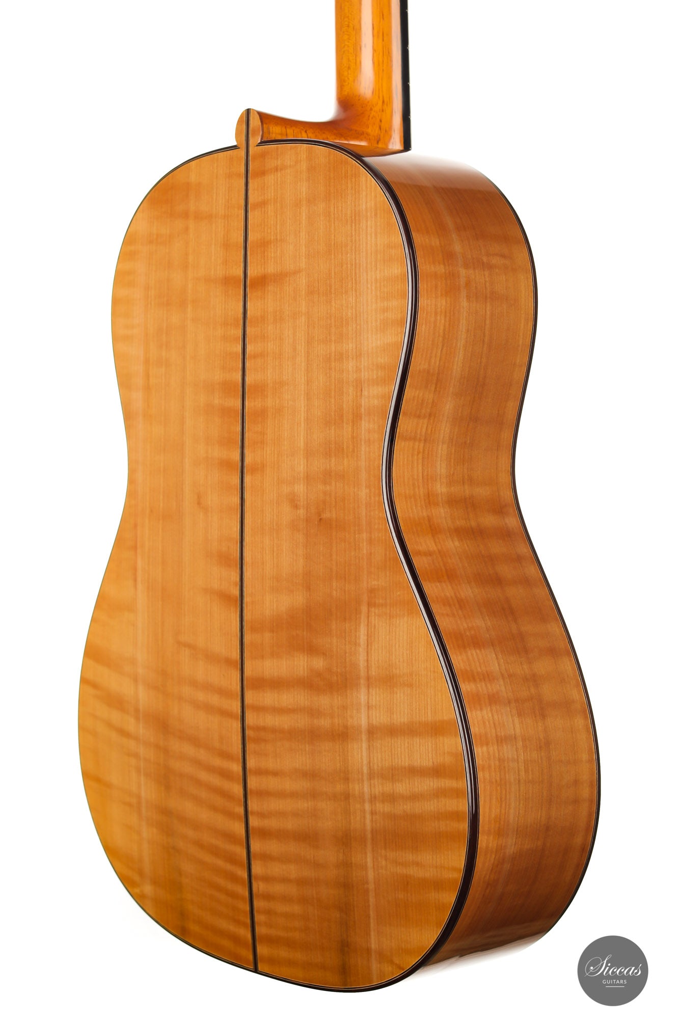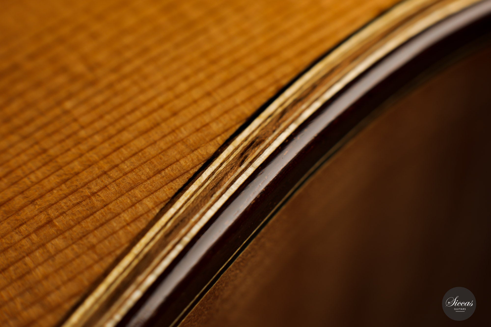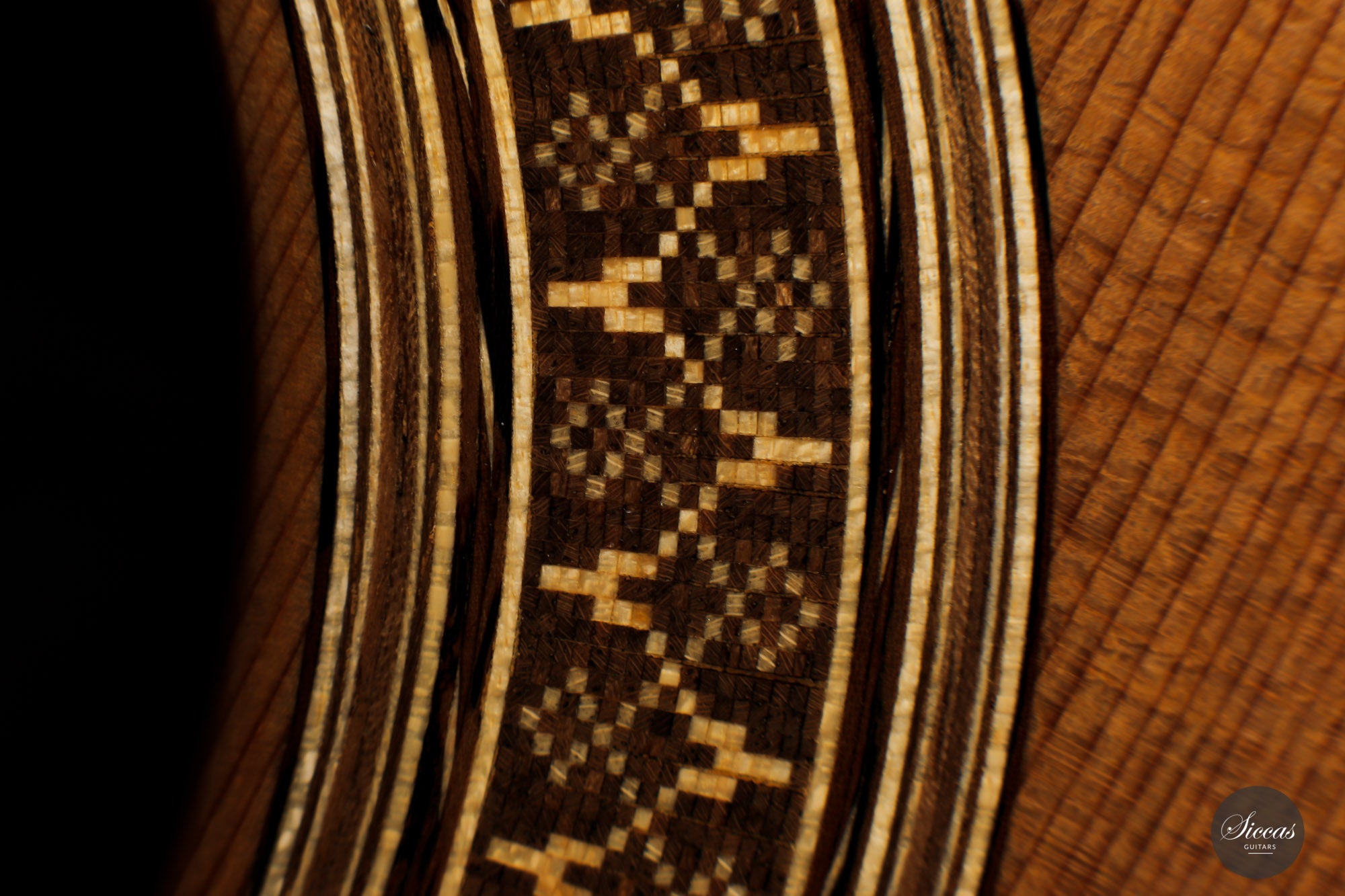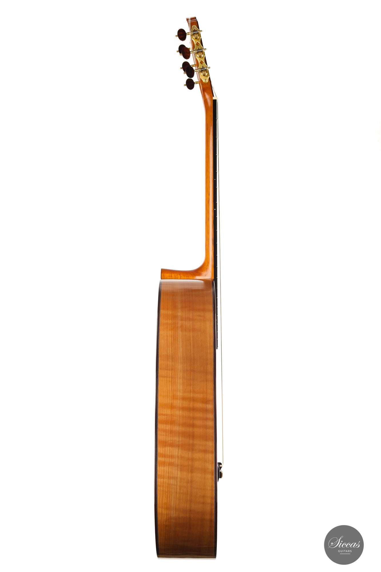 Sebastian Stenzel built this exclusive guitar with astonishing yet inspiring woods. The combination of a dark cedar top with vivid Whitty Pear is genuinely unique, and the result is terrific. This lightweight guitar fills the room with a warm, expressive tone, displaying dense trebles and expansive basses. Its generous volume makes playing just as enjoyable as listening and comfort the guitarist in expressive and dynamic playing. Moreover, all Stenzel guitars have a unique neck and fingerboard shape, yielding considerable benefits for playability and giving the guitarist more freedom to focus on the music. This playful and reliable guitar is one of a kind, and we are thrilled to offer an instrument that stands out by its unusual woods yet meeting the highest standards in terms of sound.