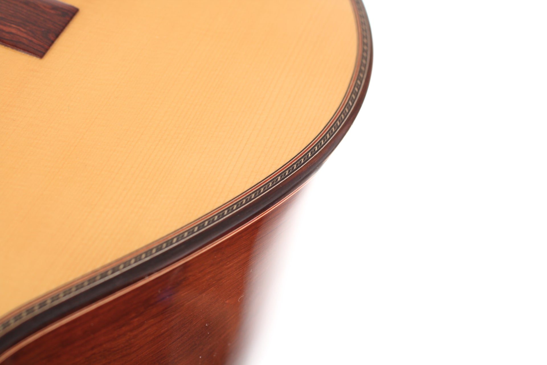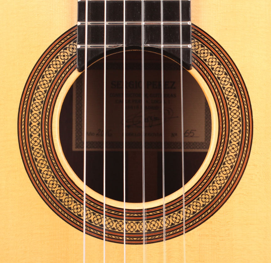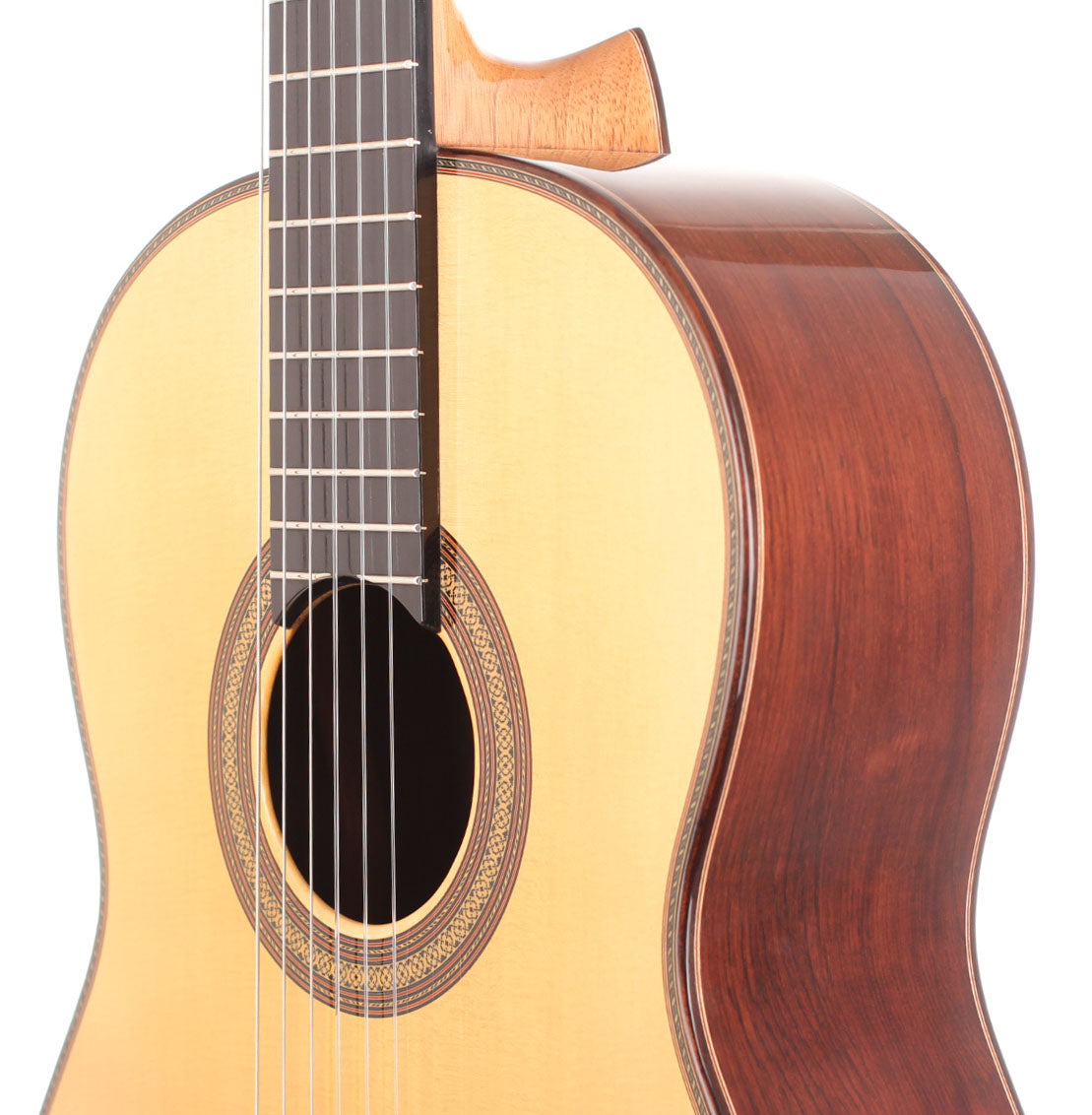 Sergio was born in Madrid in 1980. When he was a child he was fascinated by the work of his father. In 1998, after Sergio finished school, he started working full-time with his father. This Segovia model guitar has a spruce top and rosewood back and sides. The tuners are made by Rubner. French polish finish. Design and craftsmanship are excellent. The sound is smooth, has singing trebles and excellent balance, clarity and sustain. Comes with a hard-shell case.