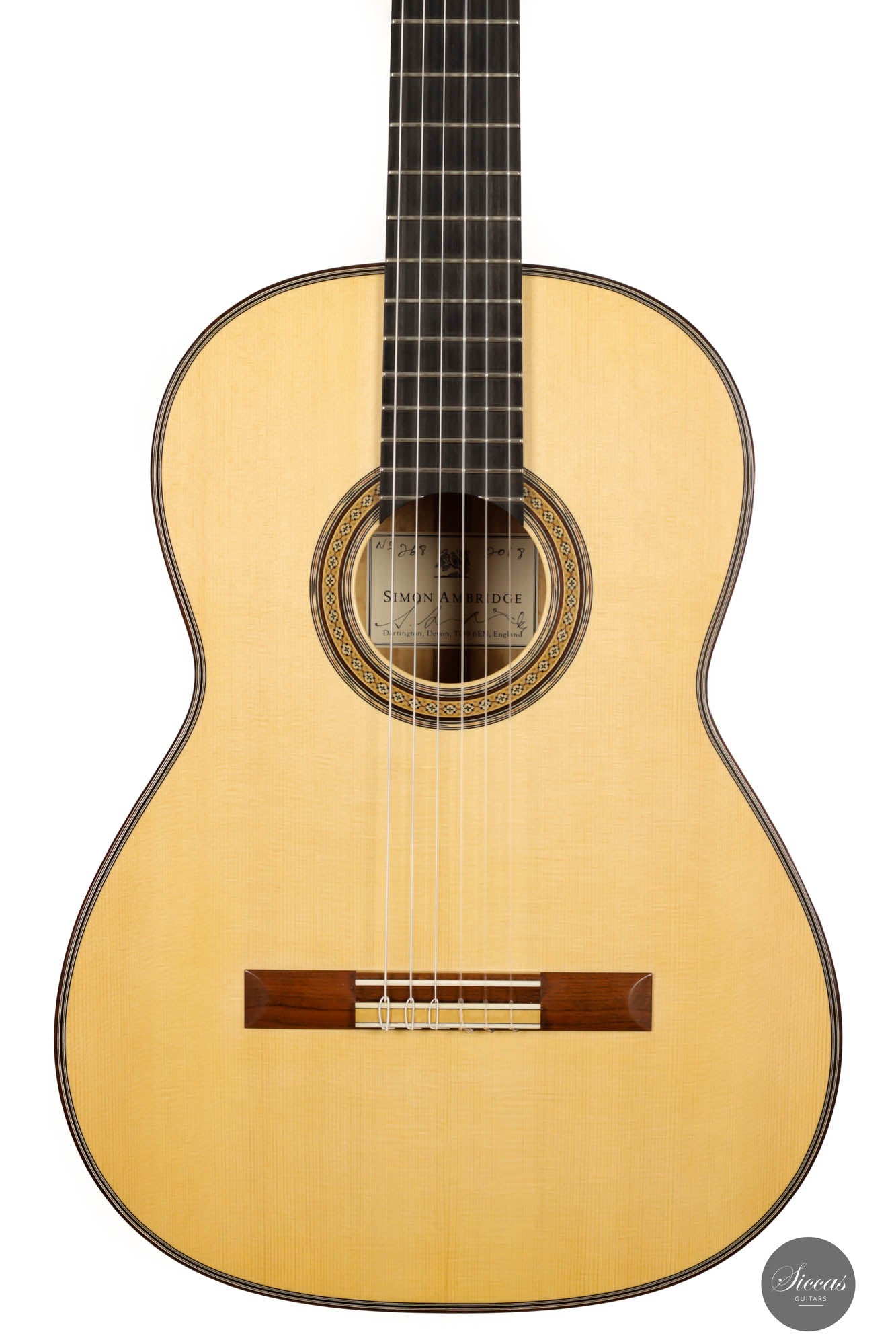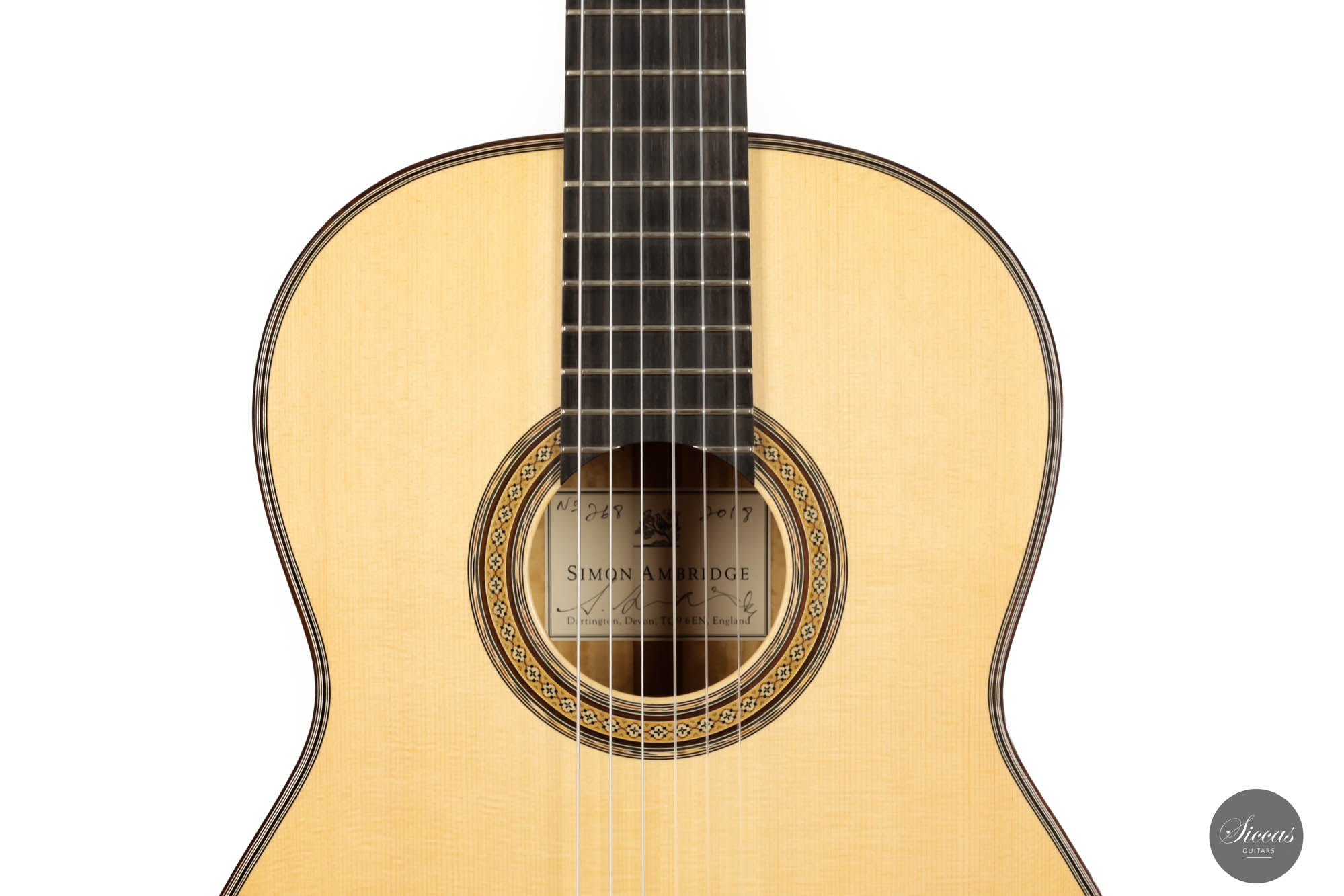 This is a genuinely fantastic guitar by one of the most respected British guitar makers, Simon Ambridge. Visually, this guitar is astonishing. It shows delicate and abundant marquetry together with a unique selection of woods. The spruce soundboard is paired with extraordinary Satinwood back and sides which have comparable acoustic properties to Rosewood due to its density. Soundwise, this fine instrument is a true modern classic. The deep old-world basses, as a result of its F main resonance, are accompanied by brilliant singing trebles, which are very even across the fingerboard. Furthermore, this pre-loved instrument from 2018 is in excellent condition, with only superficial playing marks. This guitar is a true masterpiece of modern guitar-making.