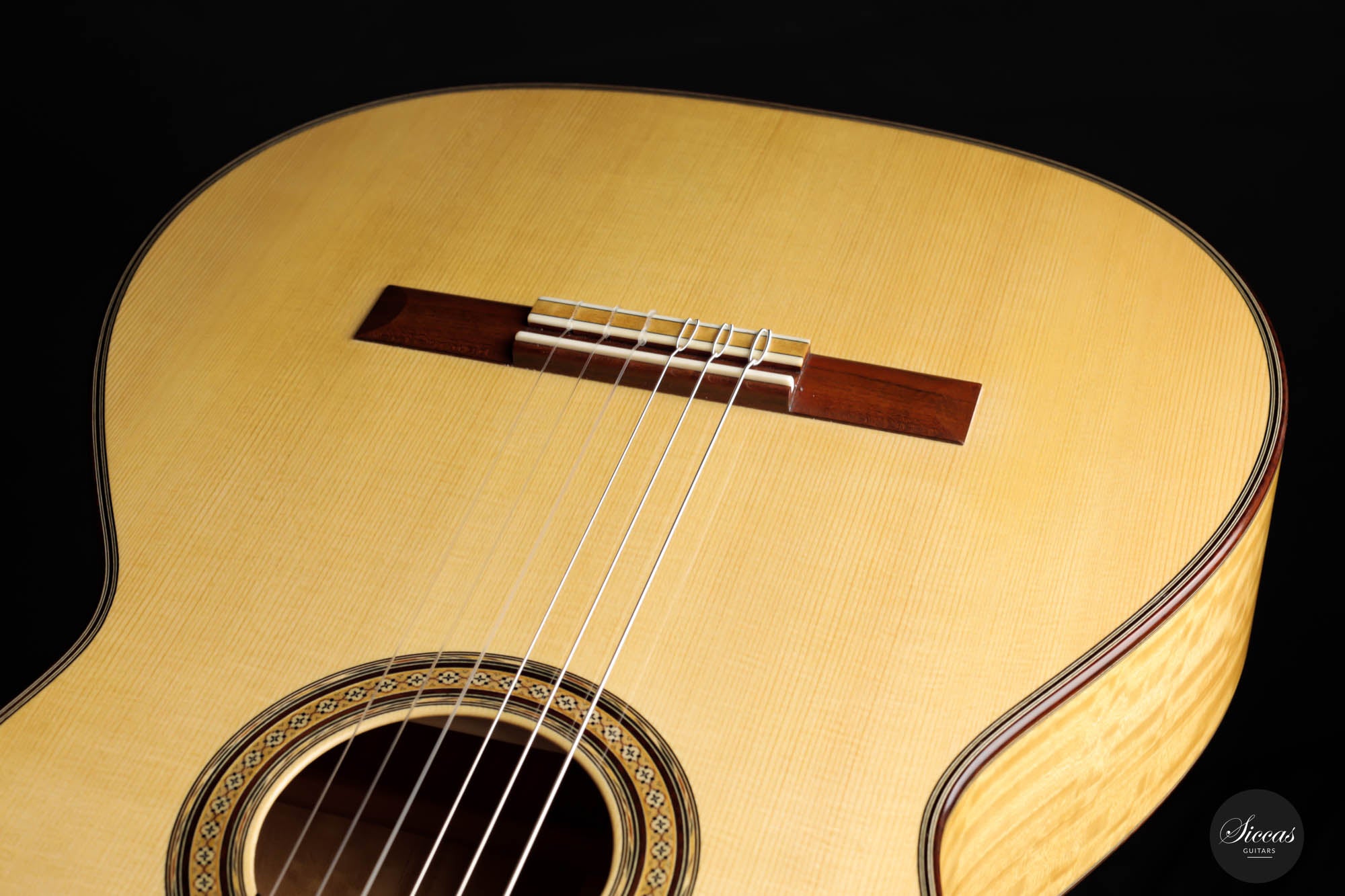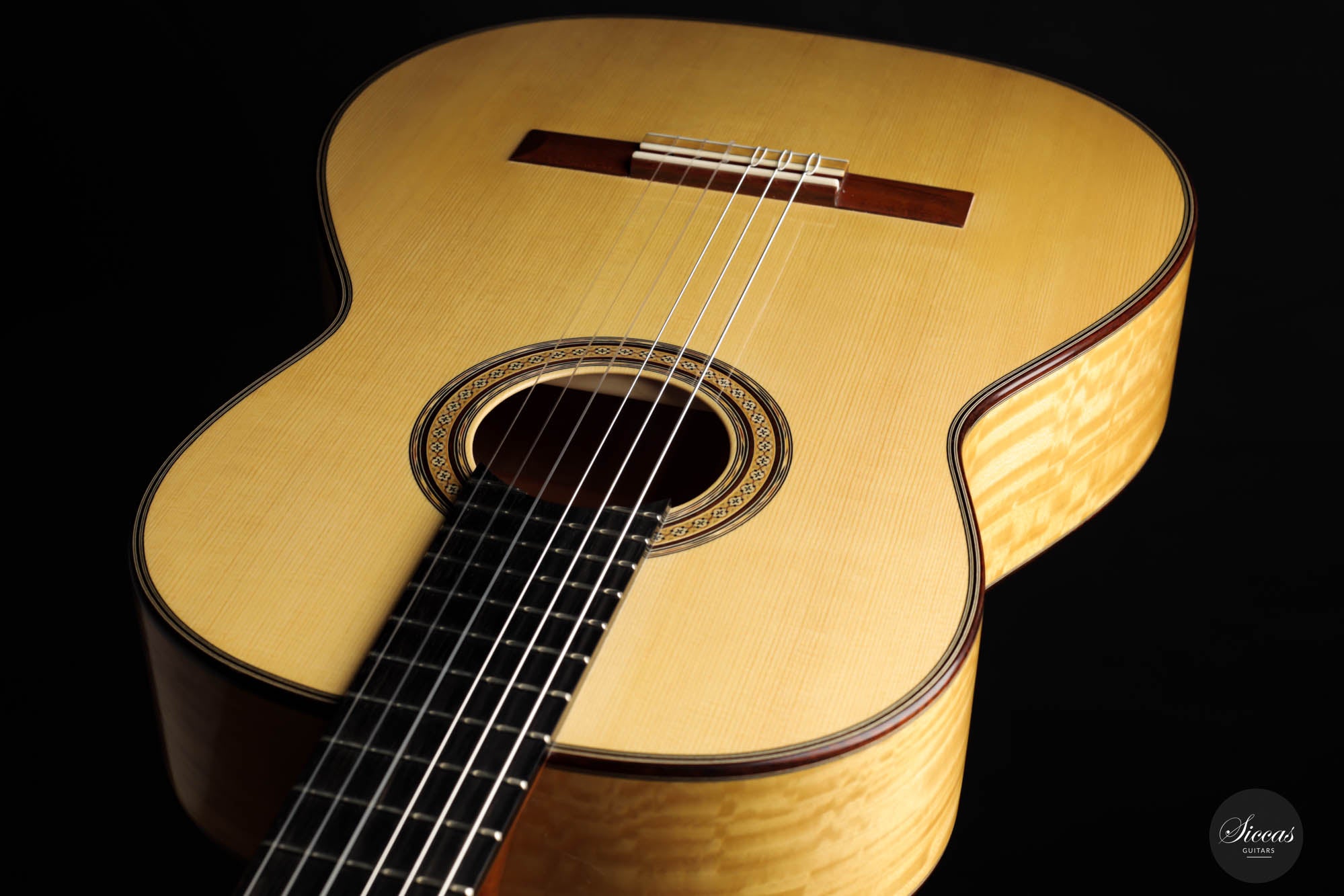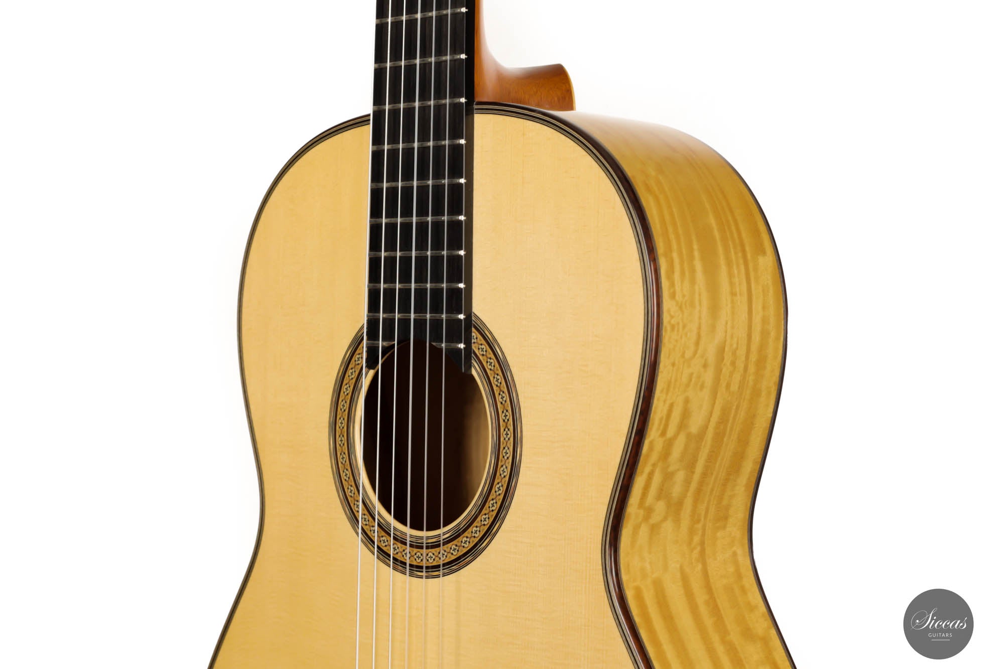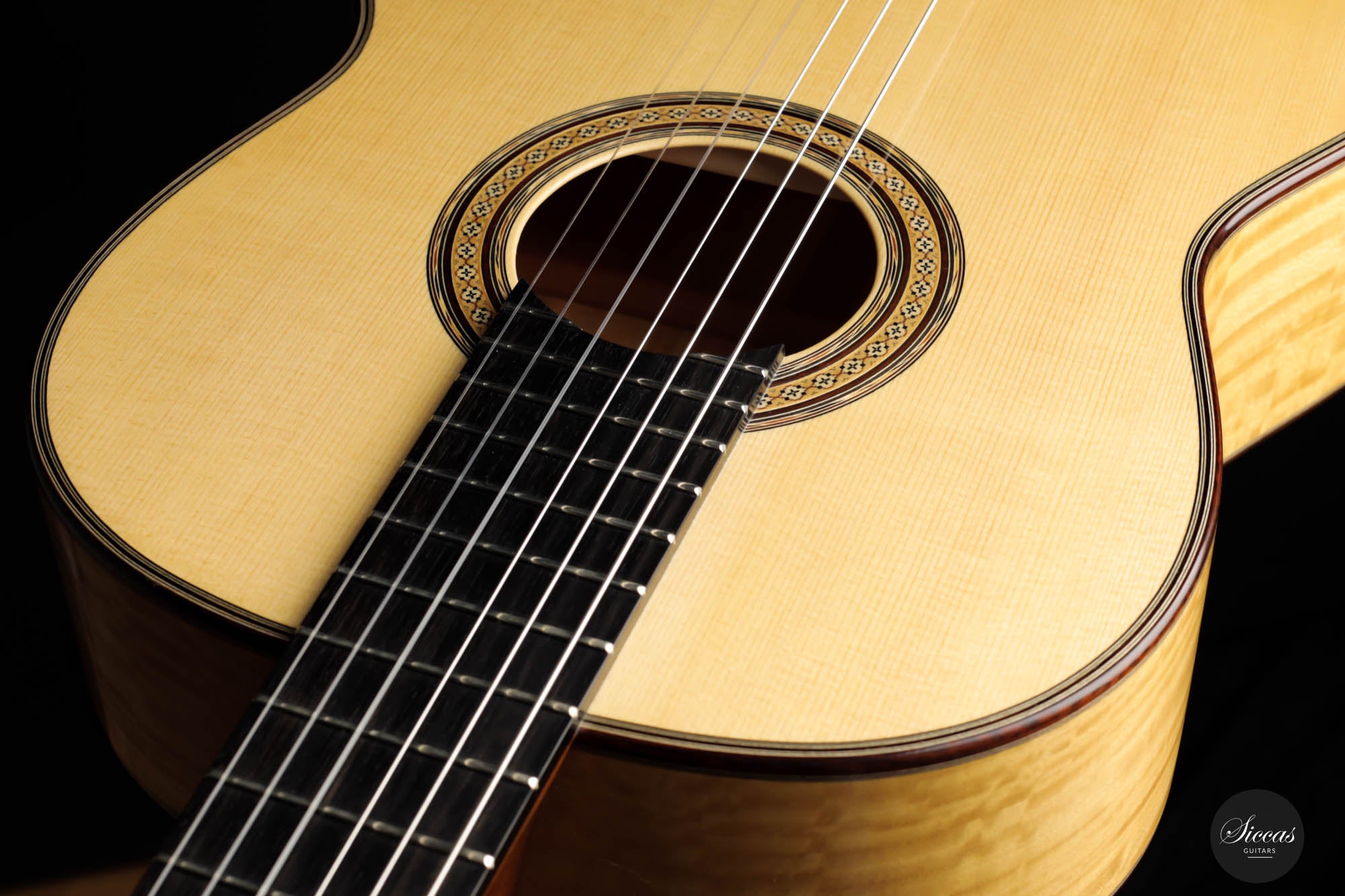 His concert guitars (like this one) owe their inspiration to the instruments of Antonio de Torres, the early 20th-century Spanish makers. By combining design elements from wonderful makers with his own ideas he produces instruments that are traditional in style, lightly built, and very responsive. He’s aiming for a sound that has real beauty, with the notes evenly focused and well-balanced across the whole musical spectrum.
