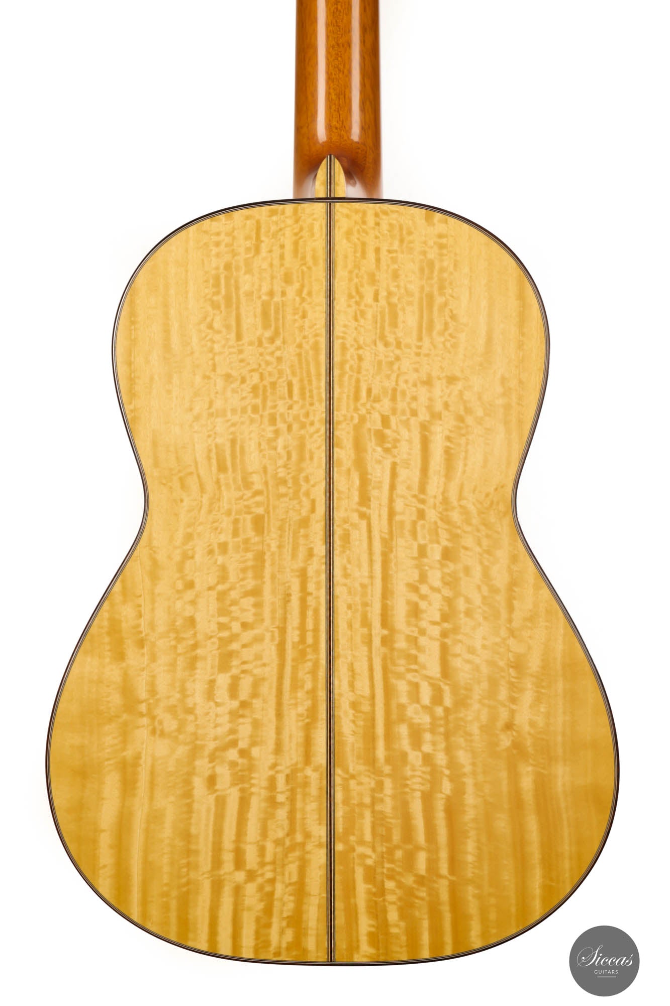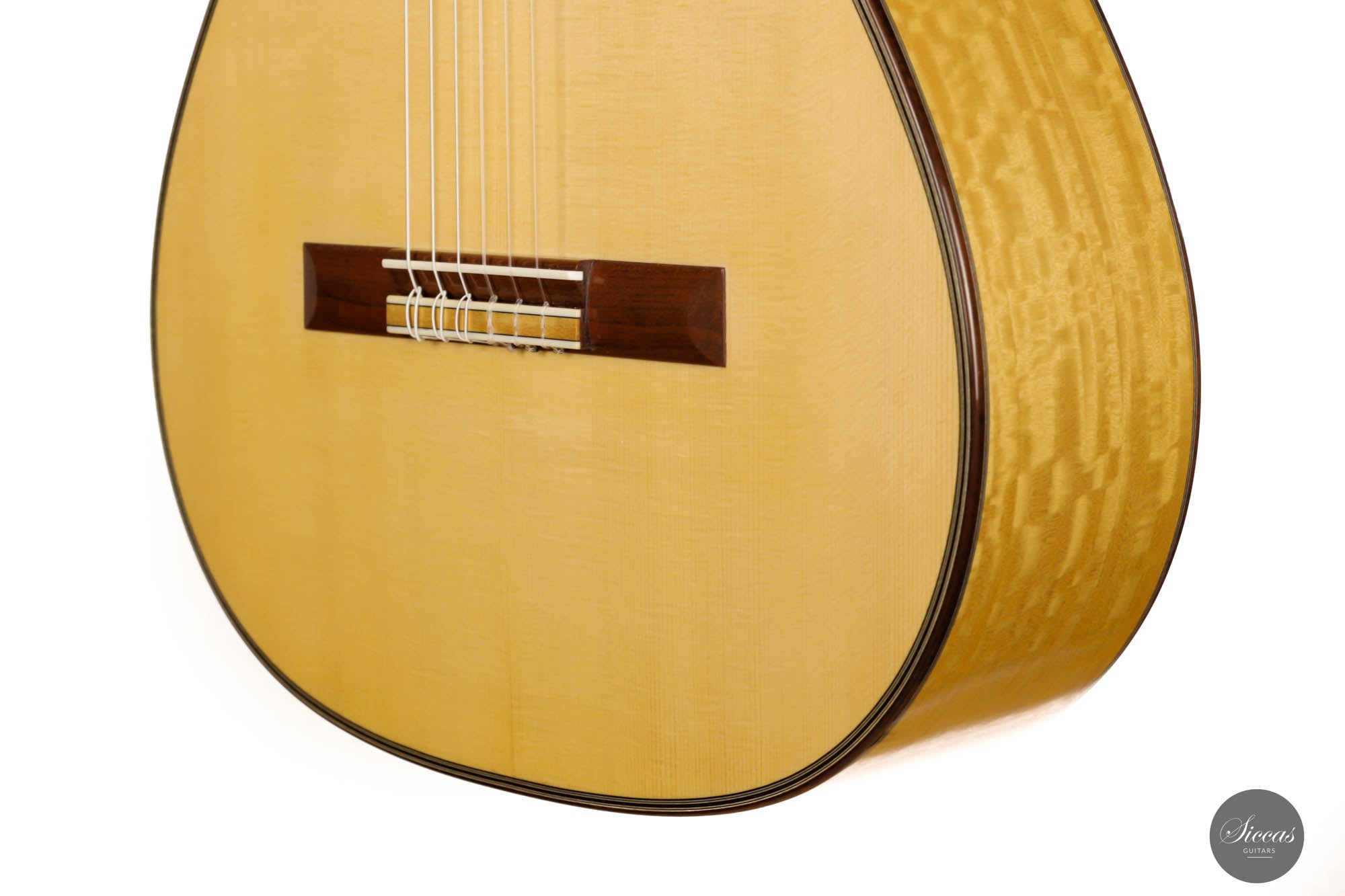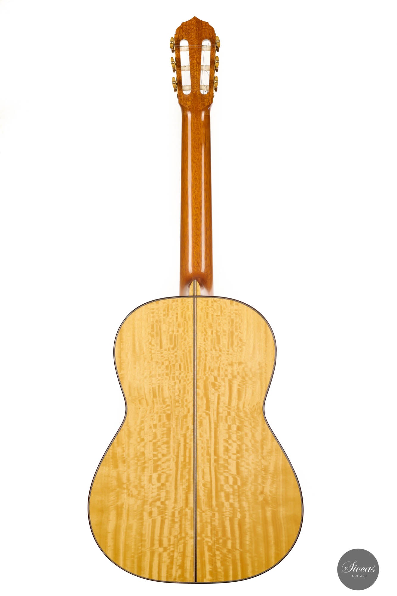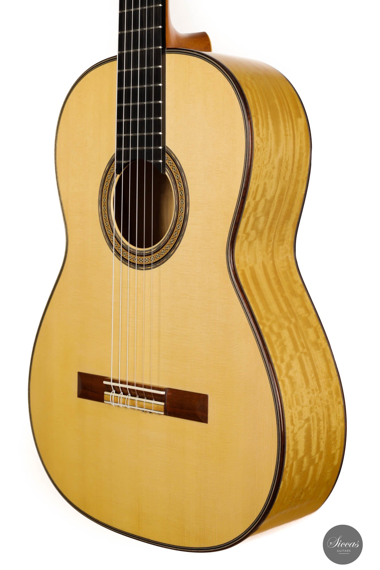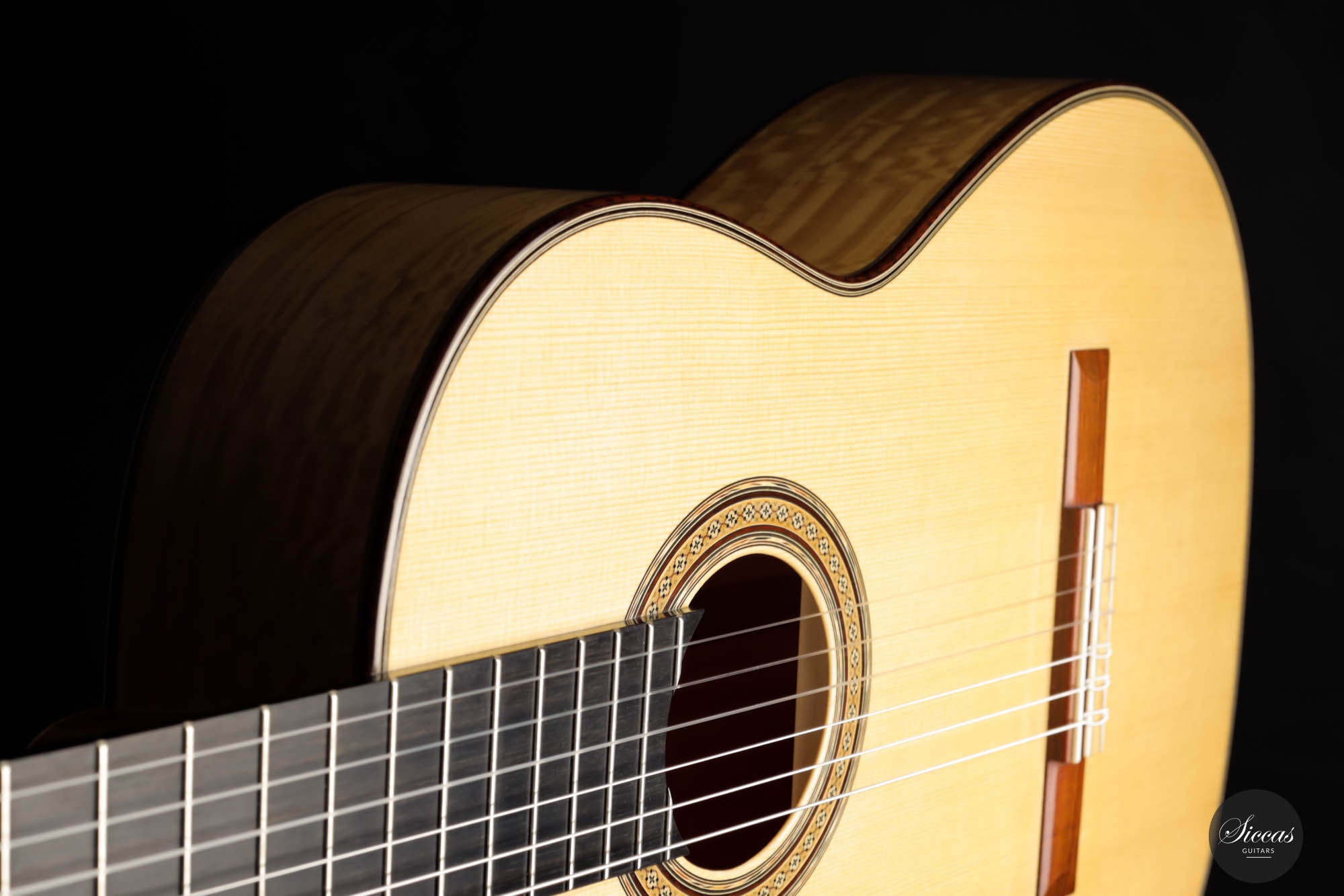 His concert guitars (like this one) owe their inspiration to the instruments of Antonio de Torres, the early 20th-century Spanish makers. By combining design elements from wonderful makers with his own ideas he produces instruments that are traditional in style, lightly built, and very responsive. He’s aiming for a sound that has real beauty, with the notes evenly focused and well-balanced across the whole musical spectrum.
