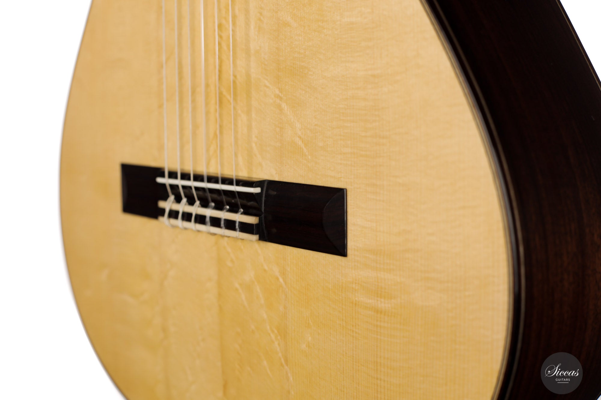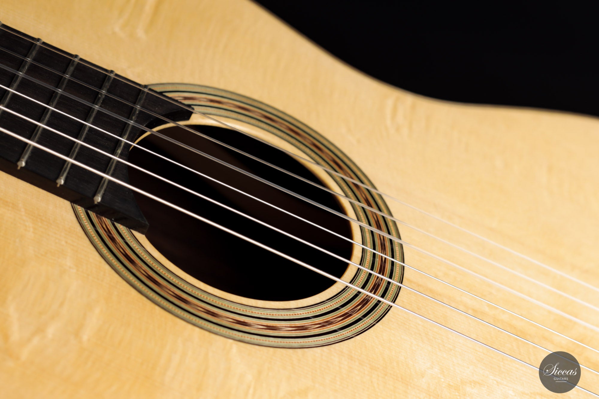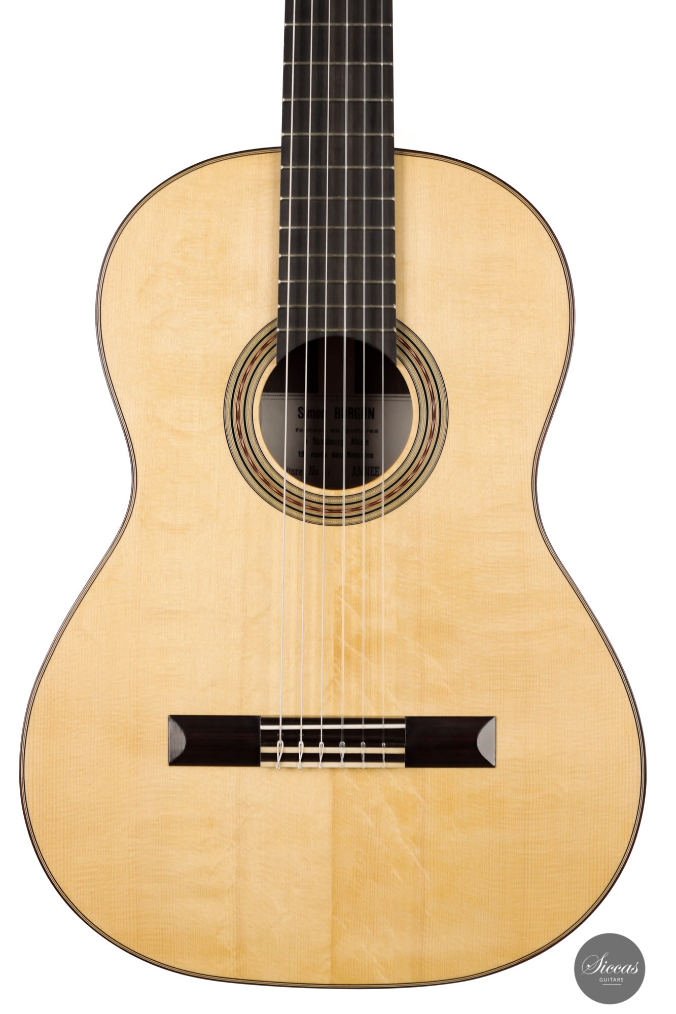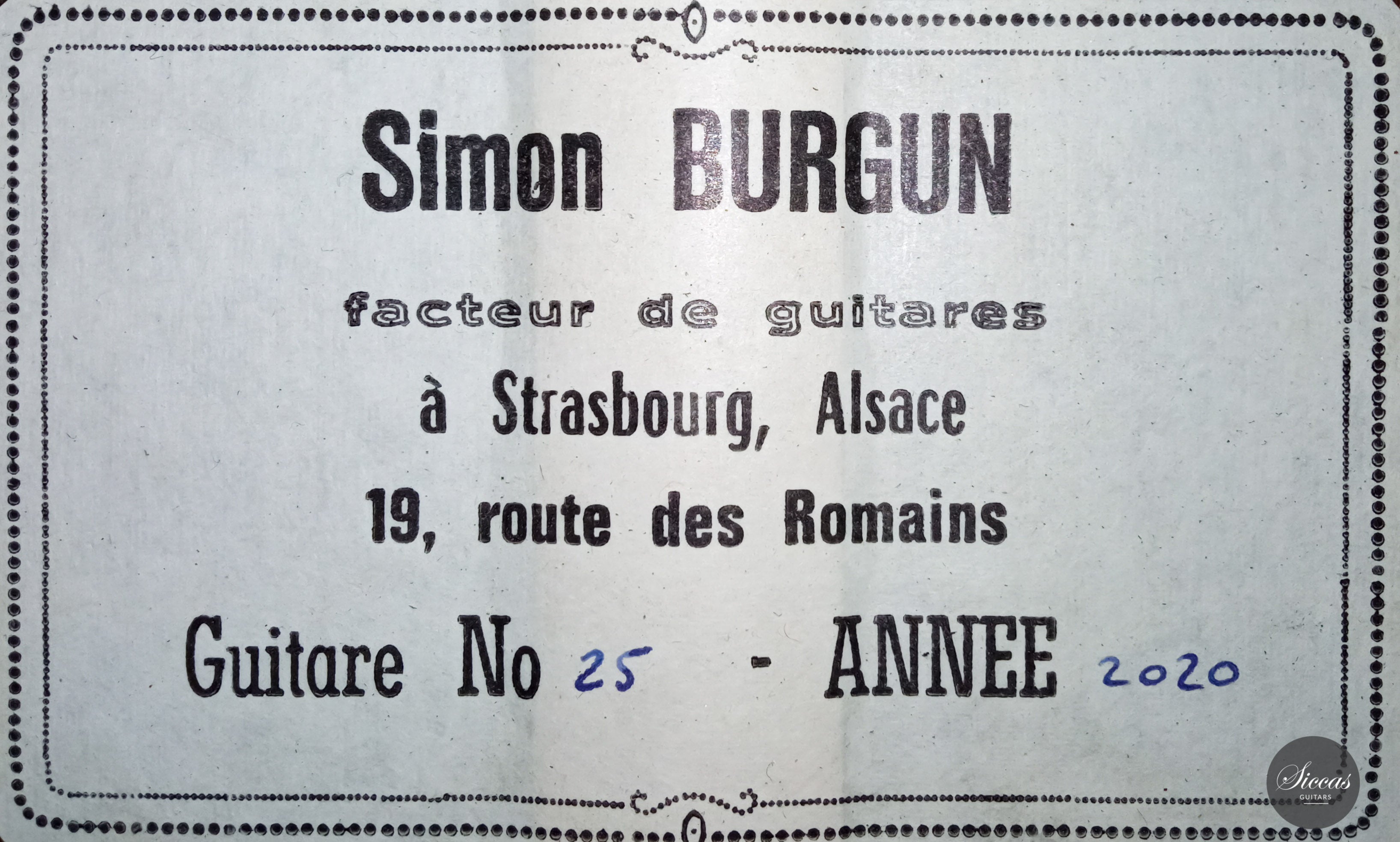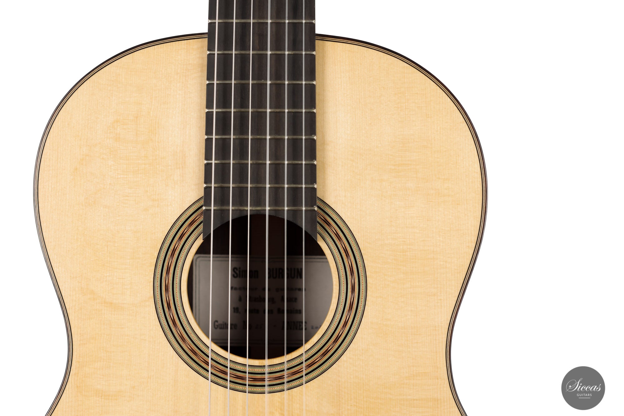 This concert model is a very exciting interpretation of the Torres design and comes directly from Simon Burgun's workshop. He started the construction back in 2020 (hence the 2020 label) and worked for more than a year to complete this guitar, finishing it at the end of 2021. Simon used only the best materials to build this guitar: a top made of the finest bear-claw-spruce, a wonderfully thin and straight-grained Indian rosewood for the back and sides, and high-quality Scheller tuners. Soundwise, one experiences a true tonal variety and complexity when playing this guitar. Its voice sounds intimate and offers excellent projection thanks to its distinct clarity. A very inspiring instrument that is particularly comfortable to play, especially for the left hand.