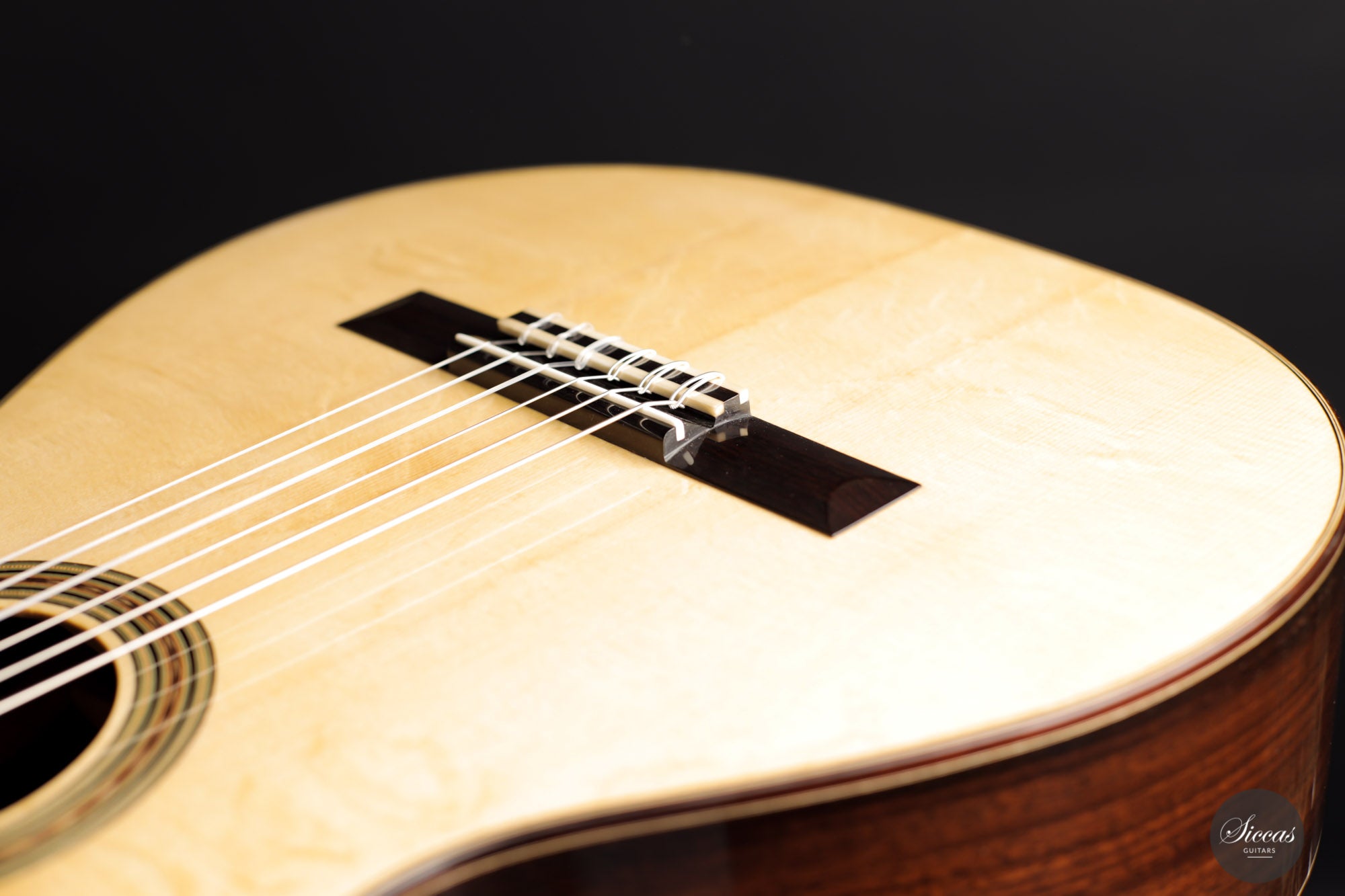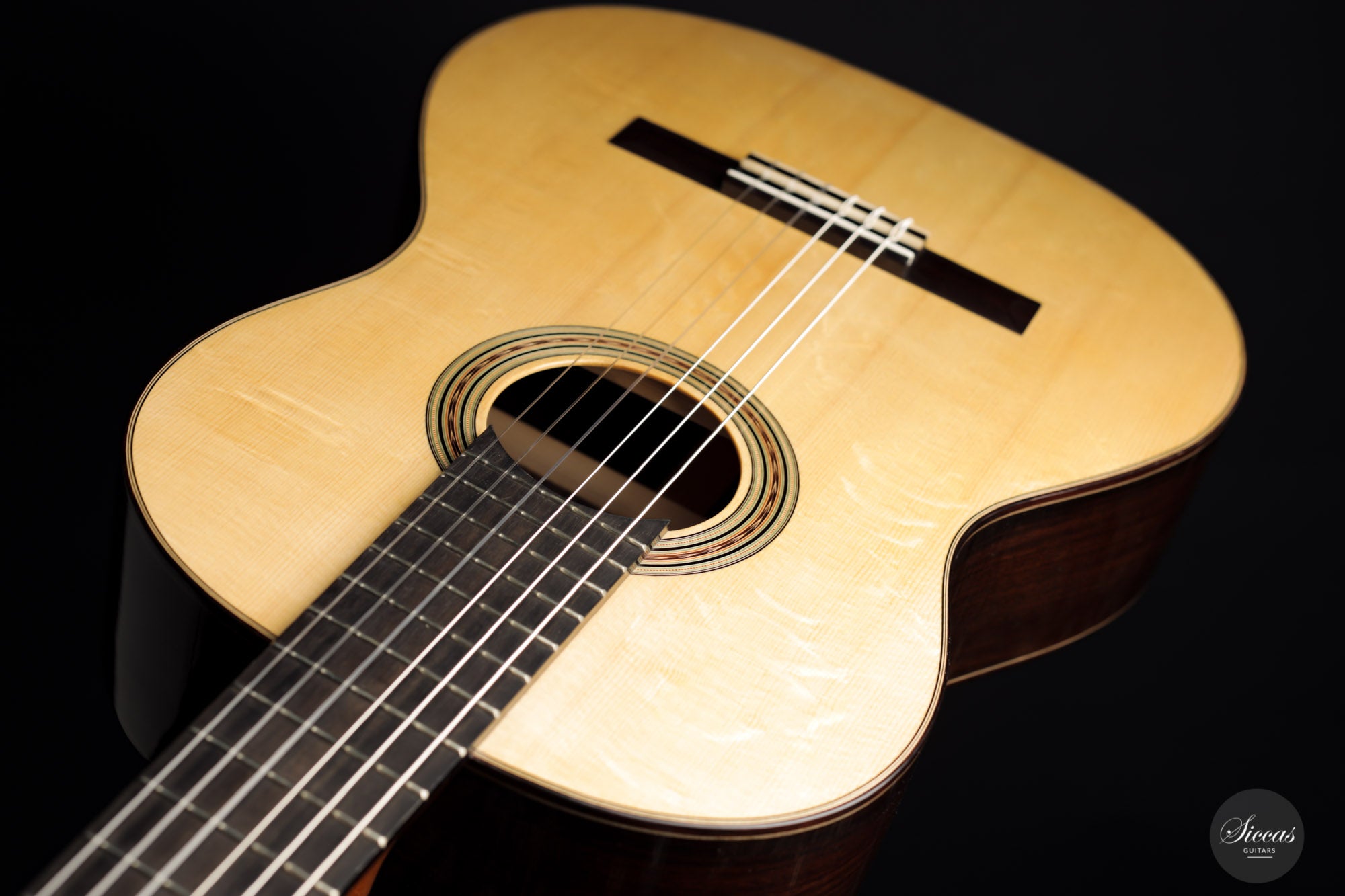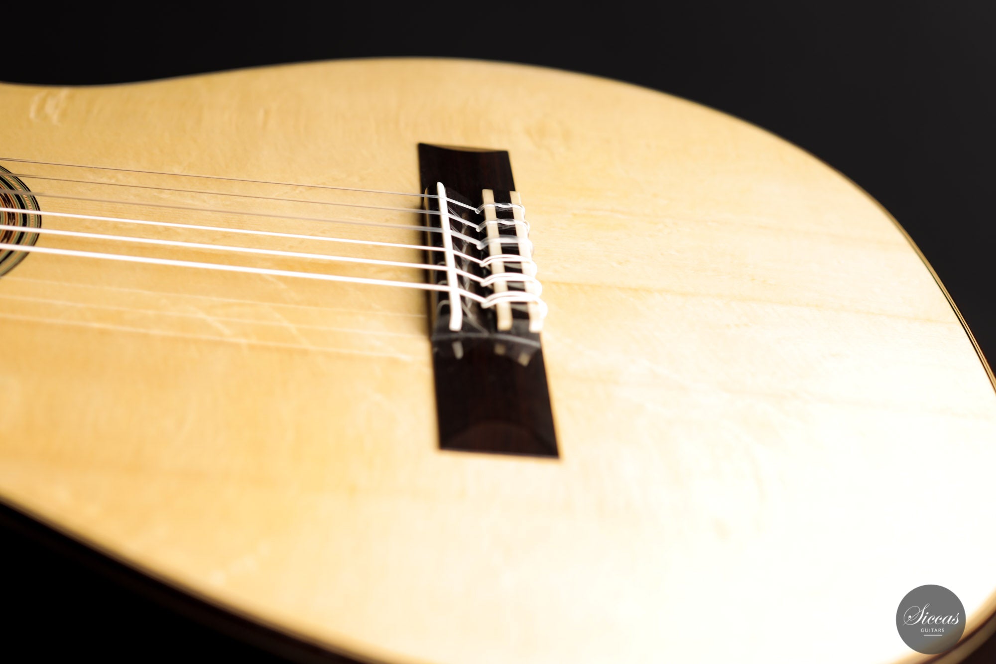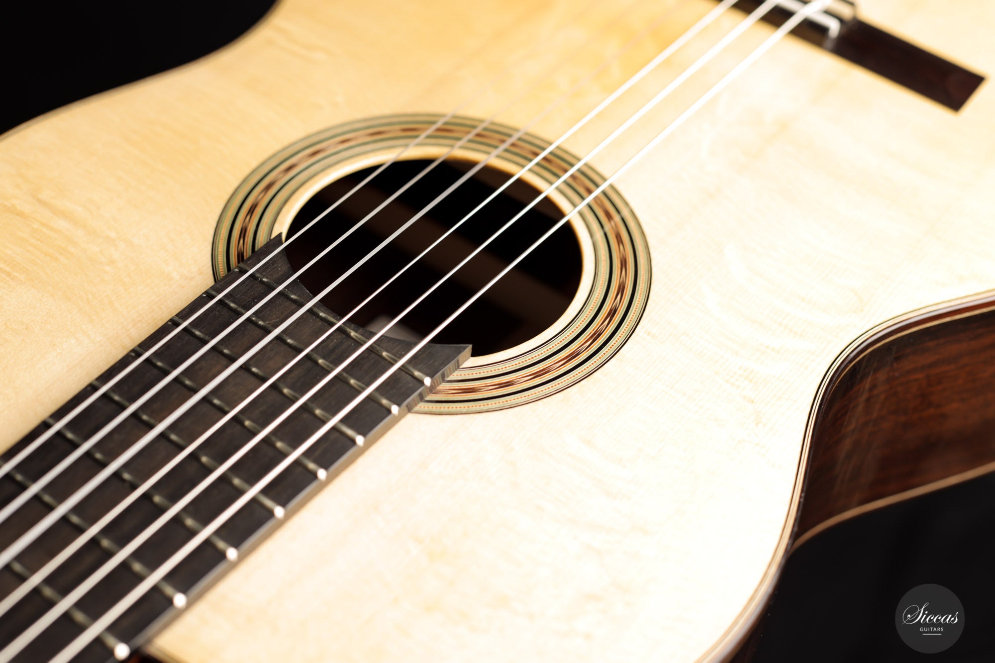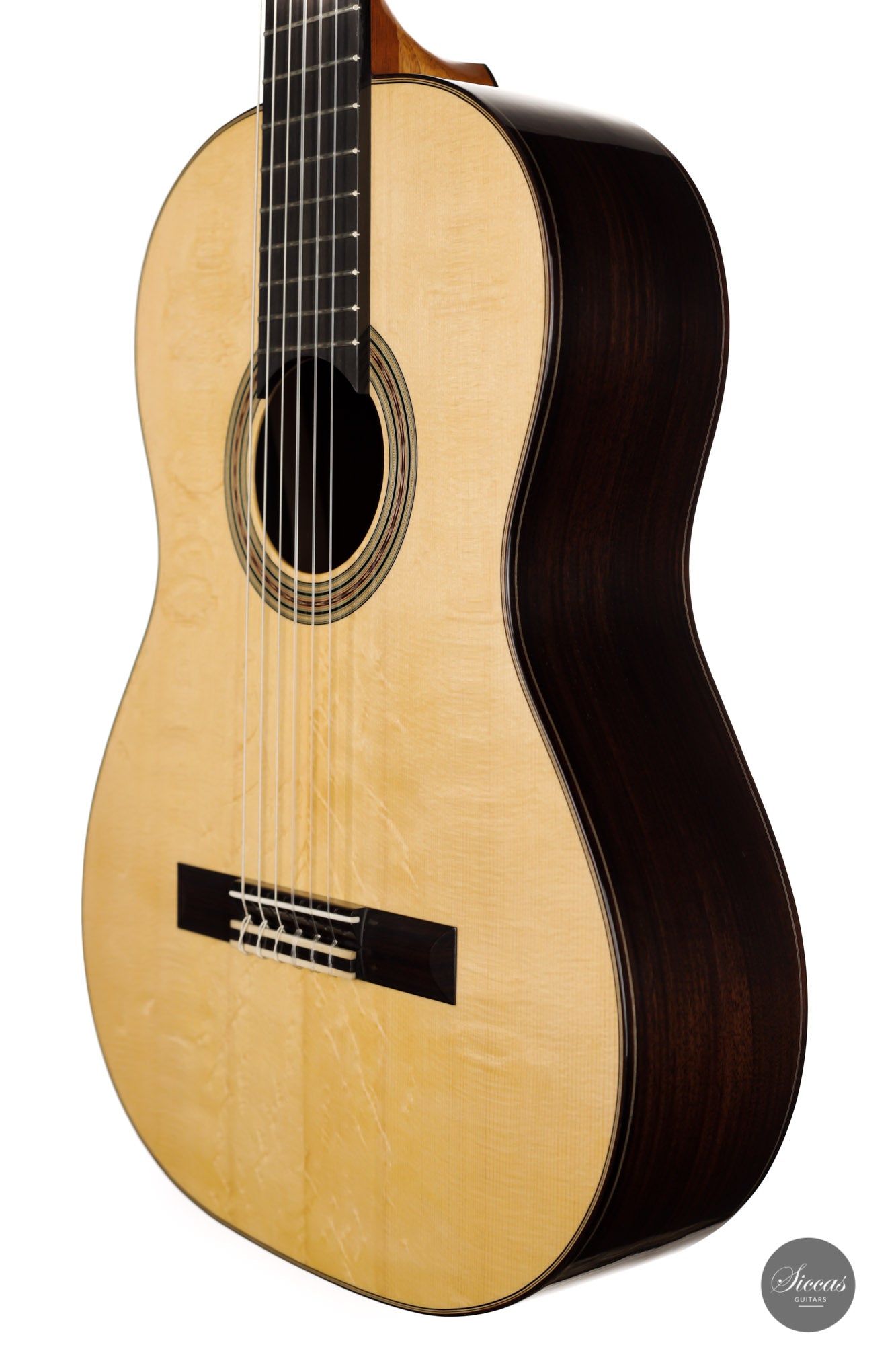 This concert model is a very exciting interpretation of the Torres design and comes directly from Simon Burgun's workshop. He started the construction back in 2020 (hence the 2020 label) and worked for more than a year to complete this guitar, finishing it at the end of 2021. Simon used only the best materials to build this guitar: a top made of the finest bear-claw-spruce, a wonderfully thin and straight-grained Indian rosewood for the back and sides, and high-quality Scheller tuners. Soundwise, one experiences a true tonal variety and complexity when playing this guitar. Its voice sounds intimate and offers excellent projection thanks to its distinct clarity. A very inspiring instrument that is particularly comfortable to play, especially for the left hand.