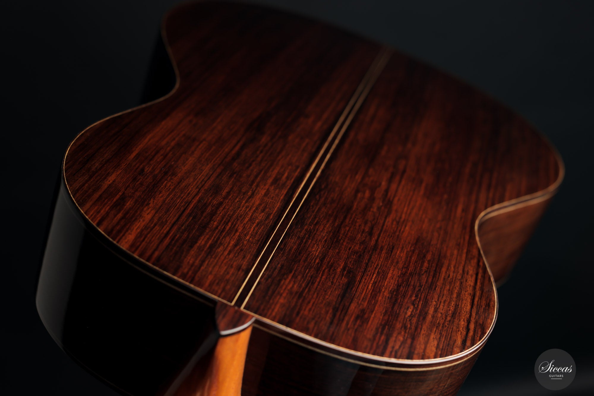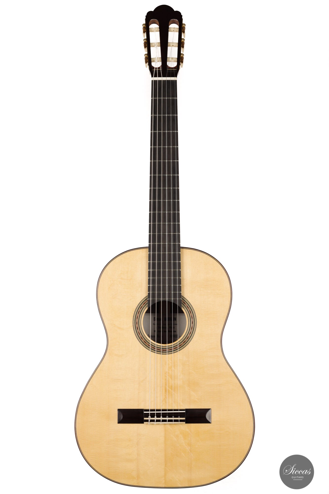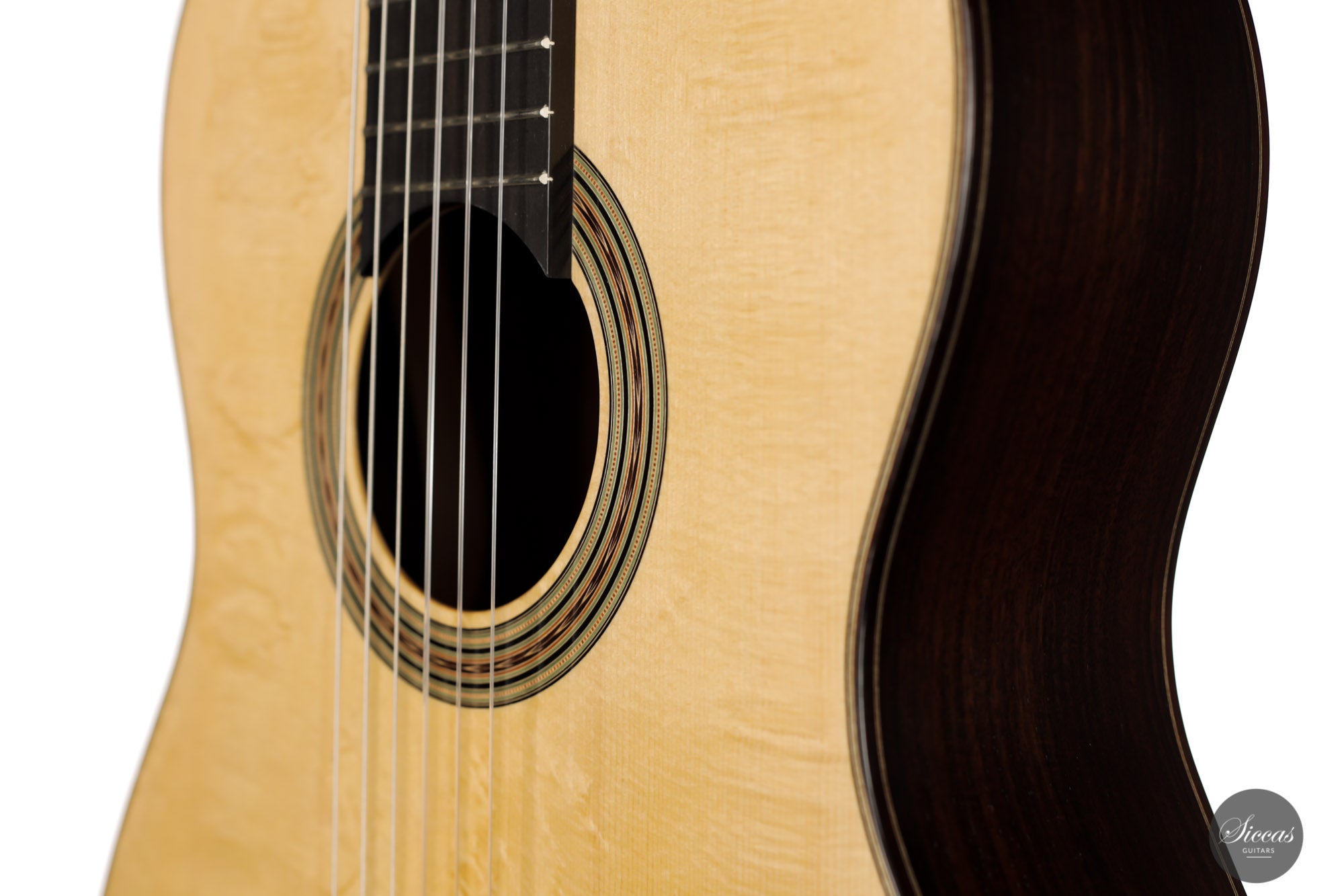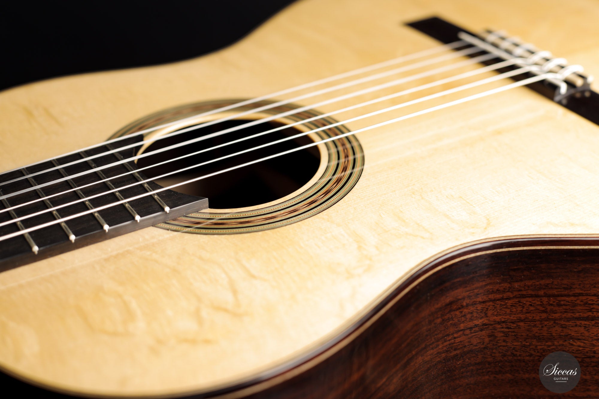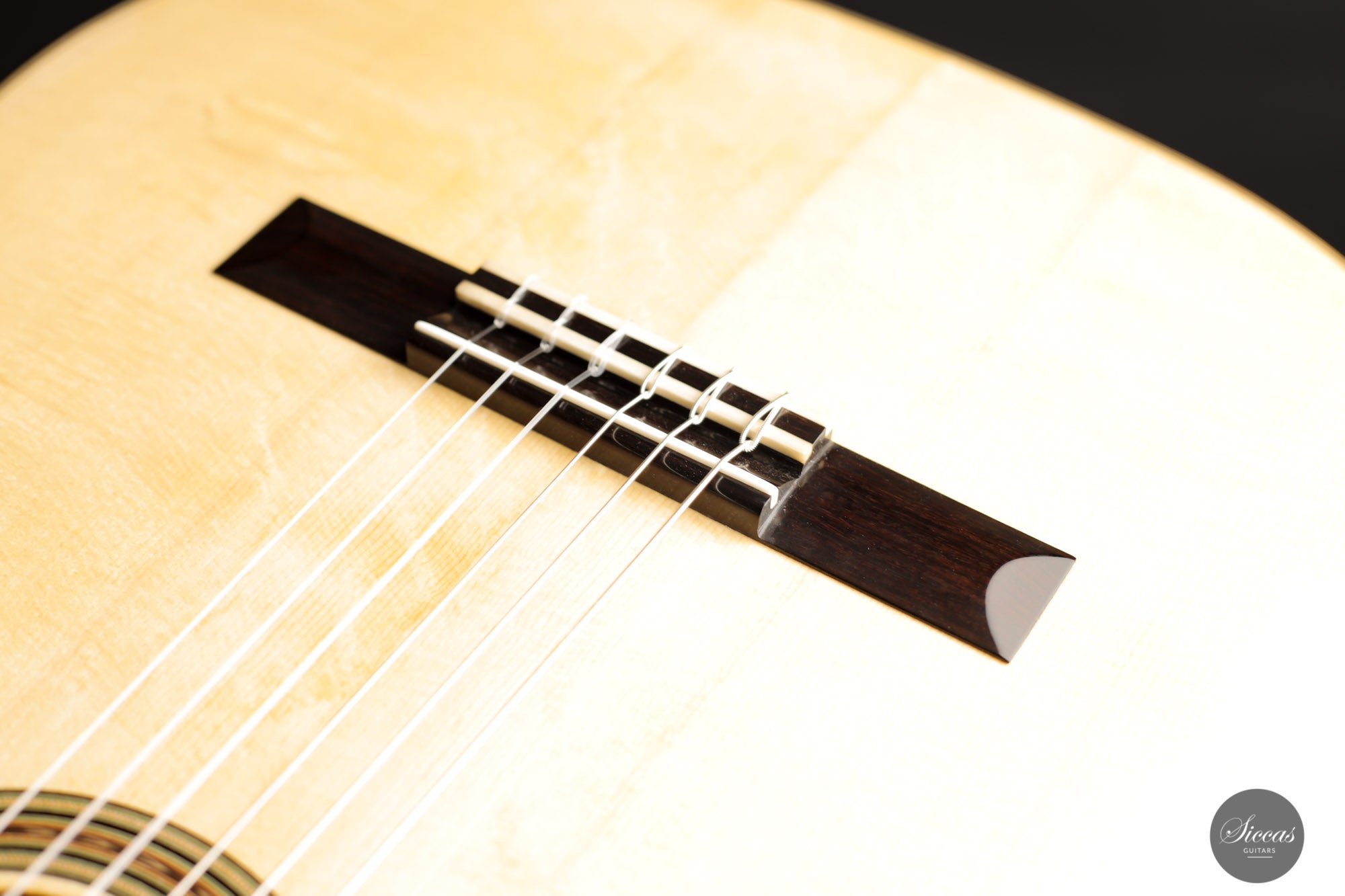 This concert model is a very exciting interpretation of the Torres design and comes directly from Simon Burgun's workshop. He started the construction back in 2020 (hence the 2020 label) and worked for more than a year to complete this guitar, finishing it at the end of 2021. Simon used only the best materials to build this guitar: a top made of the finest bear-claw-spruce, a wonderfully thin and straight-grained Indian rosewood for the back and sides, and high-quality Scheller tuners. Soundwise, one experiences a true tonal variety and complexity when playing this guitar. Its voice sounds intimate and offers excellent projection thanks to its distinct clarity. A very inspiring instrument that is particularly comfortable to play, especially for the left hand.