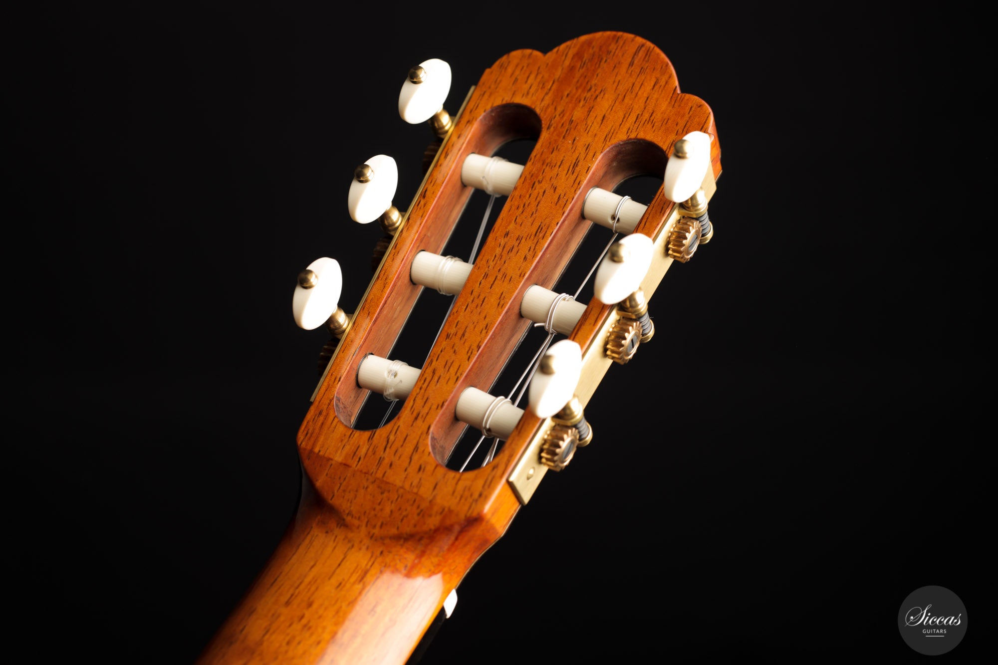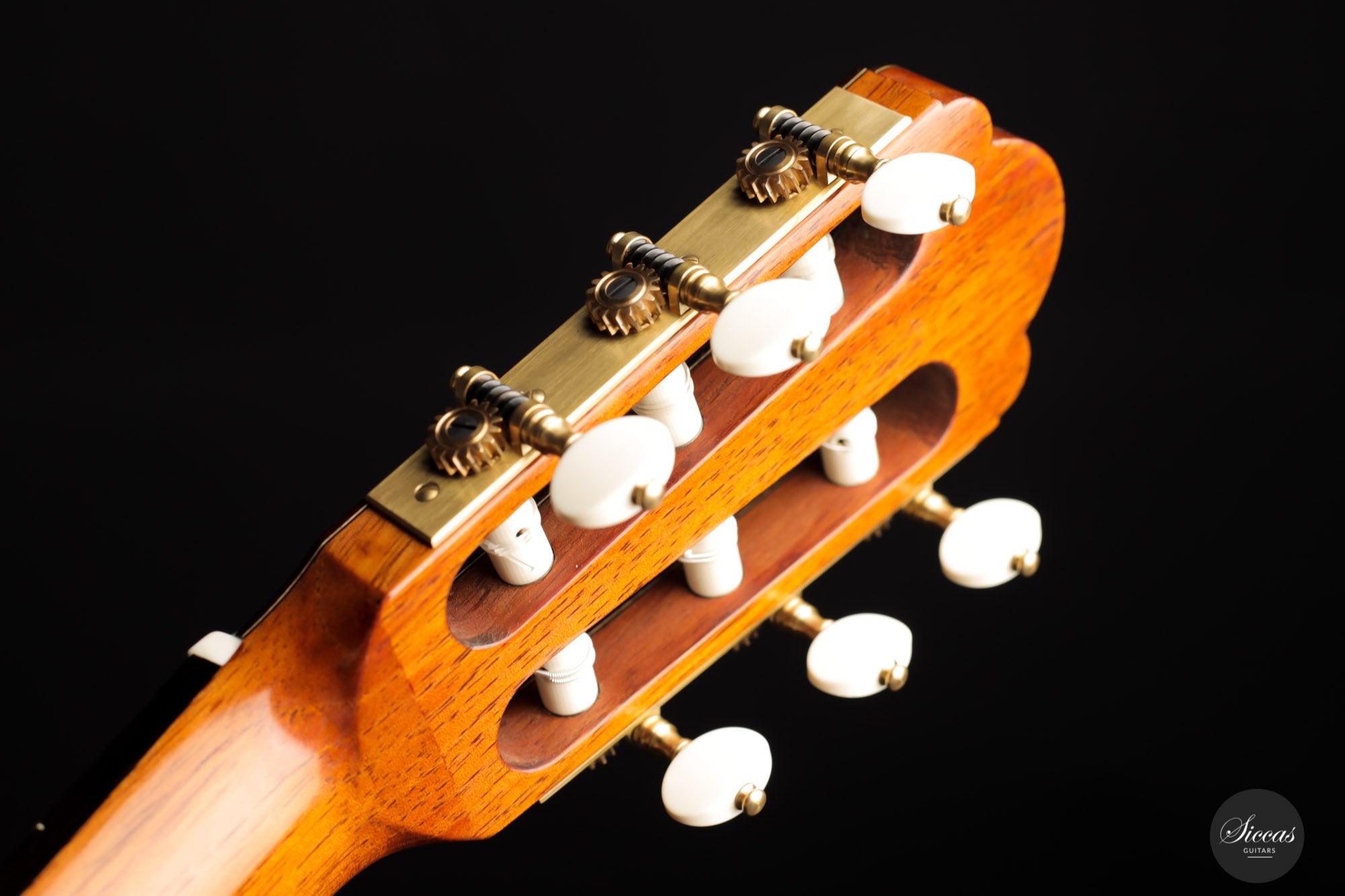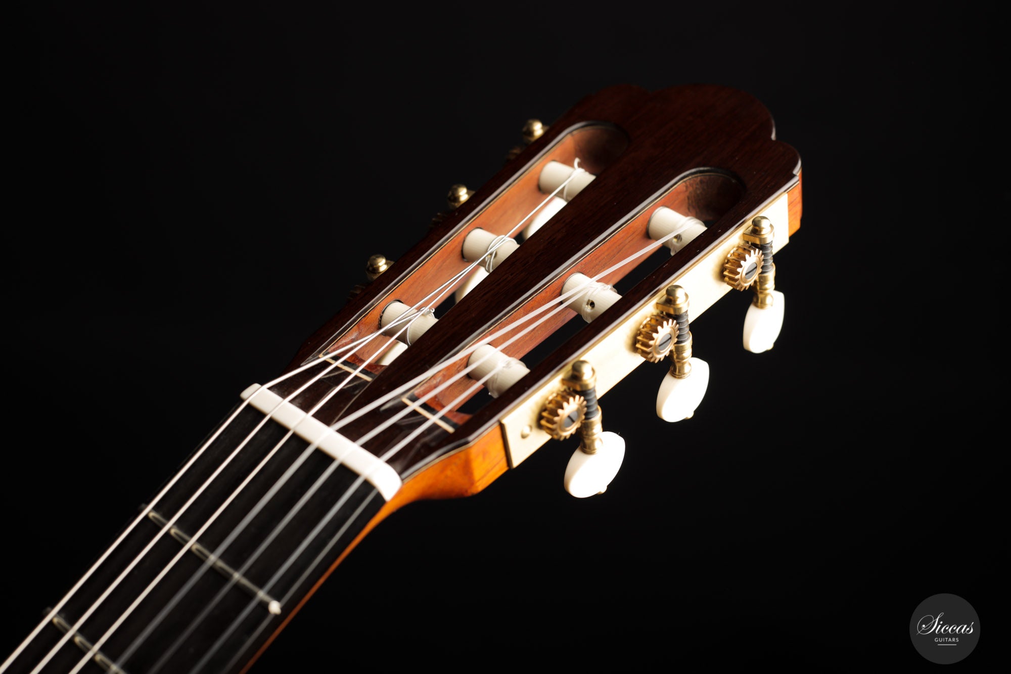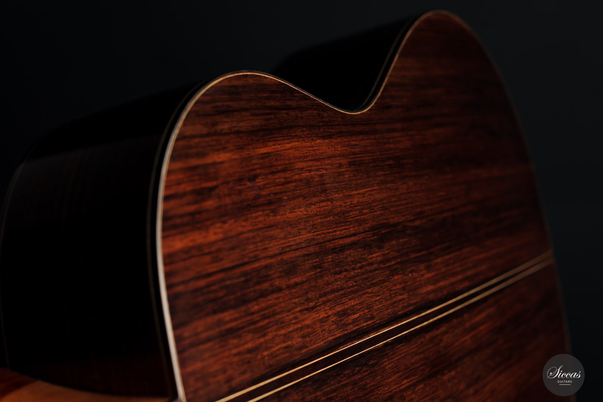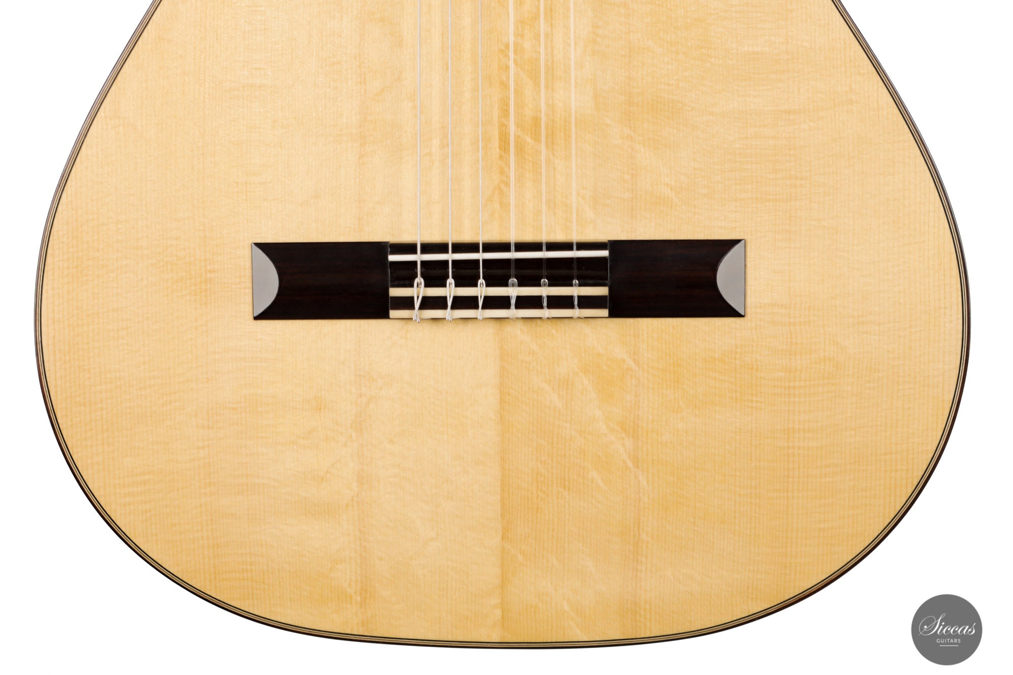 This concert model is a very exciting interpretation of the Torres design and comes directly from Simon Burgun's workshop. He started the construction back in 2020 (hence the 2020 label) and worked for more than a year to complete this guitar, finishing it at the end of 2021. Simon used only the best materials to build this guitar: a top made of the finest bear-claw-spruce, a wonderfully thin and straight-grained Indian rosewood for the back and sides, and high-quality Scheller tuners. Soundwise, one experiences a true tonal variety and complexity when playing this guitar. Its voice sounds intimate and offers excellent projection thanks to its distinct clarity. A very inspiring instrument that is particularly comfortable to play, especially for the left hand.