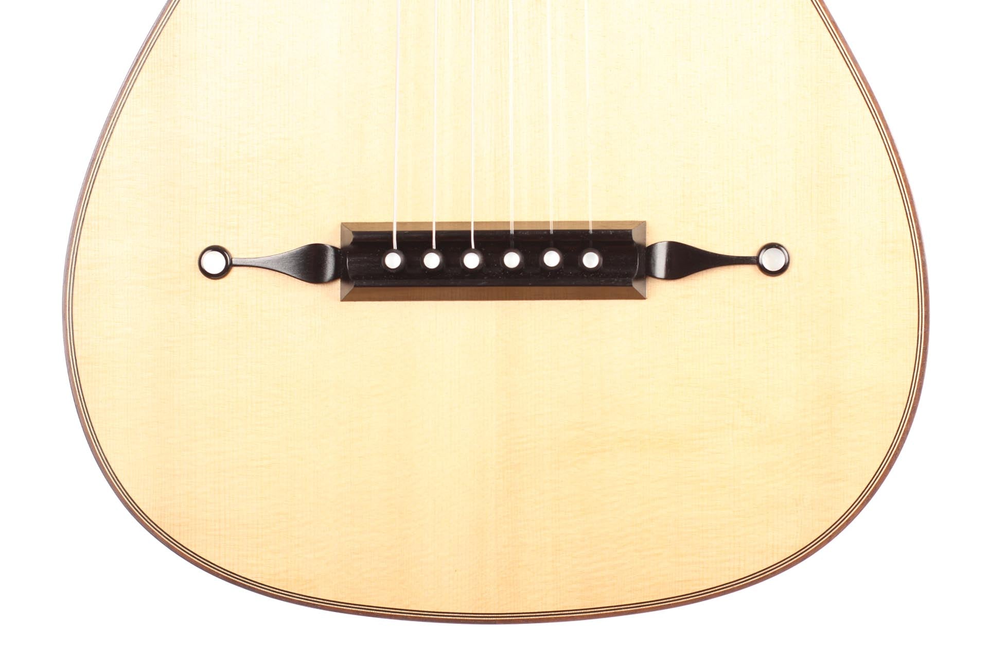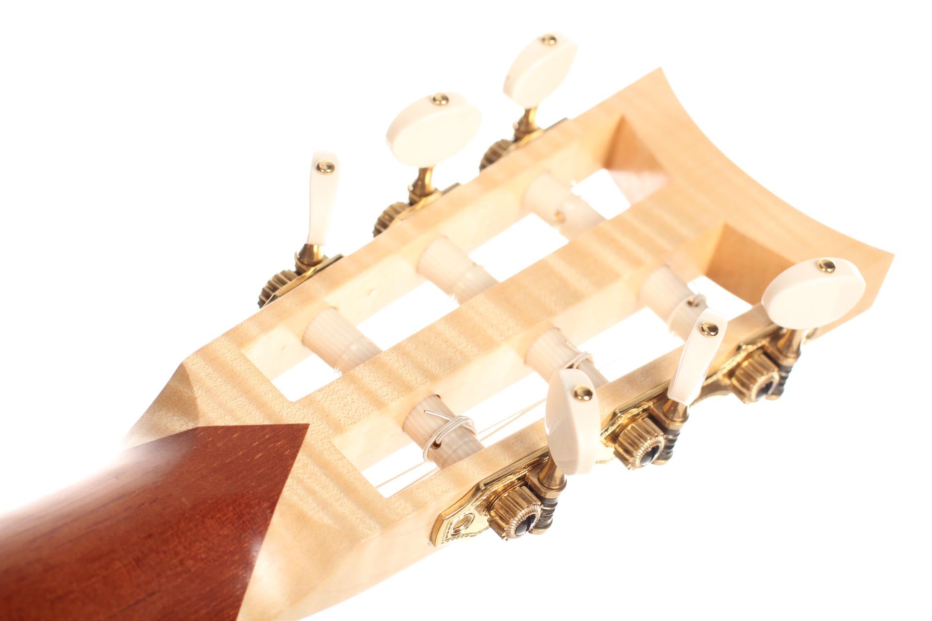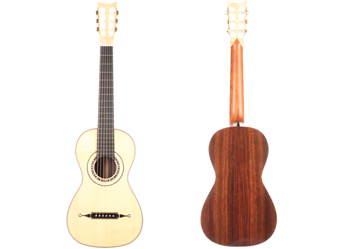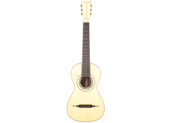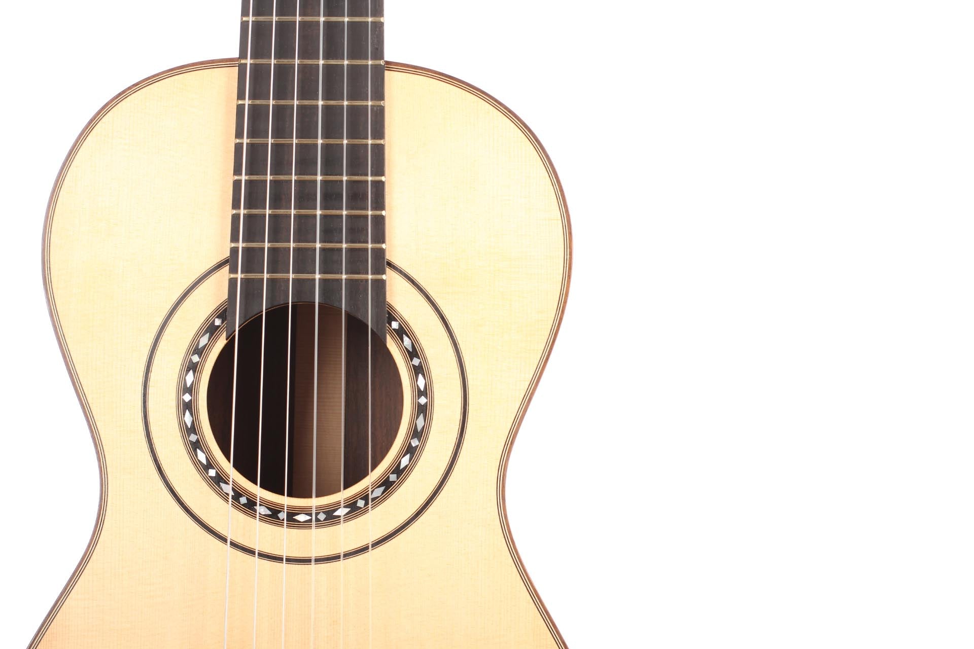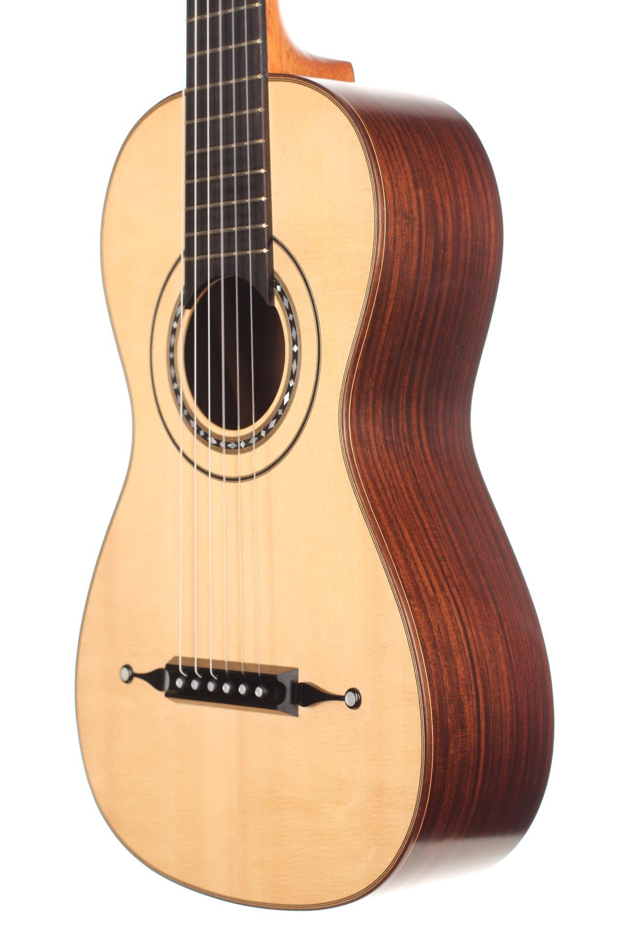 Simon Burgun studied lutherie in Belgium at the Center voor Muziekinstrumentenouw with Walter Verreydt and Karel Dedain. He was encouraged by being awarded the school's price De Gouden Bootschaaf for the quality of his work. Simon is specialized in the methods, materials and instruments of the 19th century, including romantic and early classical guitars. He shares his time between repairs, restorations and new instruments and builds four guitars a year. His workshop is located in Strasbourg, at the French German border, 80 km from Karlsruhe. This guitar was built after the famous instruments by the Londonian workshop of Joseph and Louis Panormo. This instantly recognisable design was inspired by the Spanish luthier Pages whose instruments were brought to England by Fernando Sor. Panormo guitars are a very interesting link between the romantic and the classical guitars. It features characteritics of the first (small body, pin bridge, mother of pearl decoration) and of the latter (tuners, height of the ribs, fan bracing, use of rosewwod and Spanish cedar), making it an ideal guitar for classical players wishing to wander on the romantic repertoire with the appropriate instrument. The back of the instrument displays an appealing set of shades, from the dark brown rosewood to the mahogany neck and the flame maple headstock. For such a small-bodied instrument, this guitar has a great volume and sustain. Actually, it is the quality of the sound itself that is the most striking. This instrument is very well-balanced with a constant tone and timbre all along the neck. The tone is remarkably rich and doesn’t loose of its complexity in fine “piano” or mighty “fortes”. A brilliant instrument for a romantic and classical guitar aficionado. The tuners are by Rubner and the finish is an hard drying oil. A hard-shell case is included.