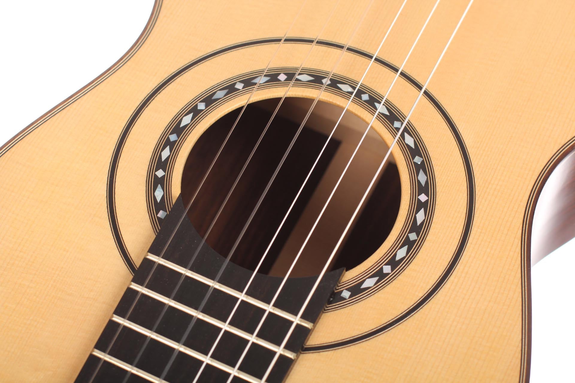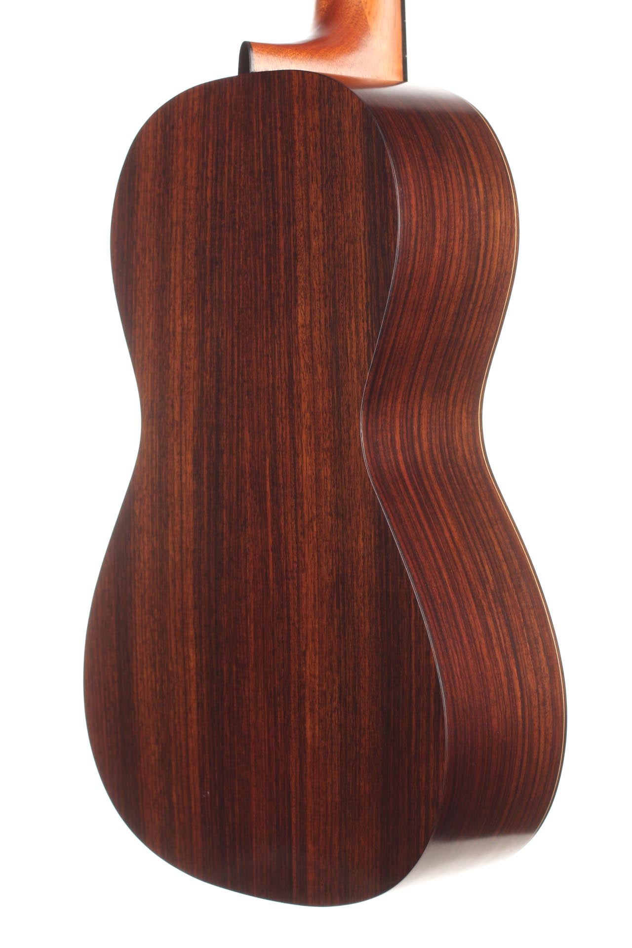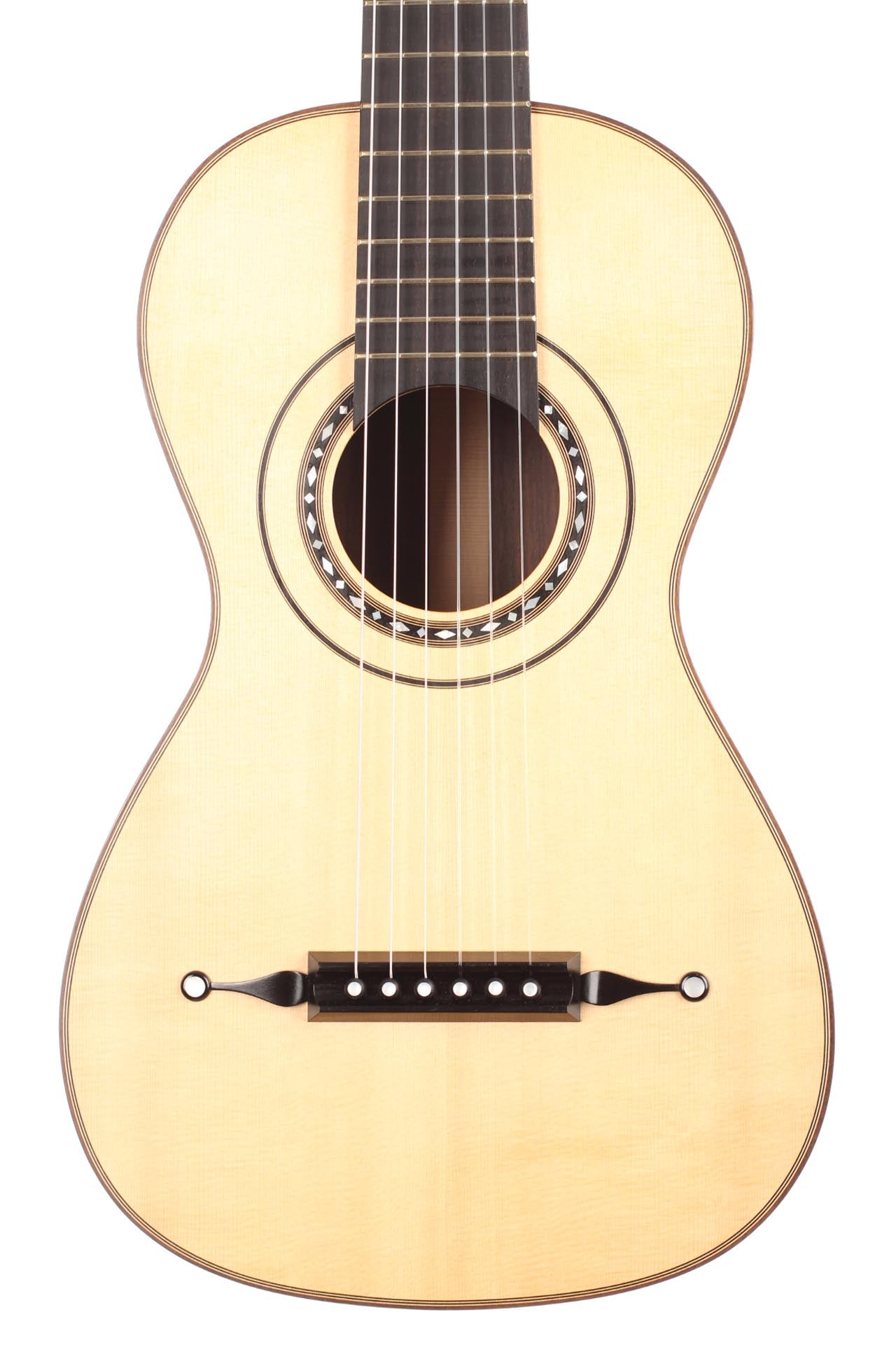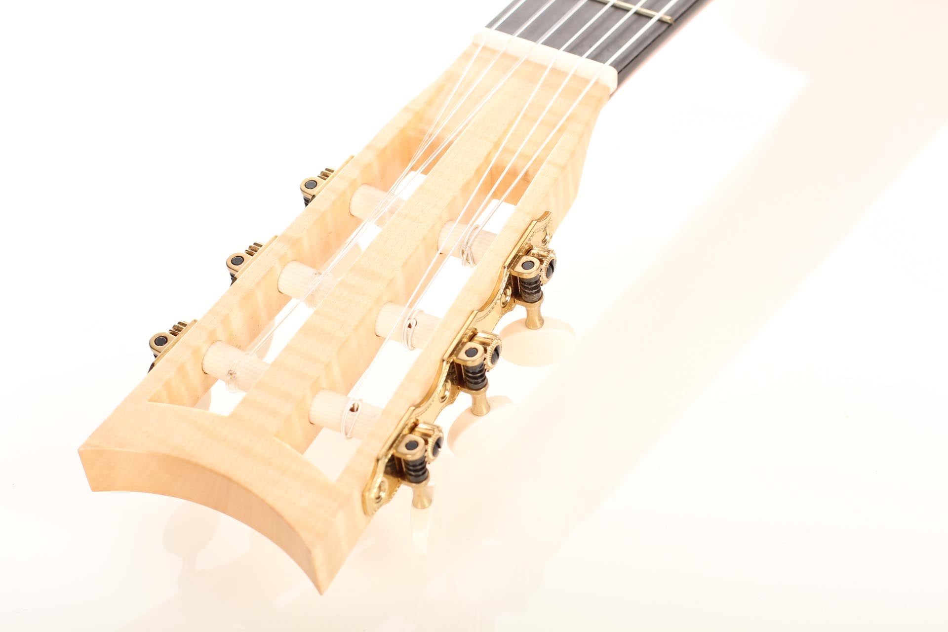 Simon Burgun studied lutherie in Belgium at the Center voor Muziekinstrumentenouw with Walter Verreydt and Karel Dedain. He was encouraged by being awarded the school's price De Gouden Bootschaaf for the quality of his work. Simon is specialized in the methods, materials and instruments of the 19th century, including romantic and early classical guitars. He shares his time between repairs, restorations and new instruments and builds four guitars a year. His workshop is located in Strasbourg, at the French German border, 80 km from Karlsruhe. This guitar was built after the famous instruments by the Londonian workshop of Joseph and Louis Panormo. This instantly recognisable design was inspired by the Spanish luthier Pages whose instruments were brought to England by Fernando Sor. Panormo guitars are a very interesting link between the romantic and the classical guitars. It features characteritics of the first (small body, pin bridge, mother of pearl decoration) and of the latter (tuners, height of the ribs, fan bracing, use of rosewwod and Spanish cedar), making it an ideal guitar for classical players wishing to wander on the romantic repertoire with the appropriate instrument. The back of the instrument displays an appealing set of shades, from the dark brown rosewood to the mahogany neck and the flame maple headstock. For such a small-bodied instrument, this guitar has a great volume and sustain. Actually, it is the quality of the sound itself that is the most striking. This instrument is very well-balanced with a constant tone and timbre all along the neck. The tone is remarkably rich and doesn’t loose of its complexity in fine “piano” or mighty “fortes”. A brilliant instrument for a romantic and classical guitar aficionado. The tuners are by Rubner and the finish is an hard drying oil. A hard-shell case is included.