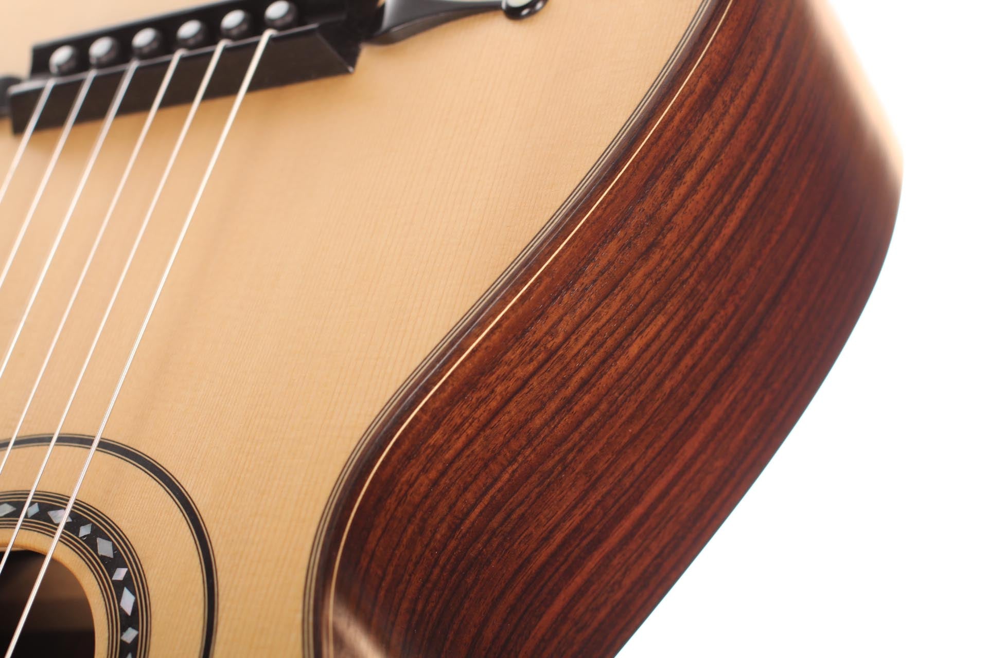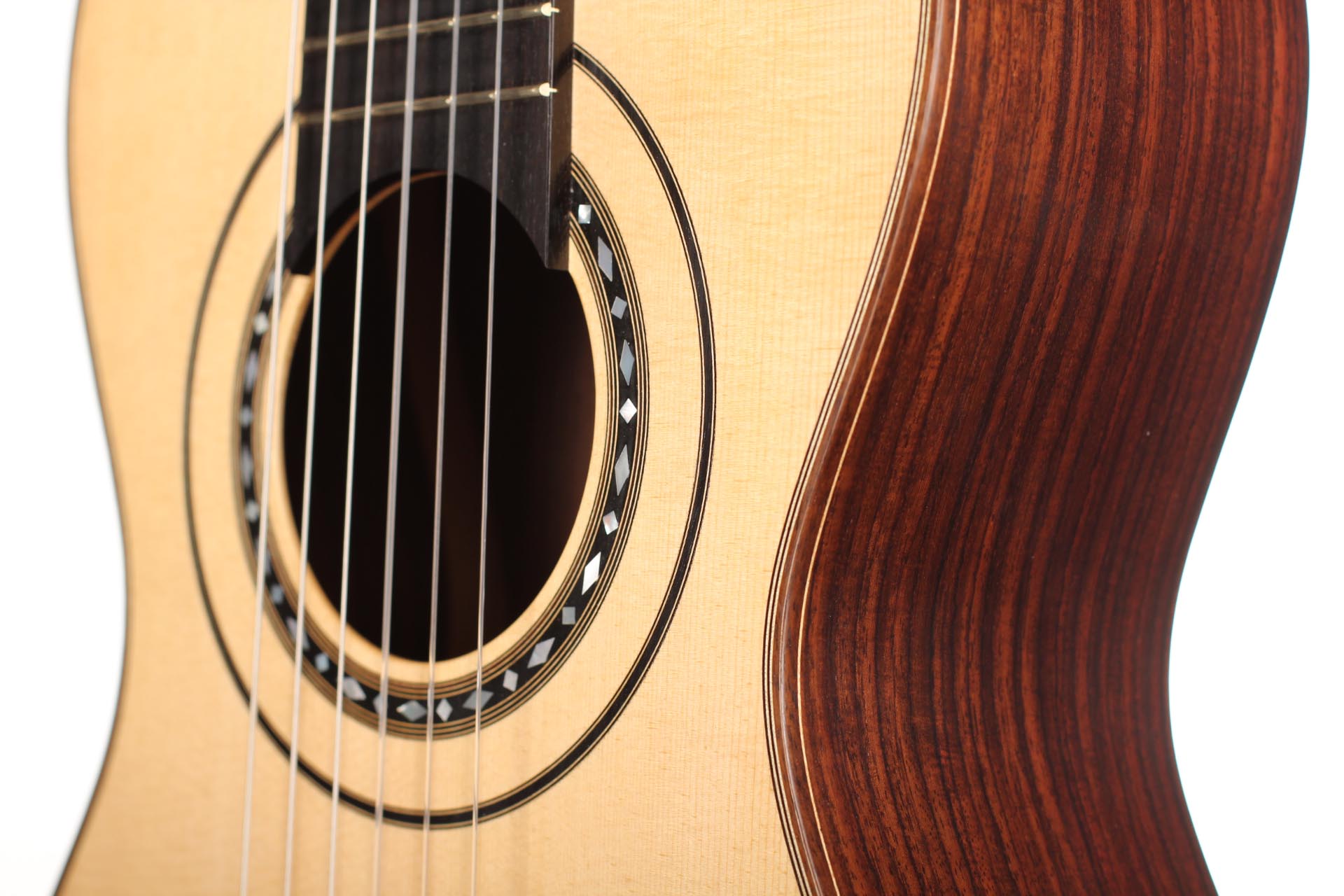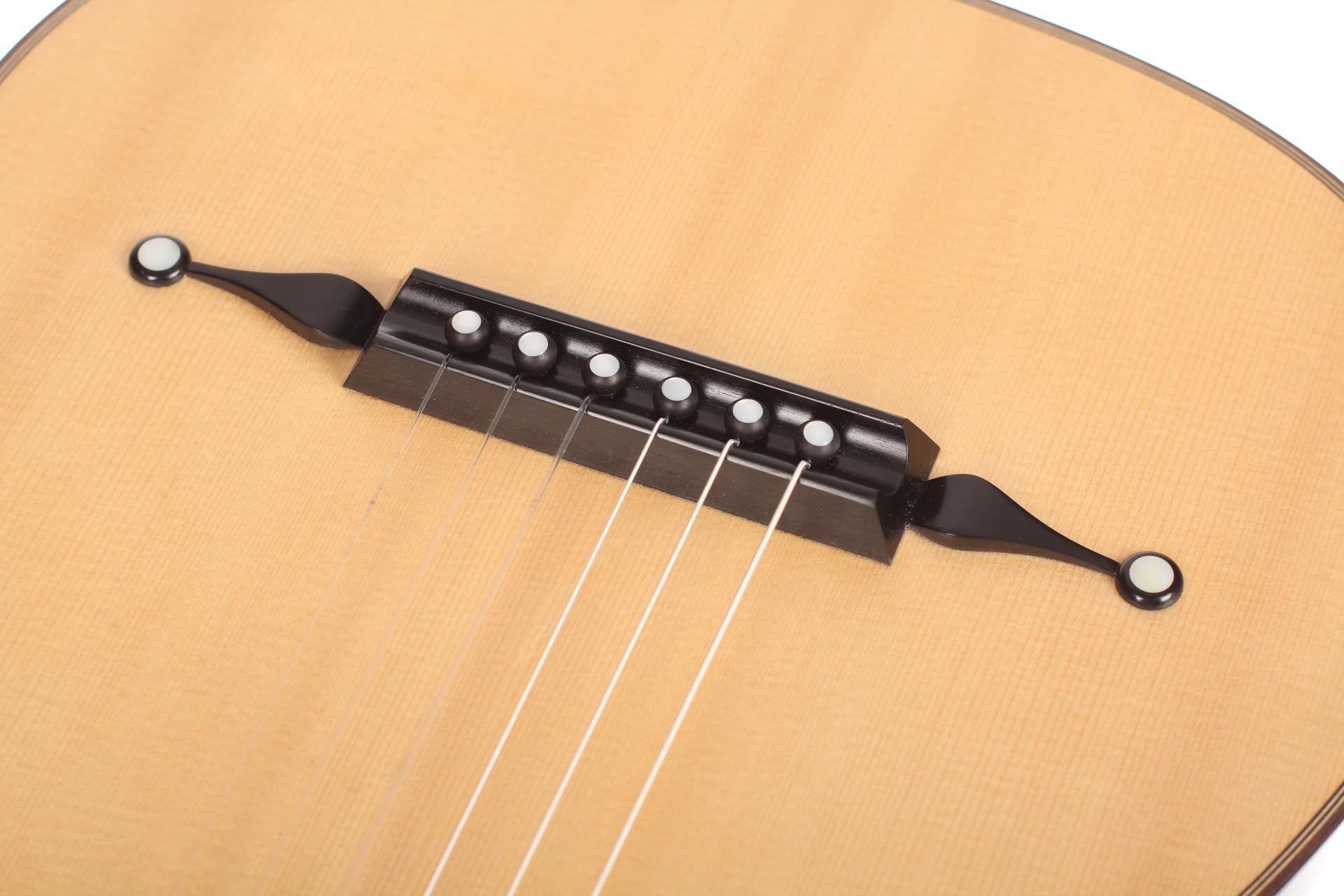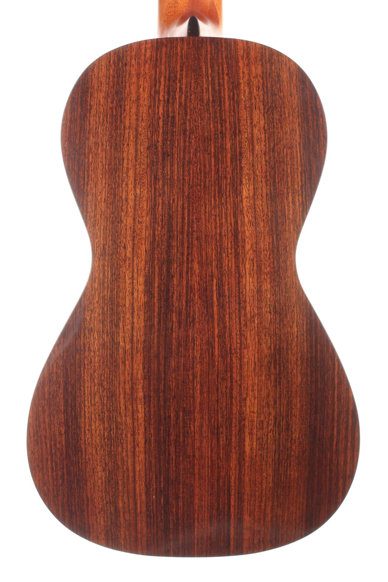 Simon Burgun studied lutherie in Belgium at the Center voor Muziekinstrumentenouw with Walter Verreydt and Karel Dedain. He was encouraged by being awarded the school's price De Gouden Bootschaaf for the quality of his work. Simon is specialized in the methods, materials and instruments of the 19th century, including romantic and early classical guitars. He shares his time between repairs, restorations and new instruments and builds four guitars a year. His workshop is located in Strasbourg, at the French German border, 80 km from Karlsruhe. This guitar was built after the famous instruments by the Londonian workshop of Joseph and Louis Panormo. This instantly recognisable design was inspired by the Spanish luthier Pages whose instruments were brought to England by Fernando Sor. Panormo guitars are a very interesting link between the romantic and the classical guitars. It features characteritics of the first (small body, pin bridge, mother of pearl decoration) and of the latter (tuners, height of the ribs, fan bracing, use of rosewwod and Spanish cedar), making it an ideal guitar for classical players wishing to wander on the romantic repertoire with the appropriate instrument. The back of the instrument displays an appealing set of shades, from the dark brown rosewood to the mahogany neck and the flame maple headstock. For such a small-bodied instrument, this guitar has a great volume and sustain. Actually, it is the quality of the sound itself that is the most striking. This instrument is very well-balanced with a constant tone and timbre all along the neck. The tone is remarkably rich and doesn’t loose of its complexity in fine “piano” or mighty “fortes”. A brilliant instrument for a romantic and classical guitar aficionado. The tuners are by Rubner and the finish is an hard drying oil. A hard-shell case is included.
