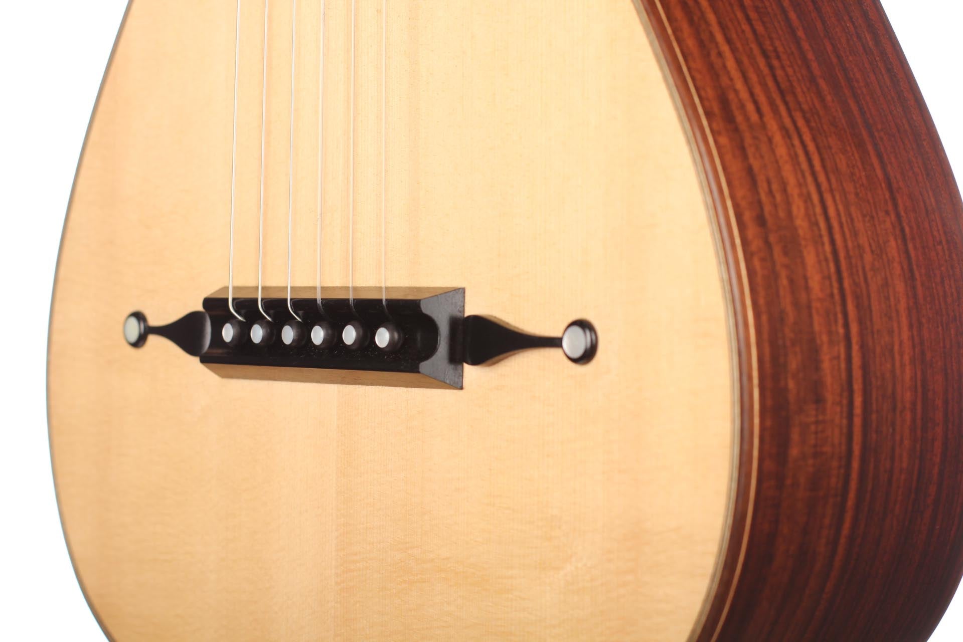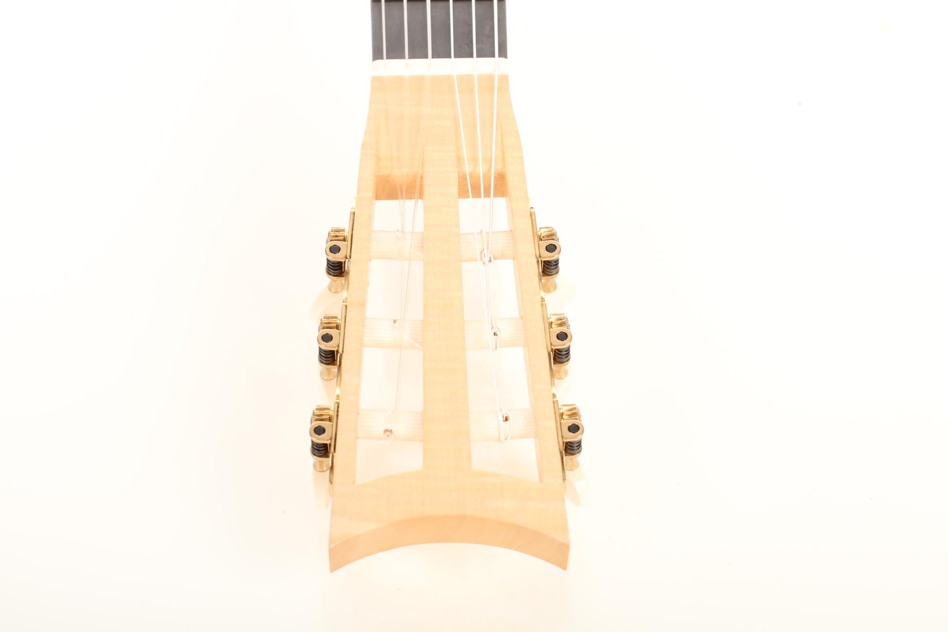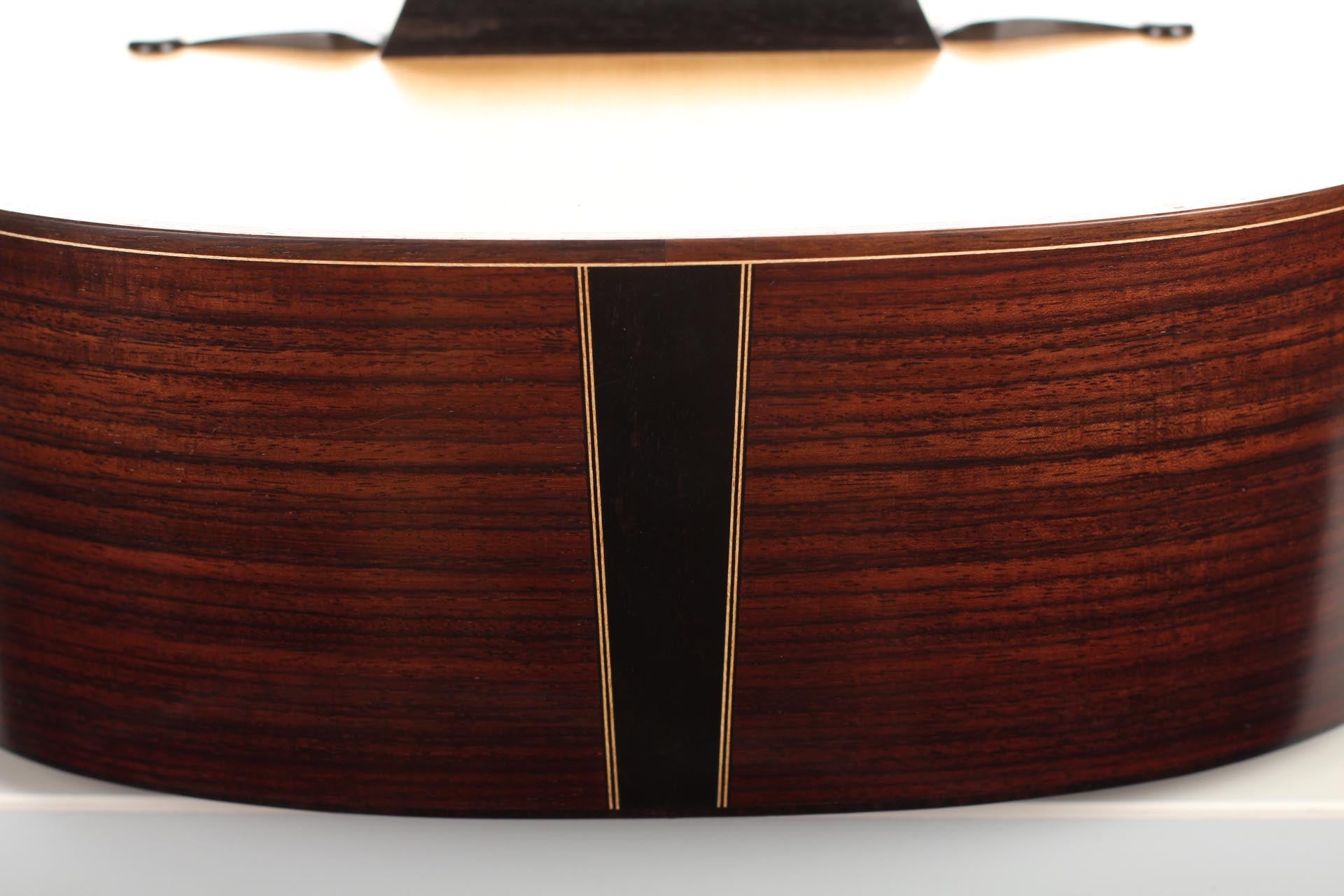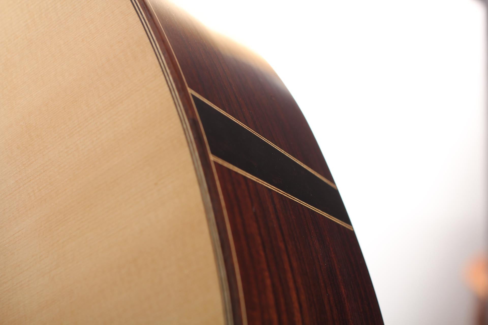 Simon Burgun studied lutherie in Belgium at the Center voor Muziekinstrumentenouw with Walter Verreydt and Karel Dedain. He was encouraged by being awarded the school's price De Gouden Bootschaaf for the quality of his work. Simon is specialized in the methods, materials and instruments of the 19th century, including romantic and early classical guitars. He shares his time between repairs, restorations and new instruments and builds four guitars a year. His workshop is located in Strasbourg, at the French German border, 80 km from Karlsruhe. This guitar was built after the famous instruments by the Londonian workshop of Joseph and Louis Panormo. This instantly recognisable design was inspired by the Spanish luthier Pages whose instruments were brought to England by Fernando Sor. Panormo guitars are a very interesting link between the romantic and the classical guitars. It features characteritics of the first (small body, pin bridge, mother of pearl decoration) and of the latter (tuners, height of the ribs, fan bracing, use of rosewwod and Spanish cedar), making it an ideal guitar for classical players wishing to wander on the romantic repertoire with the appropriate instrument. The back of the instrument displays an appealing set of shades, from the dark brown rosewood to the mahogany neck and the flame maple headstock. For such a small-bodied instrument, this guitar has a great volume and sustain. Actually, it is the quality of the sound itself that is the most striking. This instrument is very well-balanced with a constant tone and timbre all along the neck. The tone is remarkably rich and doesn’t loose of its complexity in fine “piano” or mighty “fortes”. A brilliant instrument for a romantic and classical guitar aficionado. The tuners are by Rubner and the finish is an hard drying oil. A hard-shell case is included.