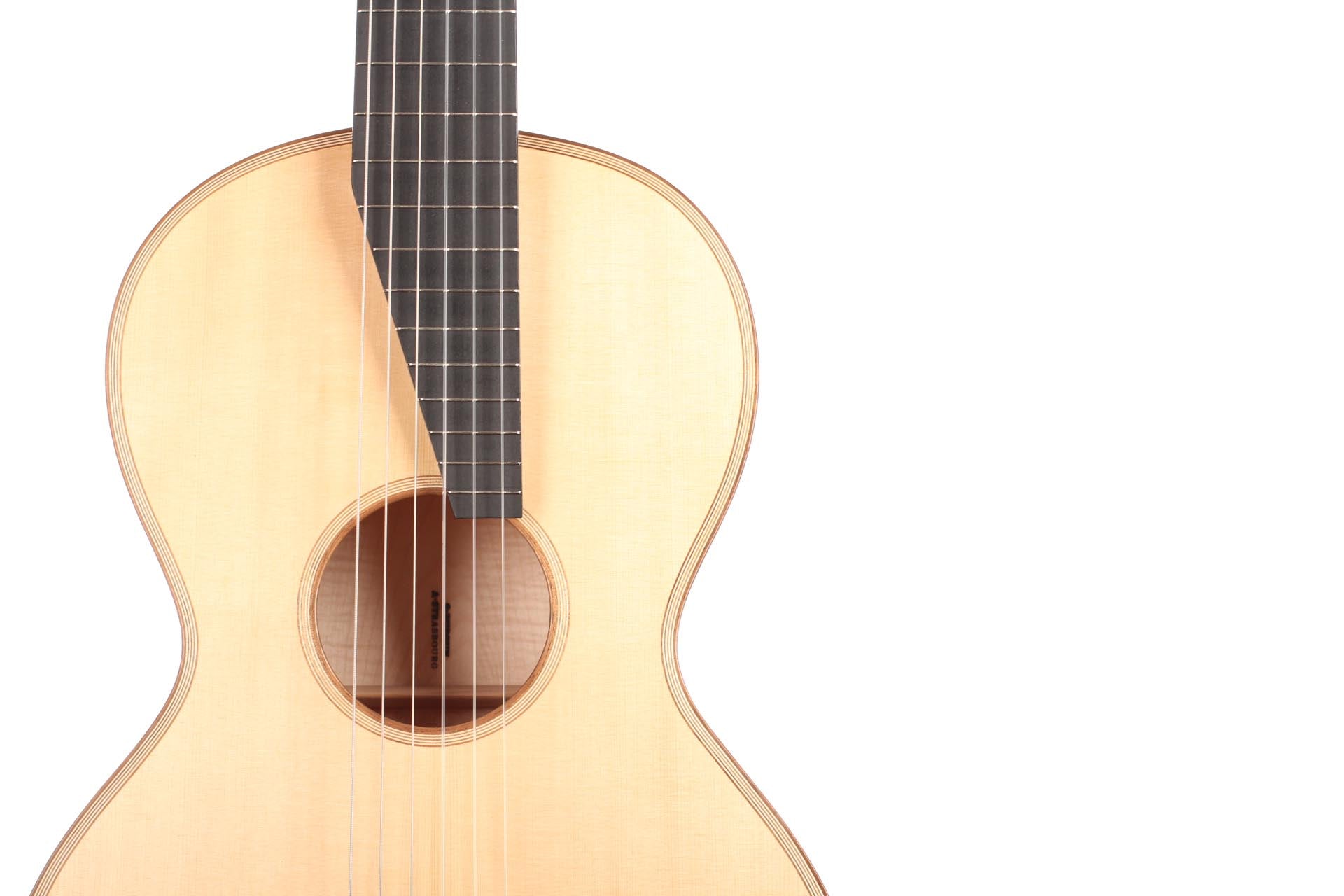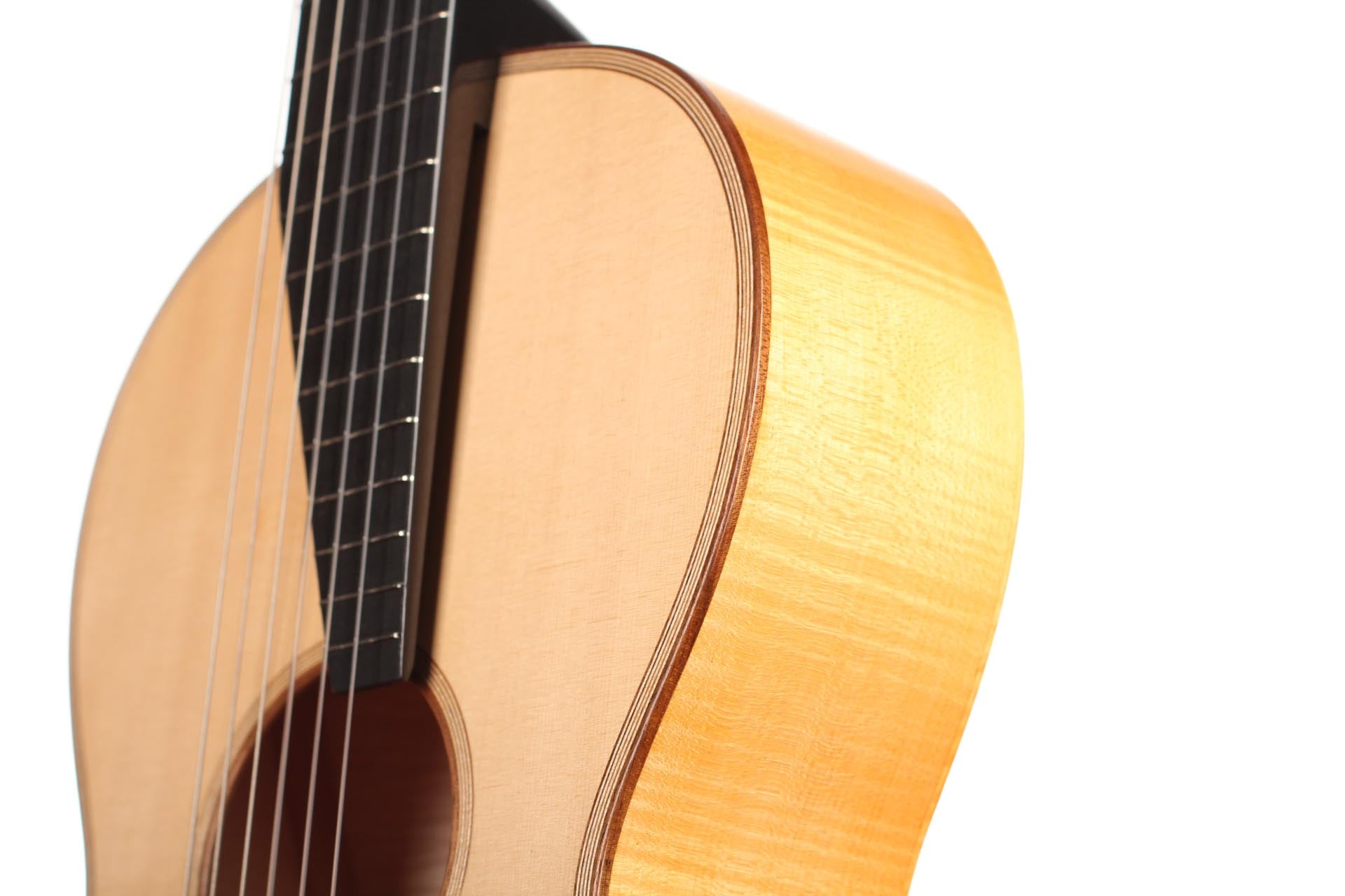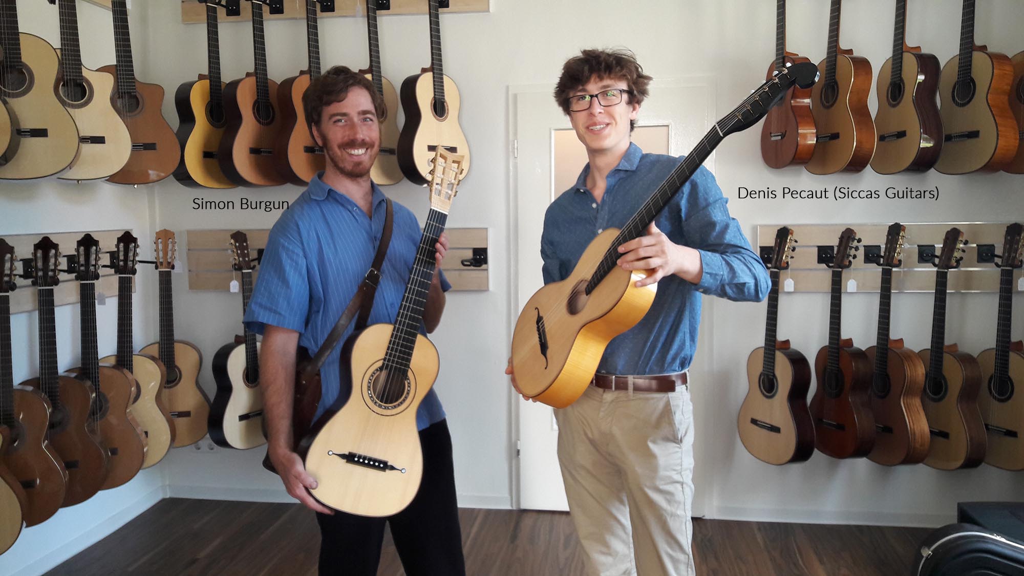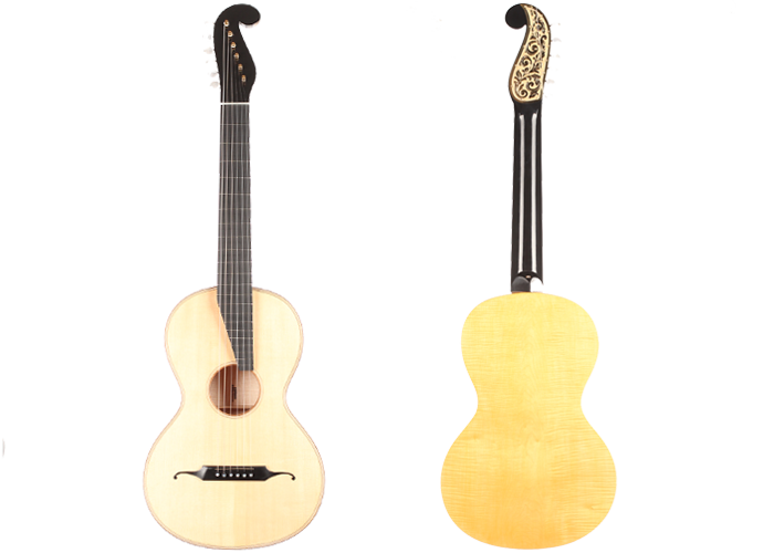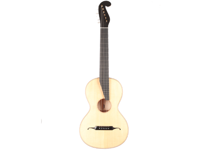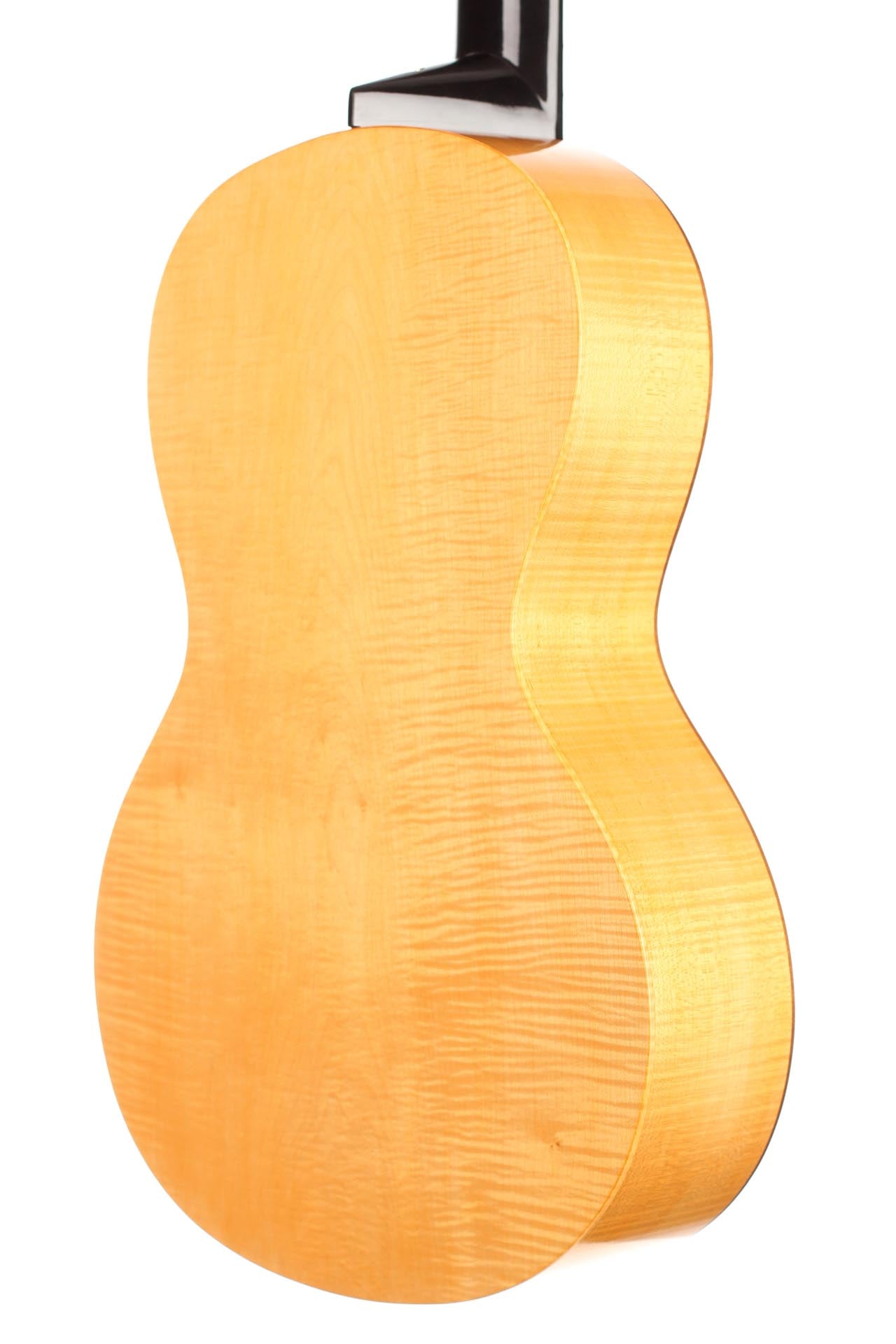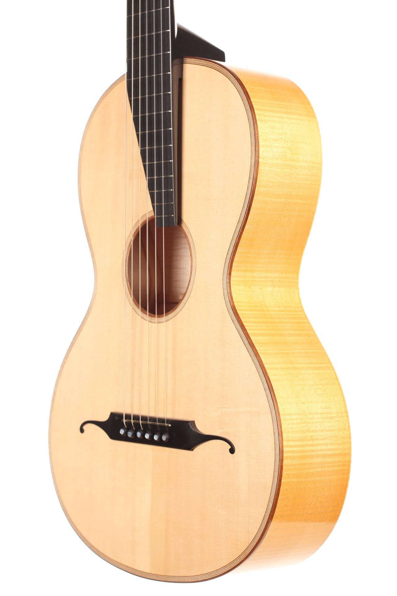 Simon Burgun studied lutherie in Belgium at the Center voor Muziekinstrumentenbouw with Walter Verreydt and Karel Dedain. He was encouraged by being awarded the school's price De Gouden Bootschaaf for the quality of his work. Simon is specialized in the methods, materials and instruments of the 19th century, including romantic and early classical guitars. He shares his time between repairs, restorations and new instruments and builds four guitars a year. His workshop is located in Strasbourg, at the French German border, 80 km from Karlsruhe. This guitar was built after the Legnani model of the early 19th century Viennese master Johann Georg Stauffer. It displays all the typical features of this then innovative guitar: a one-piece flamed maple back with oil varnish, a waxed Swiss spruce soundboard, a narrow, black lacquered adjustable neck with bar frets and hidden machine heads, provided on this instrument by Rubner. This guitar’s sound is faithful to the very typical Viennese instrument’s sound of this time. Crystal clear mids and treble along with direct basses give to the guitar a very traditional and playful personality. When played, it is very communicative to the body as the thinly worked wood vibrates broadly. The comfort of playing of this guitar is great: the elevated fingerboard allows an easy access to the treble, and a sophisticated mechanism in the neck enable the change of the action of the strings in a few seconds. This guitar is a great instrument for those who want a salon guitar with a great sound identity and perfect playability. Like most of the Austrian instruments of that time, the instrument contains no woods from the Dalbergia genus, and is Cites free.