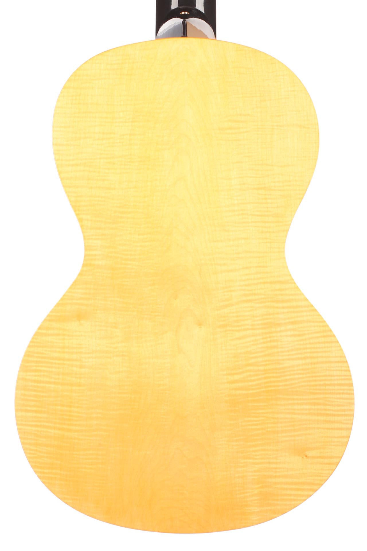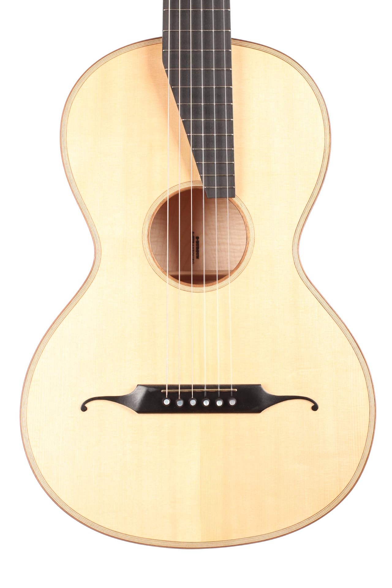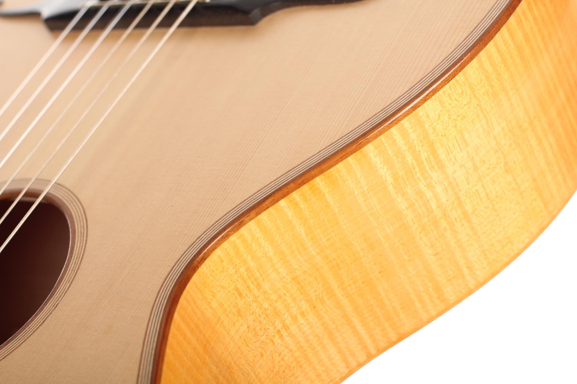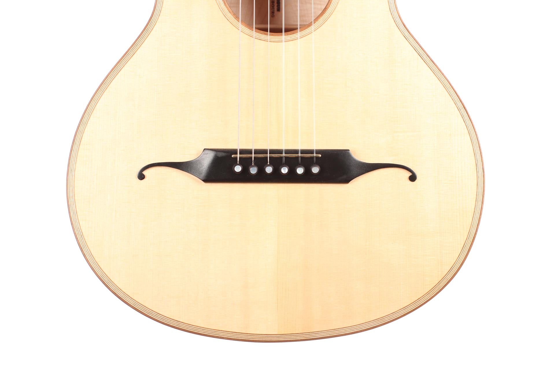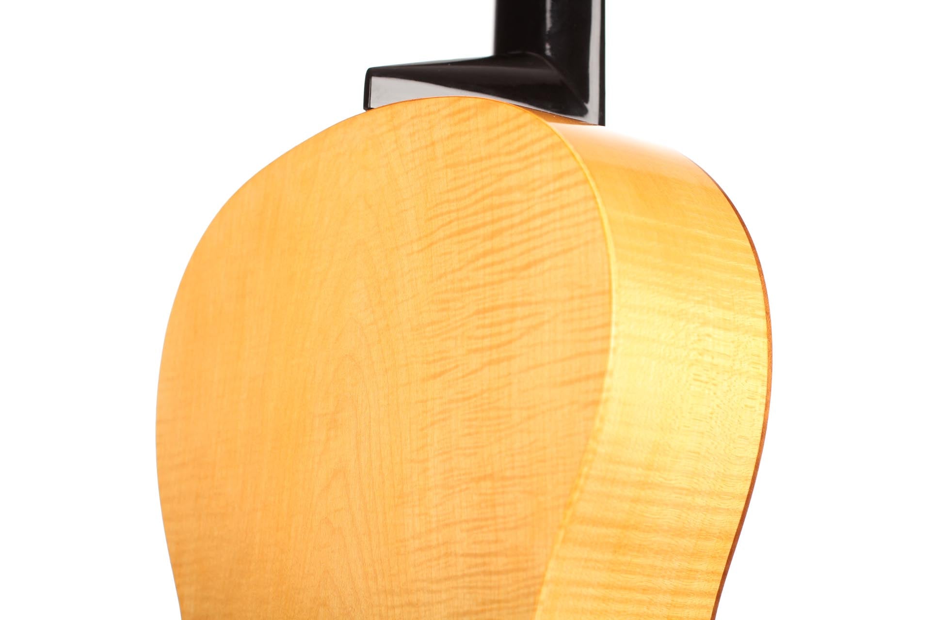 Simon Burgun studied lutherie in Belgium at the Center voor Muziekinstrumentenbouw with Walter Verreydt and Karel Dedain. He was encouraged by being awarded the school's price De Gouden Bootschaaf for the quality of his work. Simon is specialized in the methods, materials and instruments of the 19th century, including romantic and early classical guitars. He shares his time between repairs, restorations and new instruments and builds four guitars a year. His workshop is located in Strasbourg, at the French German border, 80 km from Karlsruhe. This guitar was built after the Legnani model of the early 19th century Viennese master Johann Georg Stauffer. It displays all the typical features of this then innovative guitar: a one-piece flamed maple back with oil varnish, a waxed Swiss spruce soundboard, a narrow, black lacquered adjustable neck with bar frets and hidden machine heads, provided on this instrument by Rubner. This guitar’s sound is faithful to the very typical Viennese instrument’s sound of this time. Crystal clear mids and treble along with direct basses give to the guitar a very traditional and playful personality. When played, it is very communicative to the body as the thinly worked wood vibrates broadly. The comfort of playing of this guitar is great: the elevated fingerboard allows an easy access to the treble, and a sophisticated mechanism in the neck enable the change of the action of the strings in a few seconds. This guitar is a great instrument for those who want a salon guitar with a great sound identity and perfect playability. Like most of the Austrian instruments of that time, the instrument contains no woods from the Dalbergia genus, and is Cites free.