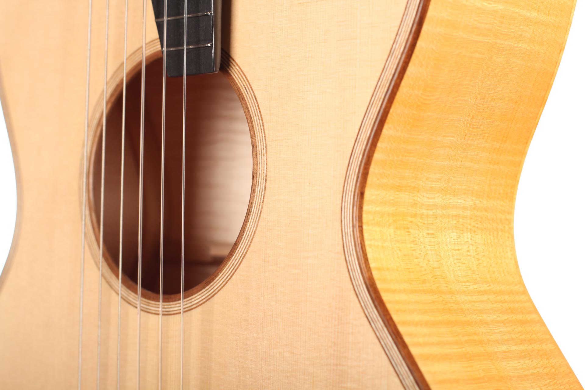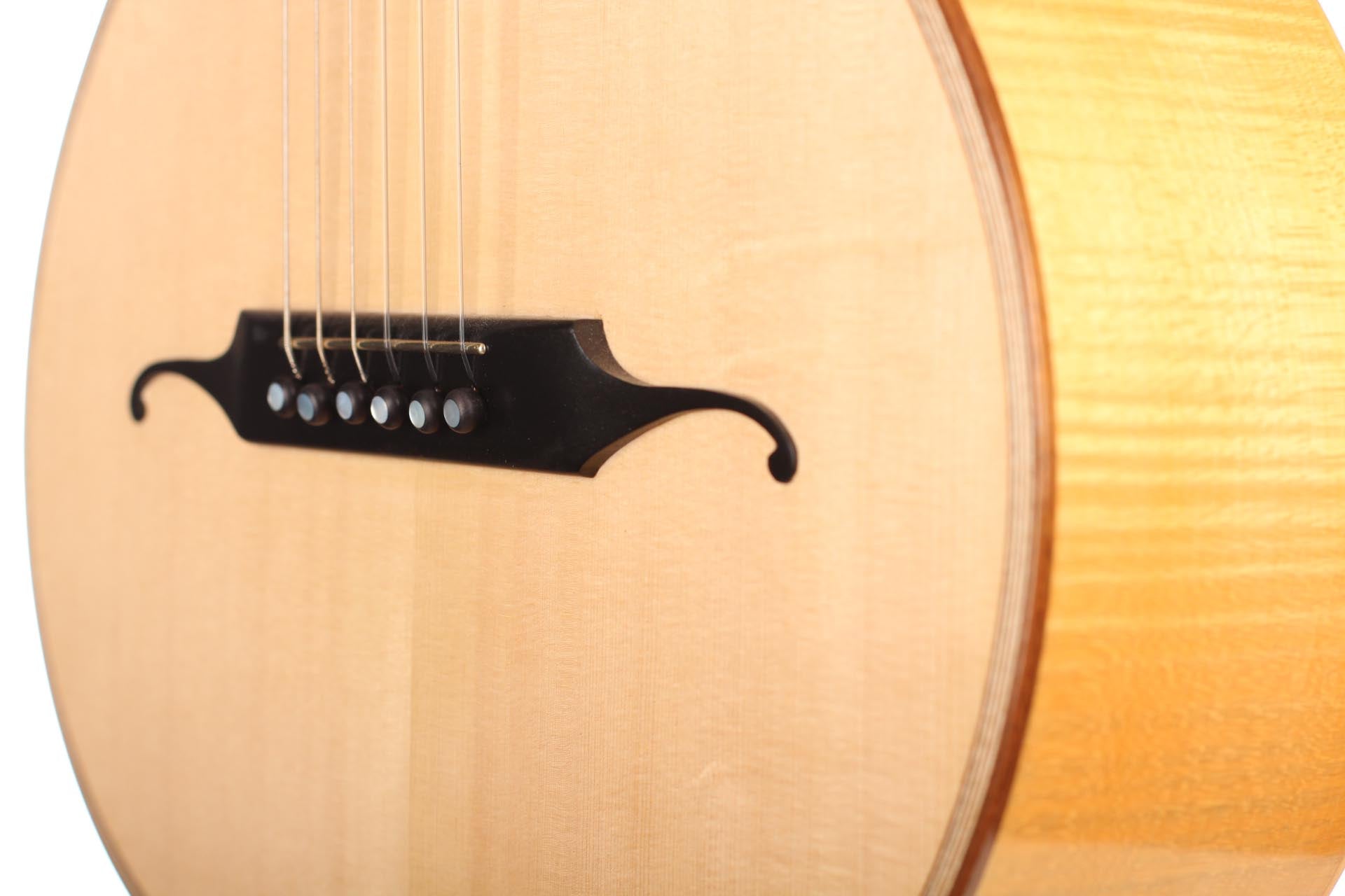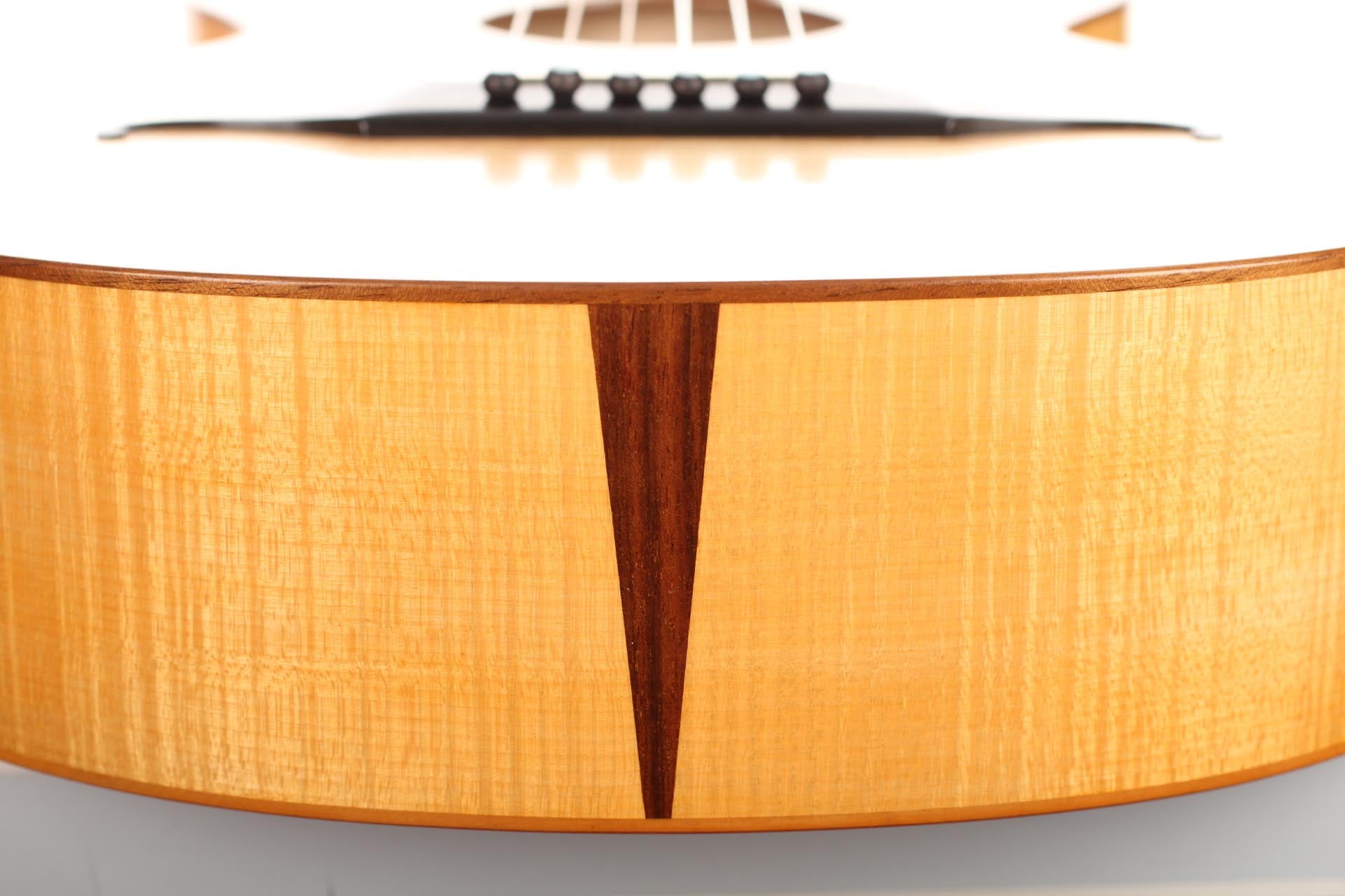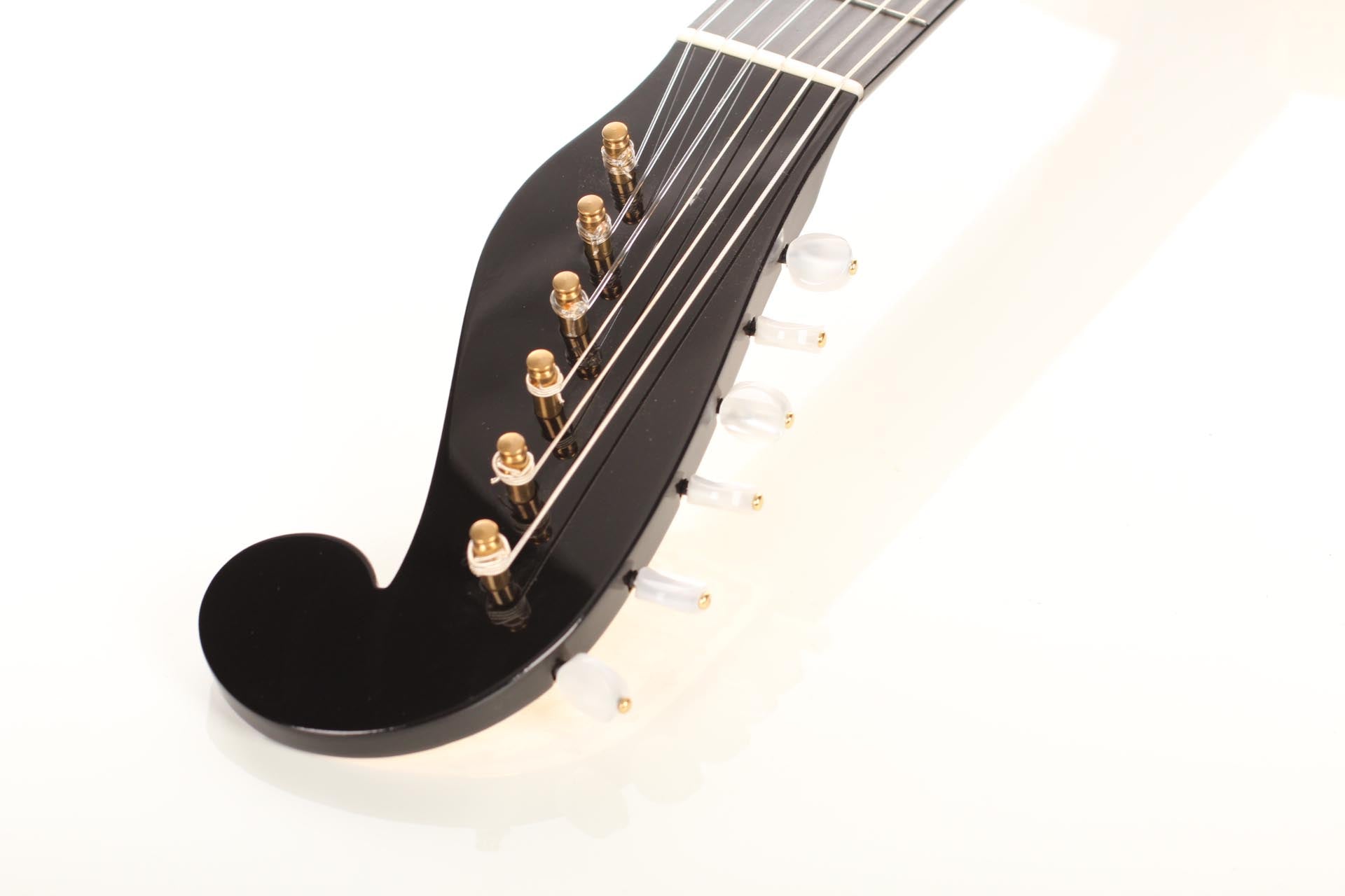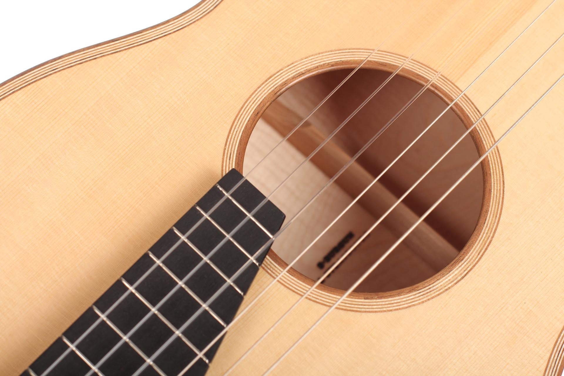 Simon Burgun studied lutherie in Belgium at the Center voor Muziekinstrumentenbouw with Walter Verreydt and Karel Dedain. He was encouraged by being awarded the school's price De Gouden Bootschaaf for the quality of his work. Simon is specialized in the methods, materials and instruments of the 19th century, including romantic and early classical guitars. He shares his time between repairs, restorations and new instruments and builds four guitars a year. His workshop is located in Strasbourg, at the French German border, 80 km from Karlsruhe. This guitar was built after the Legnani model of the early 19th century Viennese master Johann Georg Stauffer. It displays all the typical features of this then innovative guitar: a one-piece flamed maple back with oil varnish, a waxed Swiss spruce soundboard, a narrow, black lacquered adjustable neck with bar frets and hidden machine heads, provided on this instrument by Rubner. This guitar’s sound is faithful to the very typical Viennese instrument’s sound of this time. Crystal clear mids and treble along with direct basses give to the guitar a very traditional and playful personality. When played, it is very communicative to the body as the thinly worked wood vibrates broadly. The comfort of playing of this guitar is great: the elevated fingerboard allows an easy access to the treble, and a sophisticated mechanism in the neck enable the change of the action of the strings in a few seconds. This guitar is a great instrument for those who want a salon guitar with a great sound identity and perfect playability. Like most of the Austrian instruments of that time, the instrument contains no woods from the Dalbergia genus, and is Cites free.