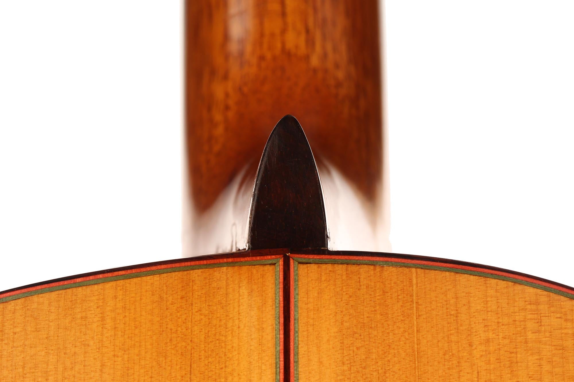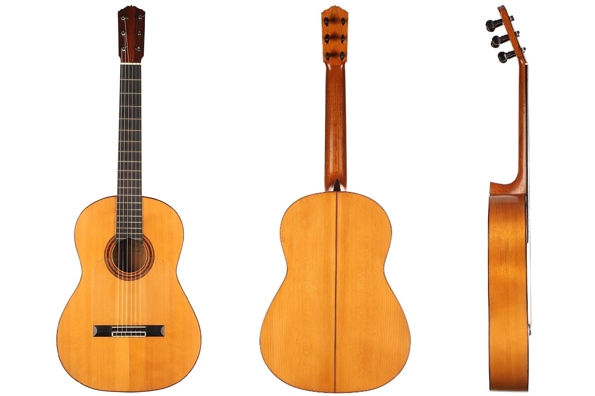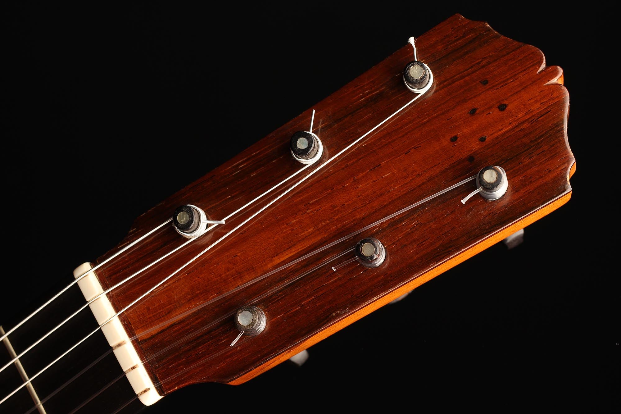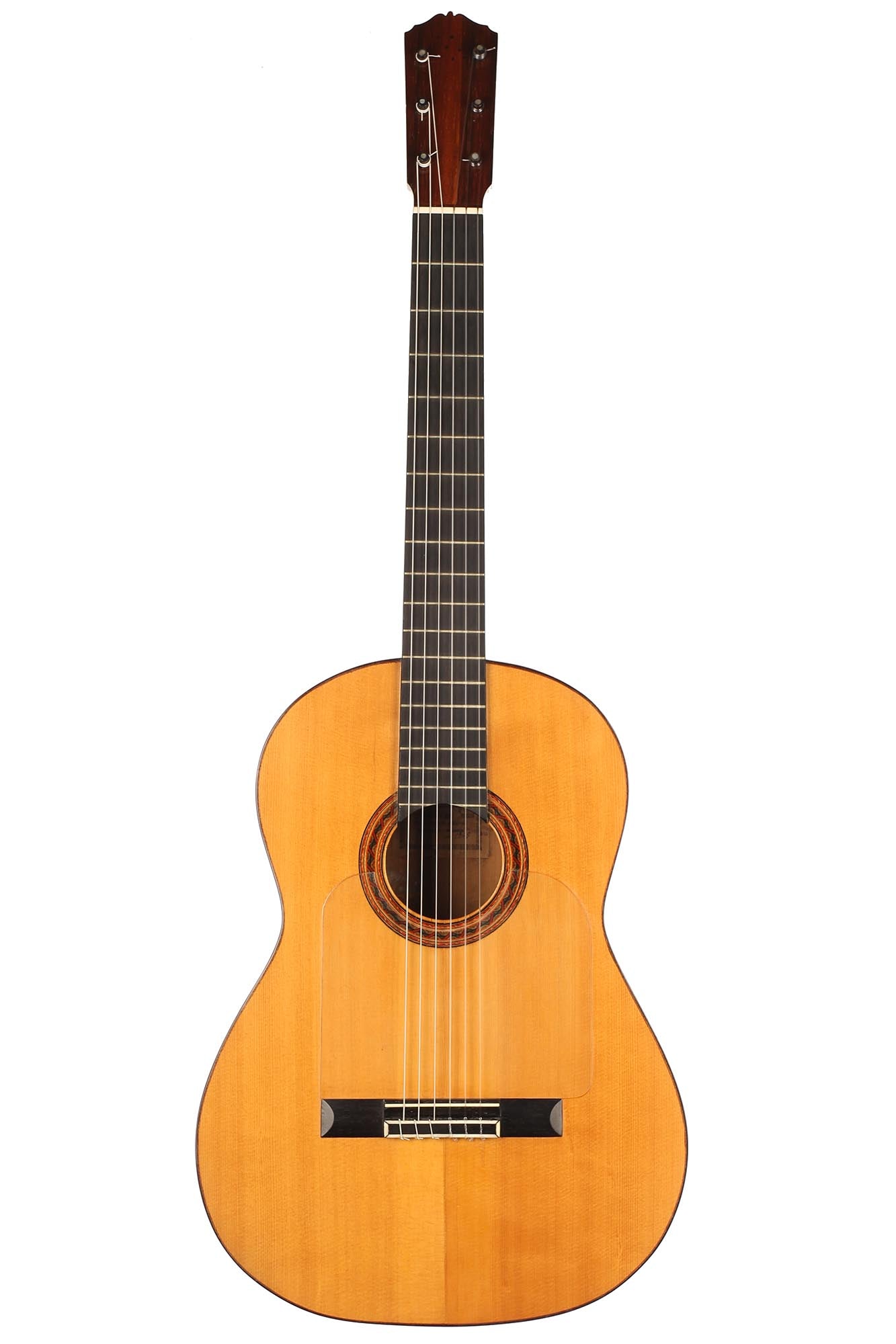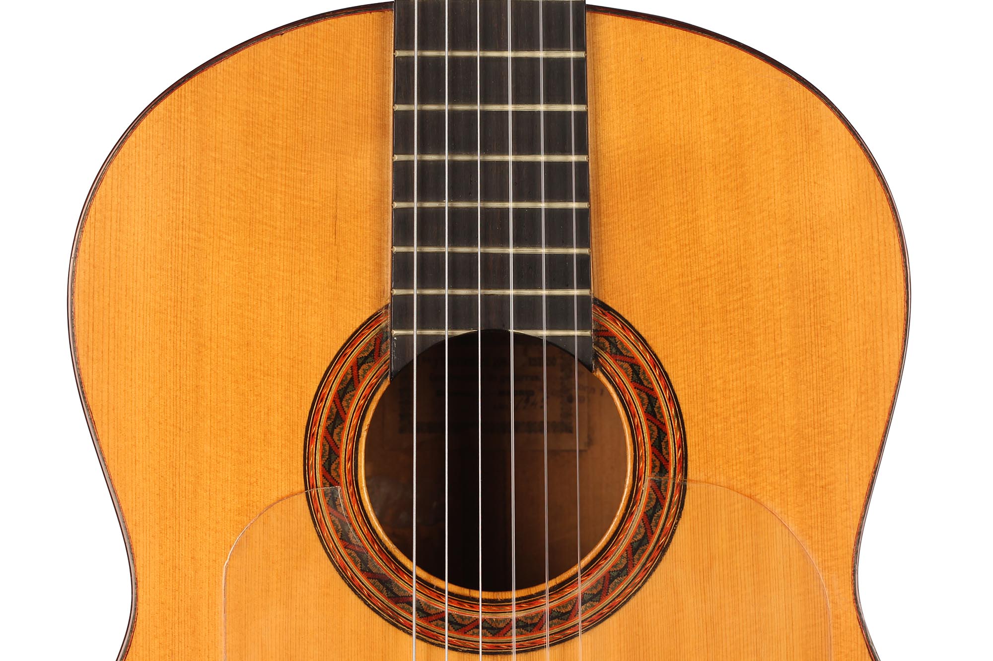 In 1945 the Conde brothers built this superb and very important guitar for Domingo Esteso's widow. This very evocative year of construction clearly situates the era in which this guitar was built and makes it an absolutely remarkable historical instrument. It is in an impeccable state of restoration and ready to be played. Some cracks on the soundboard as well as several on the back and sides have been perfectly restored. A repair label by Paul Fischer from 1992 is located inside the guitar and indicates that the restoration was carried out by the latter. The shape of the head, as well as the general design of the guitar, correspond exactly to the proportions of Domingo Esteso's guitars. Also, the rosette is sublime, with a twisted interlacing of red and green. The bridge, faithful to the tradition of flamenco guitars, is very flat and the strings are extremely close to the top. Many "Viuda e sobrinos de Domingo Esteso" stamps are visible inside this guitar, which highlights once again the historical and collectible value of this instrument.