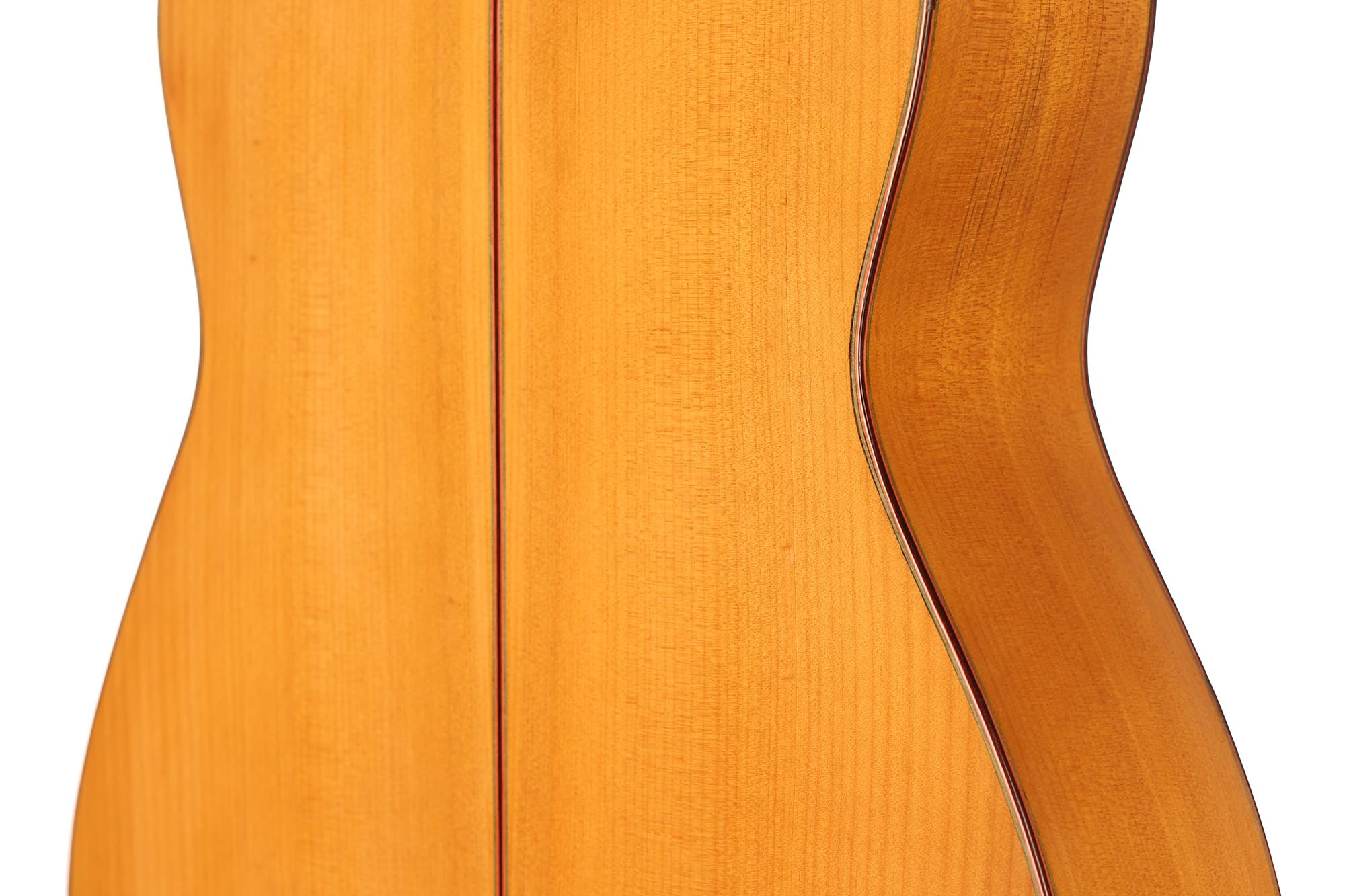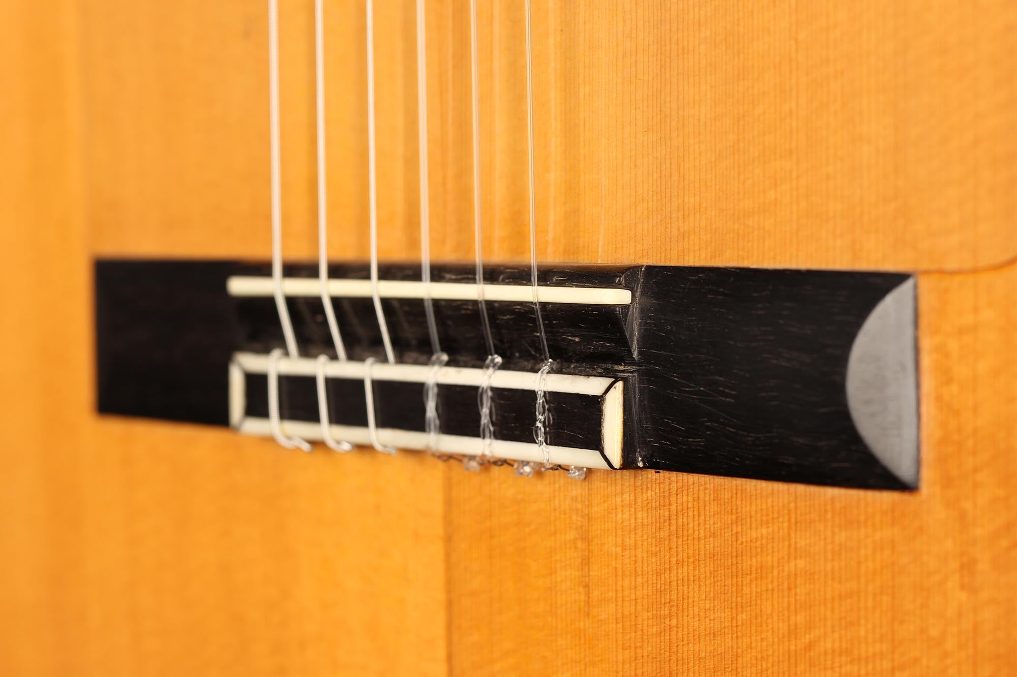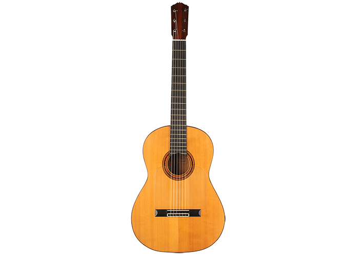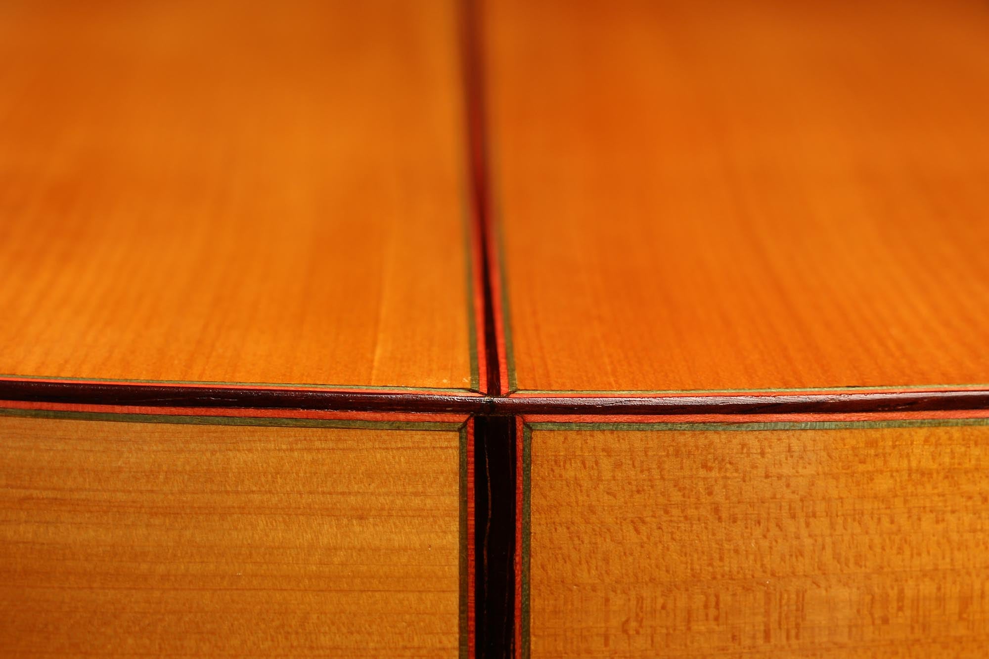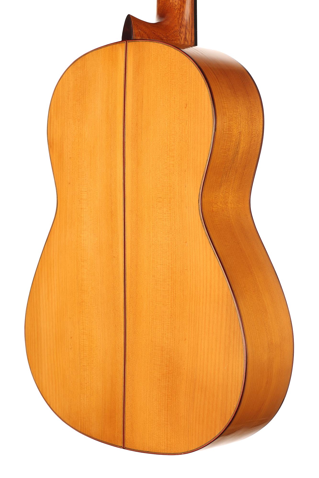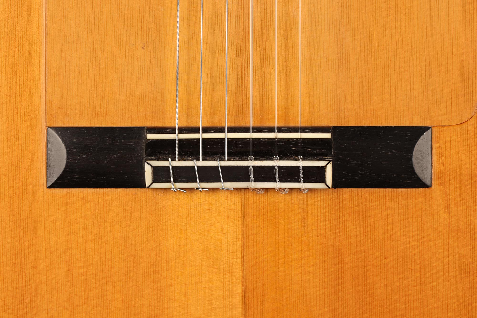 In 1945 the Conde brothers built this superb and very important guitar for Domingo Esteso's widow. This very evocative year of construction clearly situates the era in which this guitar was built and makes it an absolutely remarkable historical instrument. It is in an impeccable state of restoration and ready to be played. Some cracks on the soundboard as well as several on the back and sides have been perfectly restored. A repair label by Paul Fischer from 1992 is located inside the guitar and indicates that the restoration was carried out by the latter. The shape of the head, as well as the general design of the guitar, correspond exactly to the proportions of Domingo Esteso's guitars. Also, the rosette is sublime, with a twisted interlacing of red and green. The bridge, faithful to the tradition of flamenco guitars, is very flat and the strings are extremely close to the top. Many "Viuda e sobrinos de Domingo Esteso" stamps are visible inside this guitar, which highlights once again the historical and collectible value of this instrument.