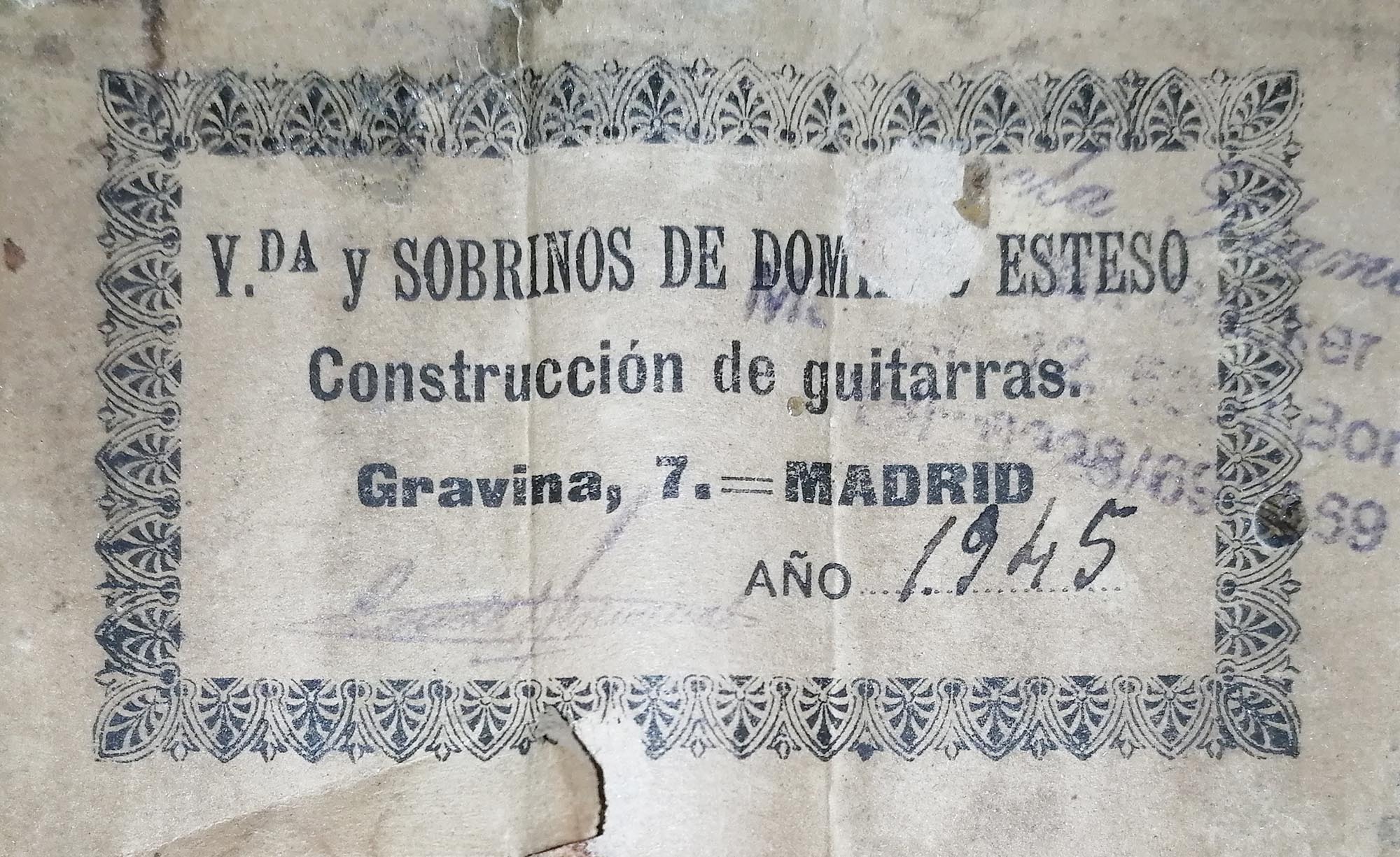Domingo Esteso Lopez was born in San Clemente in 1882. He was one of the most important luthiers of the early 20th century. In the 1890′s, he began his apprenticeship at the workshop of Manuel Ramirez in Madrid. There, he worked along with Modesto Borreguero, Santos Hernandez, etc. In the year after the death of Manuel Ramirez (1864 - 1916) he worked for the widow of M. Ramirez. In 1917, Domingo Esteso opened his own workshop in the Calle Gravina in Madrid. In 1926, his nephew Faustino Conde joined the workshop, followed three years later by his brother Mariano Conde and eventually Julio Conde. When Domingo Esteso died in 1937, the three brothers kept building under the name „Vda y Sobrinos de Domingo Esteso“.