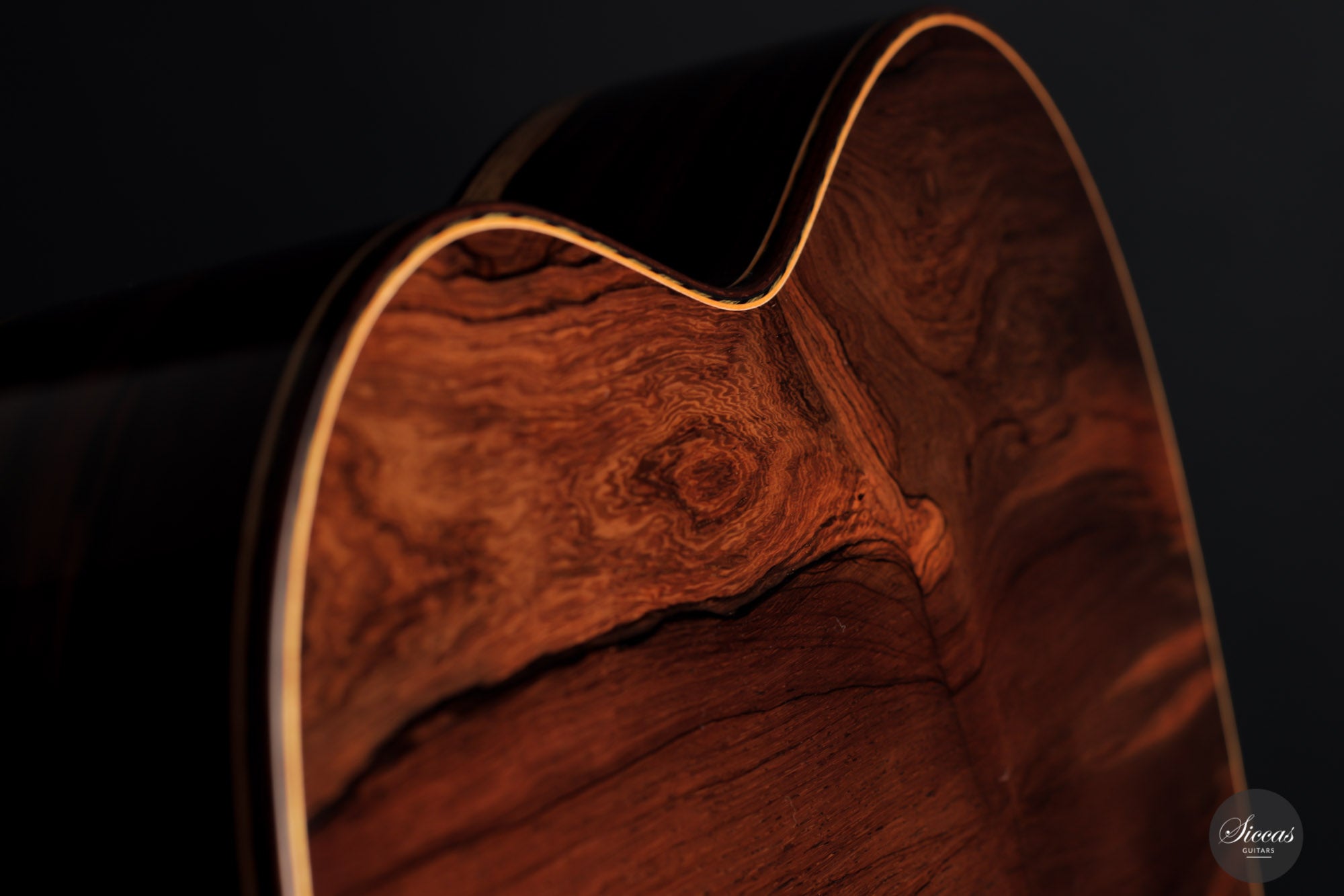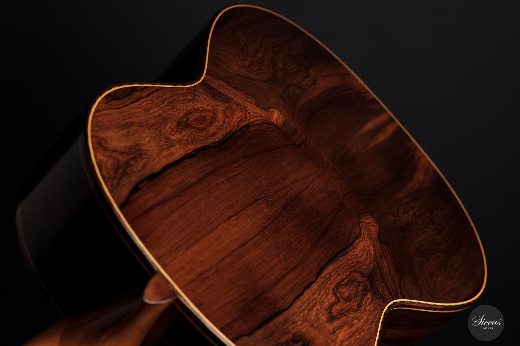This guitar is simply spectacular. Inspired by Santos Hernandez's instruments from the mid-1930s, this guitar really has it all. At first glance, it seems as if back and sides are crafted from Brazilian rosewood, in fact, it is a great set of Madagascar rosewood with exceptionally beautiful figured grain. The attention to detail that Stefan Nitschke has devoted to this instrument is just impressive. The precision of the mosaic inlays on the top, the black and green herringbone inlays on the back and sides, and the gorgeous handmade tuners by Rodgers replicating the original tuners from that era are just a few examples that make this guitar a true piece of art.