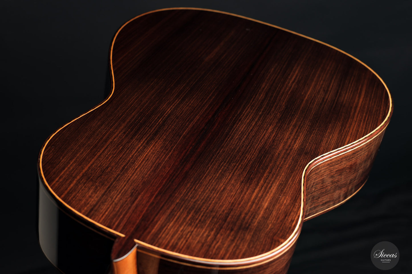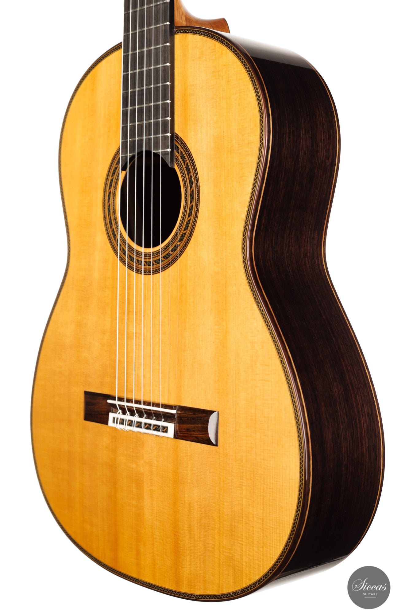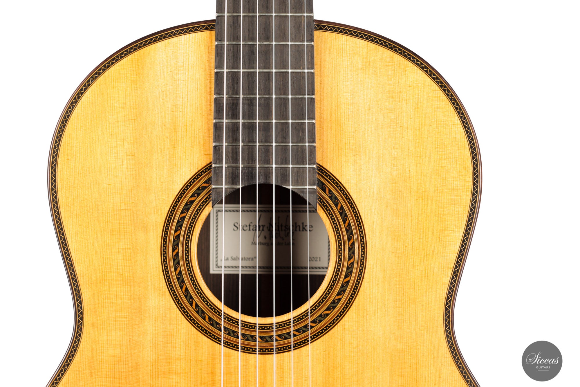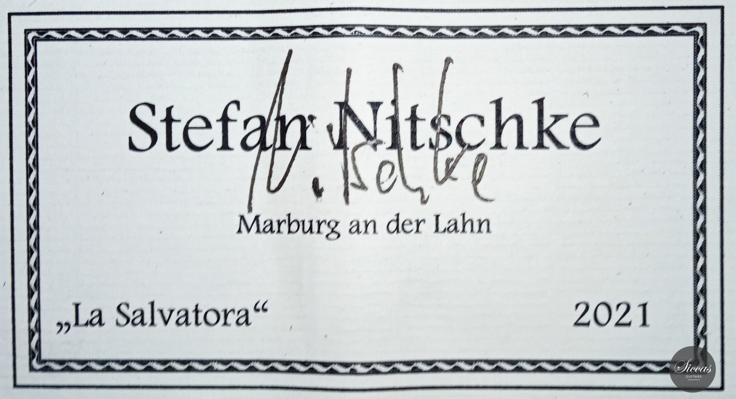 This guitar is simply spectacular. Inspired by Santos Hernandez's instruments from the mid-1930s, this guitar really has it all. At first glance, back and sides are crafted from Indian rosewood with exceptionally beautiful grain. The attention to detail that Stefan Nitschke has devoted to this instrument is just impressive. The precision of the mosaic inlays on the top, the black and green herringbone inlays on the back and sides, and the gorgeous handmade tuners by Rodgers replicating the original tuners from that era are just a few examples that make this guitar a true piece of art.
