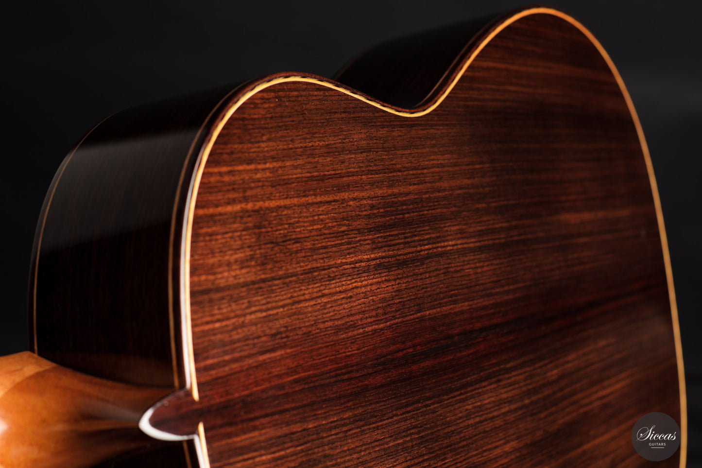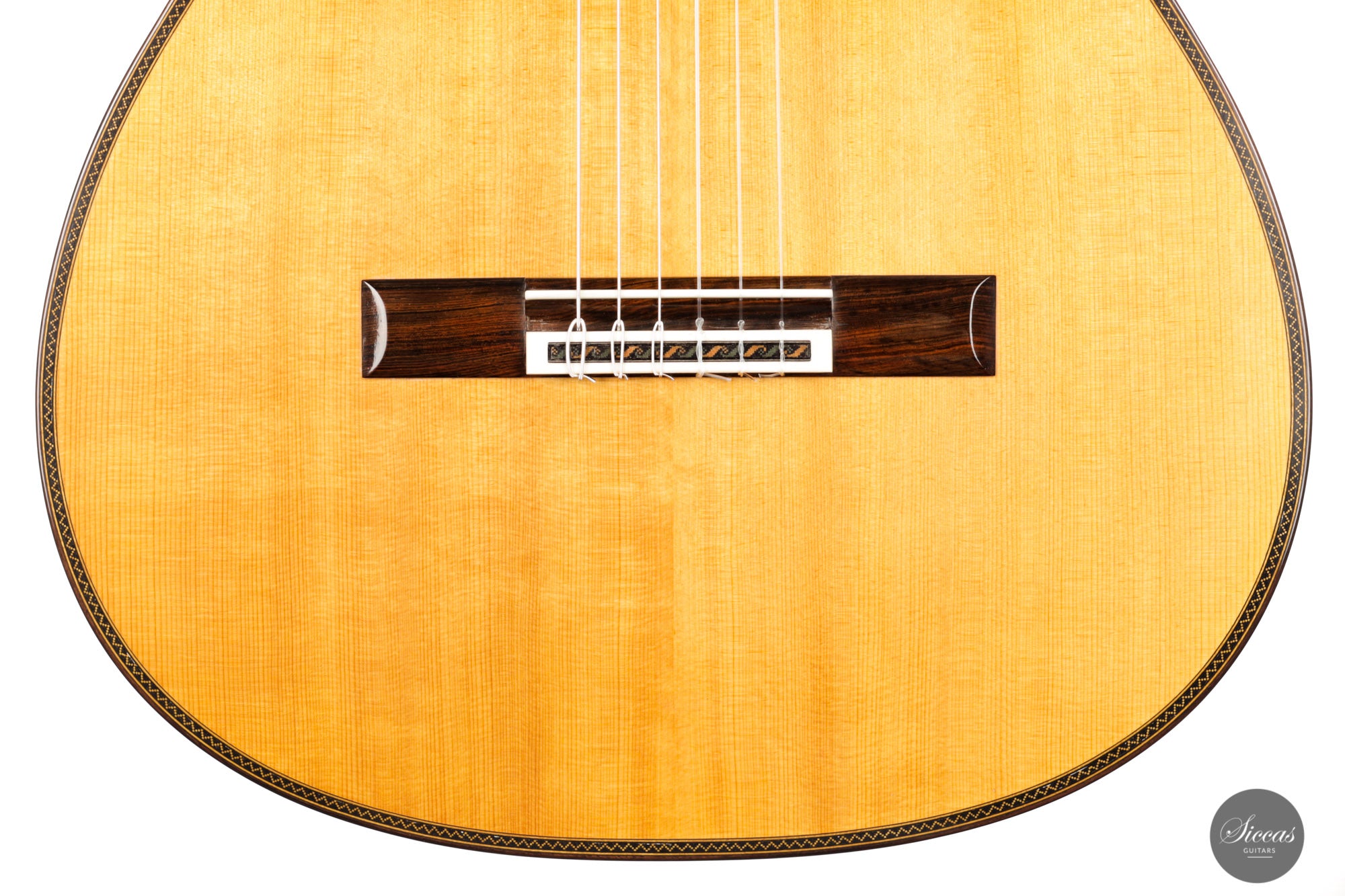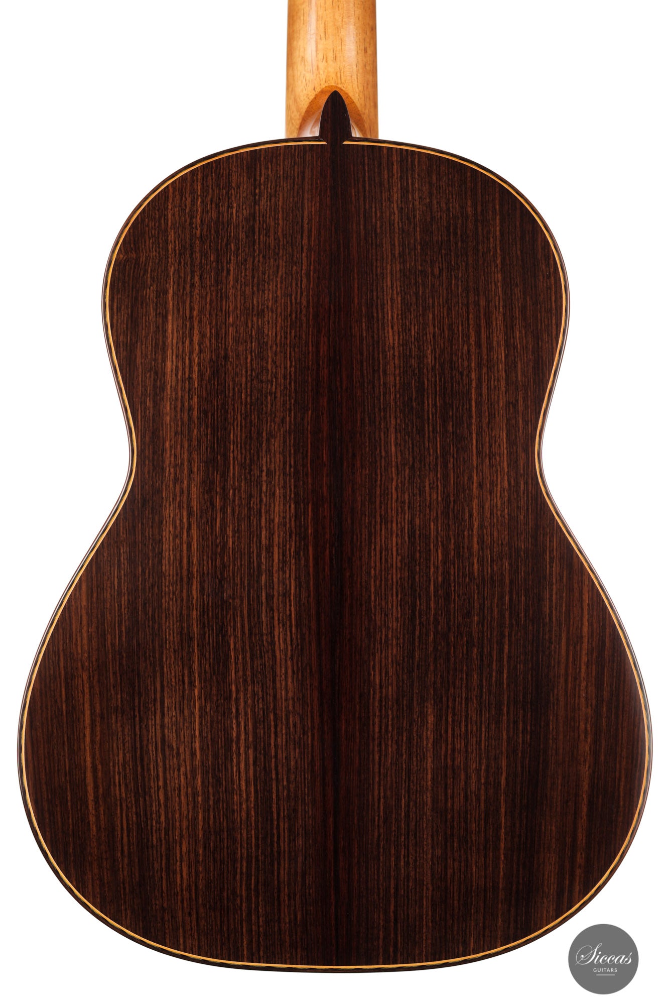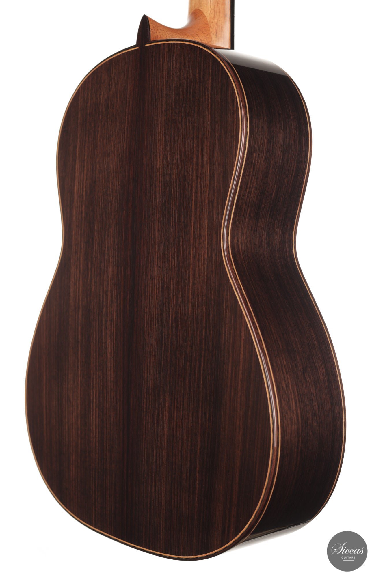 This guitar is simply spectacular. Inspired by Santos Hernandez's instruments from the mid-1930s, this guitar really has it all. At first glance, back and sides are crafted from Indian rosewood with exceptionally beautiful grain. The attention to detail that Stefan Nitschke has devoted to this instrument is just impressive. The precision of the mosaic inlays on the top, the black and green herringbone inlays on the back and sides, and the gorgeous handmade tuners by Rodgers replicating the original tuners from that era are just a few examples that make this guitar a true piece of art.