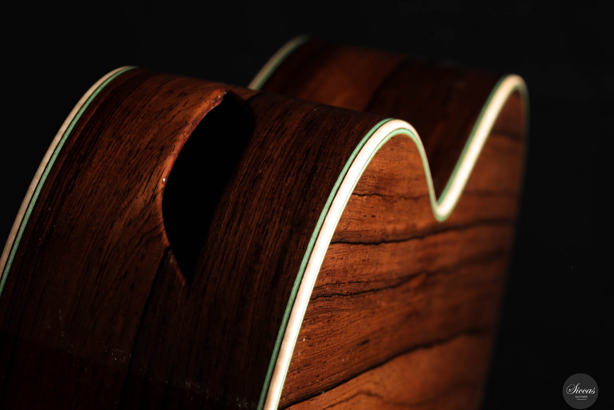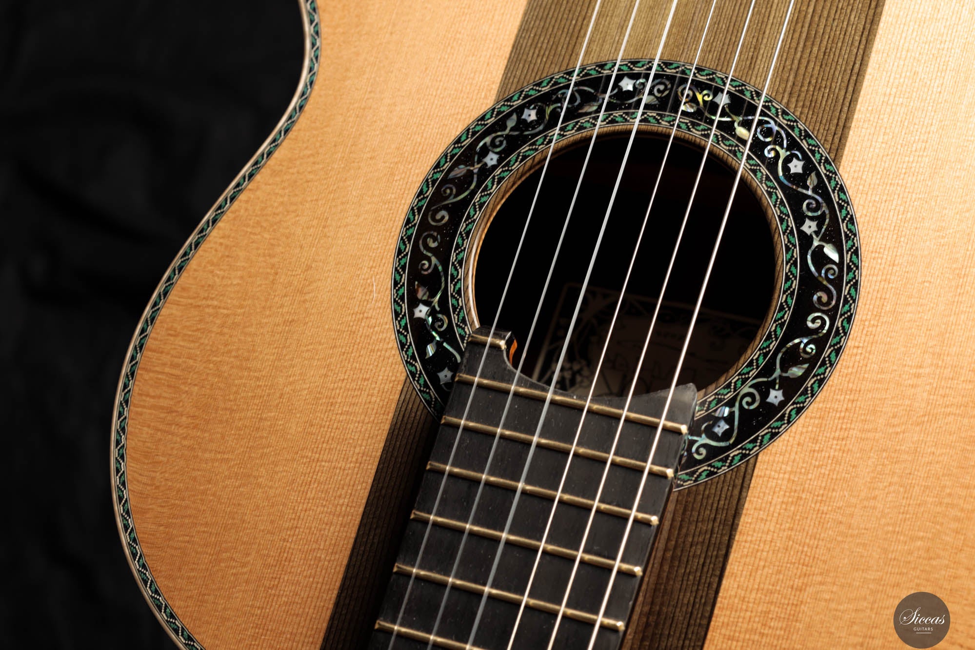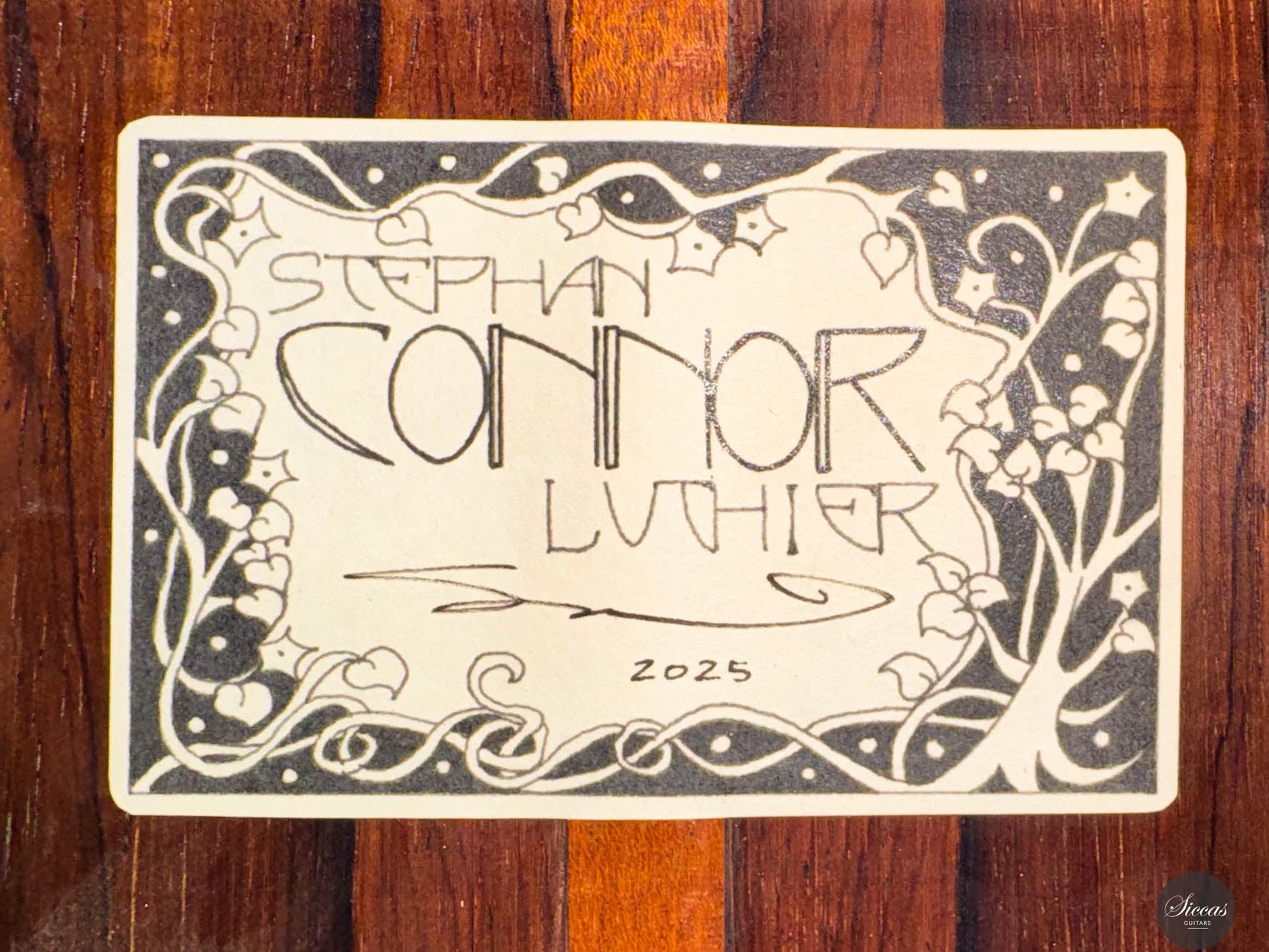 Crafted in 2025, this exceptional guitar named “Luna” is a testament to Stephen Connor’s luthiery at its highest level. This double-top instrument features a meticulously built three-piece soundboard: the outer sections are made from the highest-grade cedar, while the centerpiece is constructed from ancient cedar that holds a remarkable story.