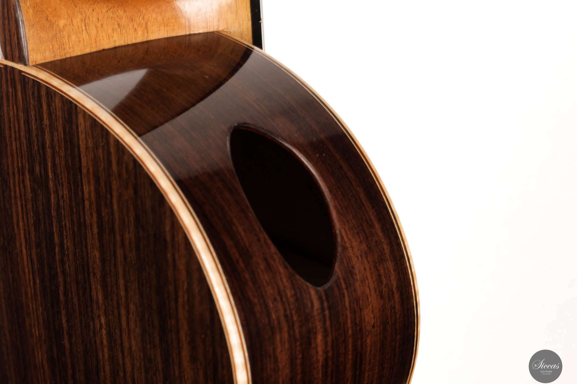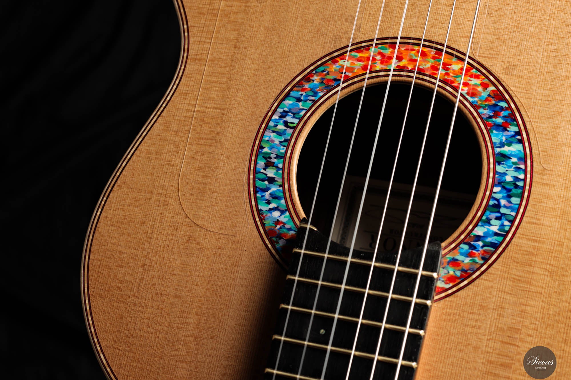 This stunning 2024 Stephen Connor is a true powerhouse, designed to satisfy even the most demanding players who seek exceptional volume and projection. Built with lattice bracing, it retains a beautifully organic sound quality while delivering remarkable power. More than just an instrument, this guitar is also a masterpiece of craftsmanship. Instead of a traditional mosaic, the rosette is hand-painted, showcasing Stephen Connor’s artistic vision and attention to detail.